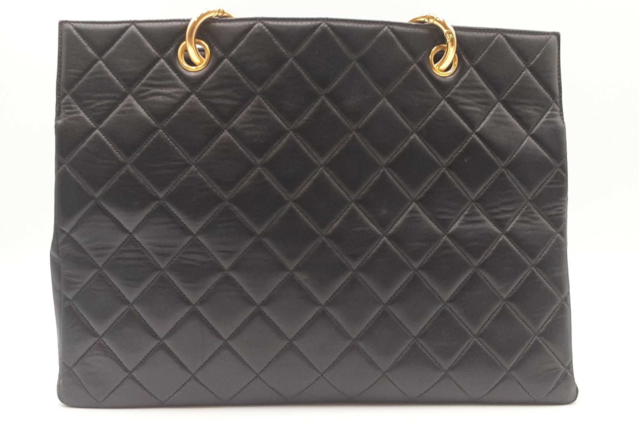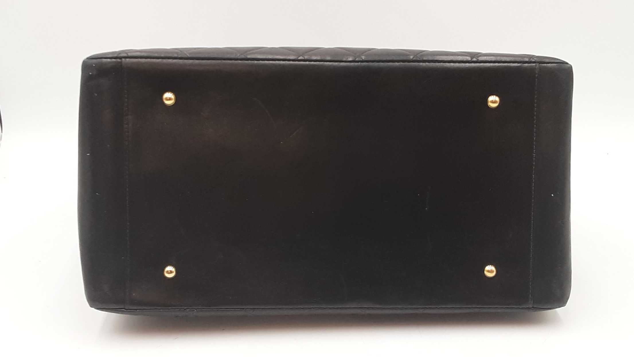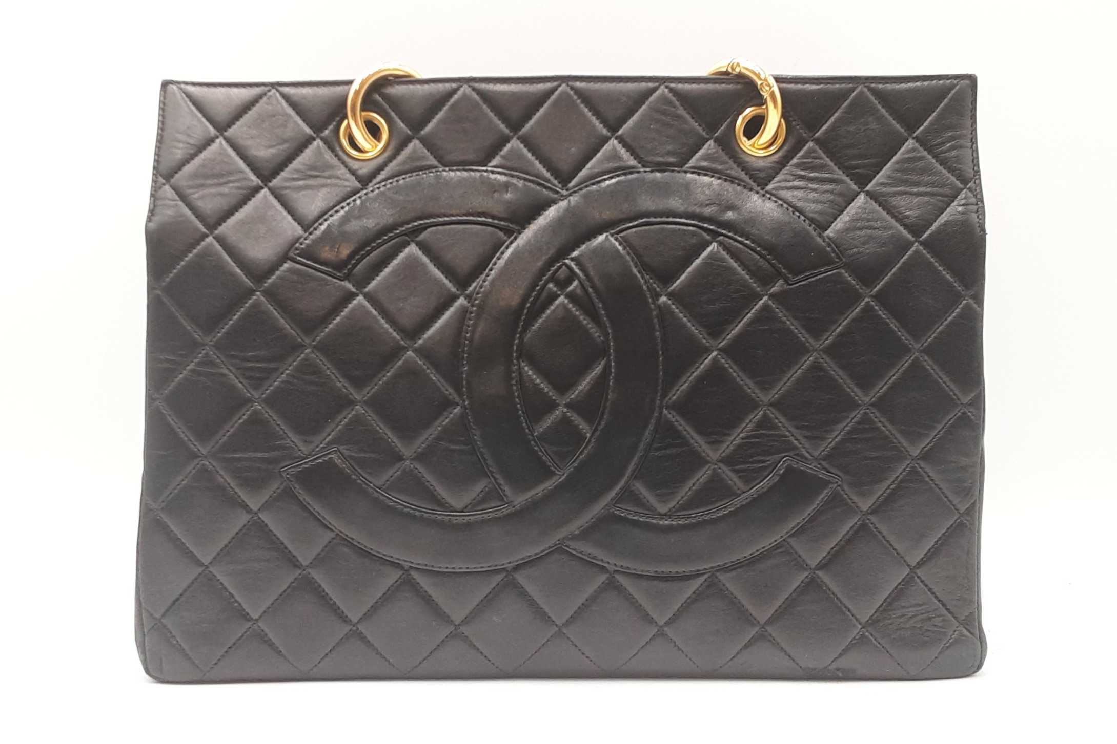 144030025544Chanel Black Leather Grand Shopping Tote Bag. Good Pre-Owned Condition. Approximate measurements Height 10 IN X Length 13.5 IN X Width 7 IN. Strap Drop 5.5 IN. Scratches and heavy wear damage at the bottom of the bag. Some indentations on the bottom as well. Clean interior. Entrupy Certificate #WW3Q796 No box or dust bag included.