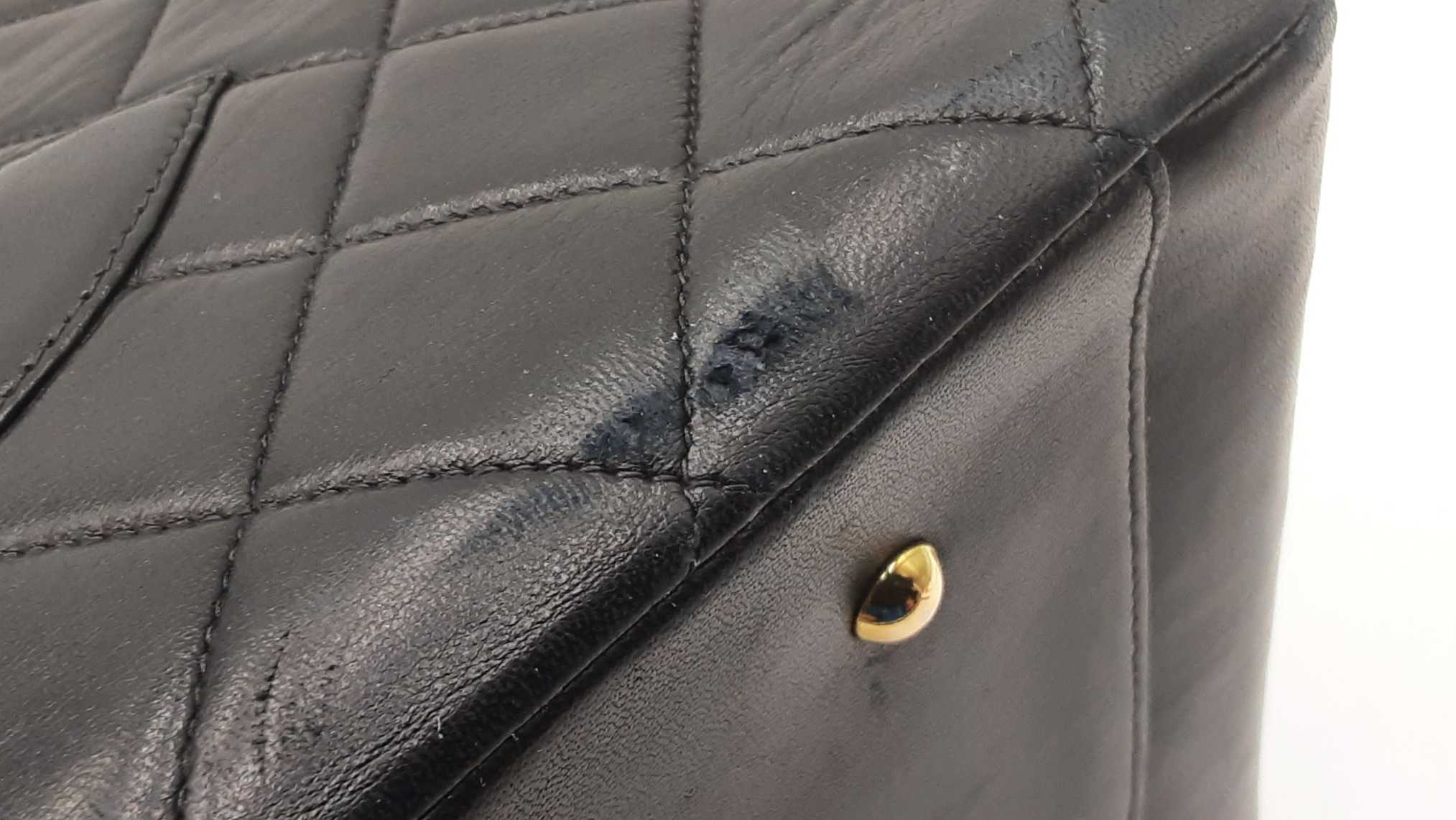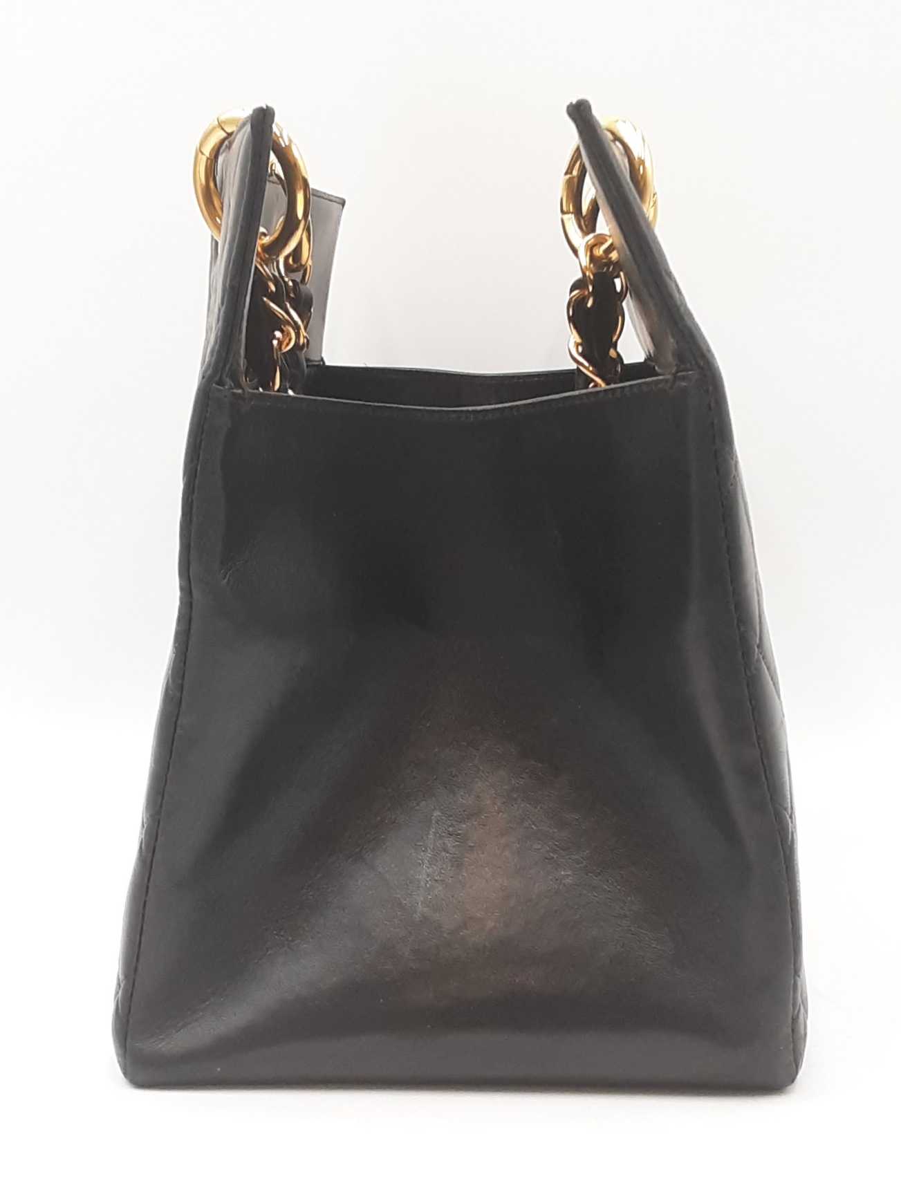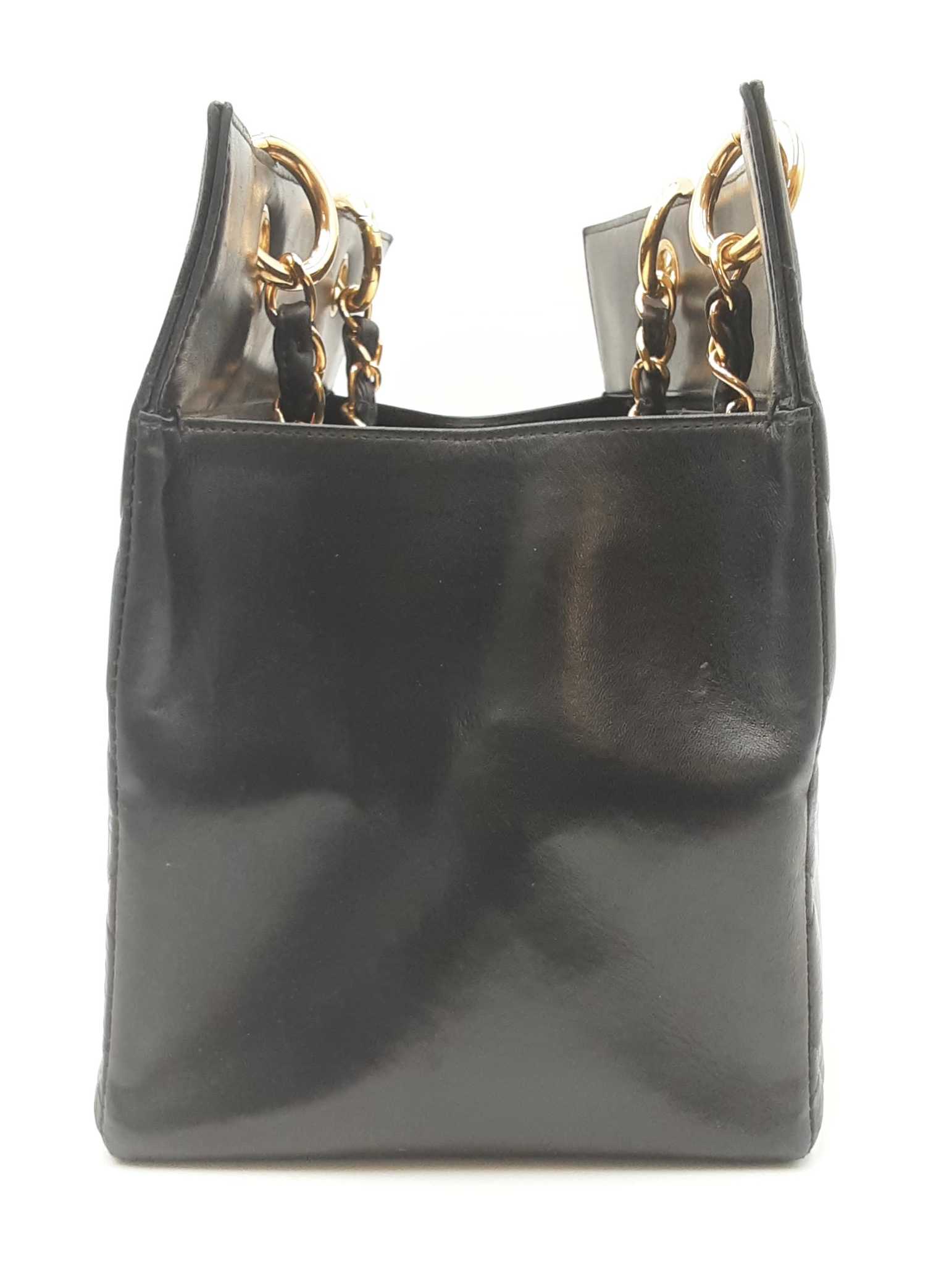 144030025544Chanel Black Leather Grand Shopping Tote Bag. Good Pre-Owned Condition. Approximate measurements Height 10 IN X Length 13.5 IN X Width 7 IN. Strap Drop 5.5 IN. Scratches and heavy wear damage at the bottom of the bag. Some indentations on the bottom as well. Clean interior. Entrupy Certificate #WW3Q796 No box or dust bag included.