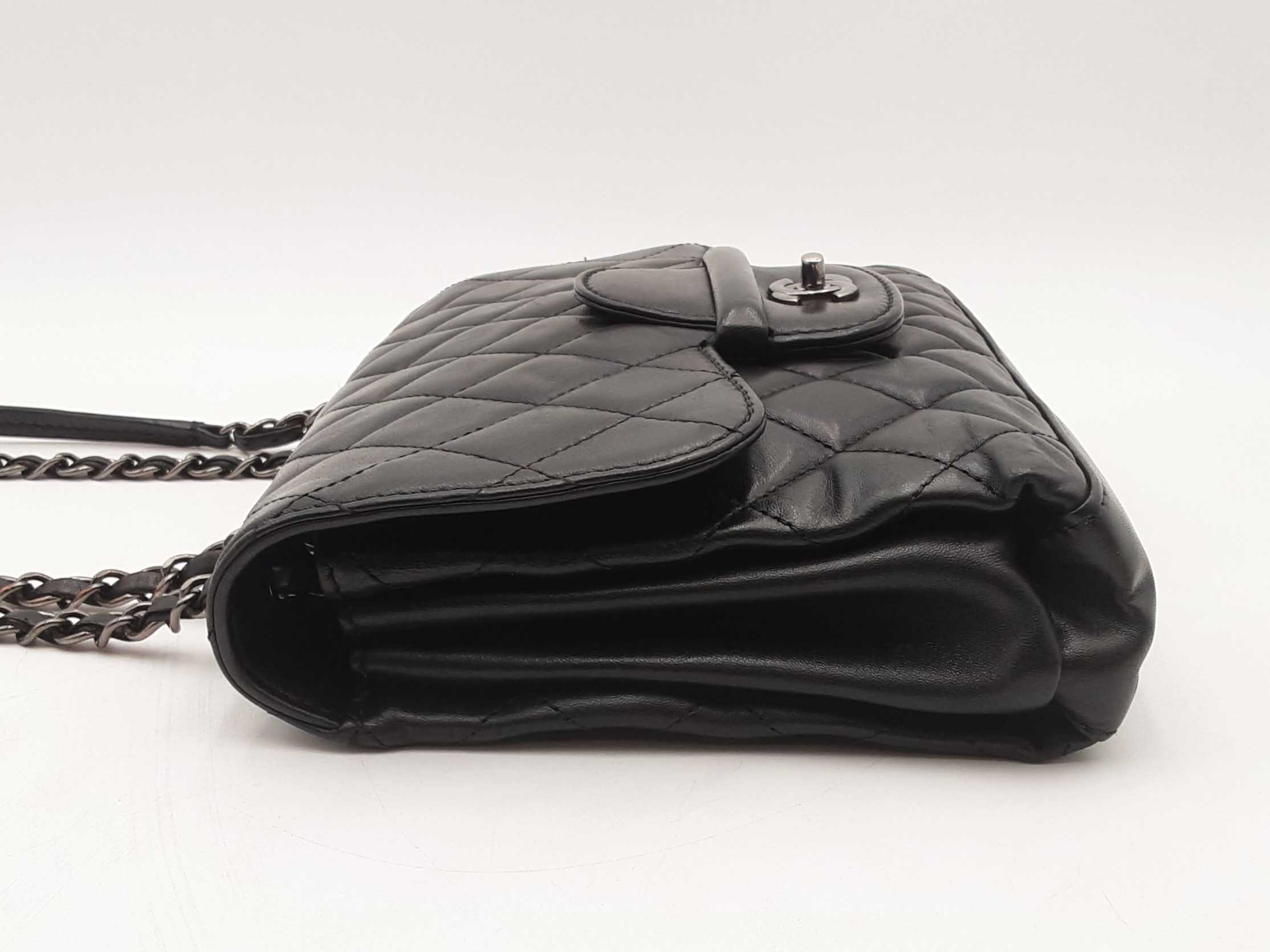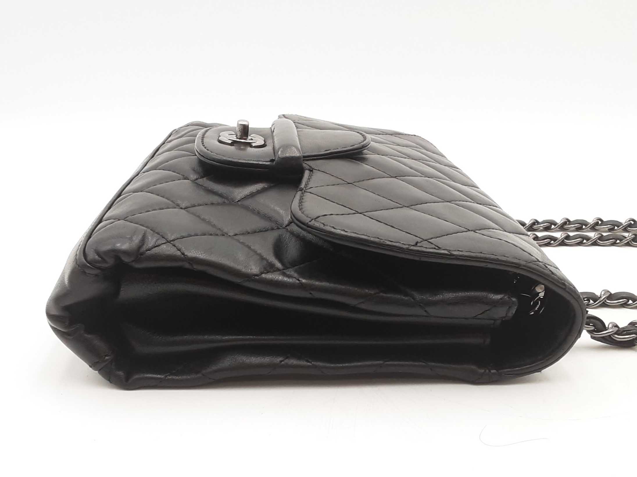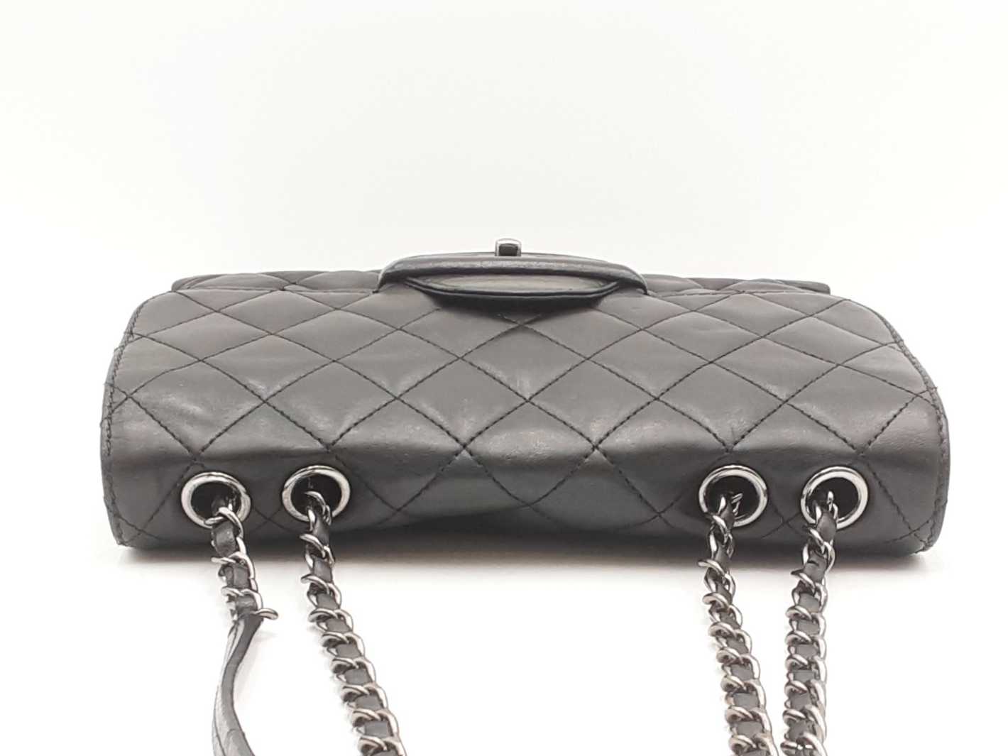 144010062942Chanel Black Quilted Leather Classic Flap Bag. Dark Metallic Tone Hardware. Approximate measurements Height 8.5 IN X Length 10 IN X Width 2.5 IN. Handle drop IN 10, Shoulder Drop 19 IN. Great Pre-Owned Condition. Scratches on hardware, deeper ones on clasp. Scratches and imprints on exterior, mainly caused by strap. Dust and debris on interior. Entrupy Certificate #DM6JVWX