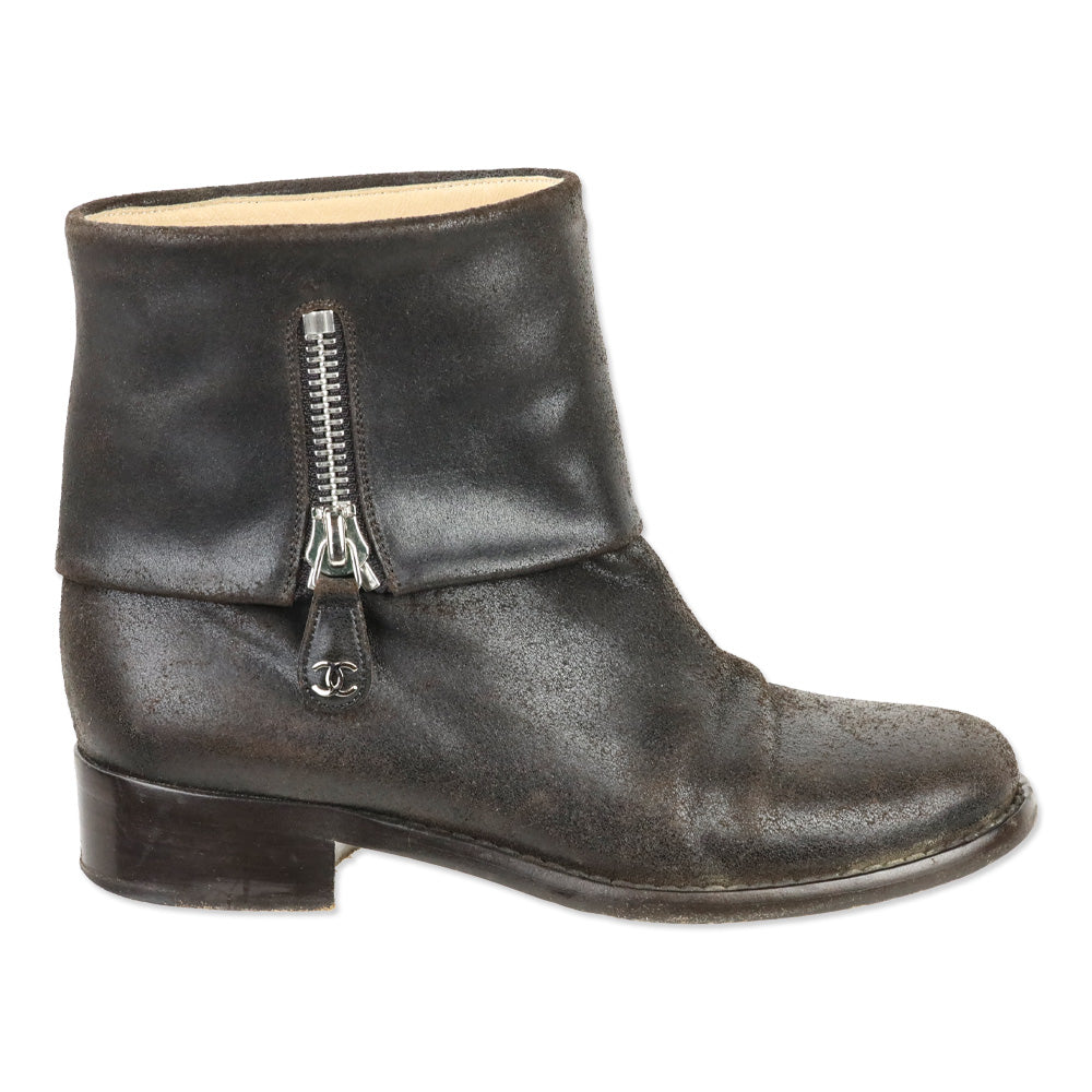 - Chanel Brown Distressed Leather Fold-Over Ankle Boots