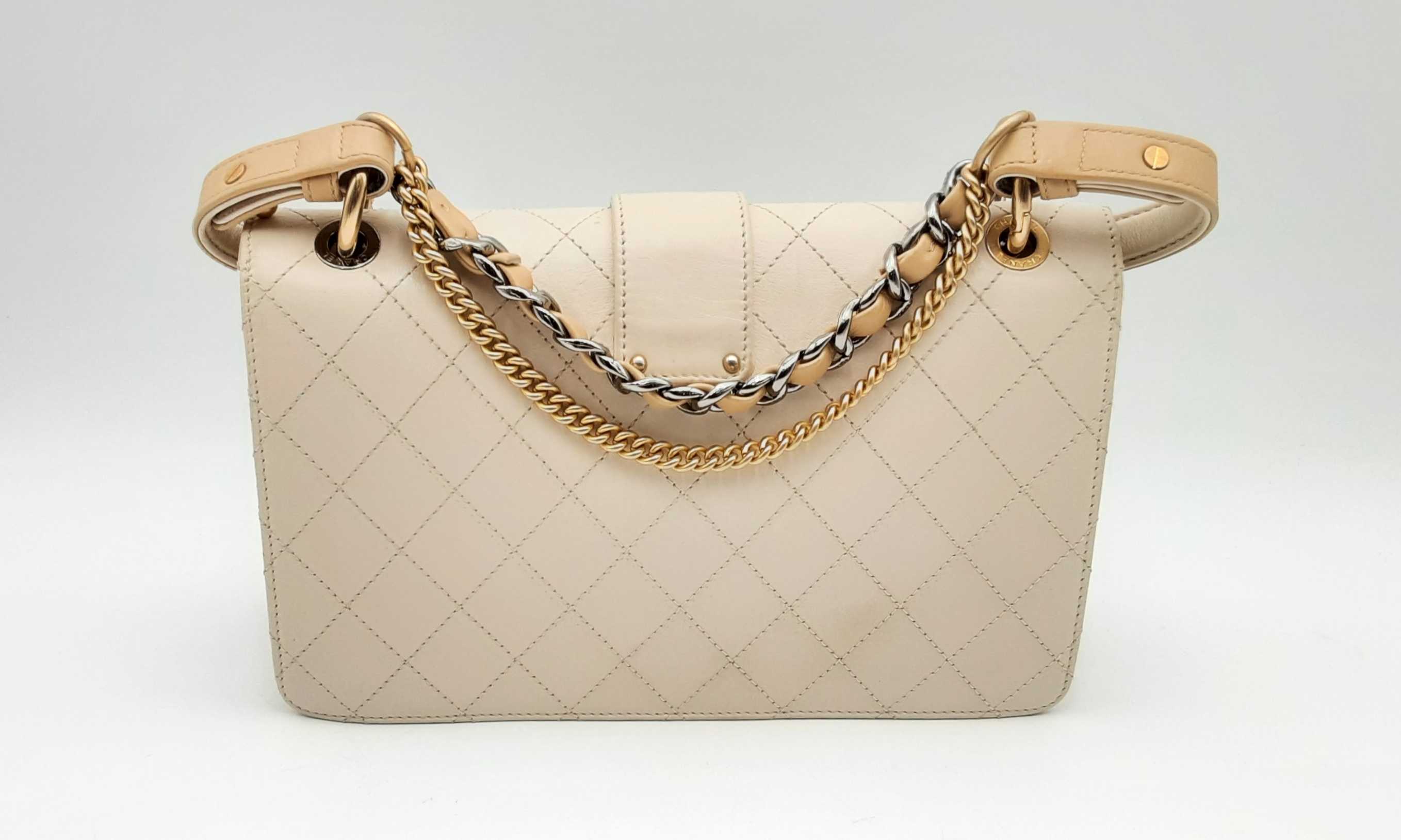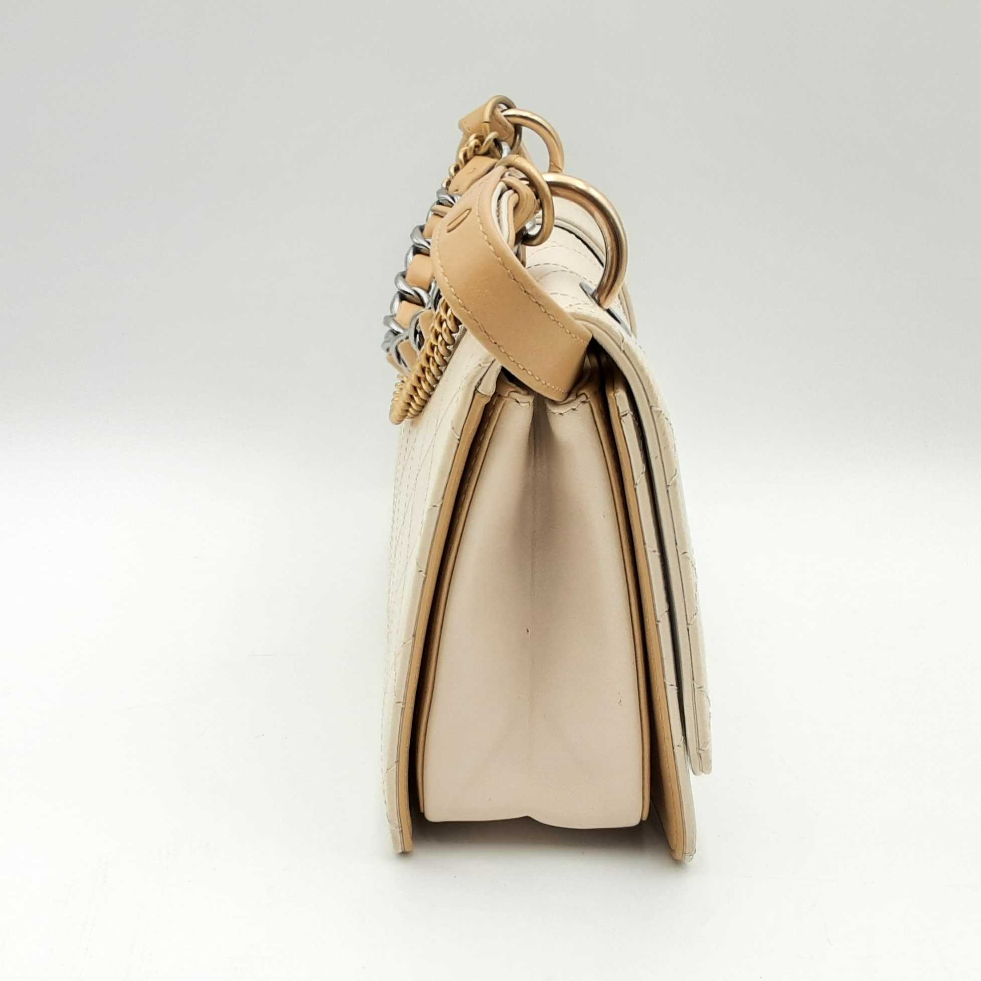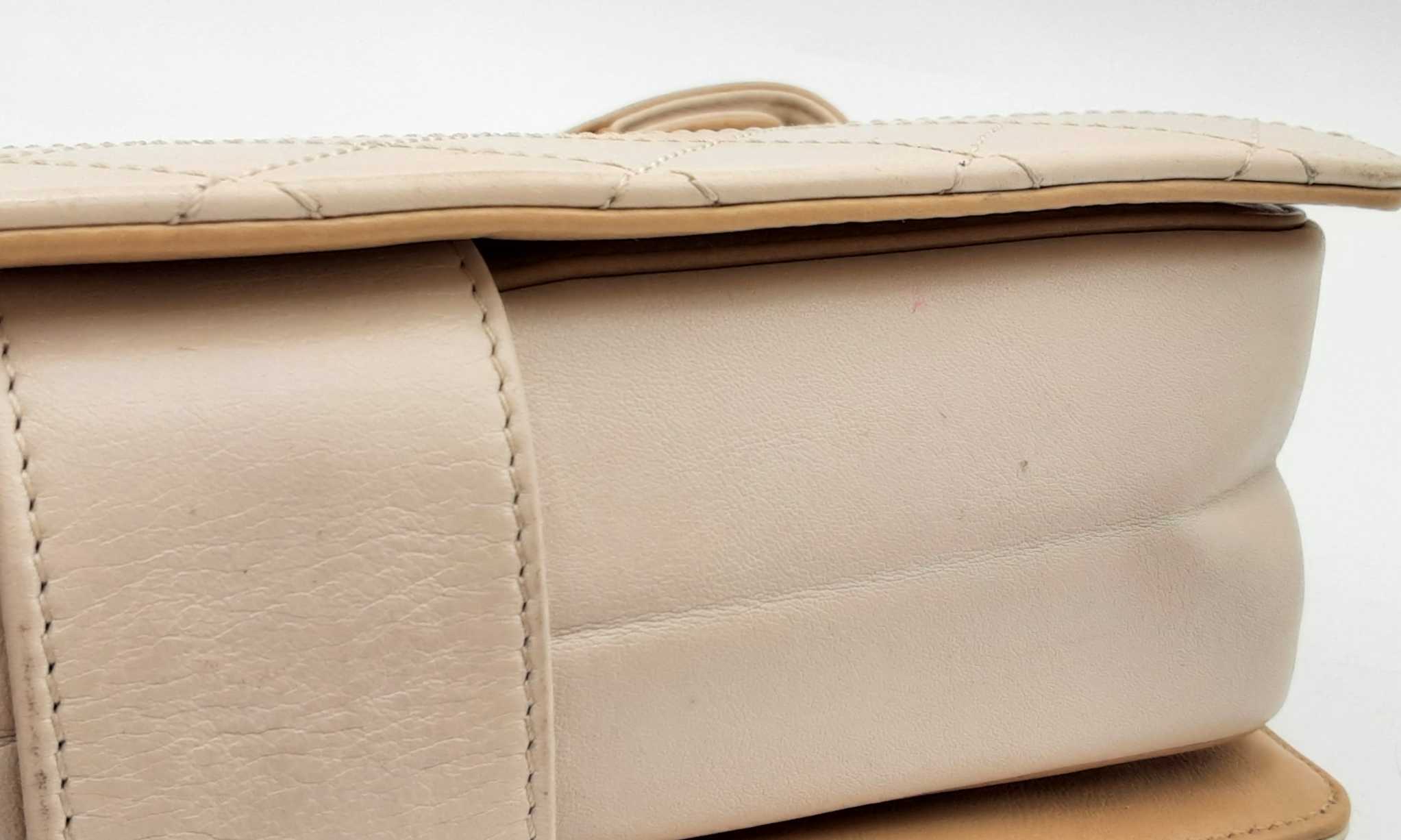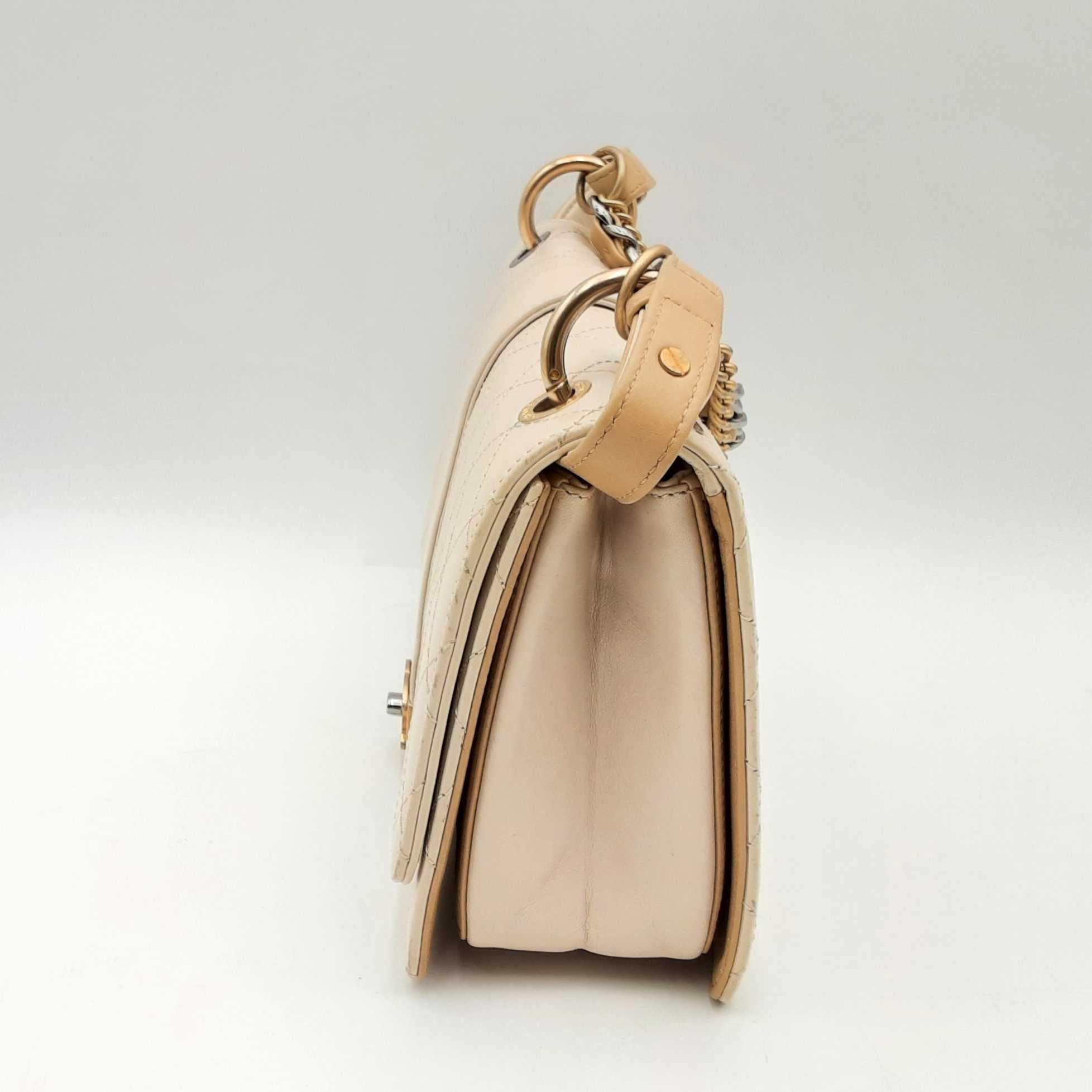 144010041719. Chanel Calfskin Stiched Flap Crossbody. 9.75 IN Length X 6 IN Height X 2.75 IN Width X 18 IN Drop. Good Pre-Owned Condition. Scratches on flap. Tarnish on hardware. Wear and marks present as shown in photos. Entrupy #ROB8DGG.