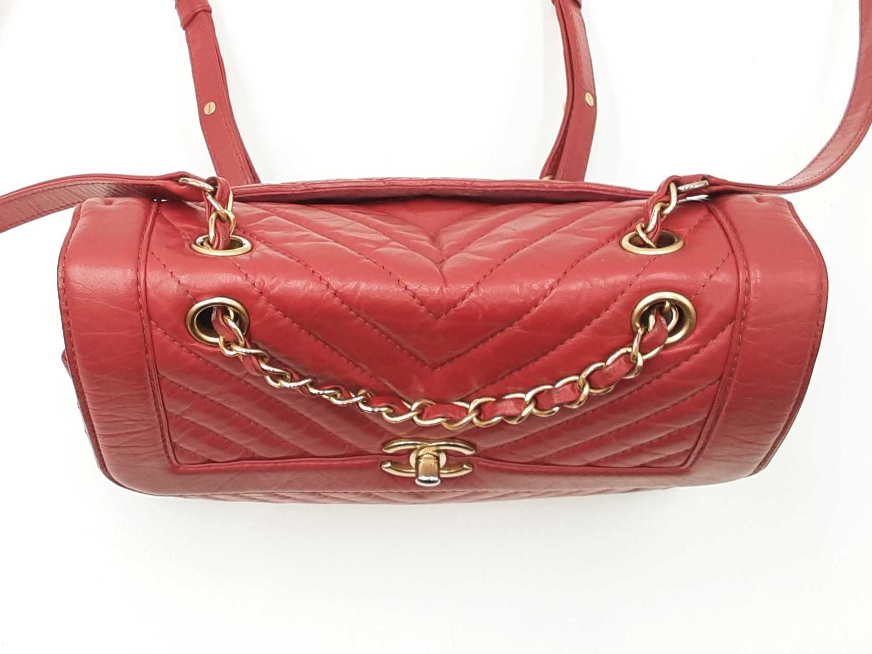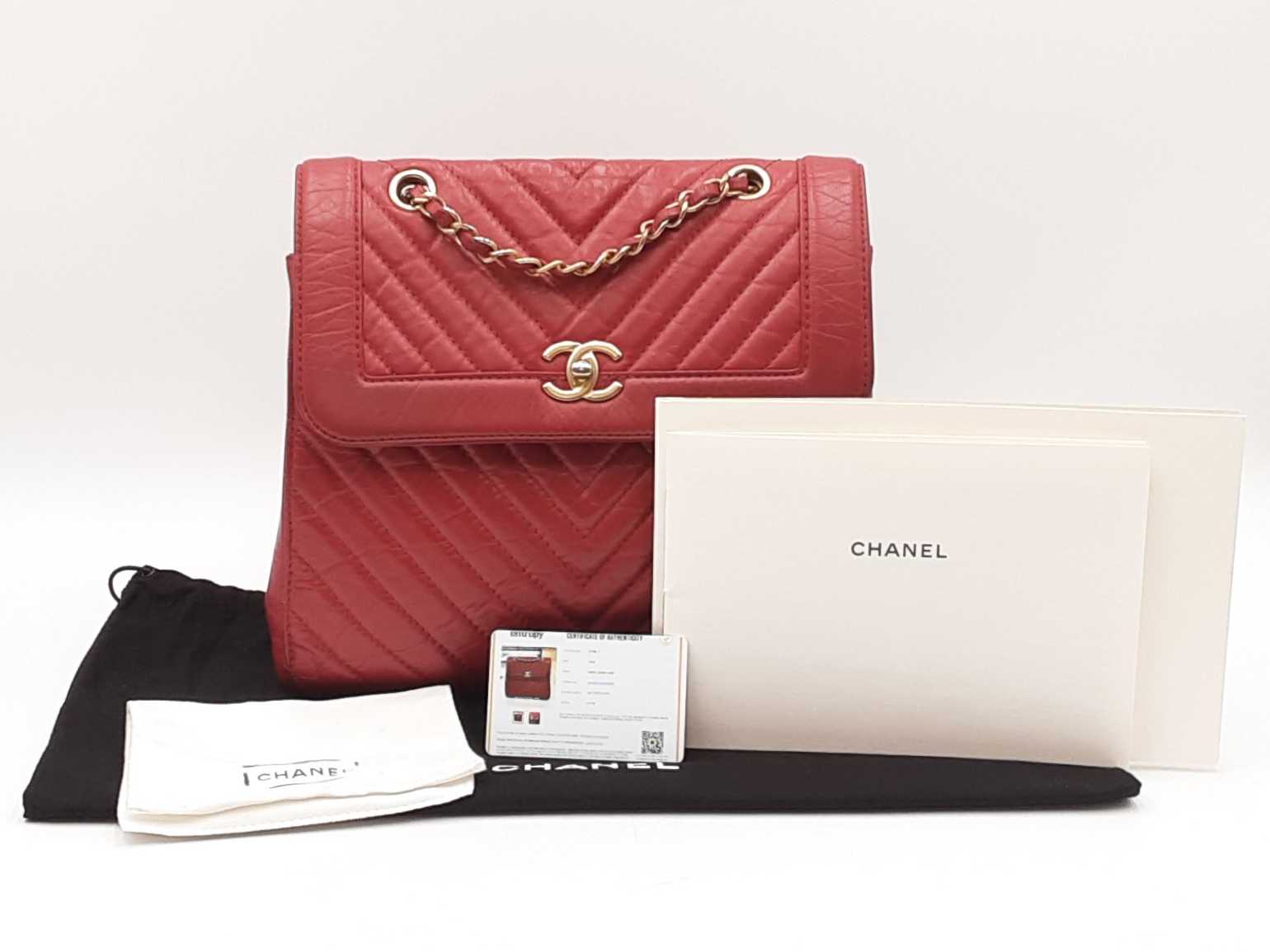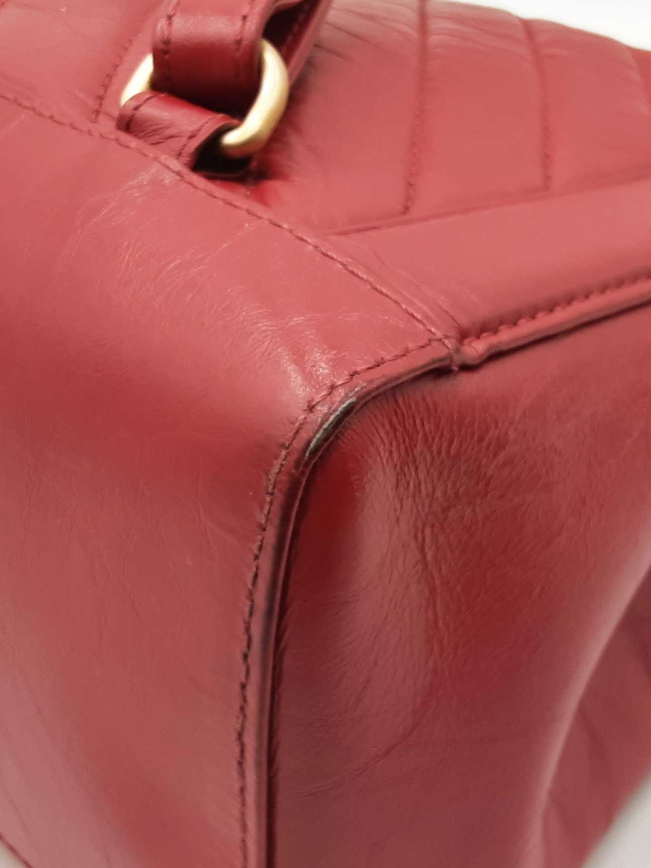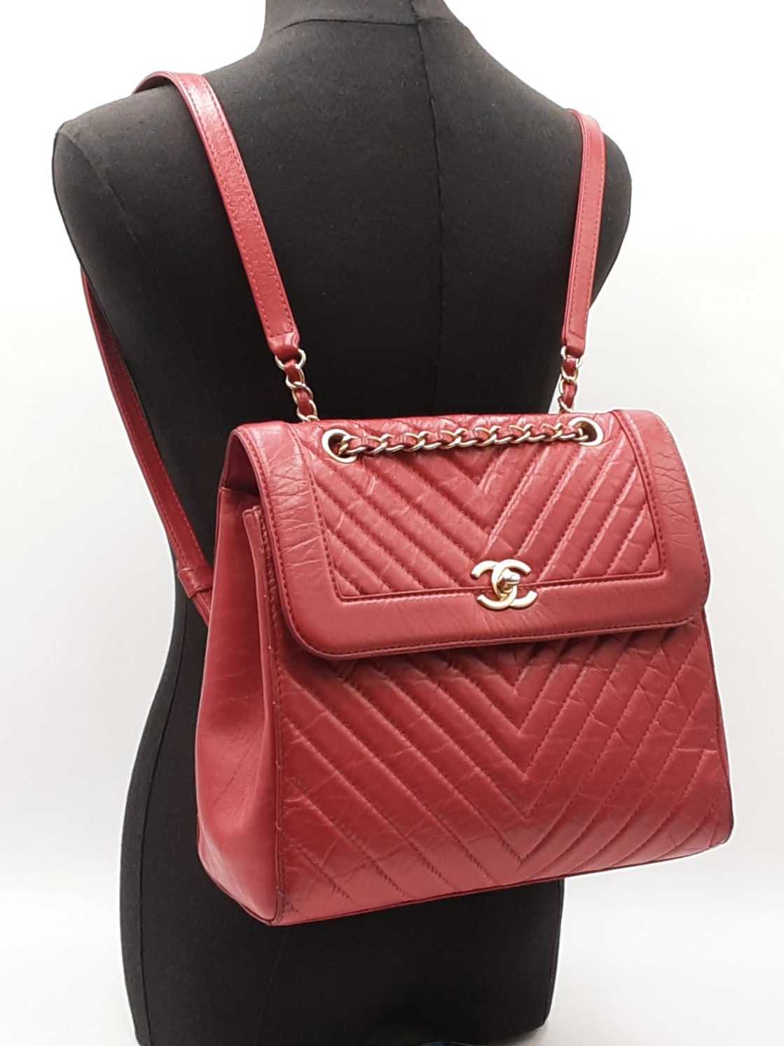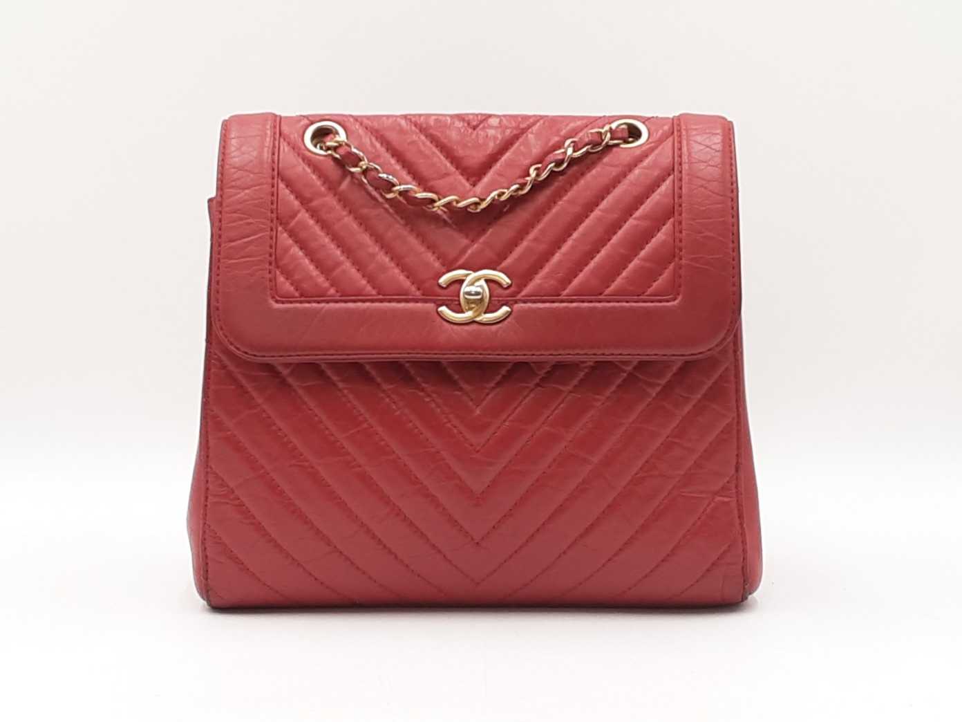 144030024971Chanel CC Chevron Quilted Red Calfskin Top Handle Satchel Backpack. Gold-Tone Hardware. Base Length 10.25 IN X Height 9 IN X Base Width 4.75 IN X Chain Handle Drop 3 IN, approximately. Good Pre-Owned Condition. Scratches on, and gold-tone finish wearing off of hardware. Wear, creasing, and scuffs throughout exterior leather, especially at corners and edges. Discolorations throughout interior fabric, and small spots on polishing cloth. Entrupy Certificate # RJX28VB