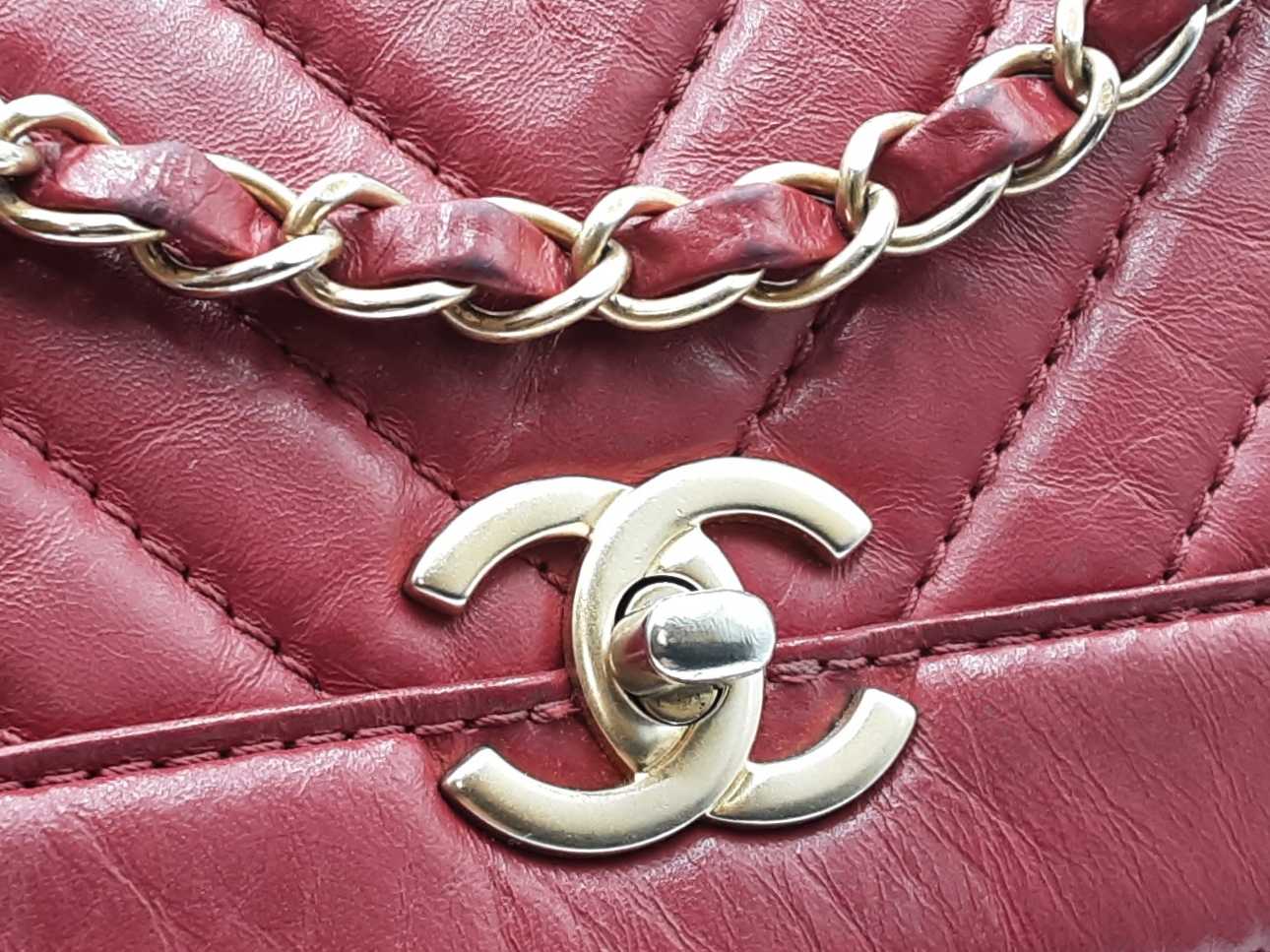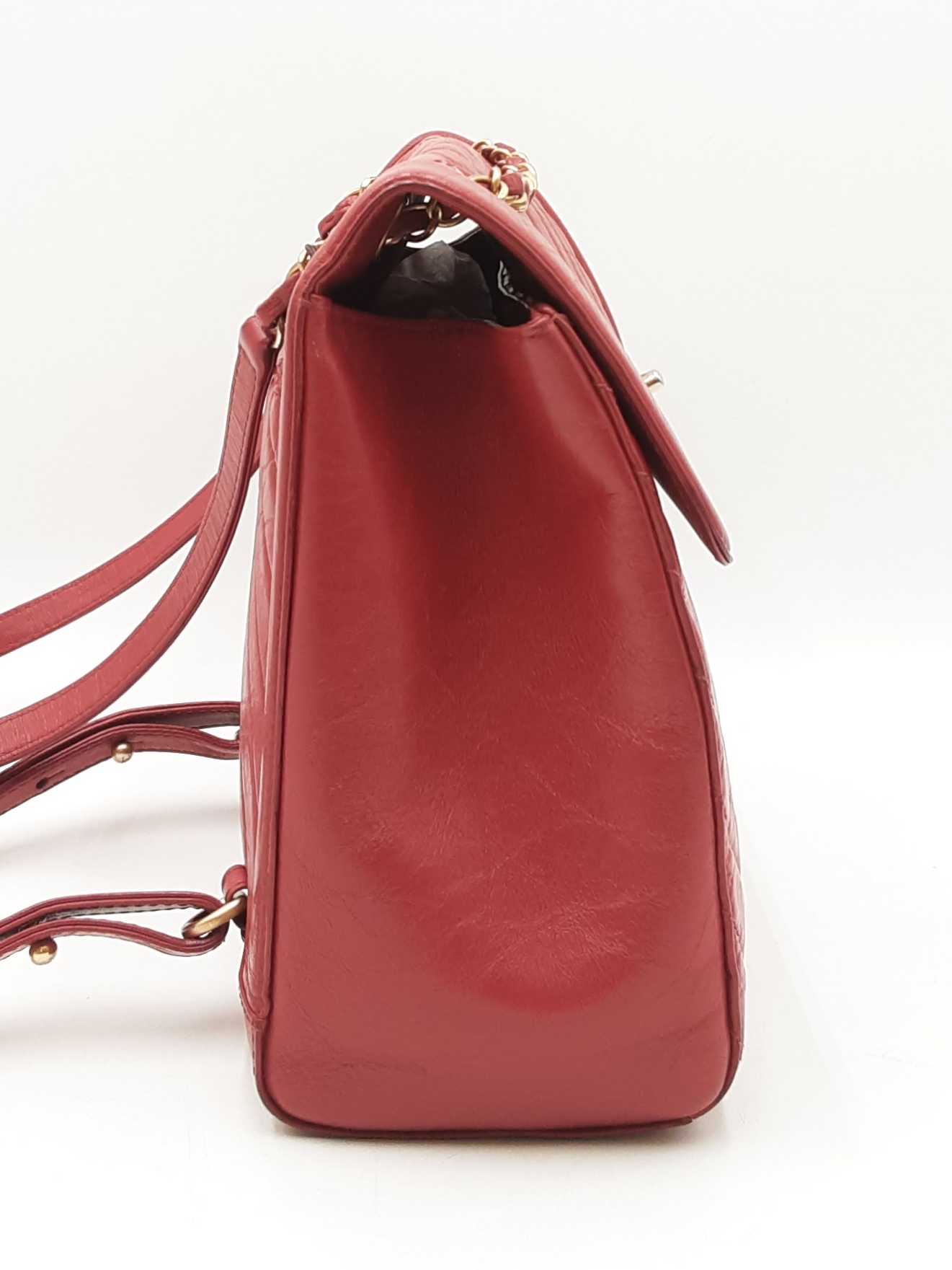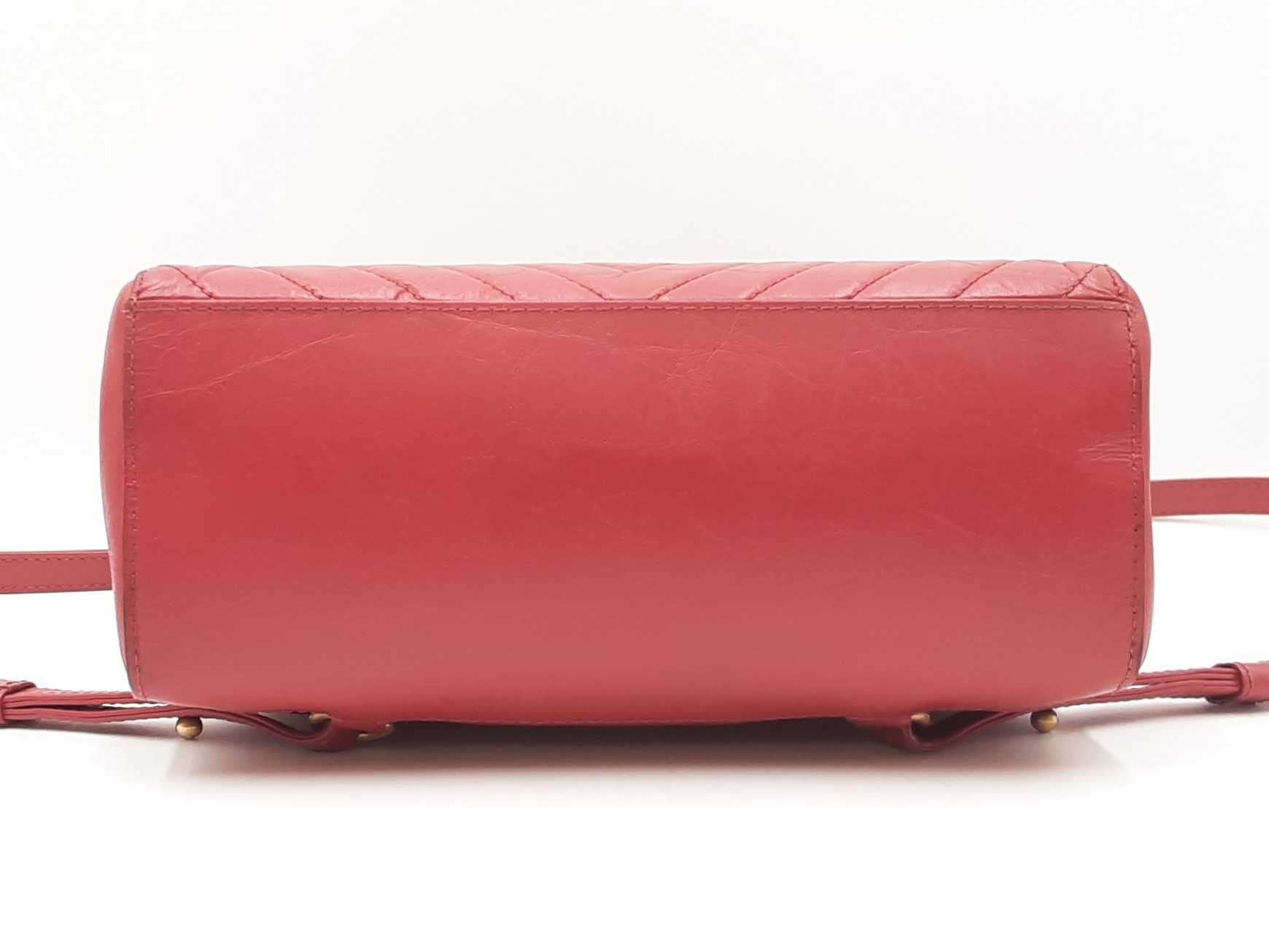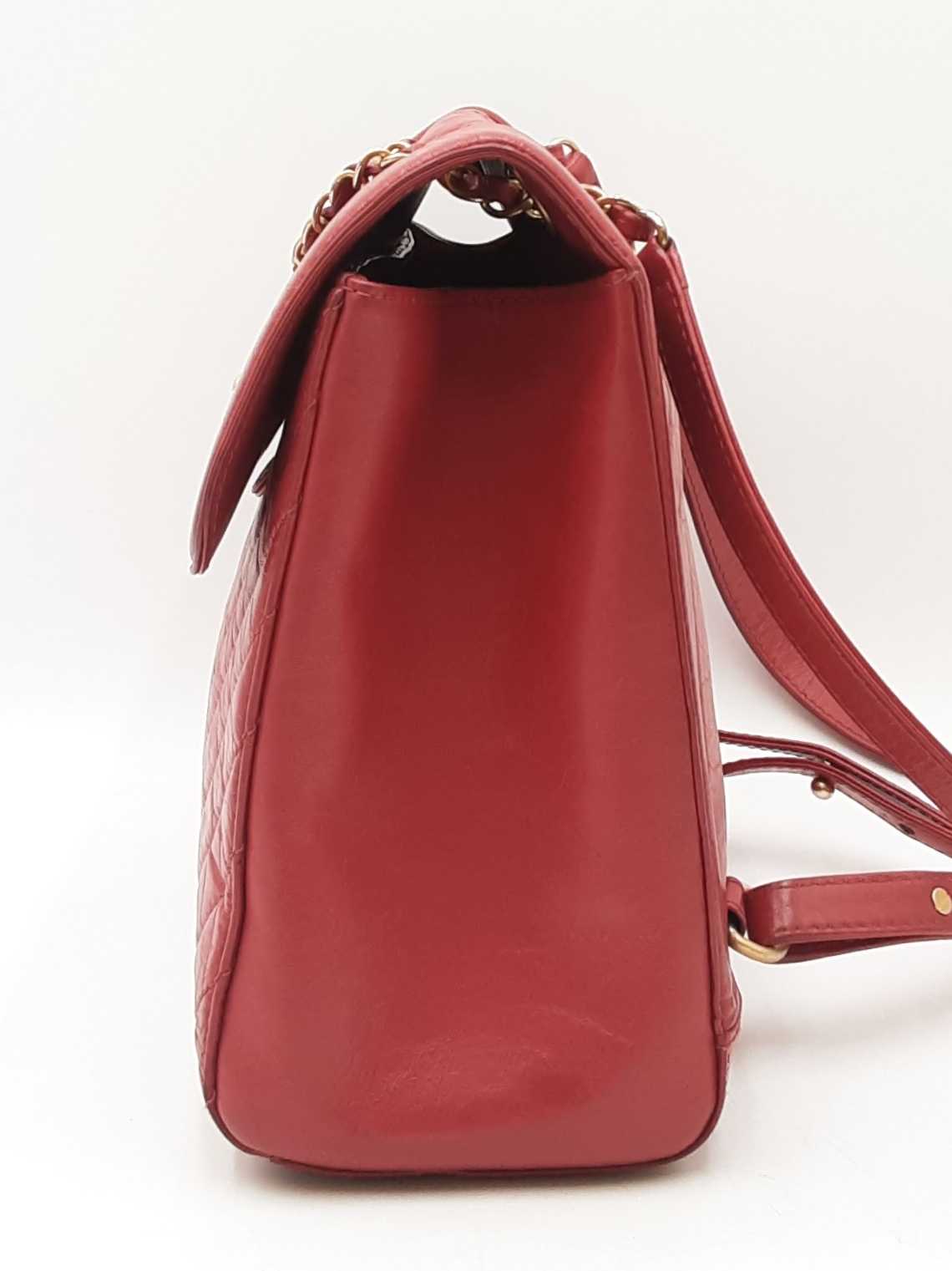 144030024971Chanel CC Chevron Quilted Red Calfskin Top Handle Satchel Backpack. Gold-Tone Hardware. Base Length 10.25 IN X Height 9 IN X Base Width 4.75 IN X Chain Handle Drop 3 IN, approximately. Good Pre-Owned Condition. Scratches on, and gold-tone finish wearing off of hardware. Wear, creasing, and scuffs throughout exterior leather, especially at corners and edges. Discolorations throughout interior fabric, and small spots on polishing cloth. Entrupy Certificate # RJX28VB