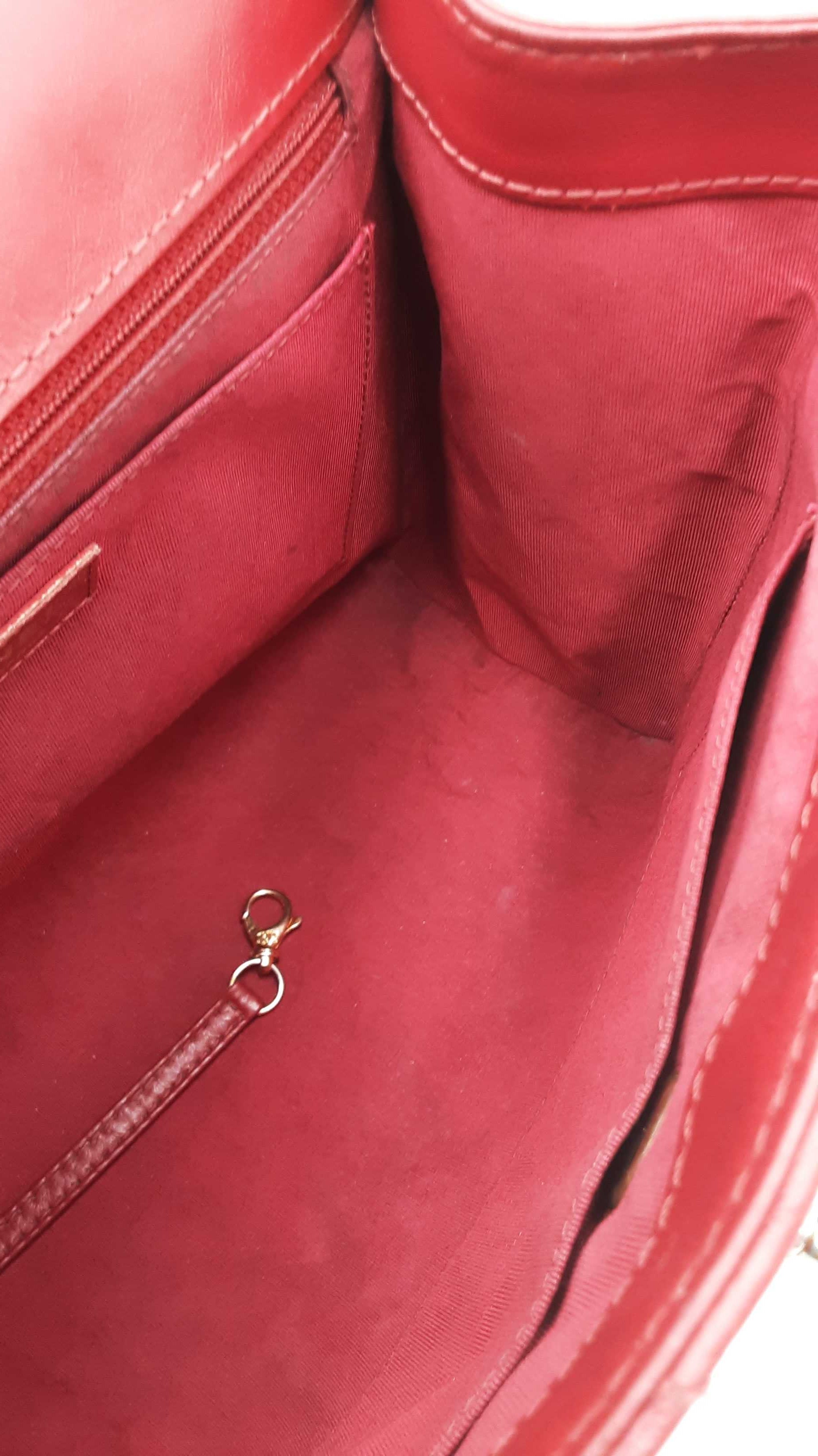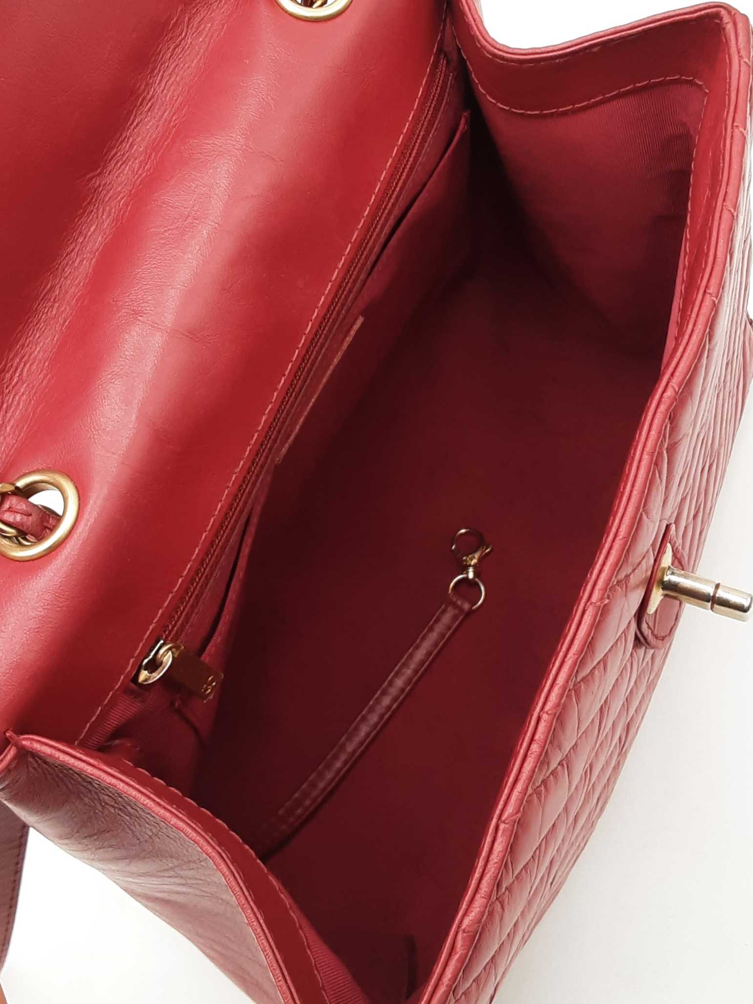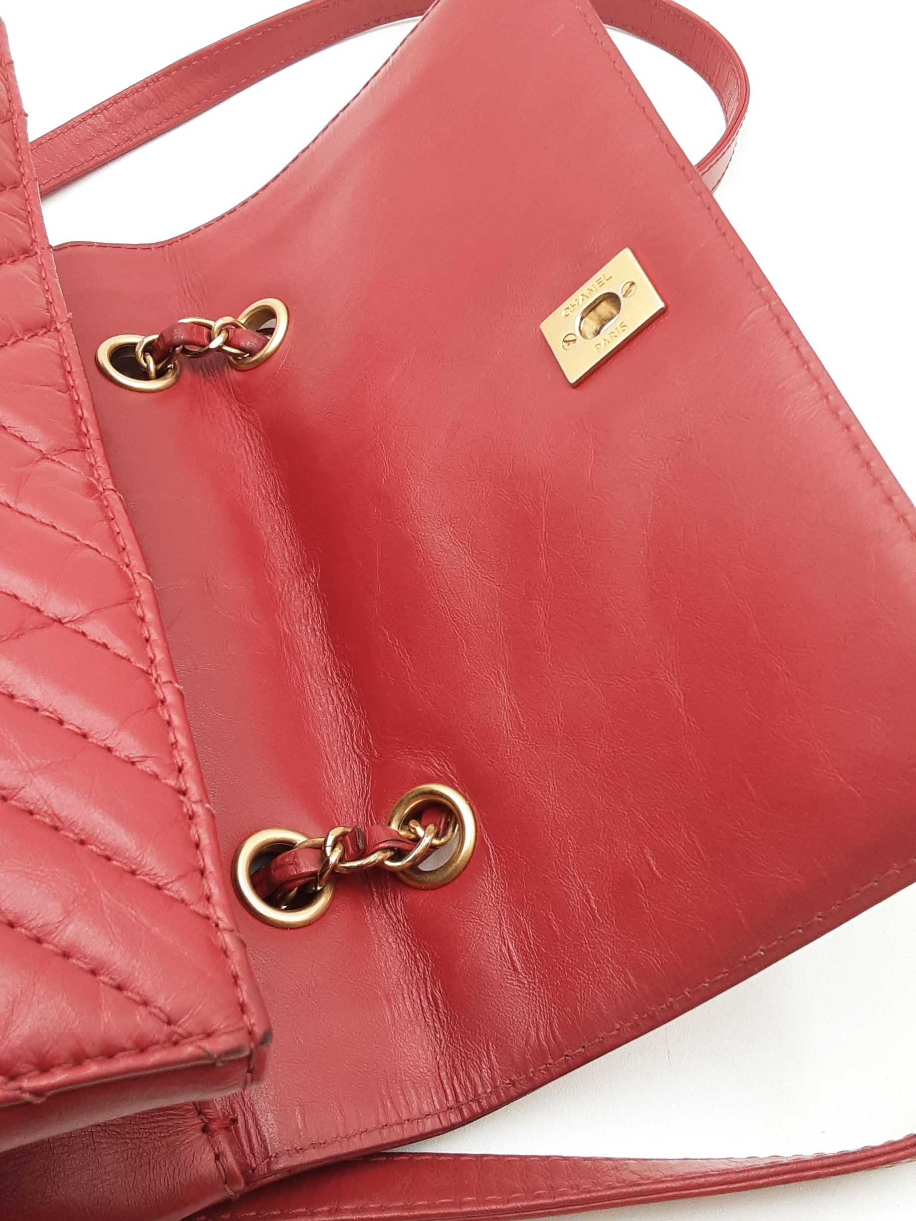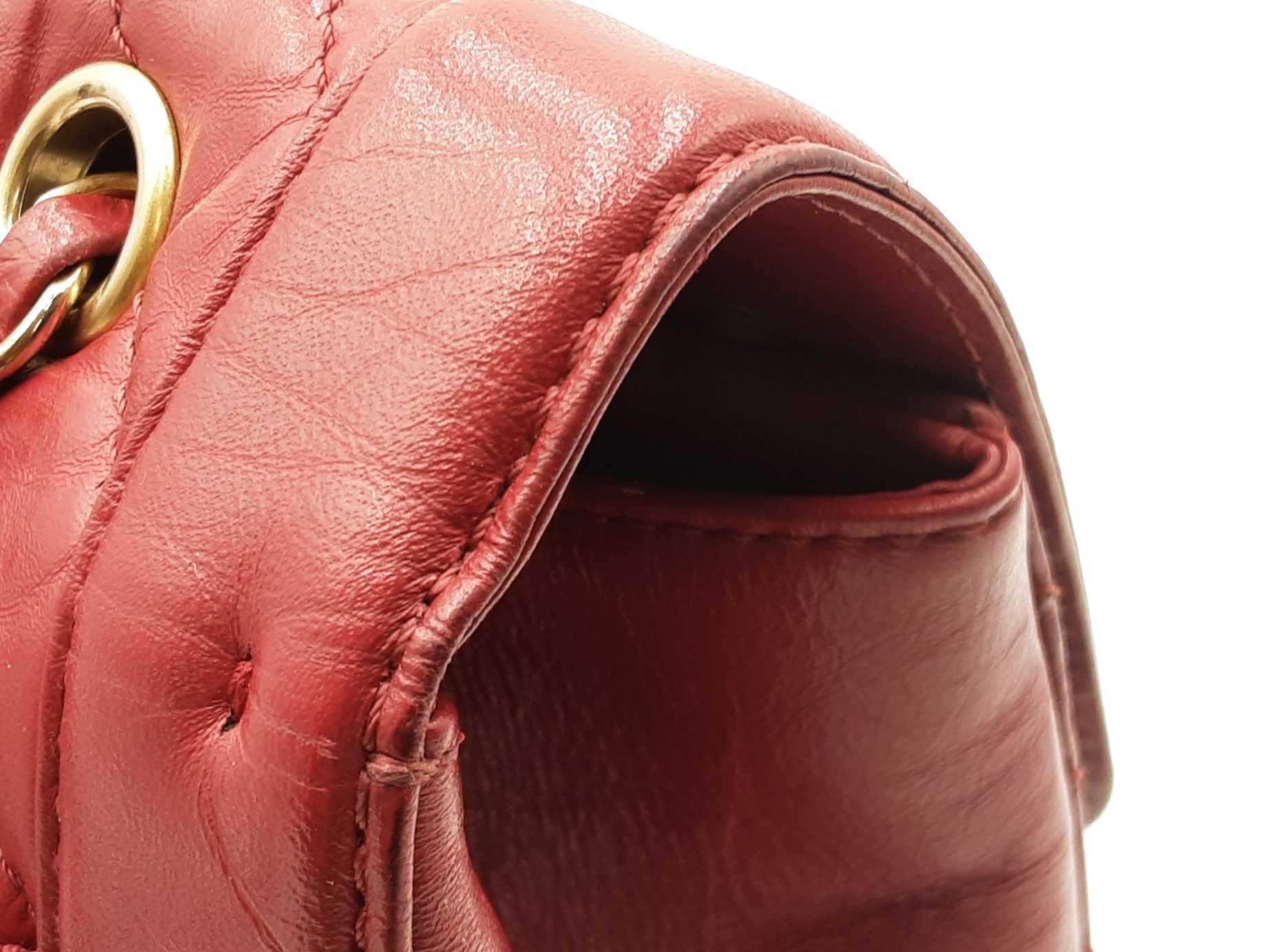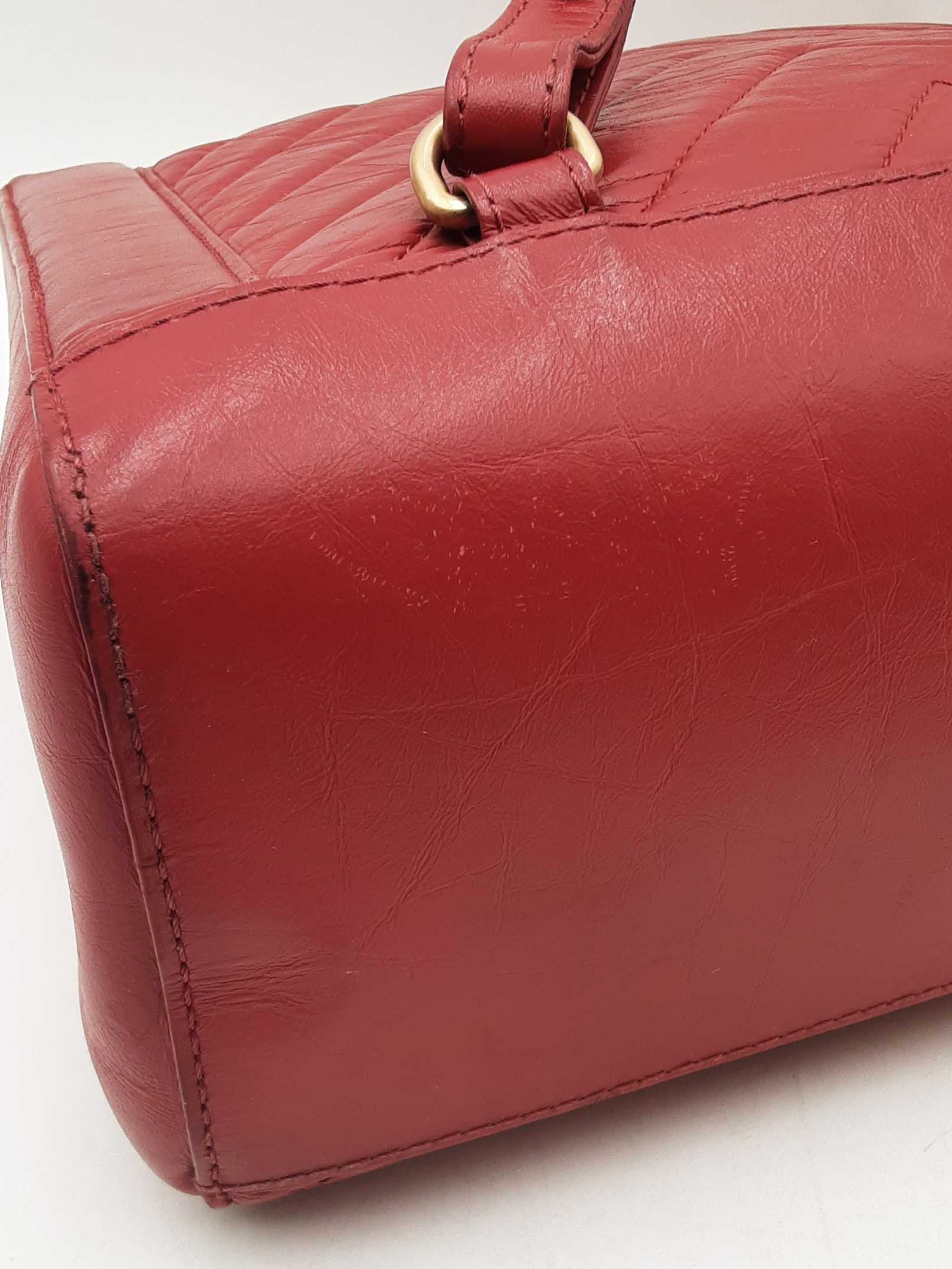 144030024971Chanel CC Chevron Quilted Red Calfskin Top Handle Satchel Backpack. Gold-Tone Hardware. Base Length 10.25 IN X Height 9 IN X Base Width 4.75 IN X Chain Handle Drop 3 IN, approximately. Good Pre-Owned Condition. Scratches on, and gold-tone finish wearing off of hardware. Wear, creasing, and scuffs throughout exterior leather, especially at corners and edges. Discolorations throughout interior fabric, and small spots on polishing cloth. Entrupy Certificate # RJX28VB