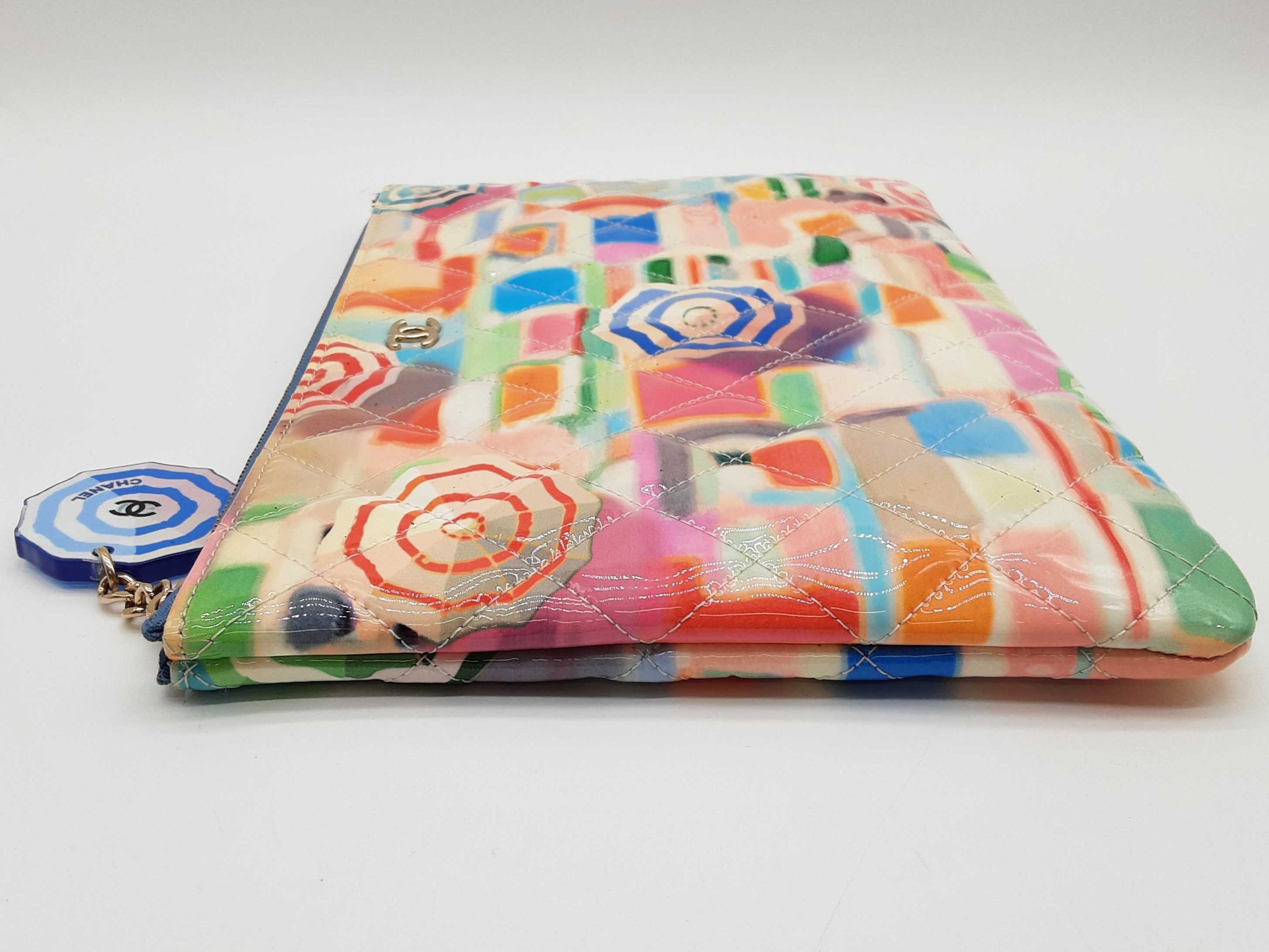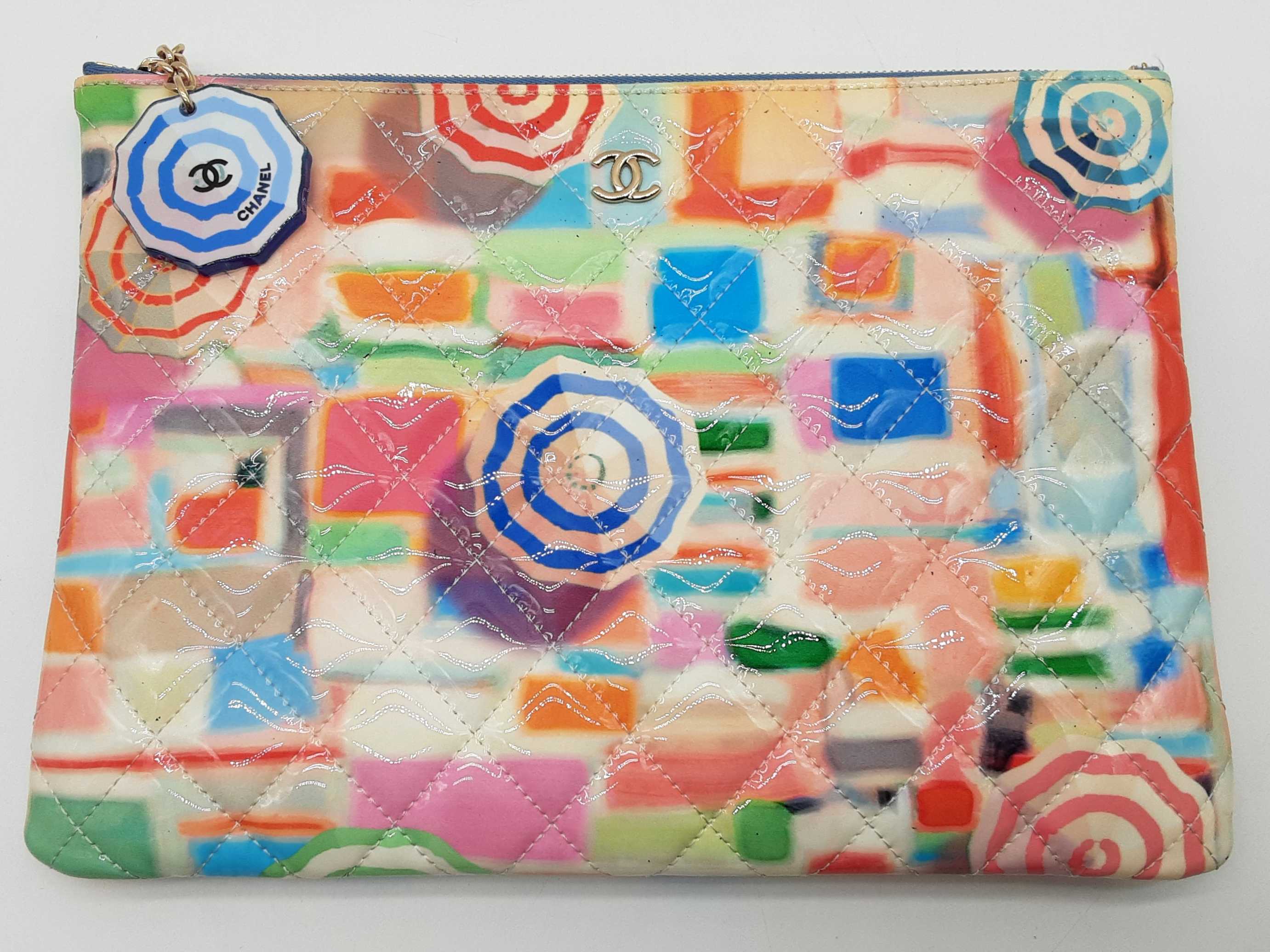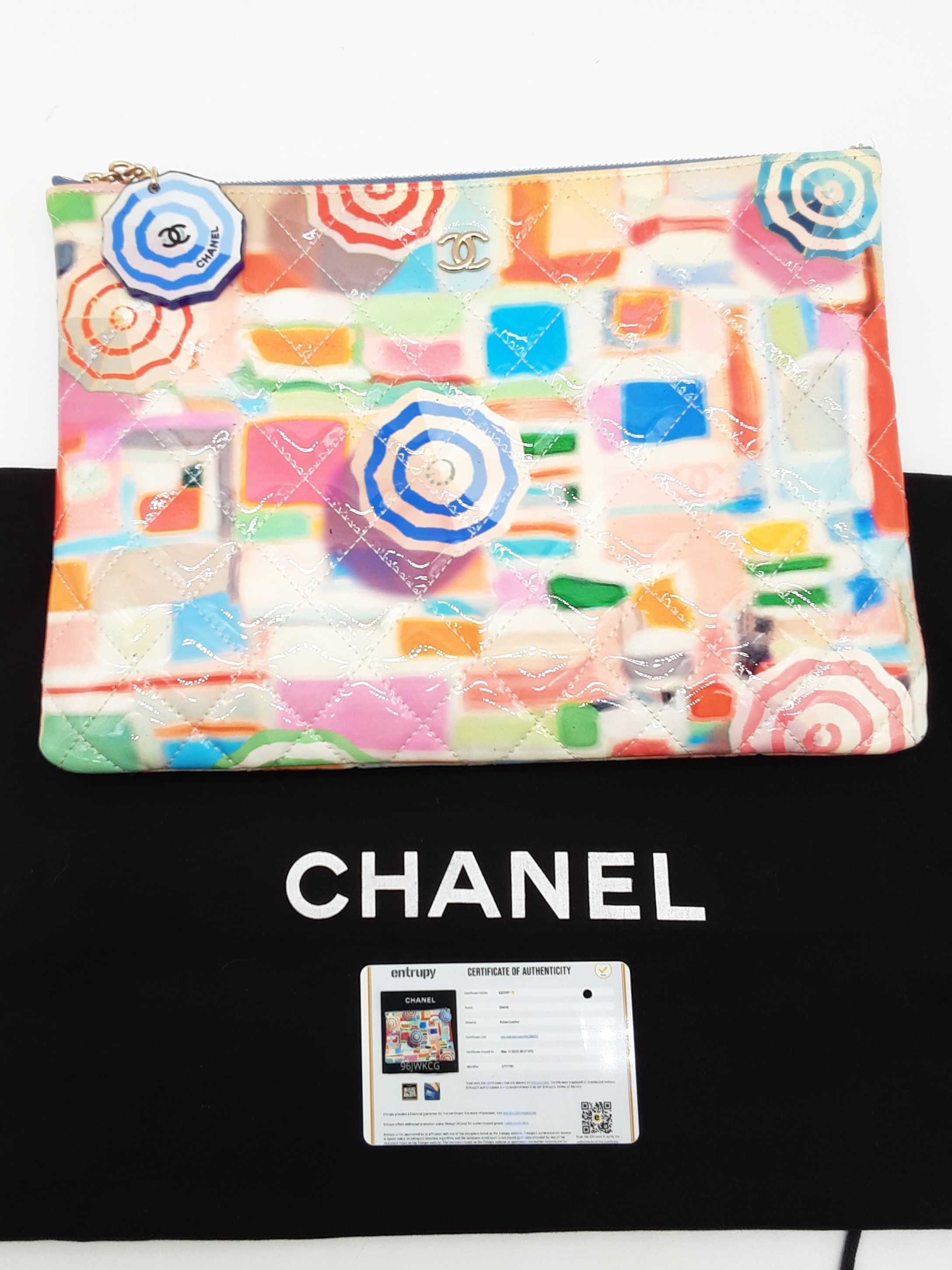 144020033284Chanel Charm O Case Veau Verni Multicolor Umbrella Patent Leather Pouch. Length 10.75 IN X Height 8 IN X Width 0.75 IN. Entrupy Certificate #96JWKCG. Good Pre-owned Condition with creases, marks on interior leather and exterior, and scratches on acrylic charm.
