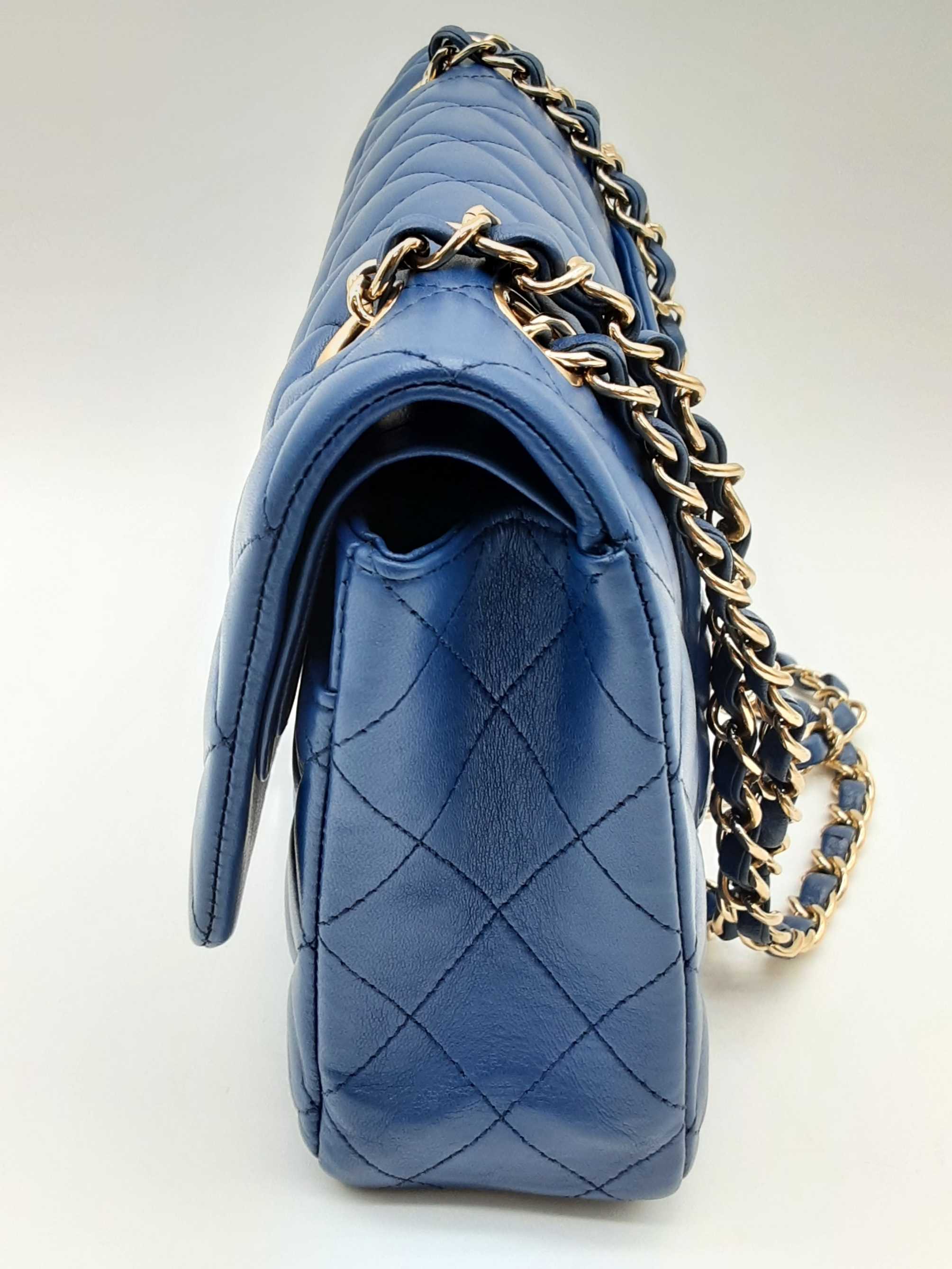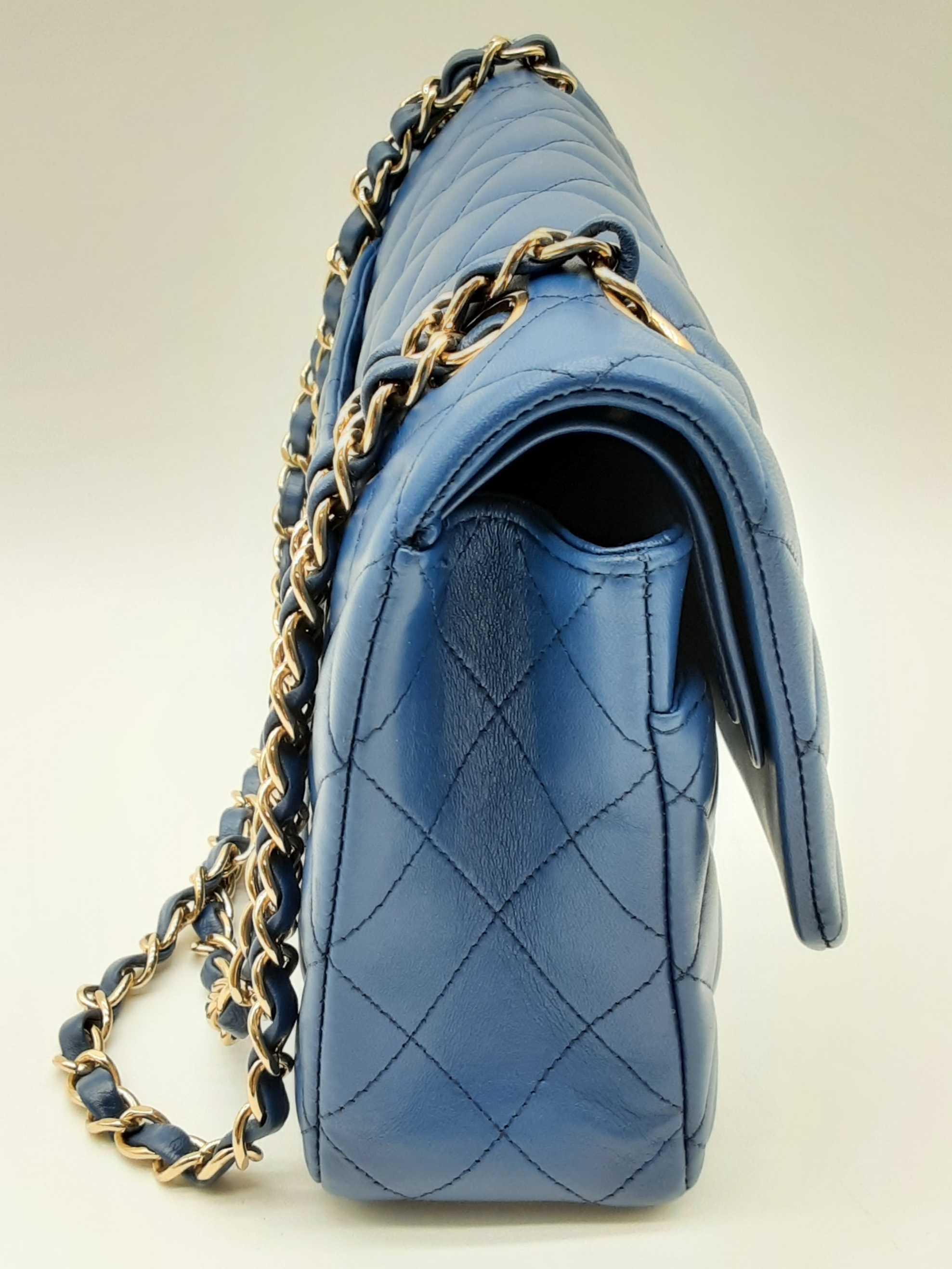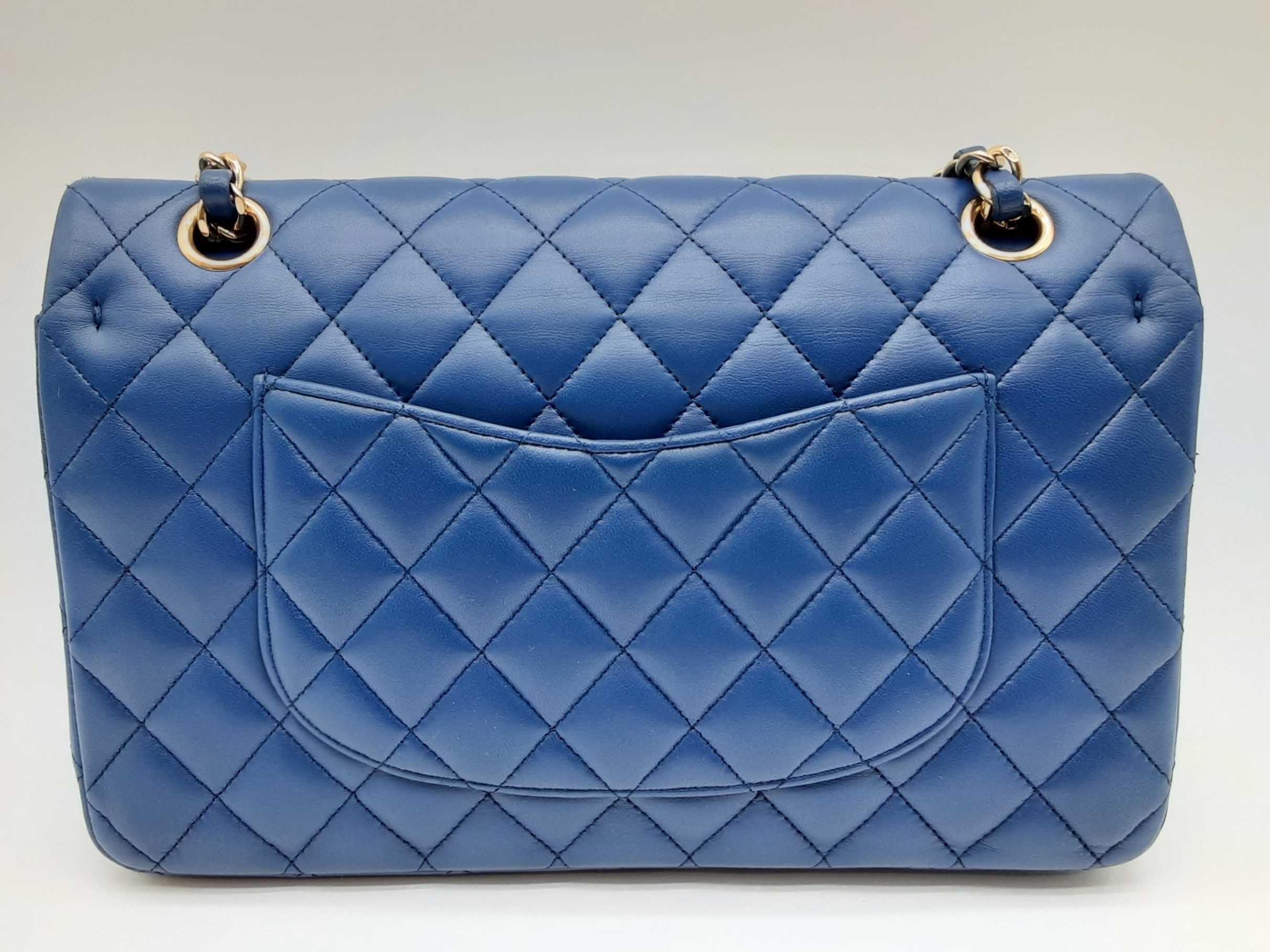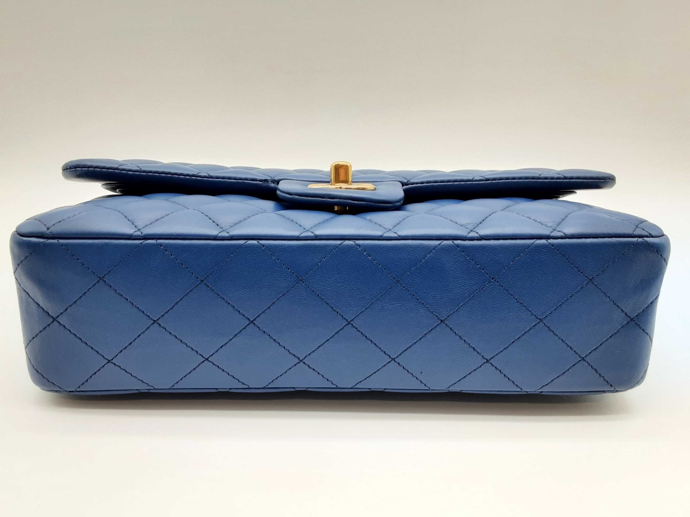 144020028431Chanel Classic Double Flap Blue Quilted Lambskin Leather Gold Hardware Shoulder Bag. Length 10 IN X Height 6.5 IN X Width 2.5 IN X Drop 9.5 to 17 IN. Great Pre-owned Condition with bag leaning forward, creases, scratches and wear on metal hardware, scratches under second flap and on inside of front pocket, and indentations on top of second flap and in front pocket.