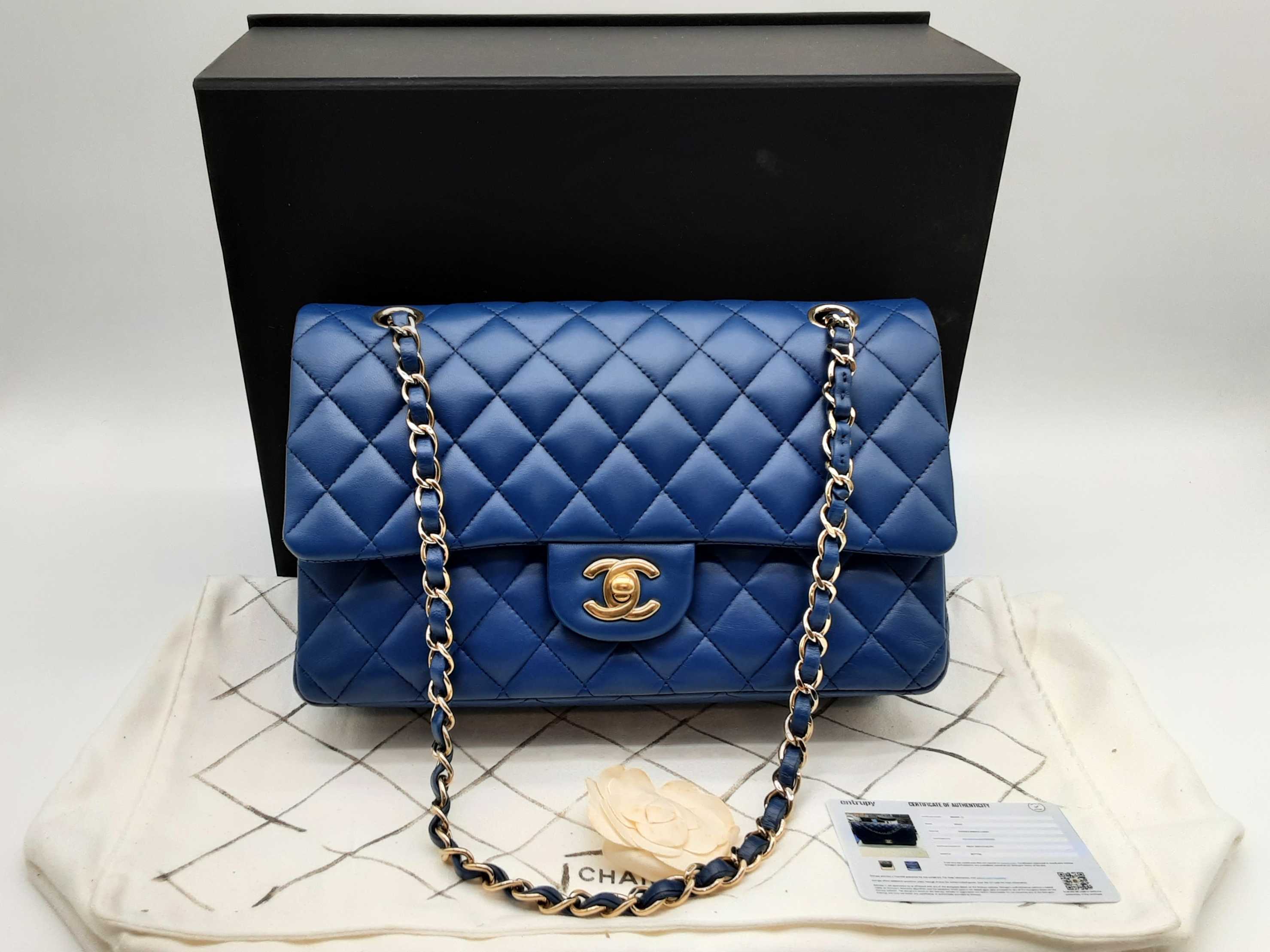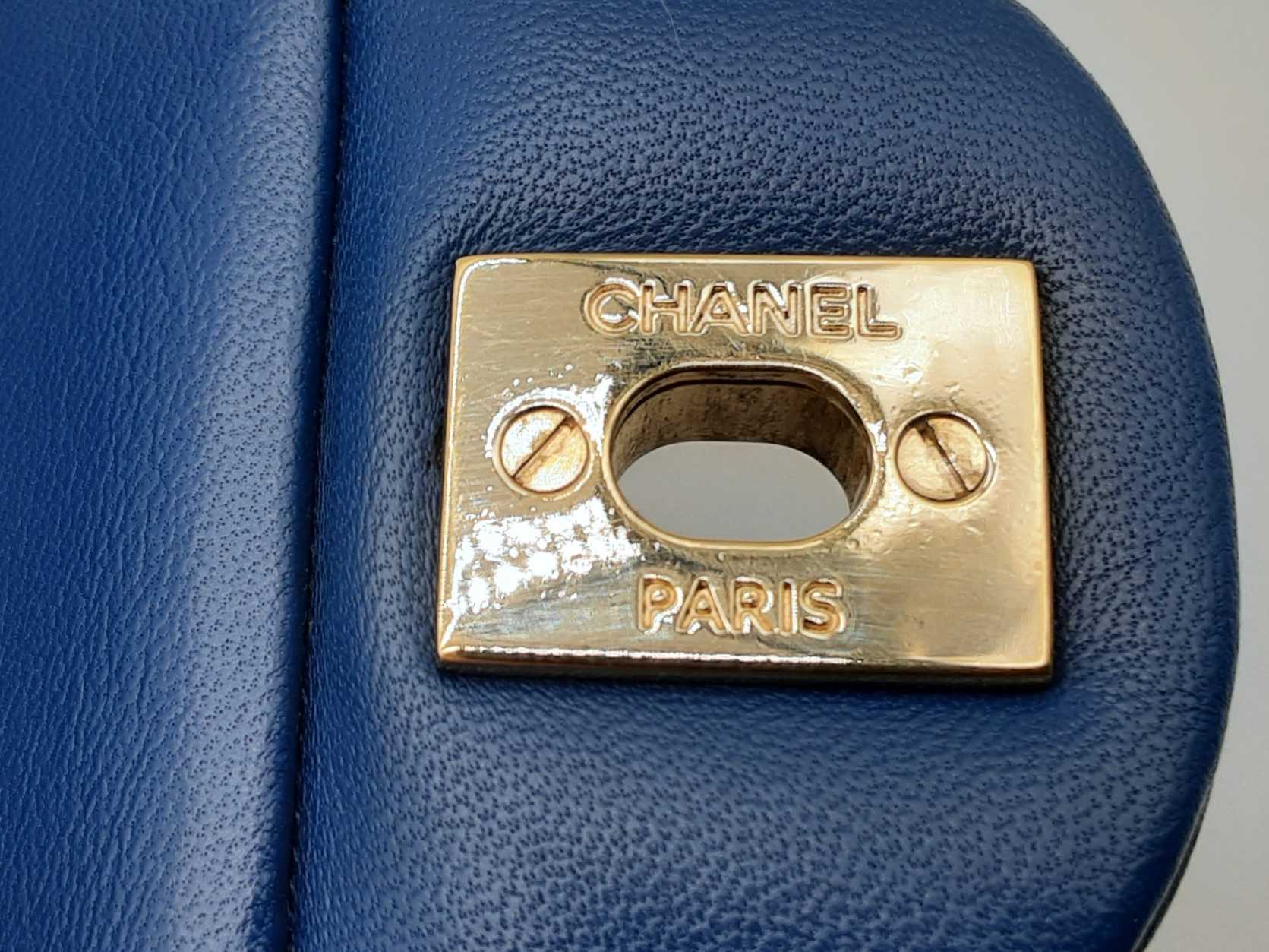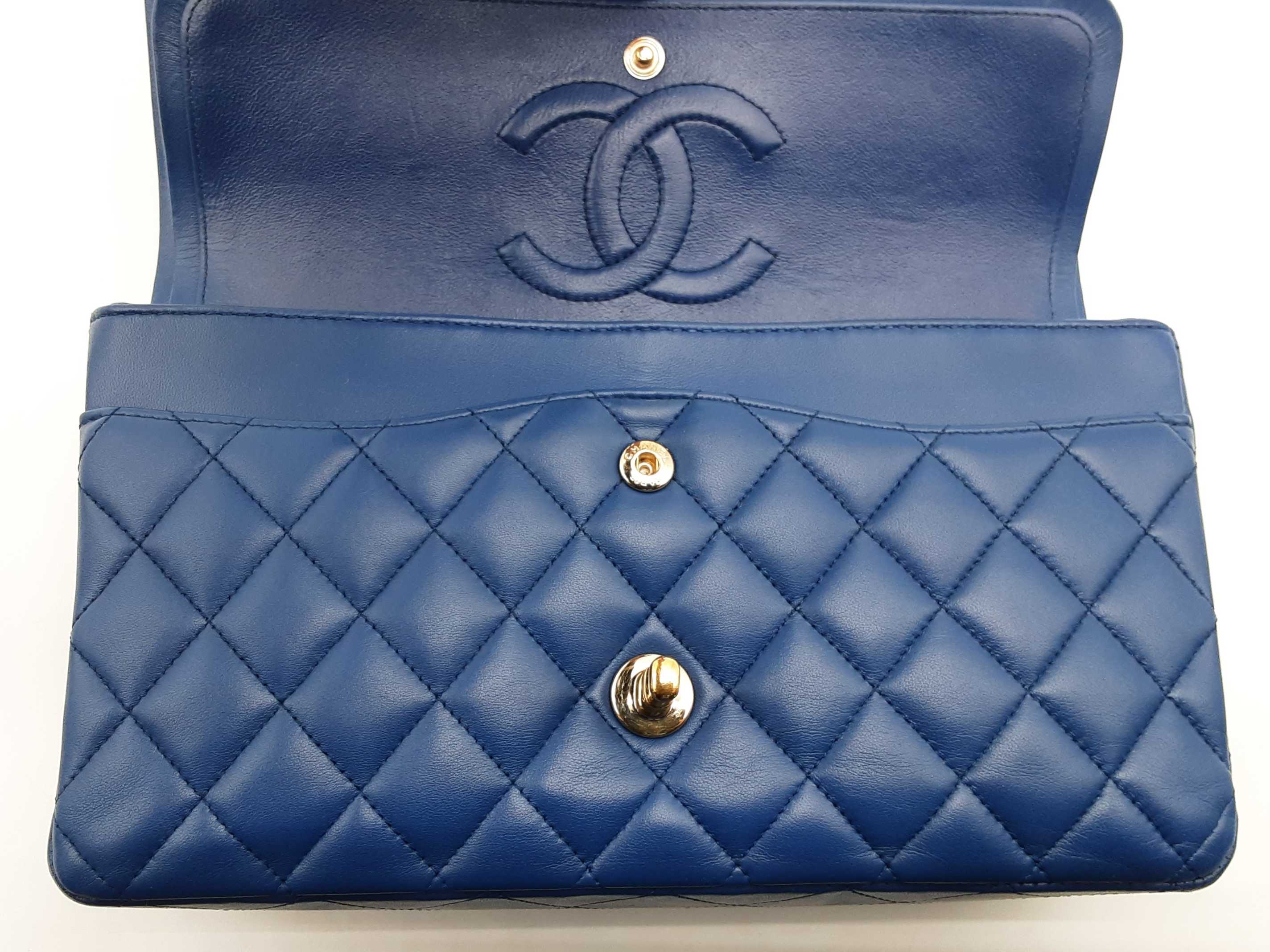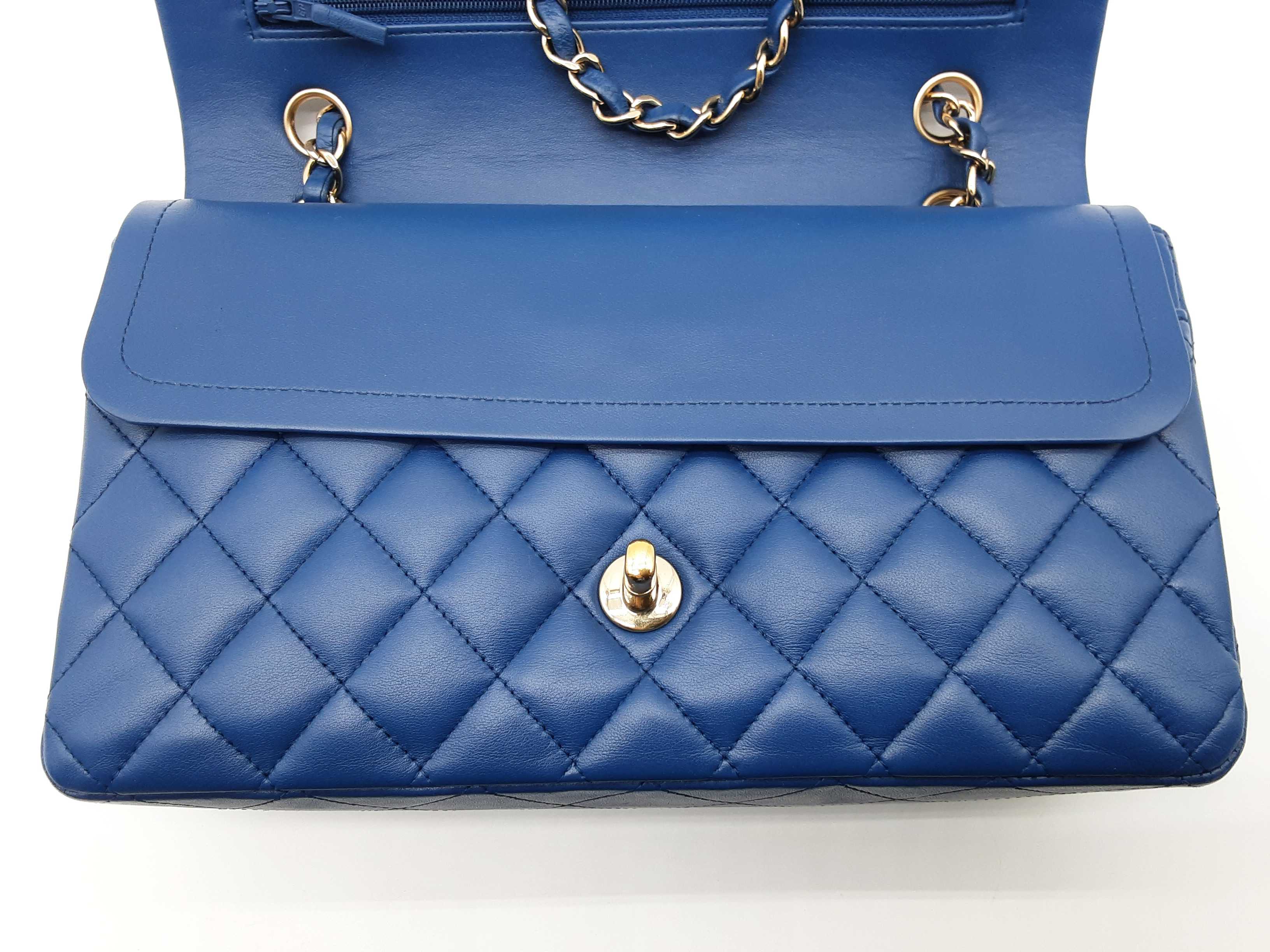 144020028431Chanel Classic Double Flap Blue Quilted Lambskin Leather Gold Hardware Shoulder Bag. Length 10 IN X Height 6.5 IN X Width 2.5 IN X Drop 9.5 to 17 IN. Great Pre-owned Condition with bag leaning forward, creases, scratches and wear on metal hardware, scratches under second flap and on inside of front pocket, and indentations on top of second flap and in front pocket.