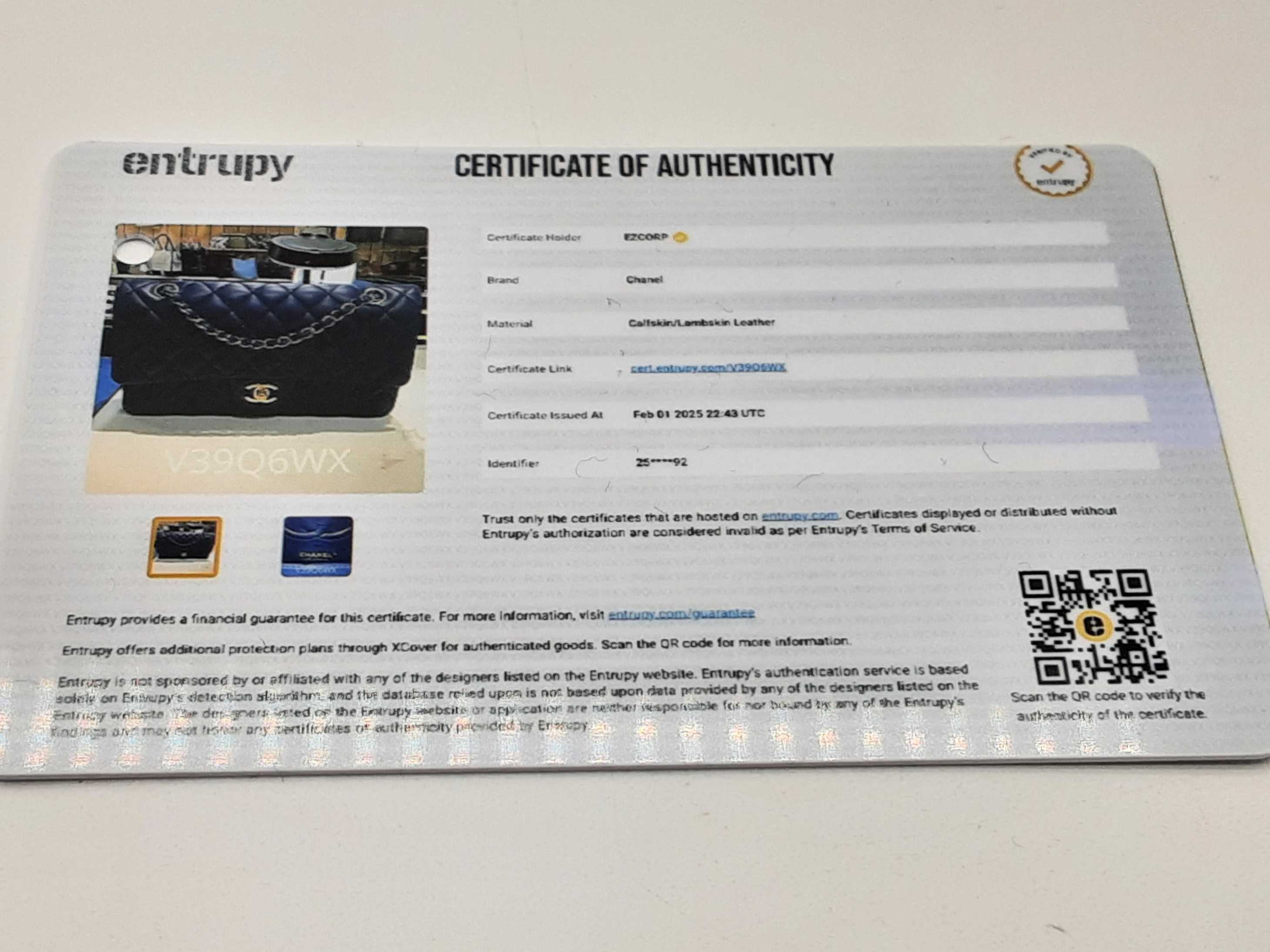 Entrupy Certificate Card, Box, Dust Bag