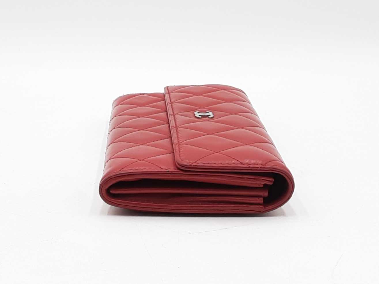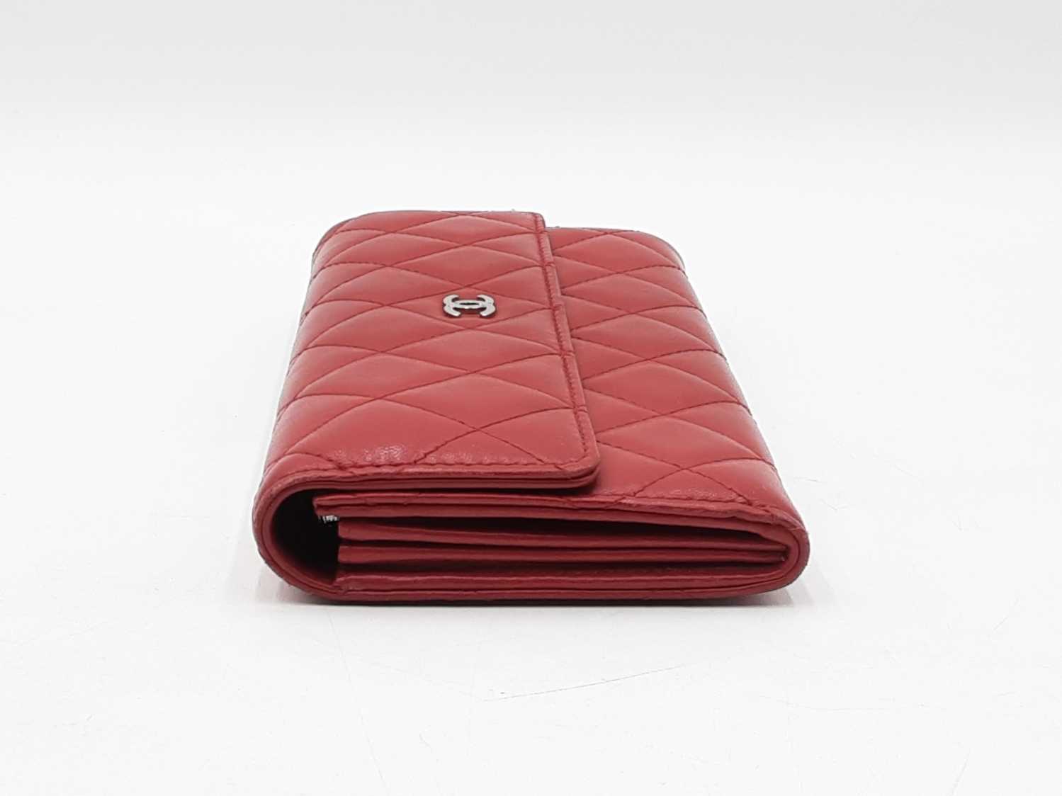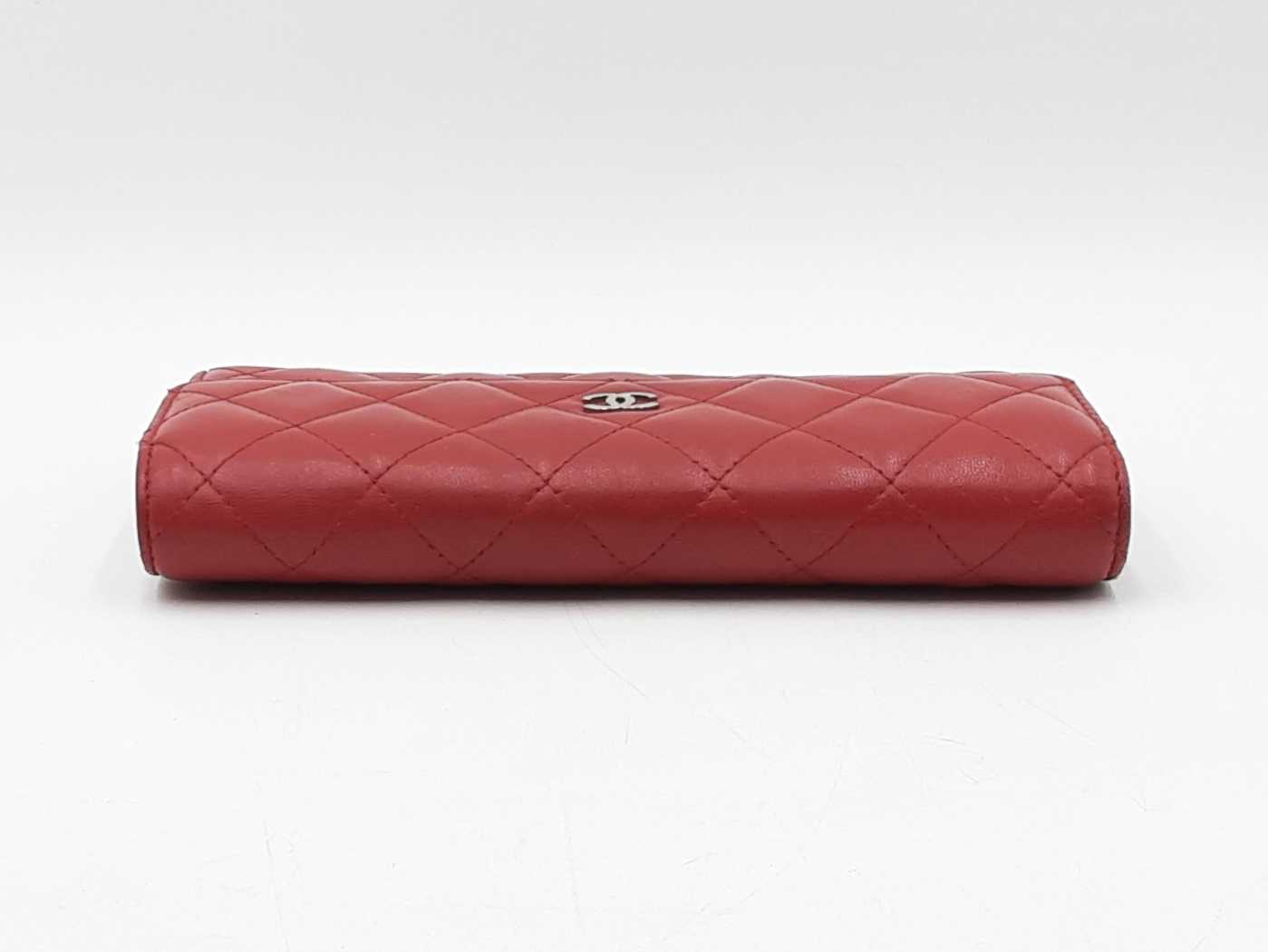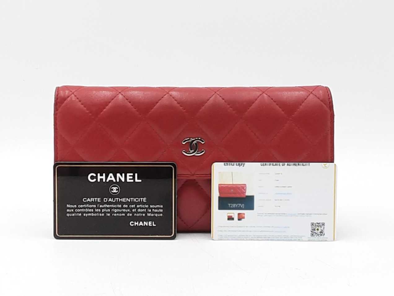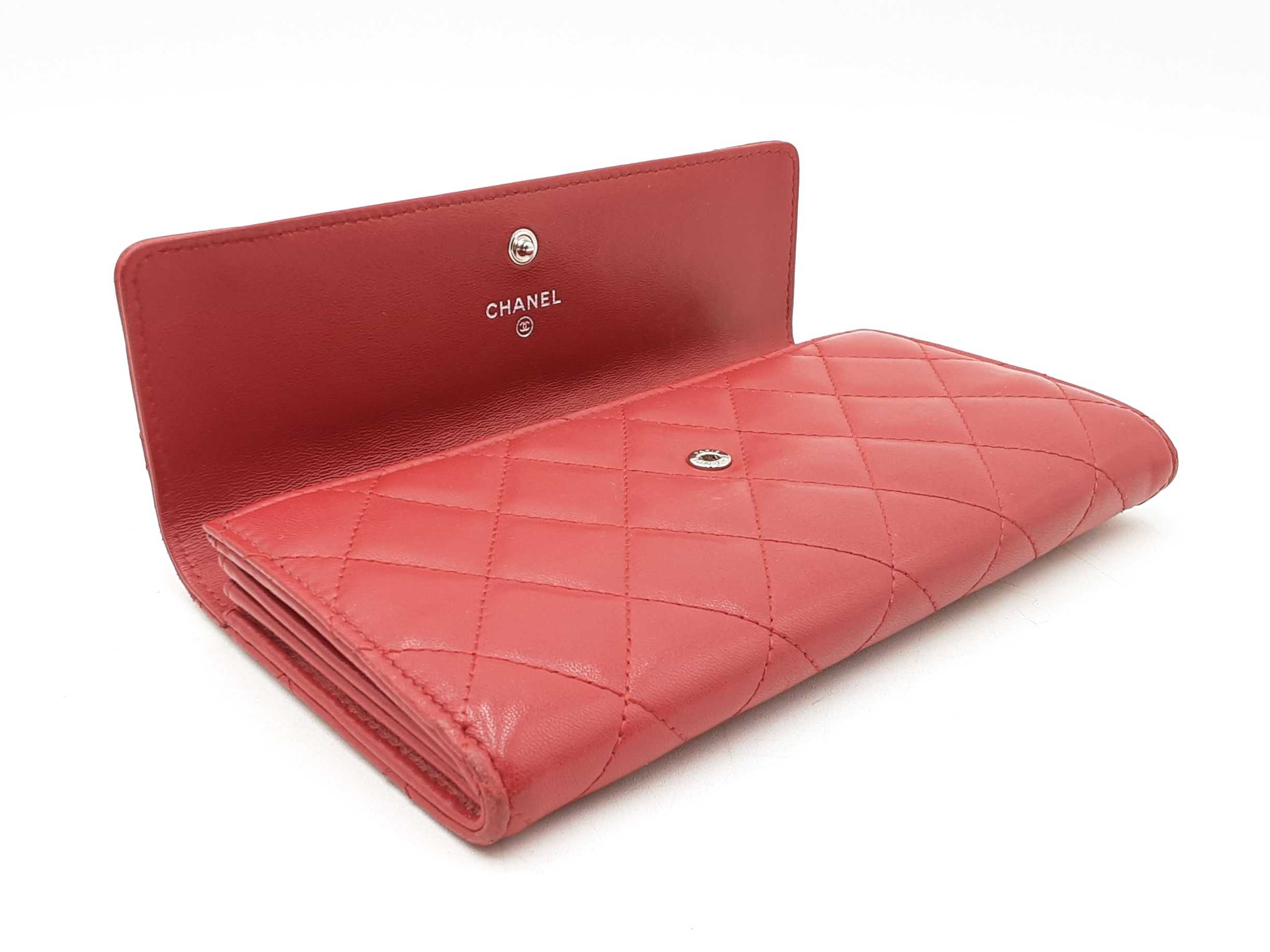 144030021623Chanel Continental Wallet In Red Diamond-Quilted Leather. Silver-Tone Hardware. Length 7.5 IN X Height 4.25 IN X Width 1.2 IN, approximately. Good Pre-Owned Condition. Scratches on hardware. Wear on corners and edges. Small scuffs throughout exterior leather. Creasing on interior of flap. Entrupy Certificate # T28Y7VJ