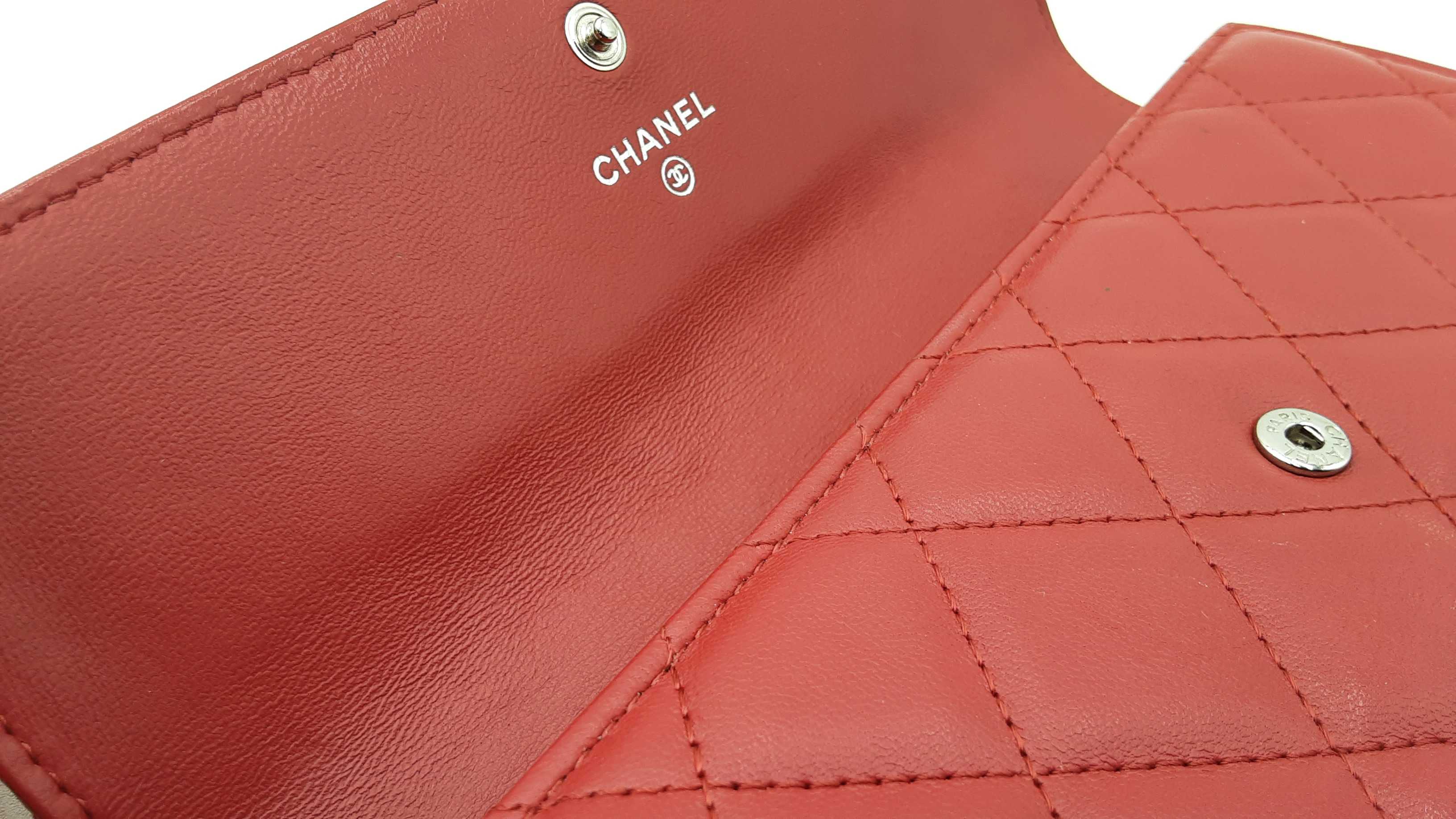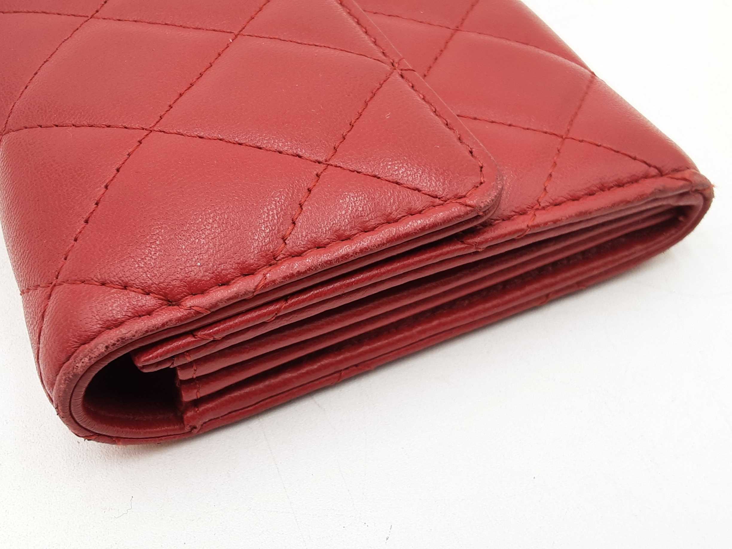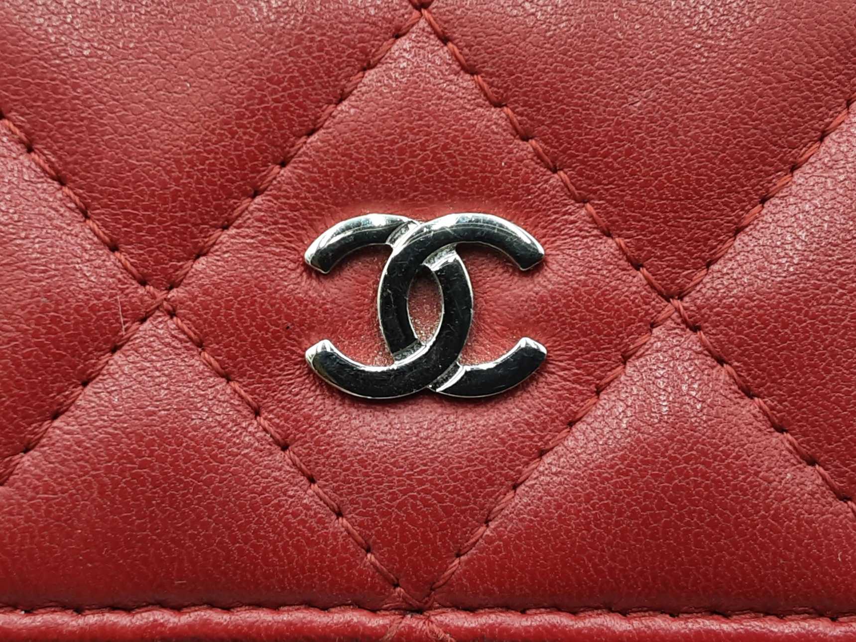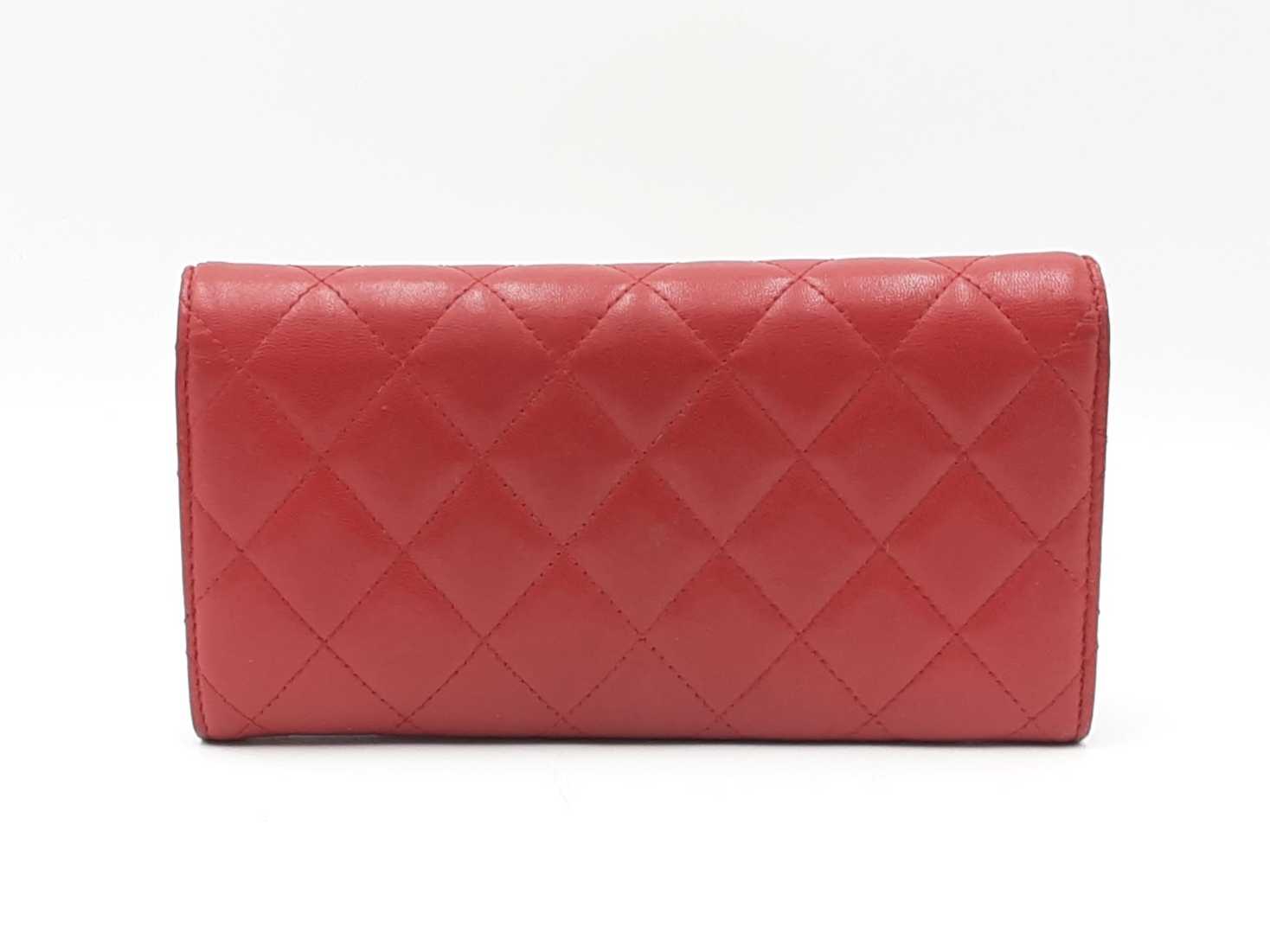 144030021623Chanel Continental Wallet In Red Diamond-Quilted Leather. Silver-Tone Hardware. Length 7.5 IN X Height 4.25 IN X Width 1.2 IN, approximately. Good Pre-Owned Condition. Scratches on hardware. Wear on corners and edges. Small scuffs throughout exterior leather. Creasing on interior of flap. Entrupy Certificate # T28Y7VJ