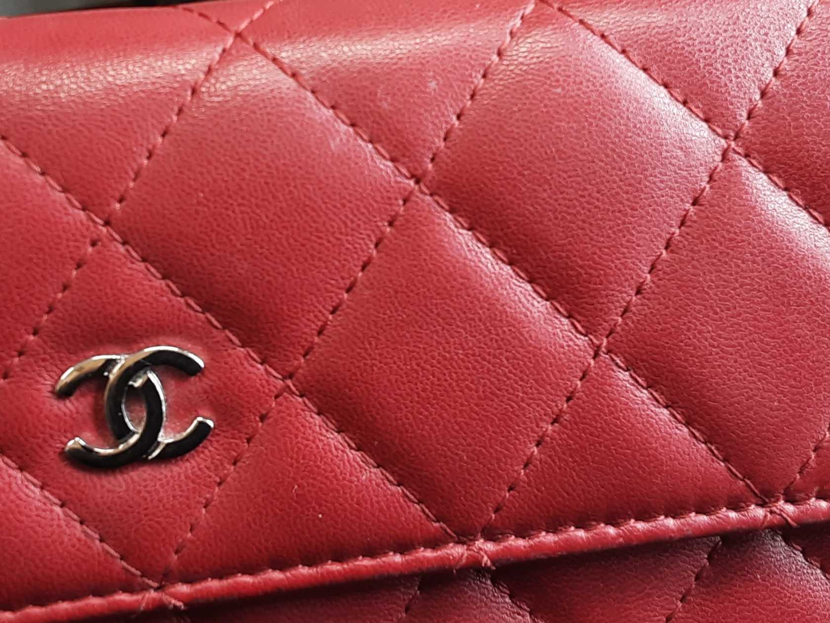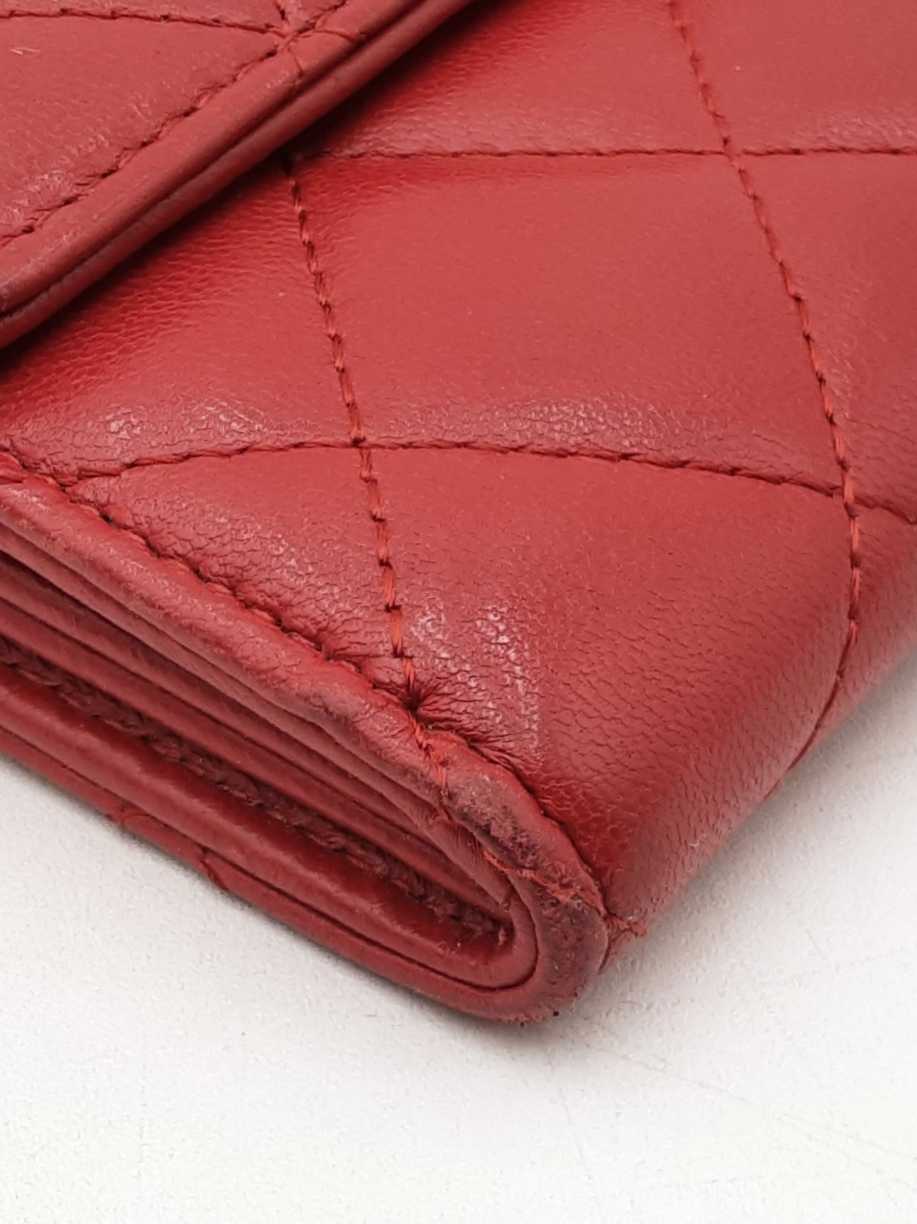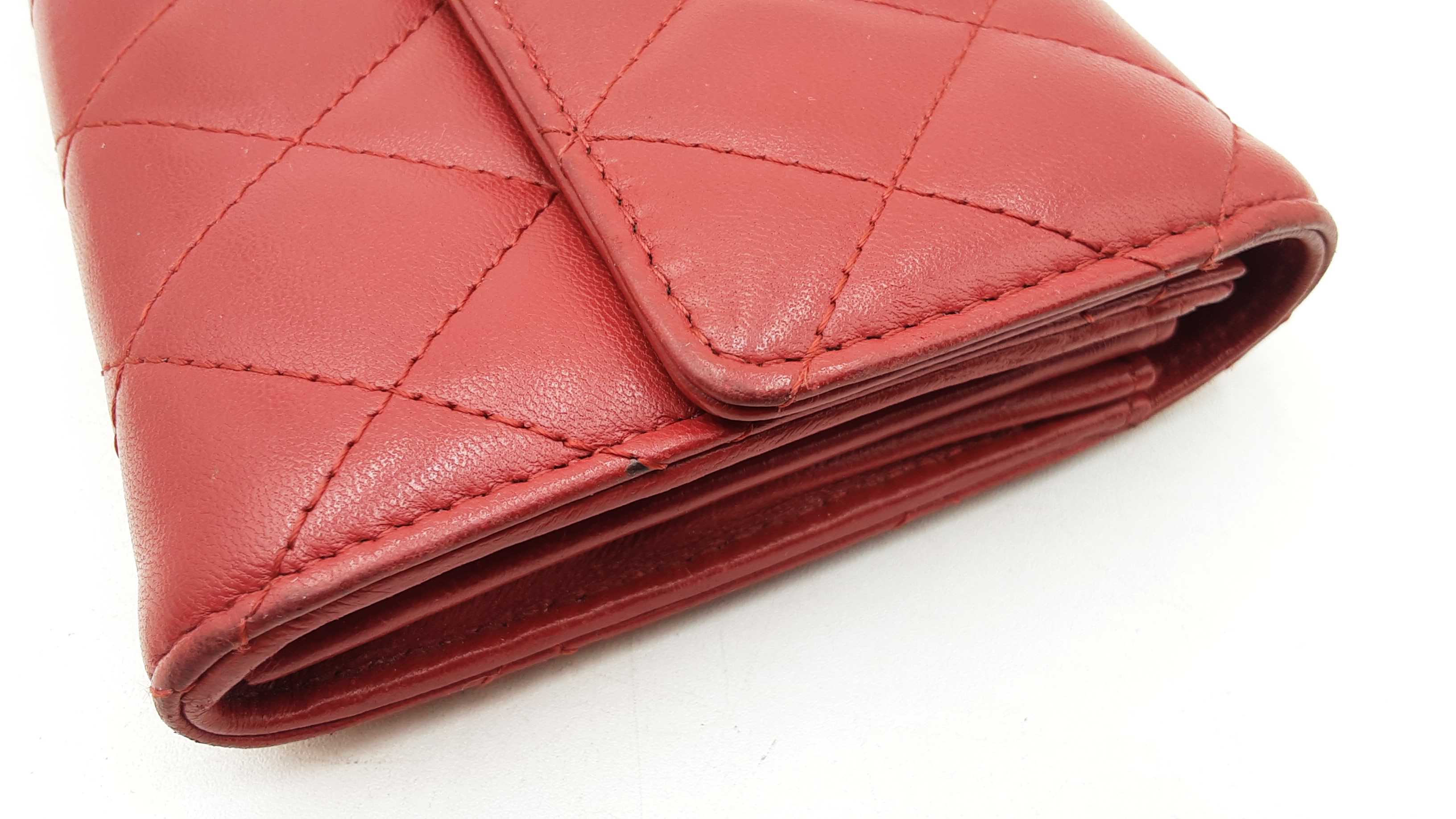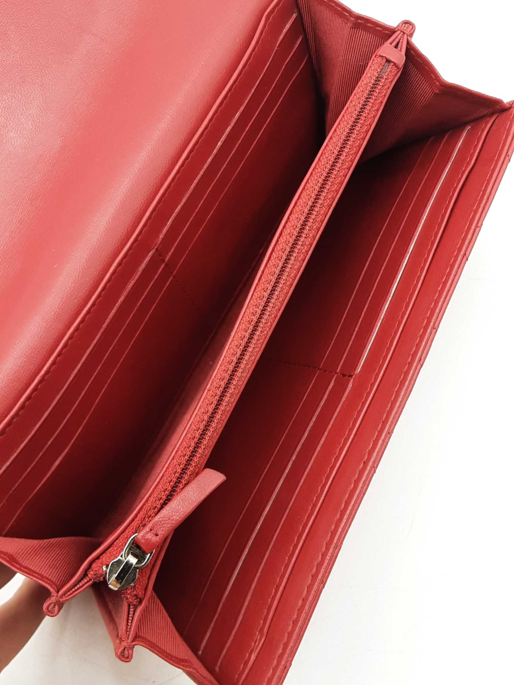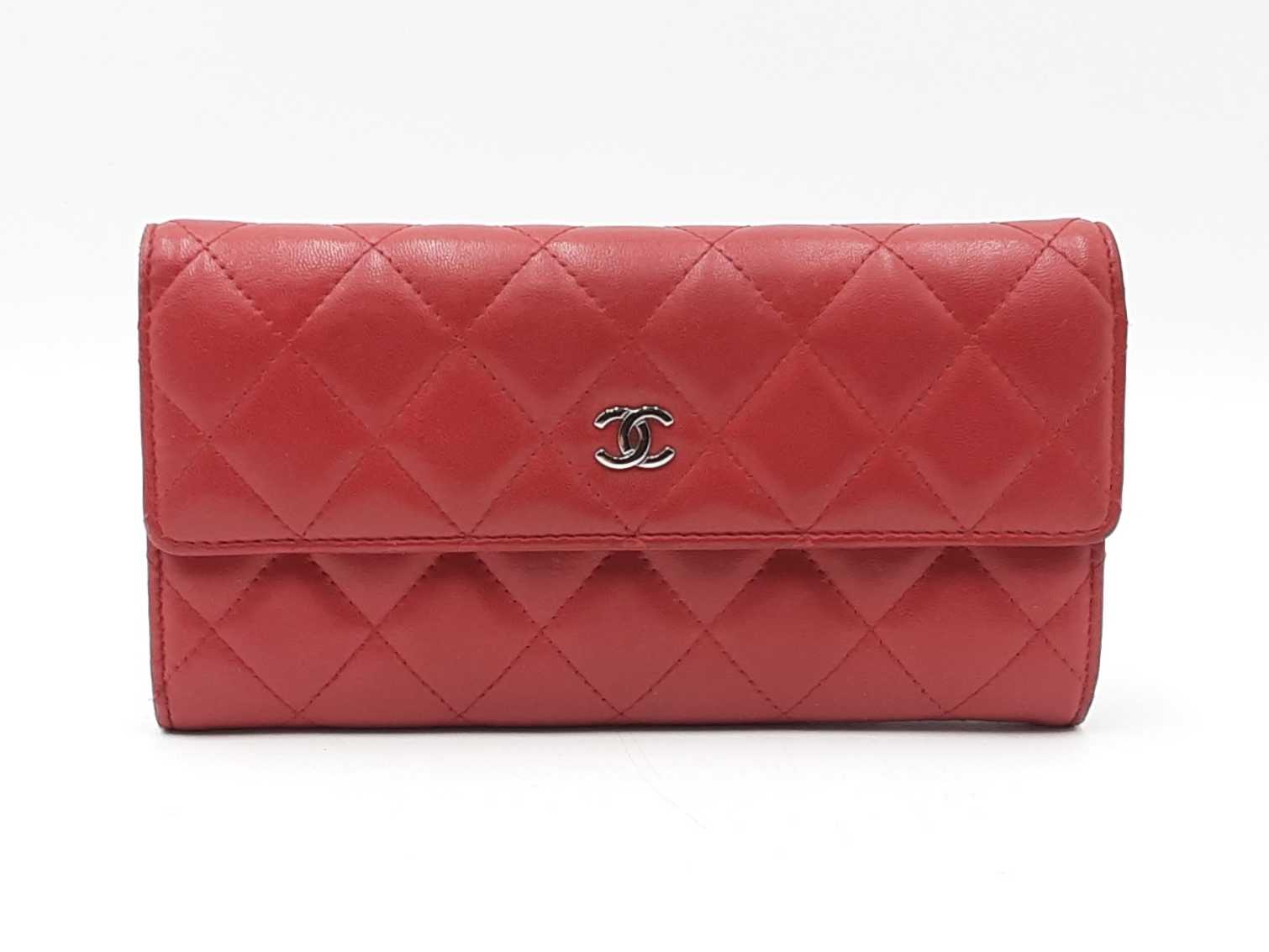 144030021623Chanel Continental Wallet In Red Diamond-Quilted Leather. Silver-Tone Hardware. Length 7.5 IN X Height 4.25 IN X Width 1.2 IN, approximately. Good Pre-Owned Condition. Scratches on hardware. Wear on corners and edges. Small scuffs throughout exterior leather. Creasing on interior of flap. Entrupy Certificate # T28Y7VJ