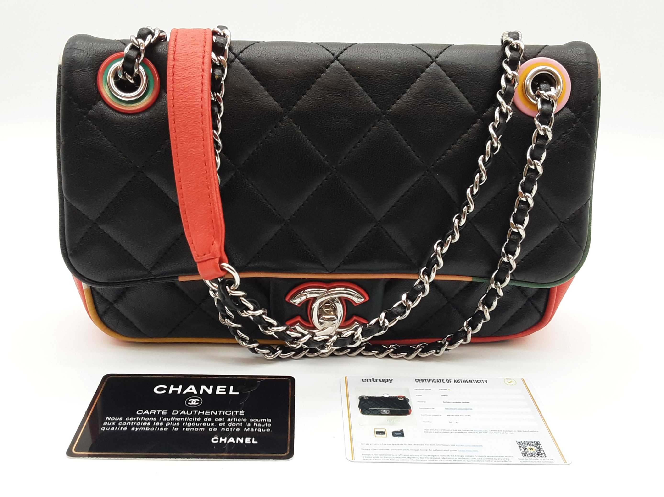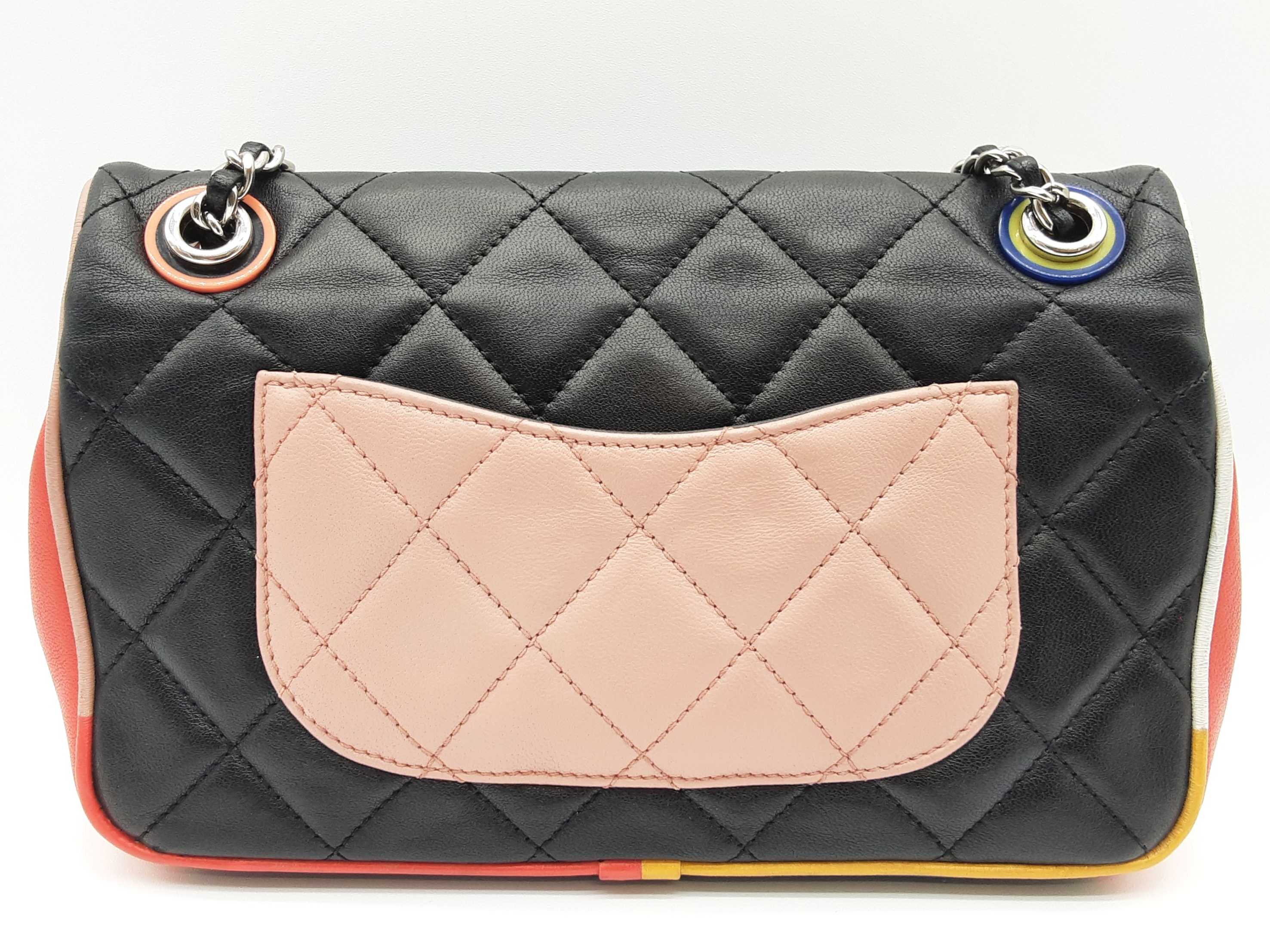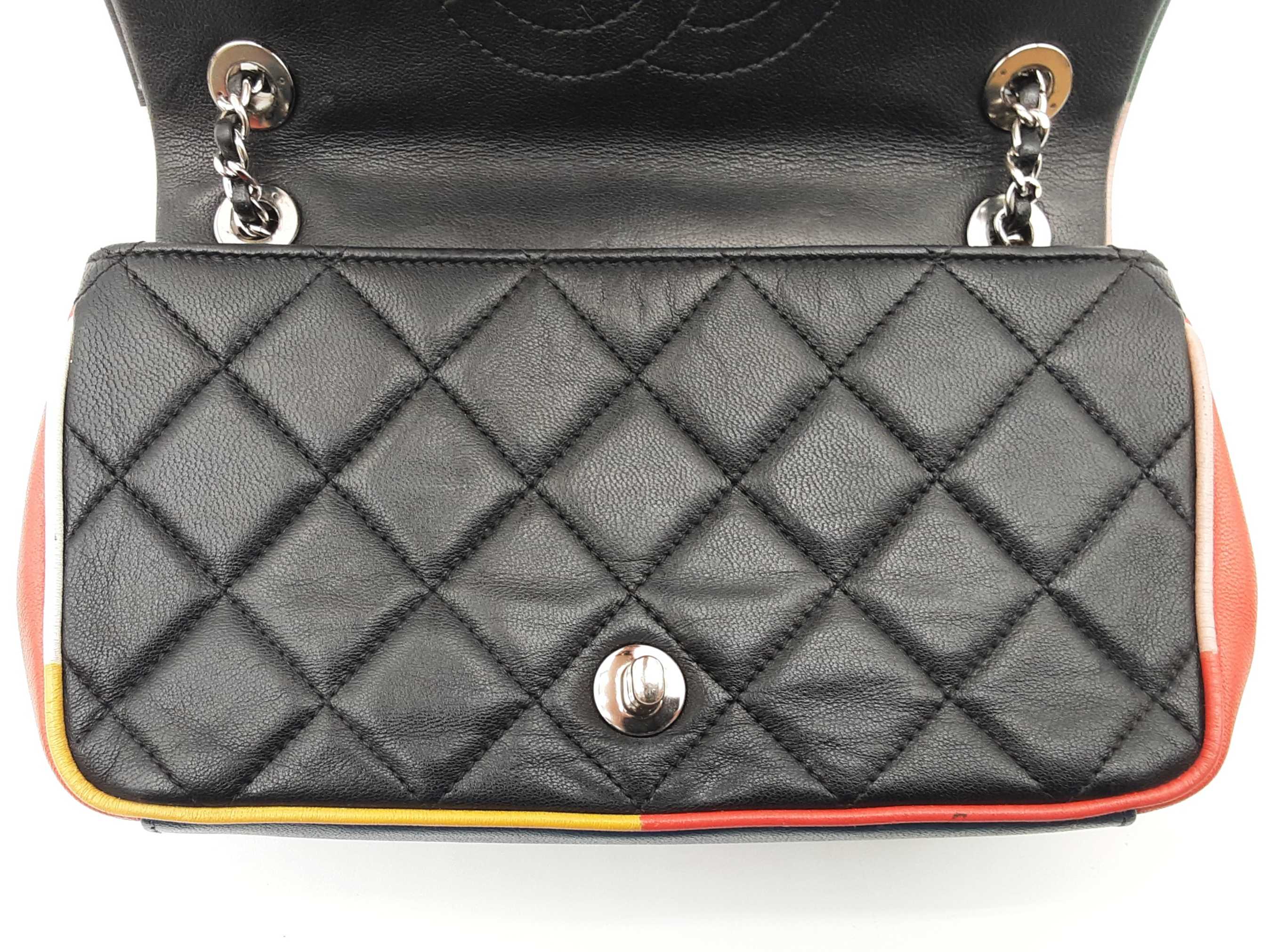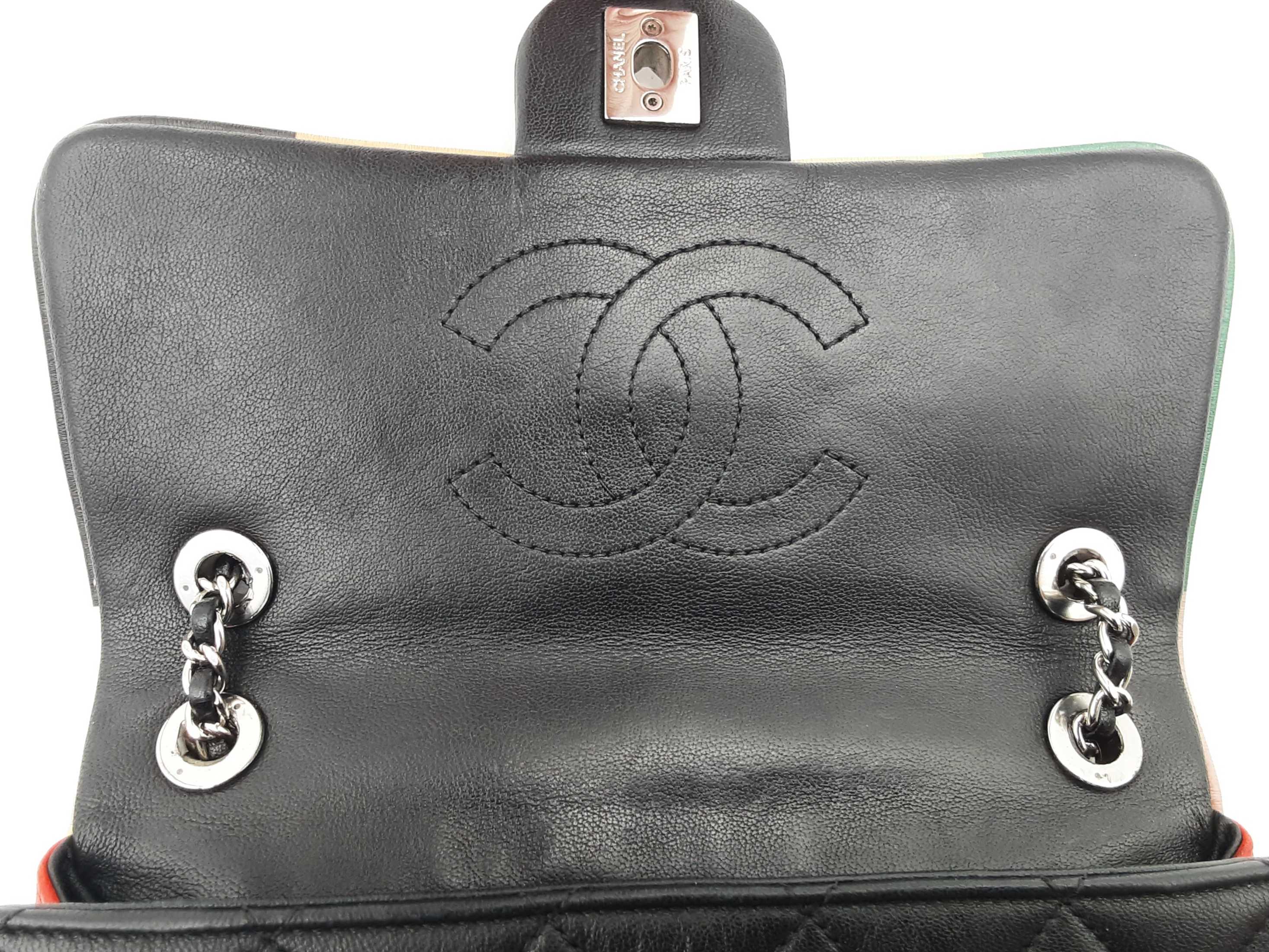 144020032757Chanel Cuba Color Flap Black Quilted Leather Shoulder Bag. Length 9 IN X Height 5.5 IN X Width 2.25 IN X Drop 12 to 22.5 IN. Entrupy Certificate #7D8VY62. Good Pre-owned Condition with bag leaning forward, creases, scratches and marks on metal hardware, wear and bend on strap leather, wear on edges and corners, marks on plastic hardware, indentations on bottom and under flap, scratches on exterior and under flap, and discoloration and marks on interior.