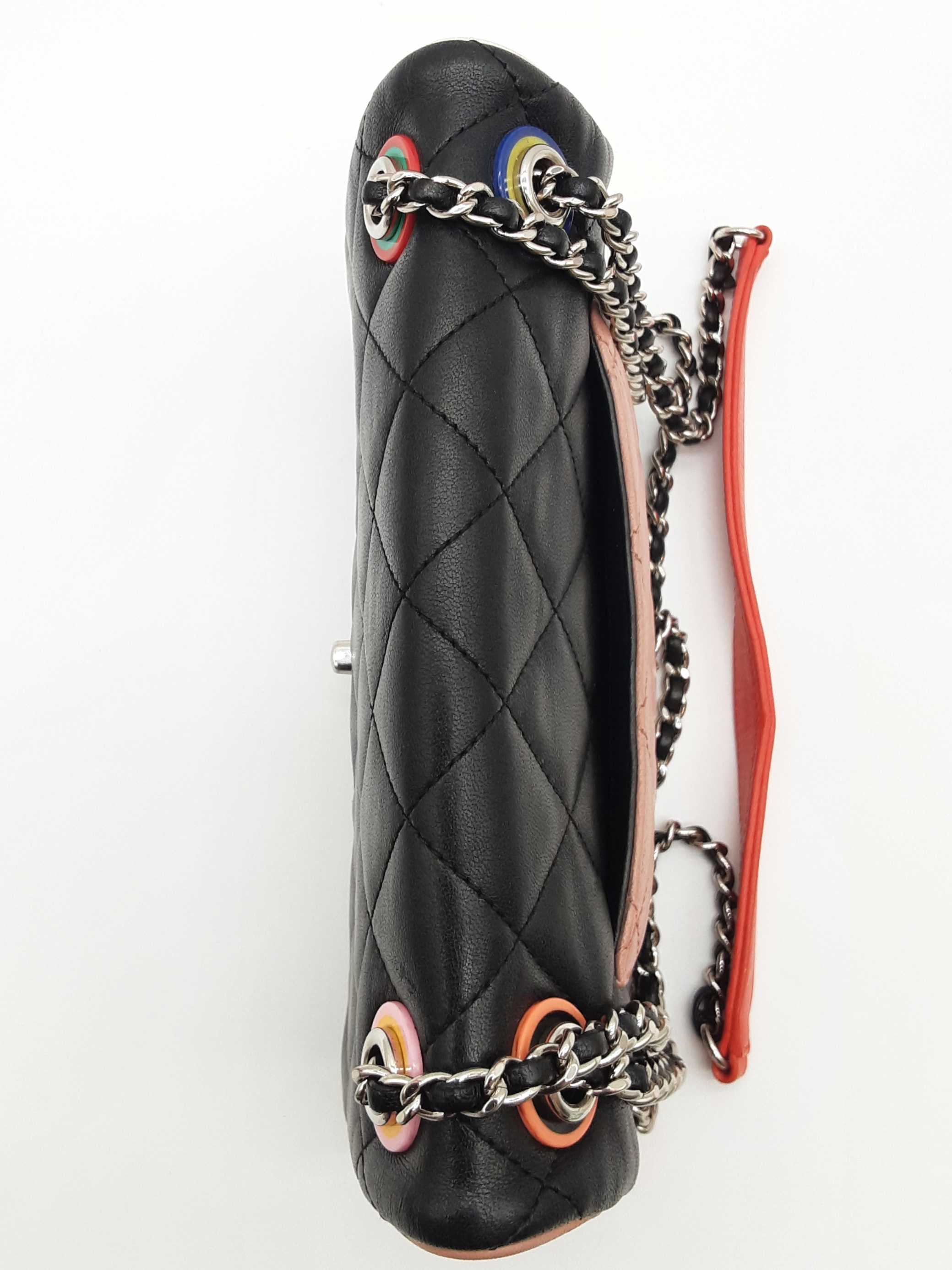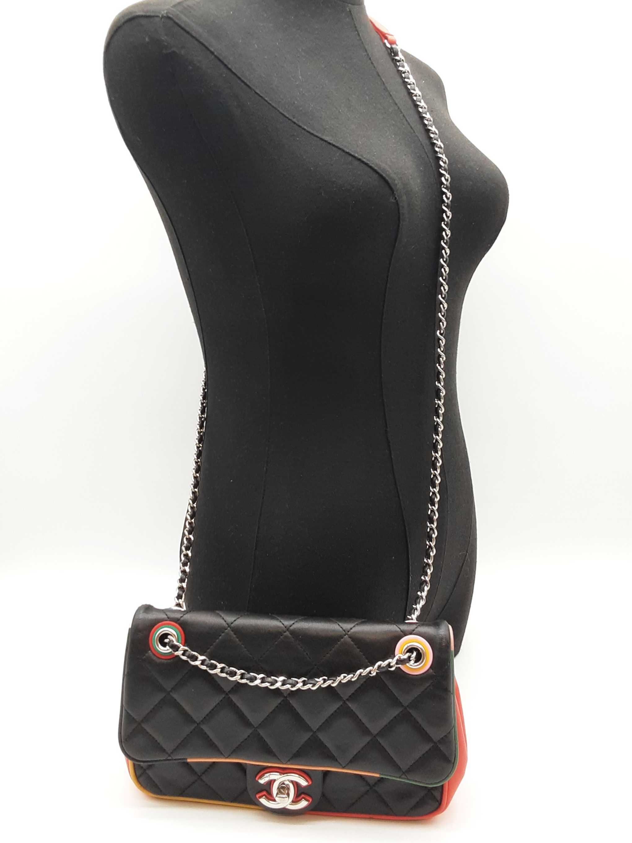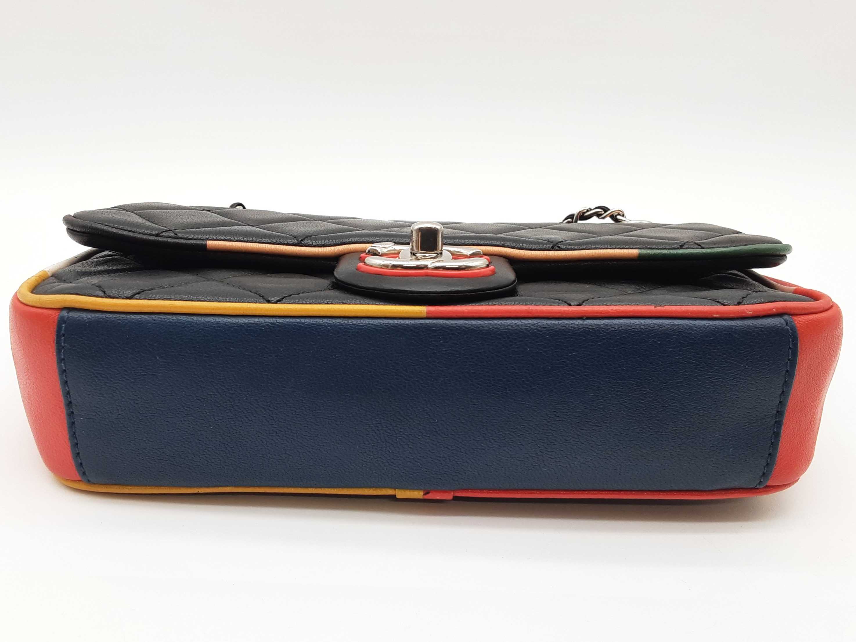 144020032757Chanel Cuba Color Flap Black Quilted Leather Shoulder Bag. Length 9 IN X Height 5.5 IN X Width 2.25 IN X Drop 12 to 22.5 IN. Entrupy Certificate #7D8VY62. Good Pre-owned Condition with bag leaning forward, creases, scratches and marks on metal hardware, wear and bend on strap leather, wear on edges and corners, marks on plastic hardware, indentations on bottom and under flap, scratches on exterior and under flap, and discoloration and marks on interior.