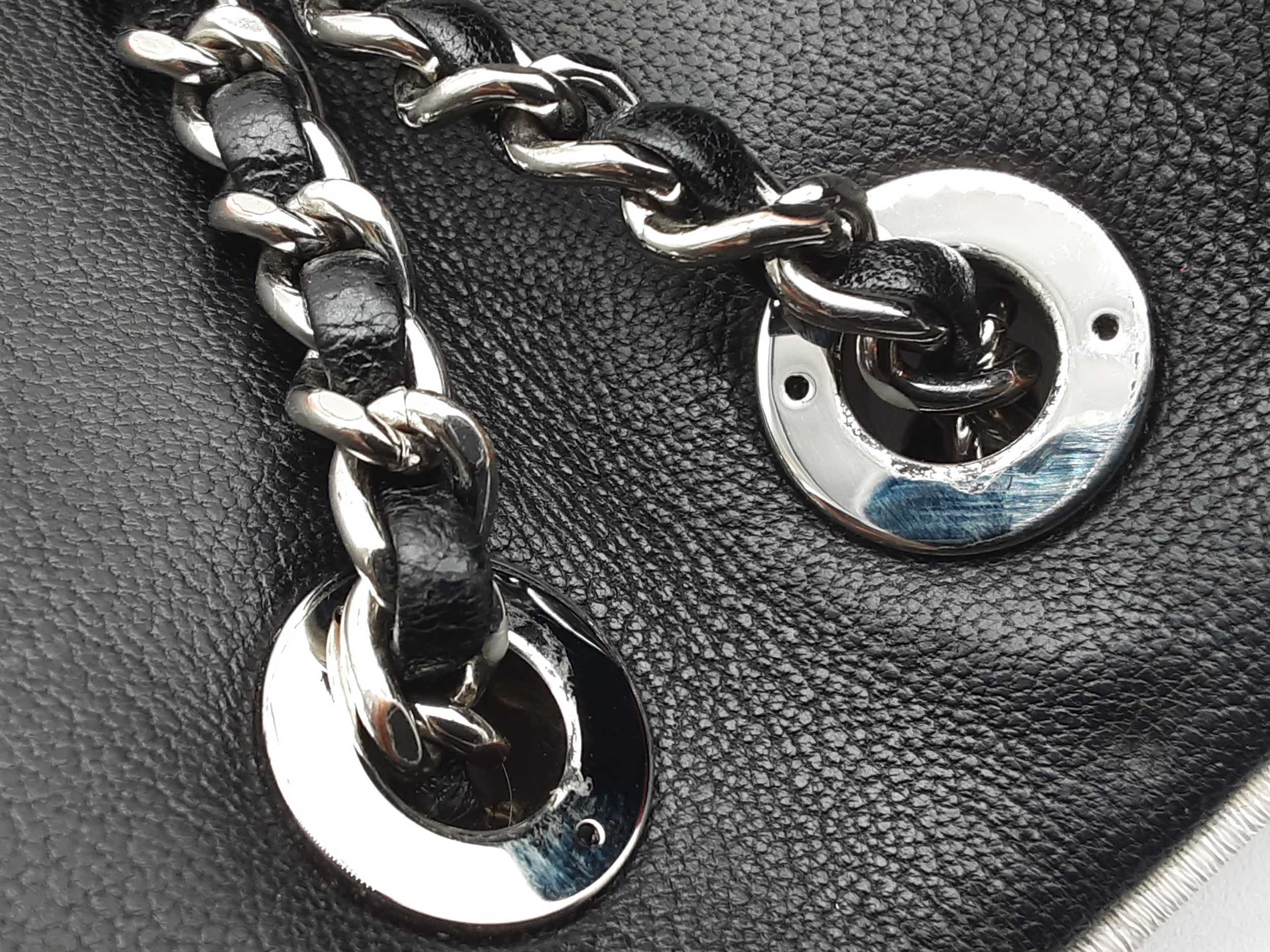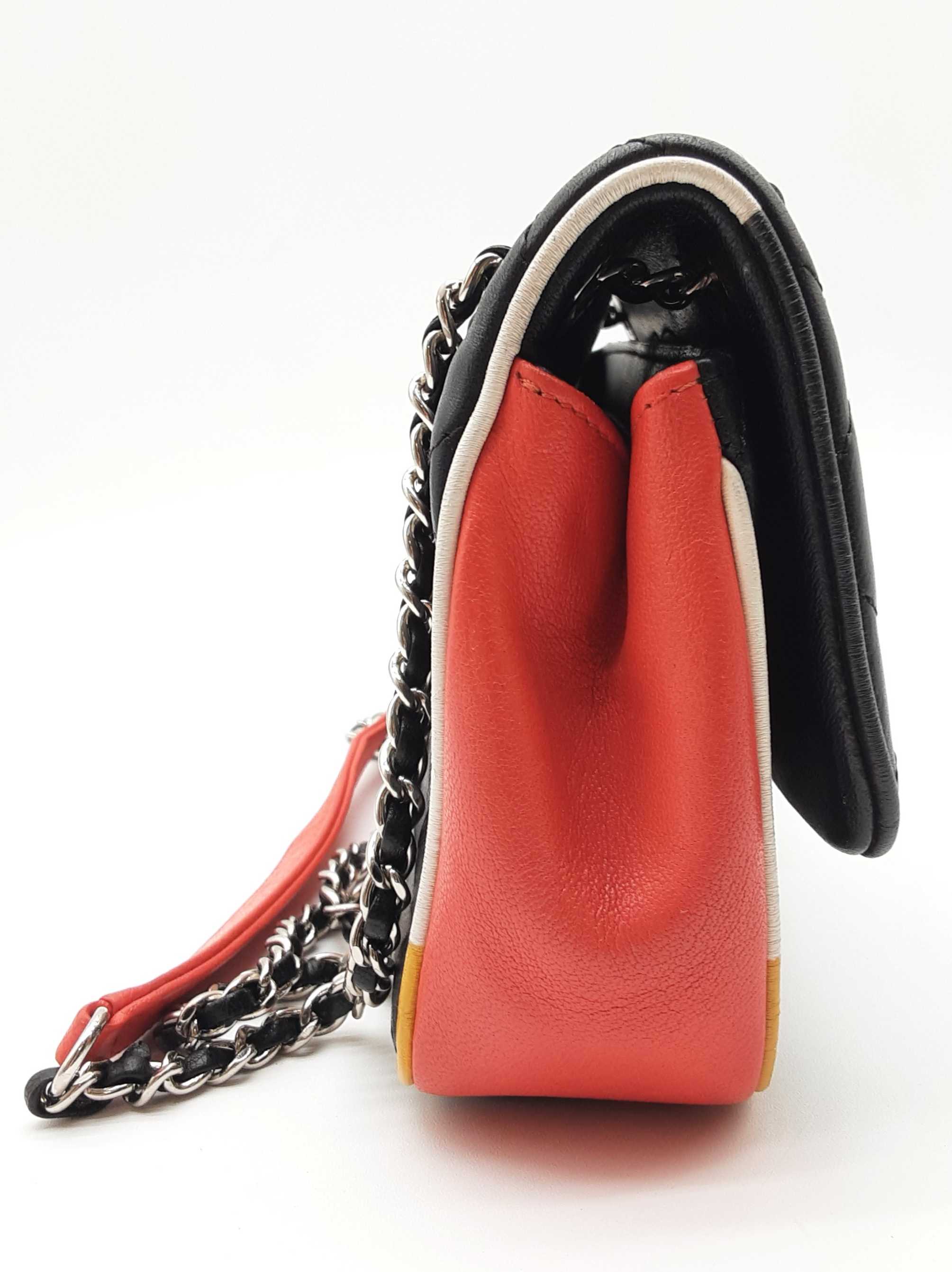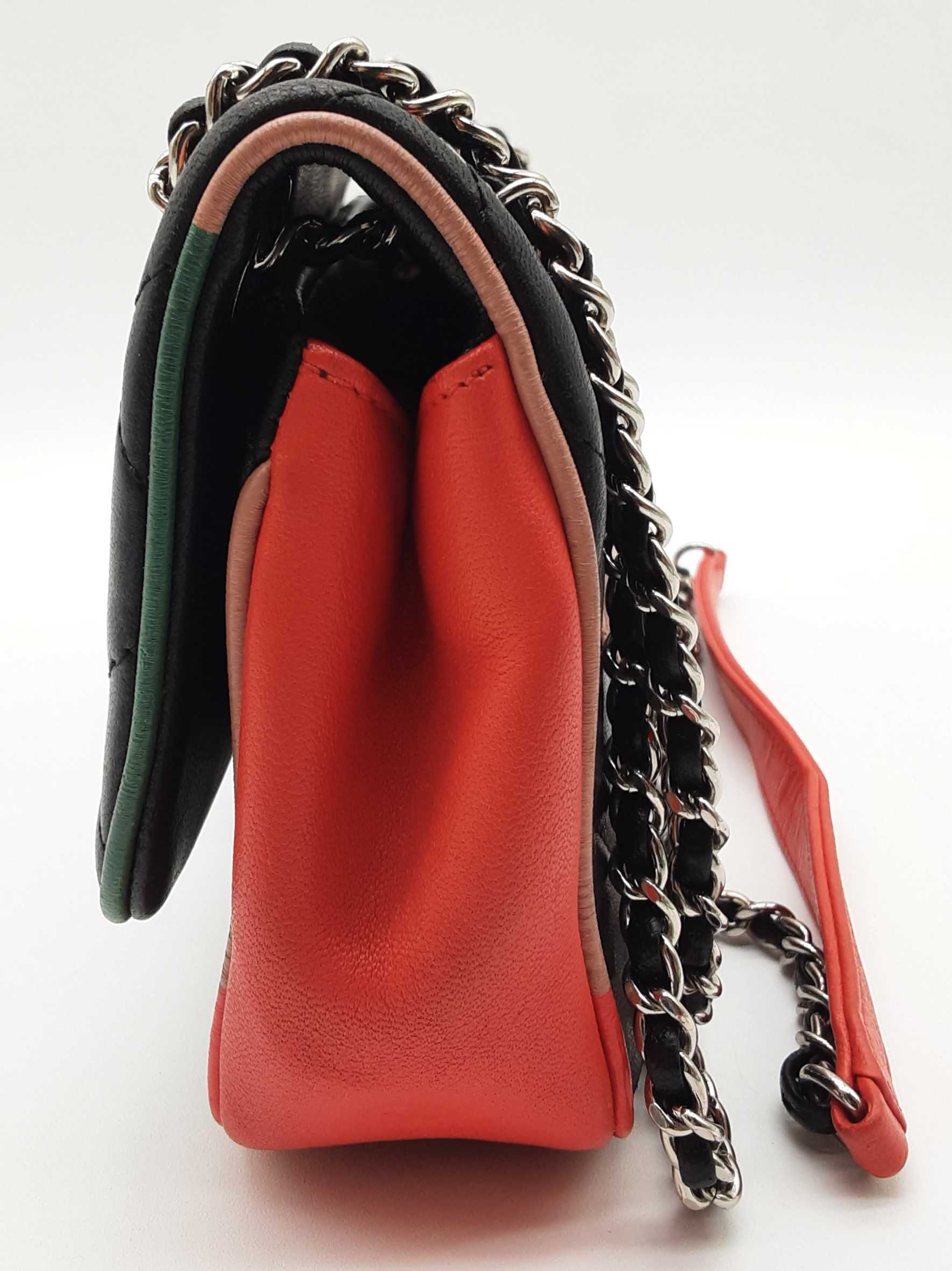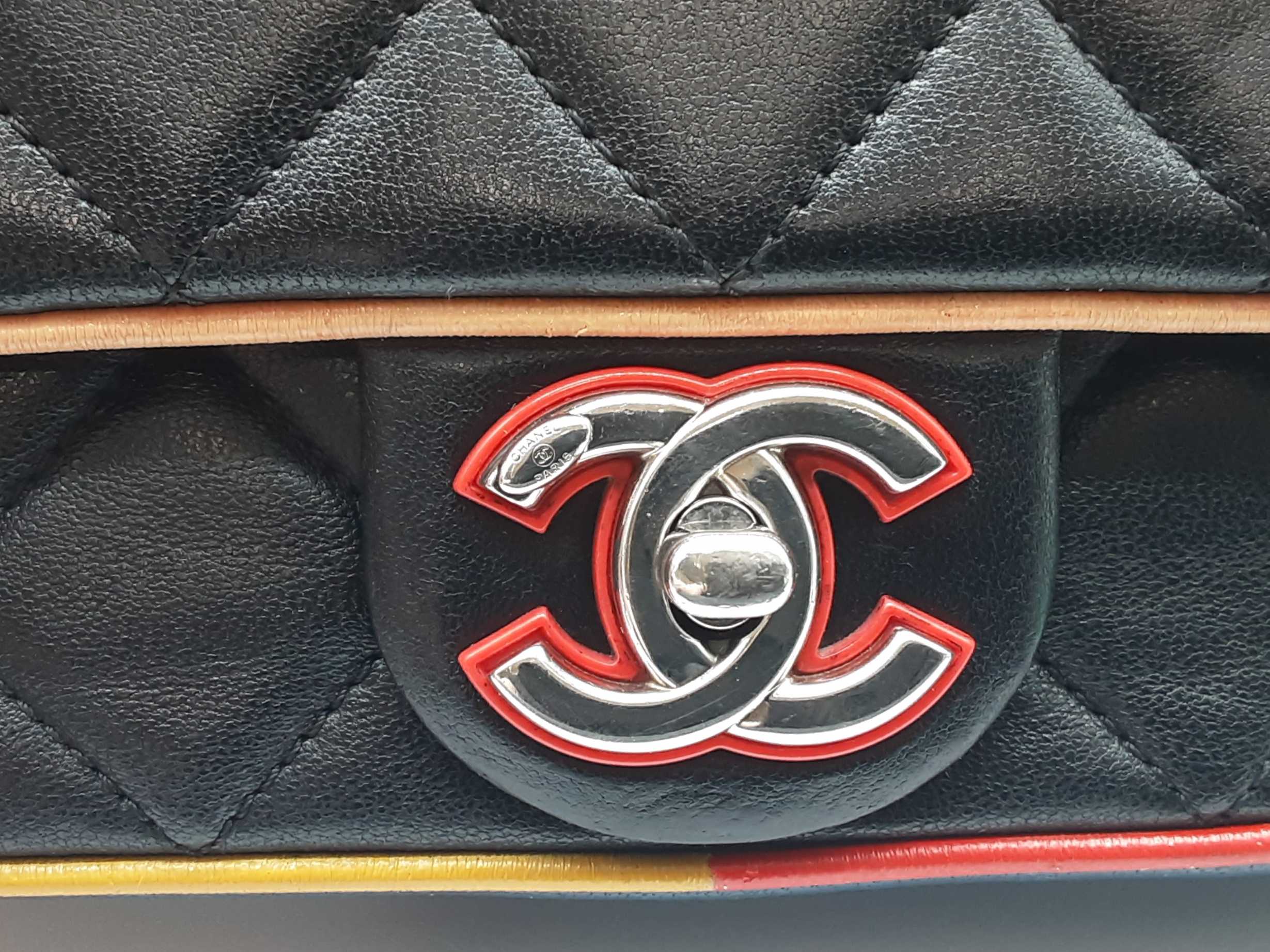 144020032757Chanel Cuba Color Flap Black Quilted Leather Shoulder Bag. Length 9 IN X Height 5.5 IN X Width 2.25 IN X Drop 12 to 22.5 IN. Entrupy Certificate #7D8VY62. Good Pre-owned Condition with bag leaning forward, creases, scratches and marks on metal hardware, wear and bend on strap leather, wear on edges and corners, marks on plastic hardware, indentations on bottom and under flap, scratches on exterior and under flap, and discoloration and marks on interior.