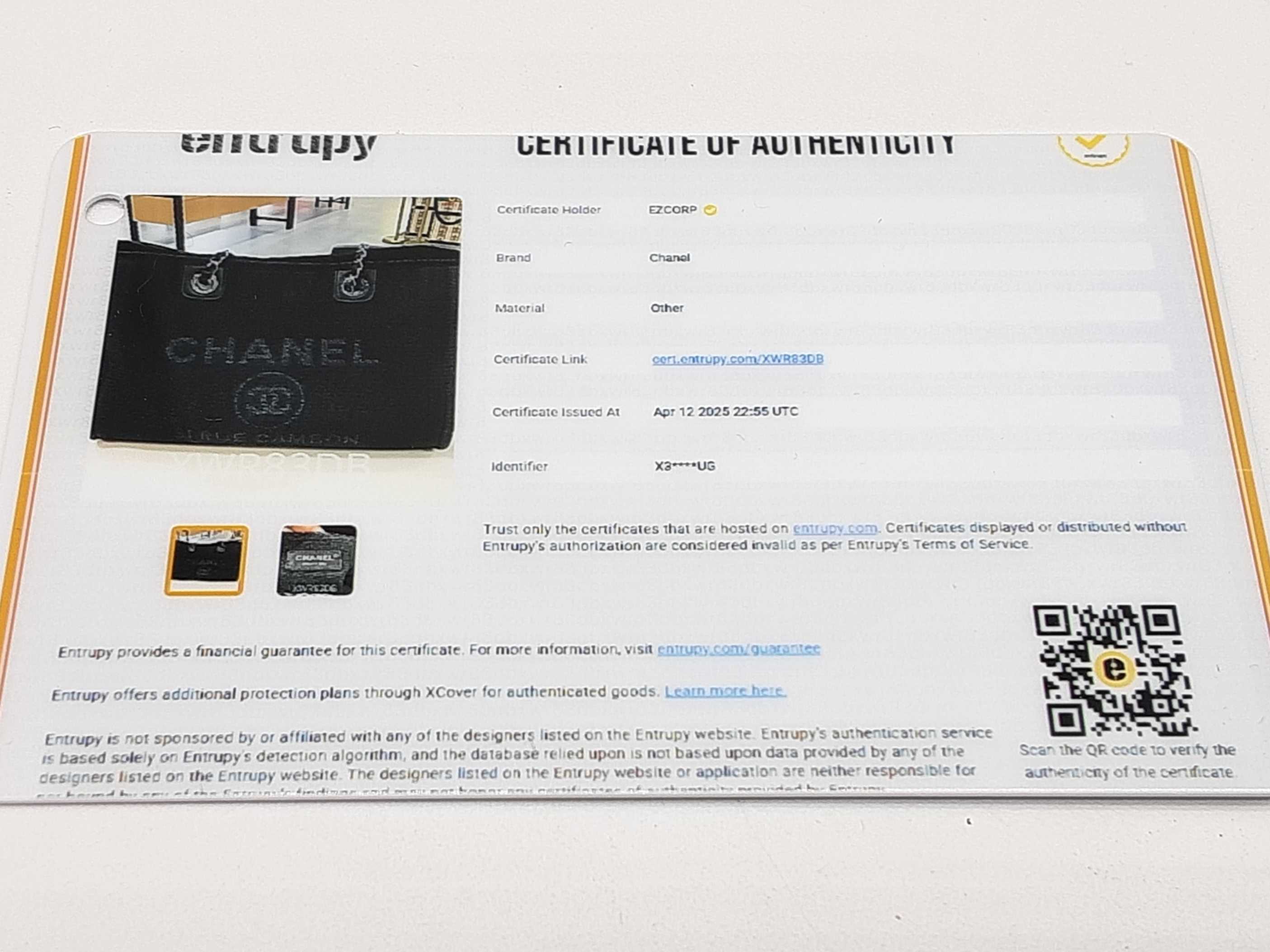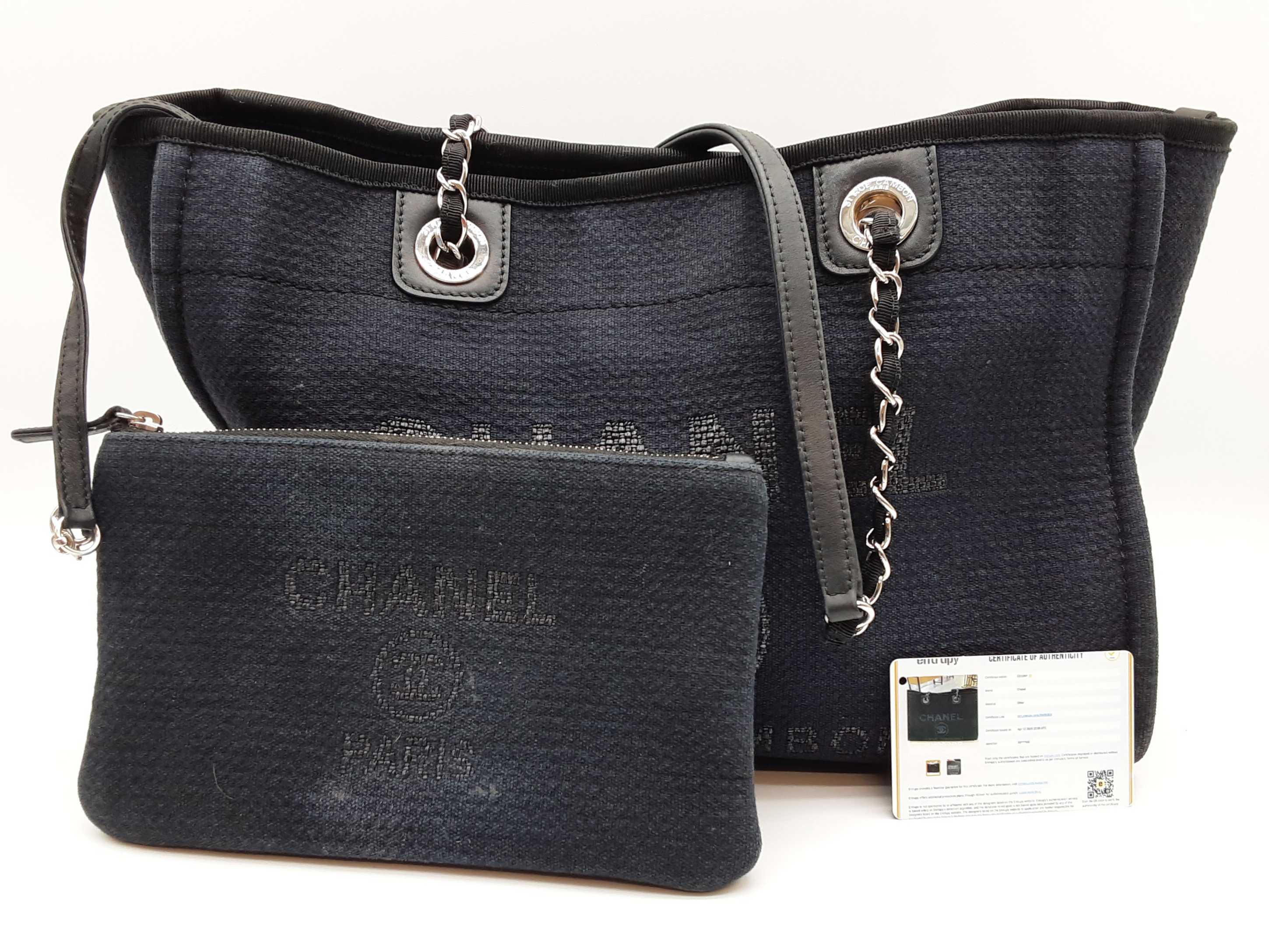 144020033190Chanel Deauville Black Shopping Tote. Length 13.5 IN X Height 9 IN X Width 7.5 IN X Drop 11 IN. Entrupy Certificate #XWR83DB. Good Pre-owned Condition with creases, bag misshapen, marks and discoloration throughout bag and pochette, and scratches and wear on metal hardware.