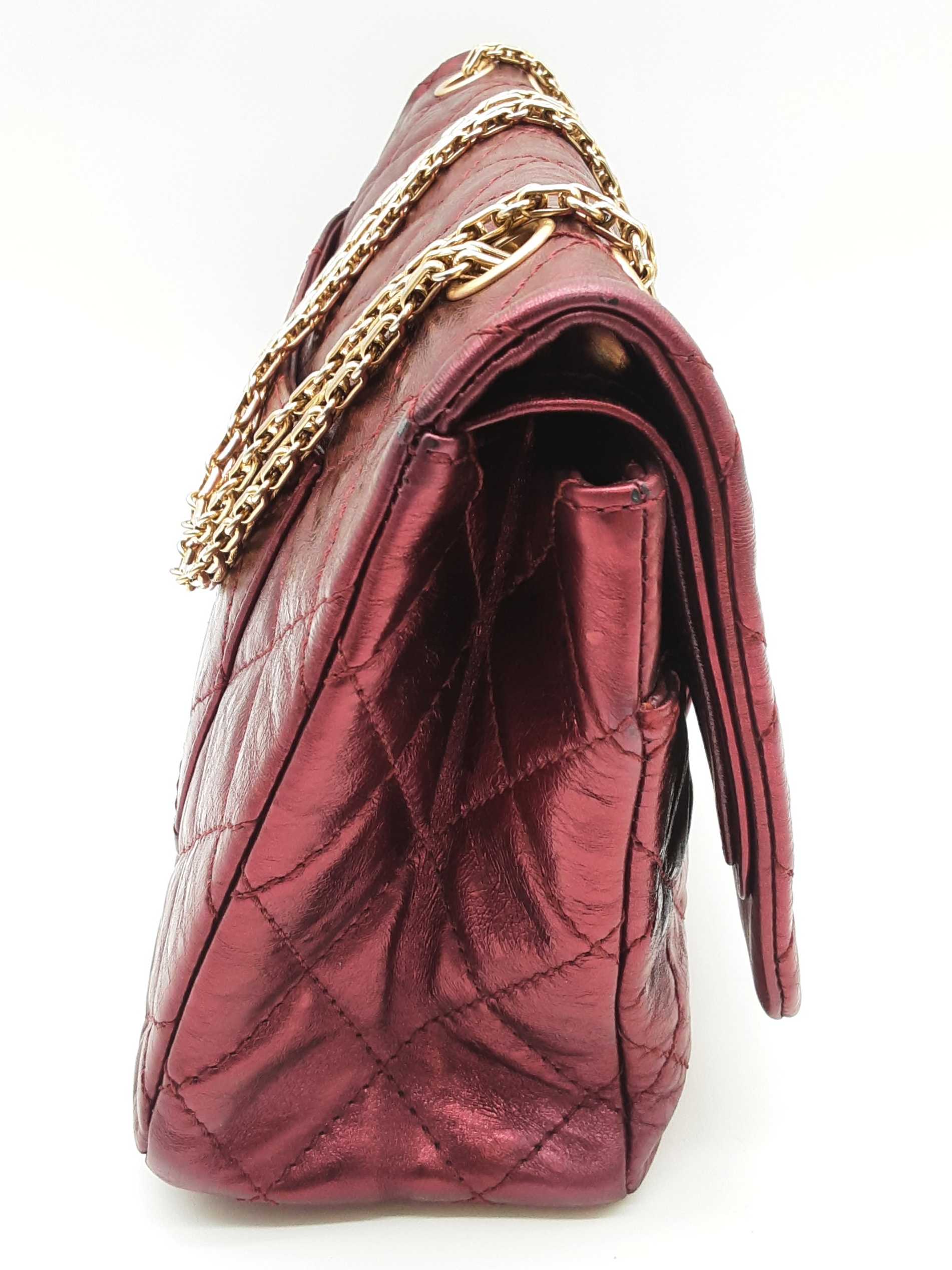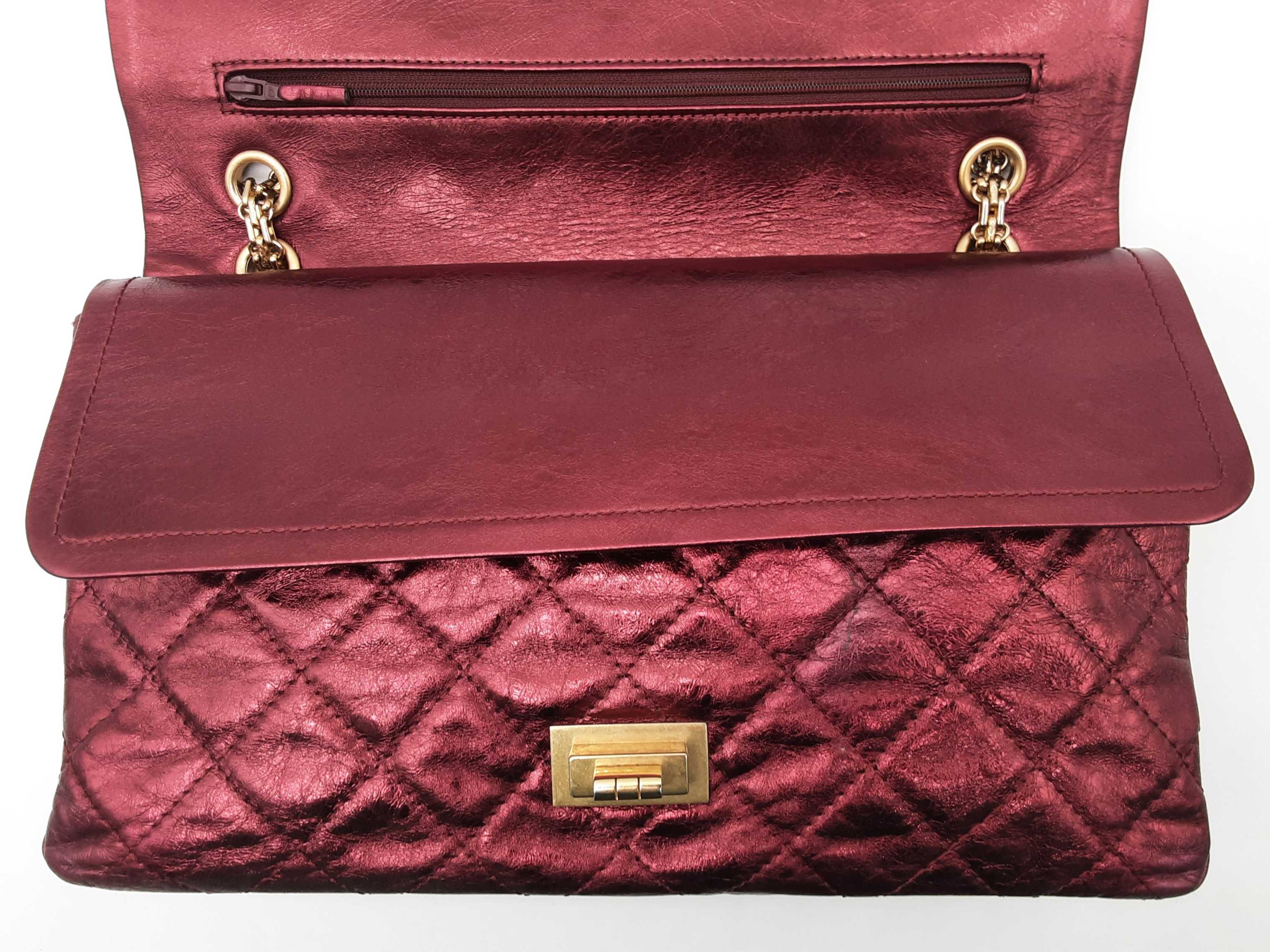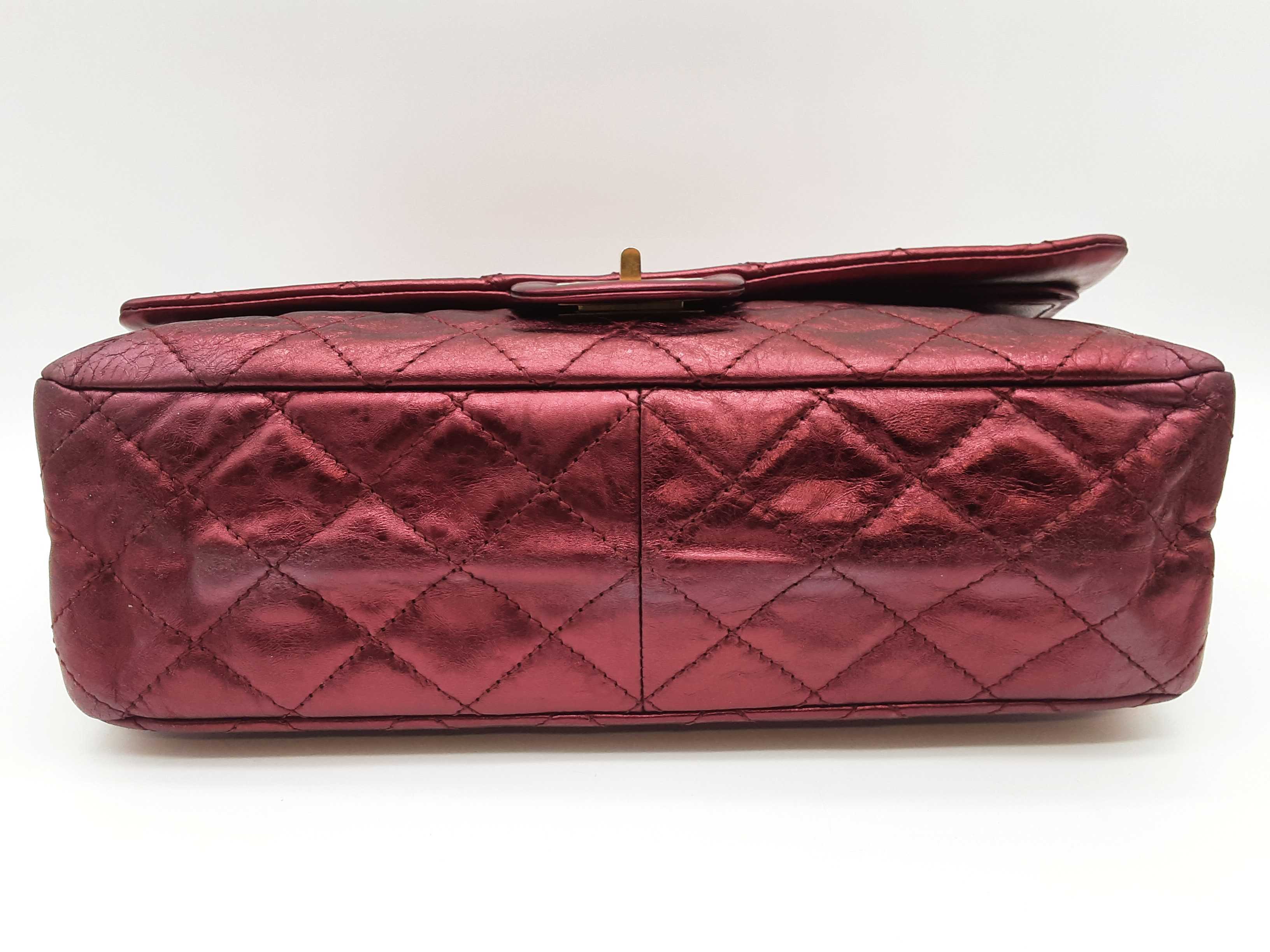 144020026462Chanel Double Flap 2.55 Reissue Red Metallic Quilted Aged Calfskin Leather Shoulder Bag. Length 12.5 IN X Height 7.25 IN X Width 4 IN X Drop 11 to 19 IN. Entrupy Certificate #G7M3YBD. Good Pre-owned Condition with creases, wear and scratches on metal hardware, wear on corners and edges, bag leaning forward, and marks on exterior and under flap.