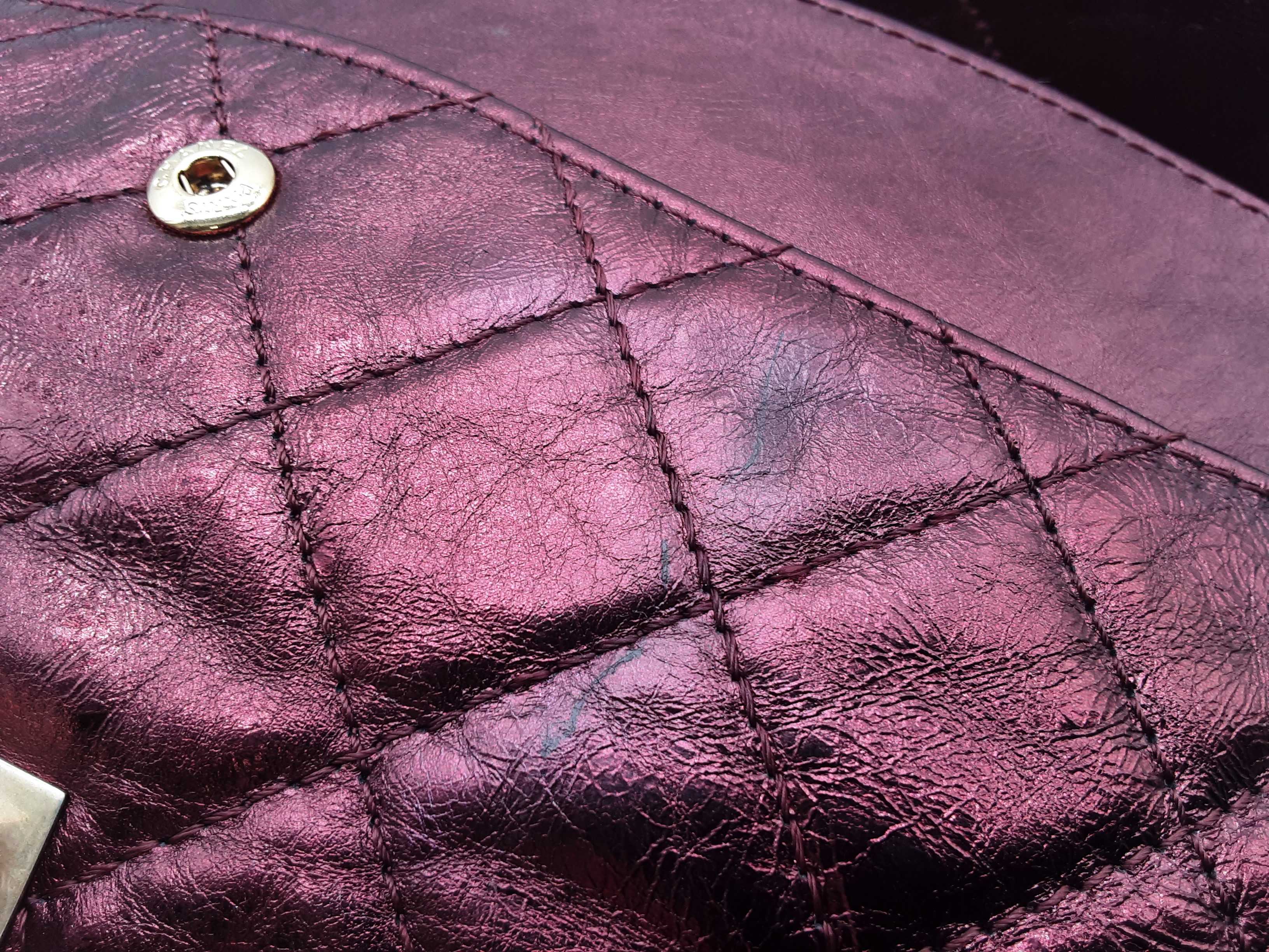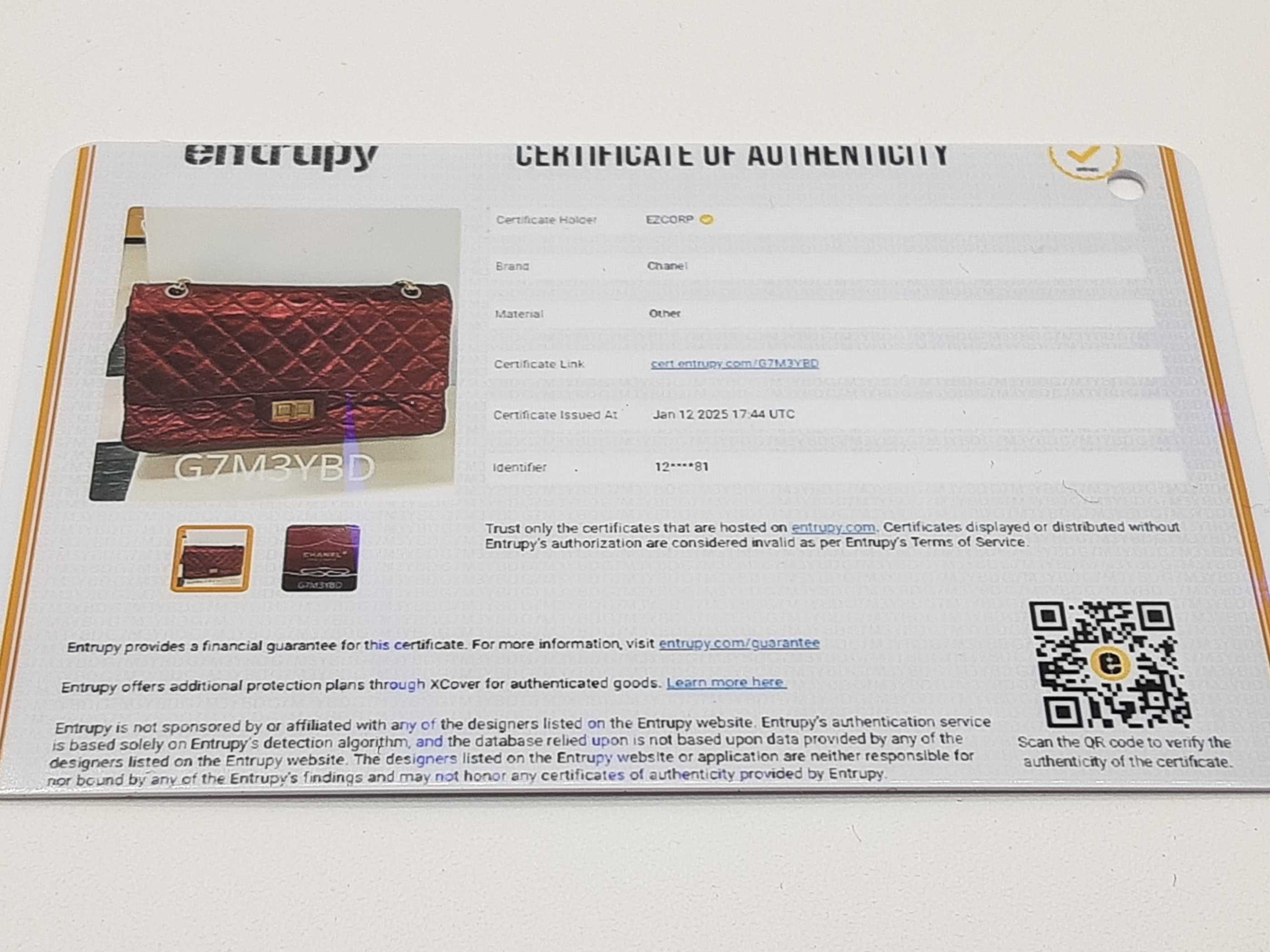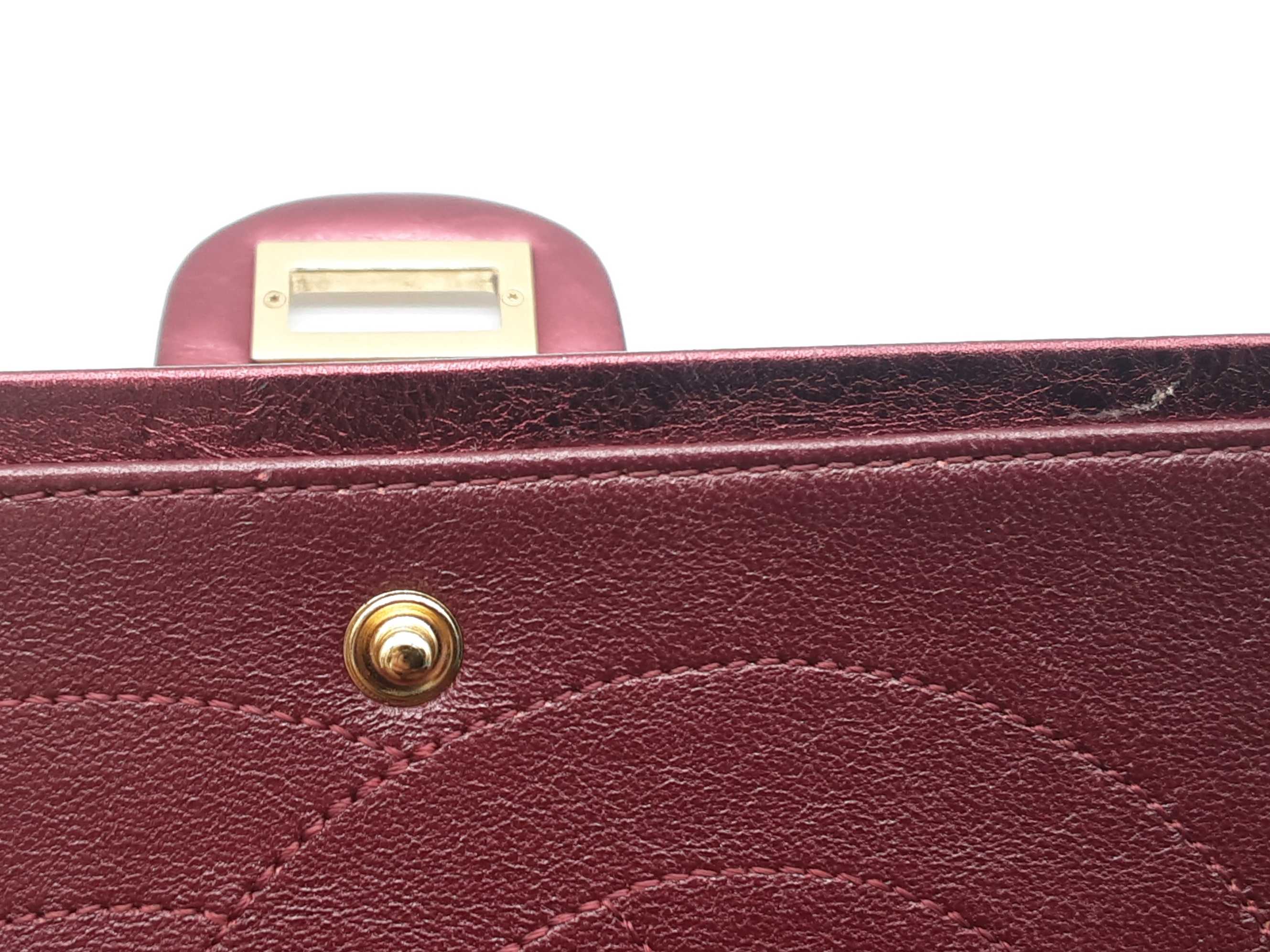 144020026462Chanel Double Flap 2.55 Reissue Red Metallic Quilted Aged Calfskin Leather Shoulder Bag. Length 12.5 IN X Height 7.25 IN X Width 4 IN X Drop 11 to 19 IN. Entrupy Certificate #G7M3YBD. Good Pre-owned Condition with creases, wear and scratches on metal hardware, wear on corners and edges, bag leaning forward, and marks on exterior and under flap.