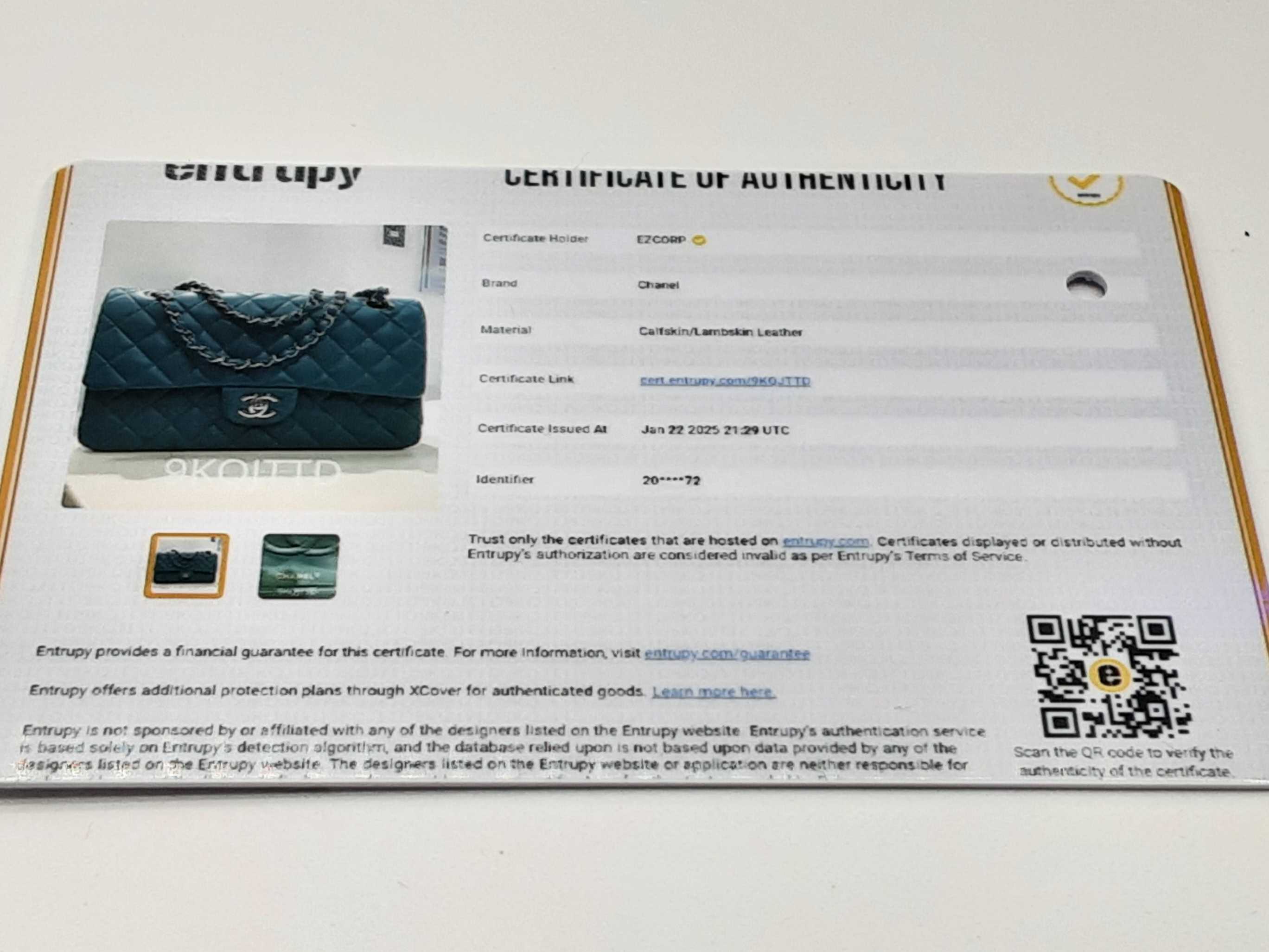 Entrupy Certificate Card, Box, Dust Bag