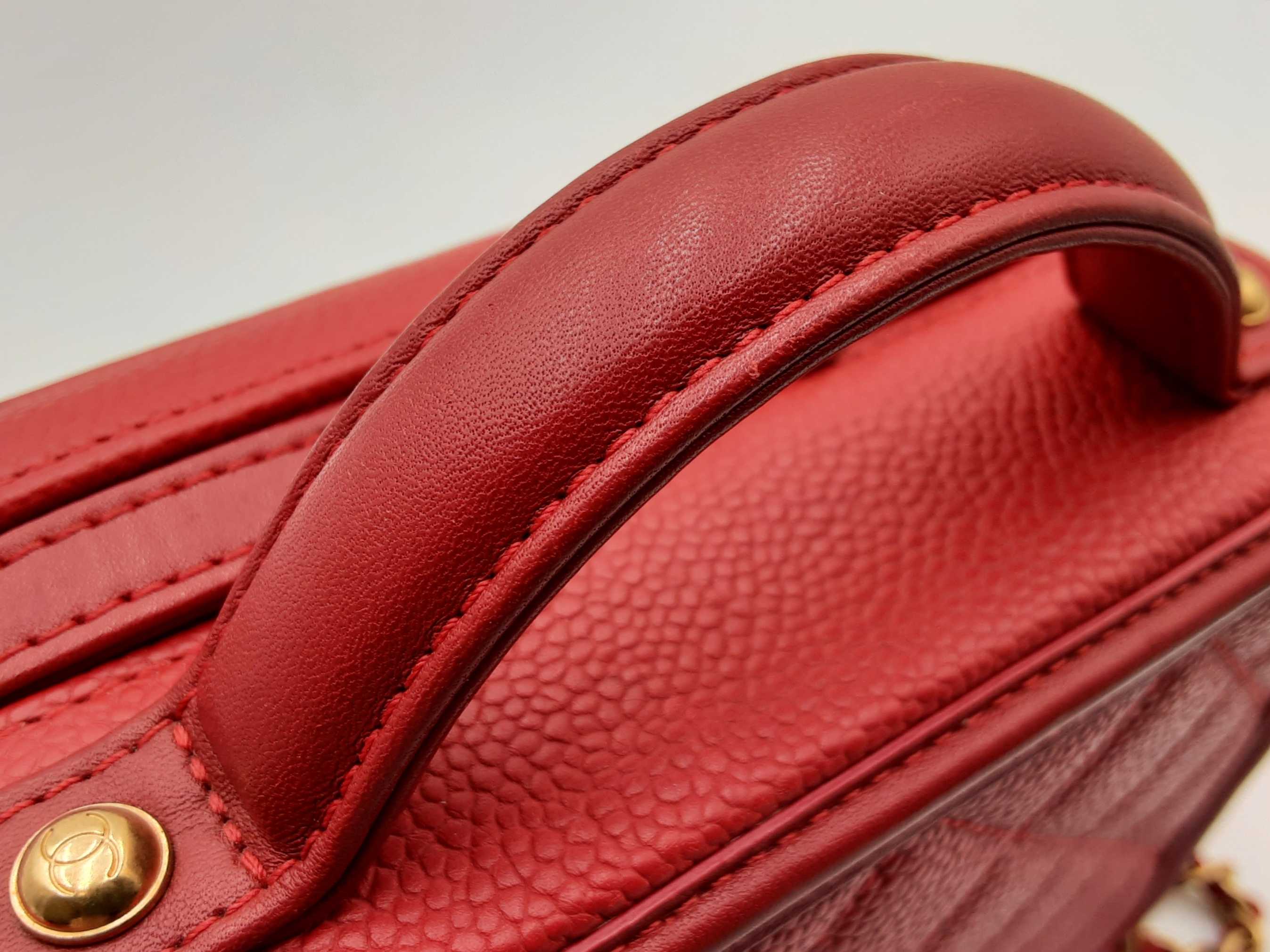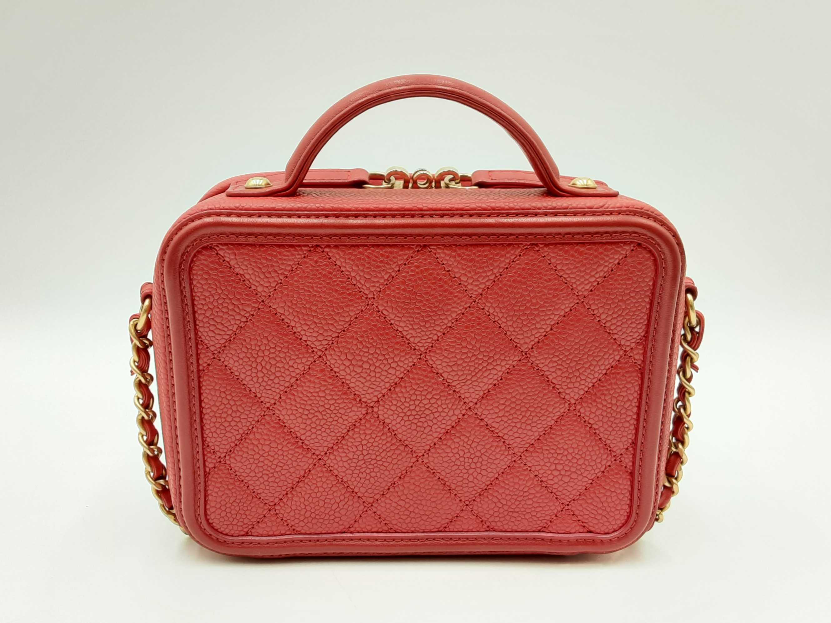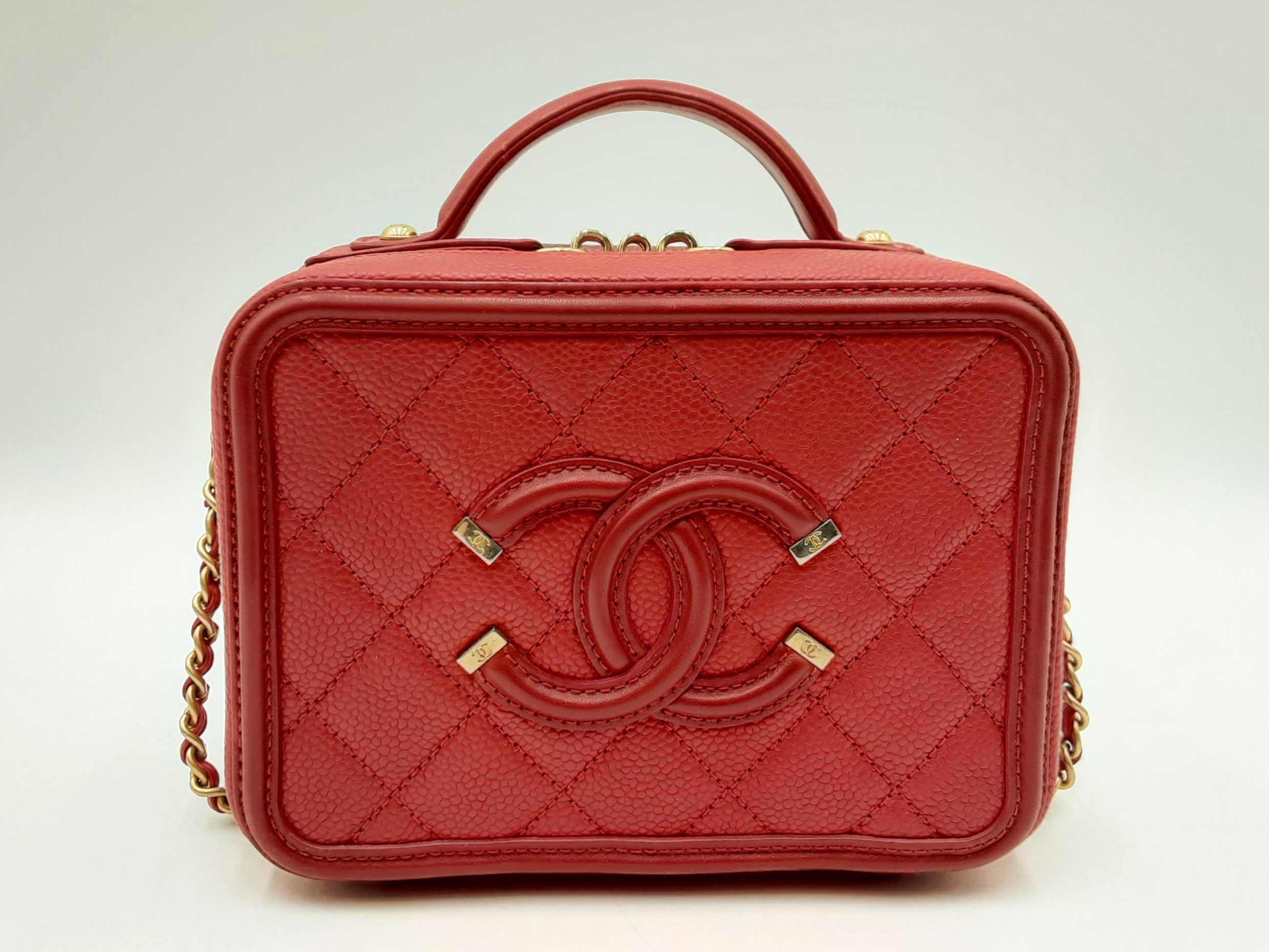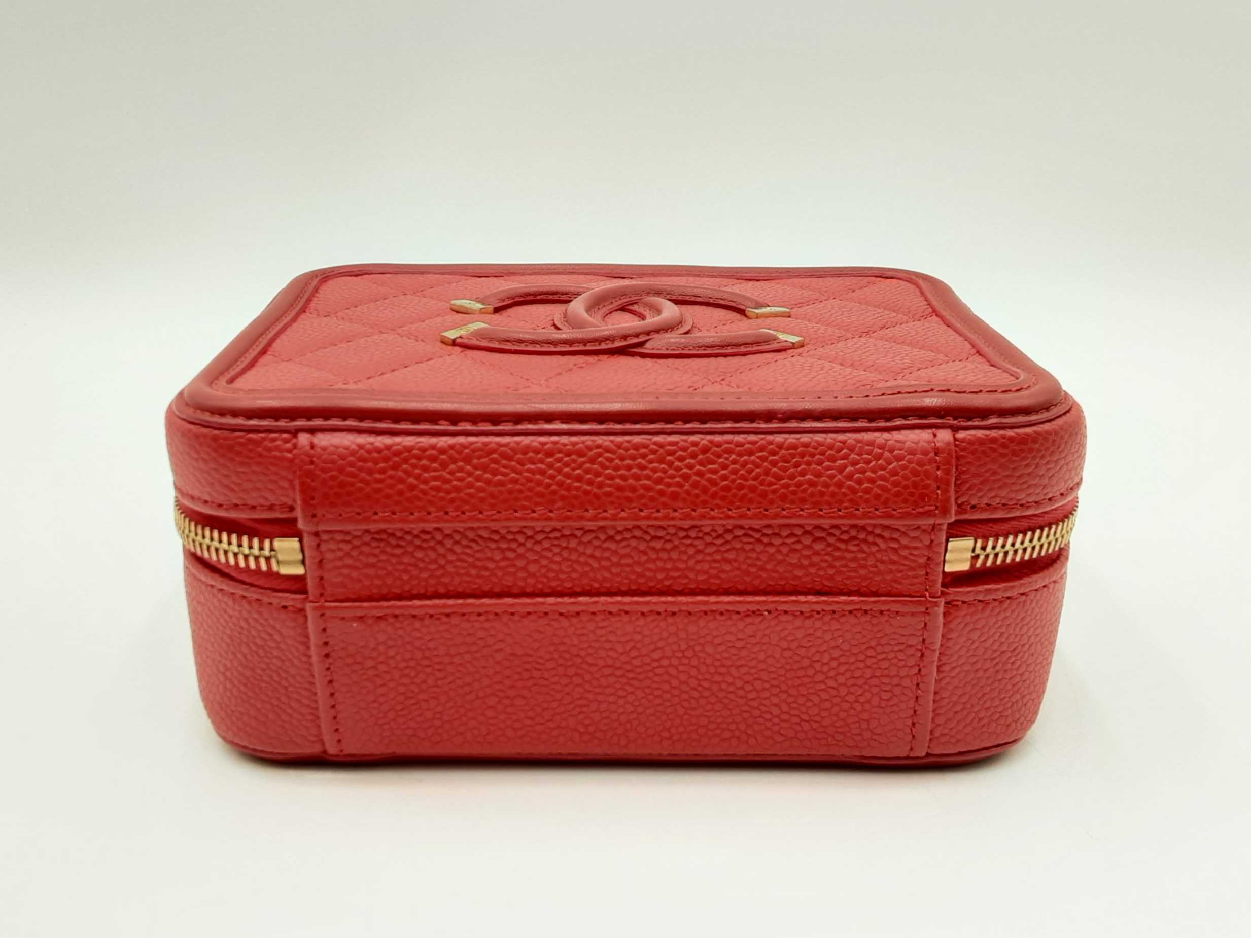 144030019902Chanel Filigree Vanity Case In Red Quilted Caviar Leather. Gold-Tone Hardware. Height 5 X Length 6.5 X Width 3 X Handle Drop 1.5 X Shoulder Drop 24 inches, approximately. Great Pre-Owned Condition. Scratches on, and gold-tone coating wearing off of hardware. Wear on one bottom corner. Scratched leather on handle. Creases and scuffs on leather clochettes.