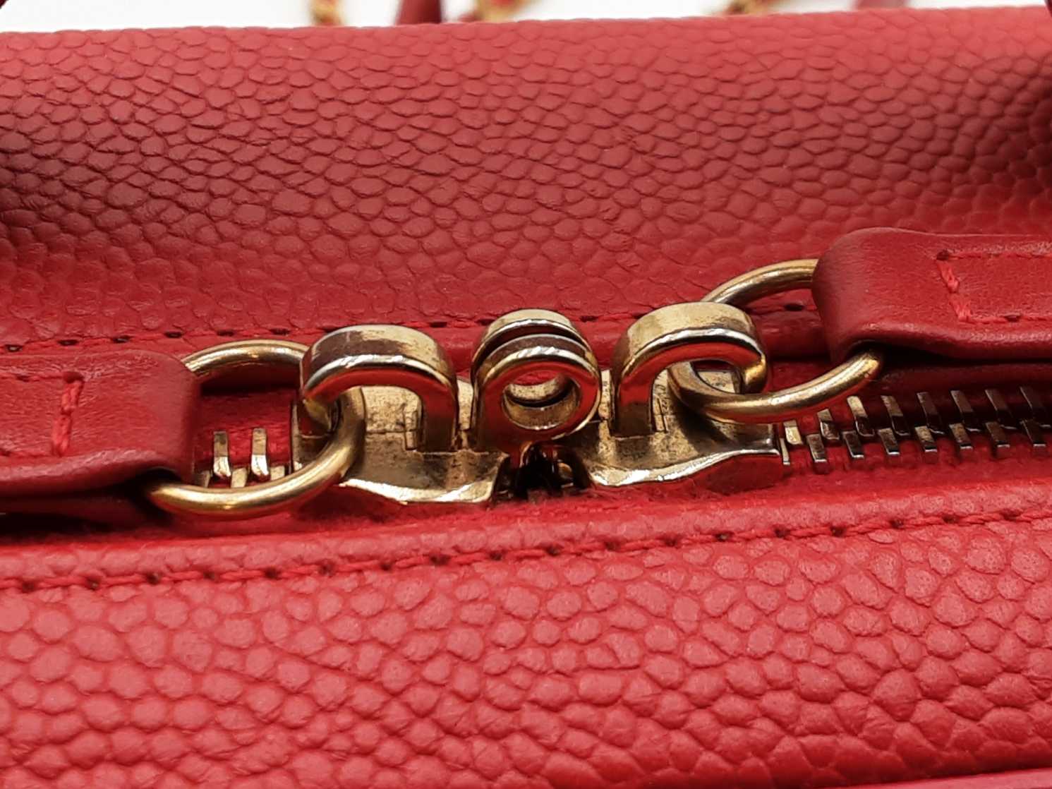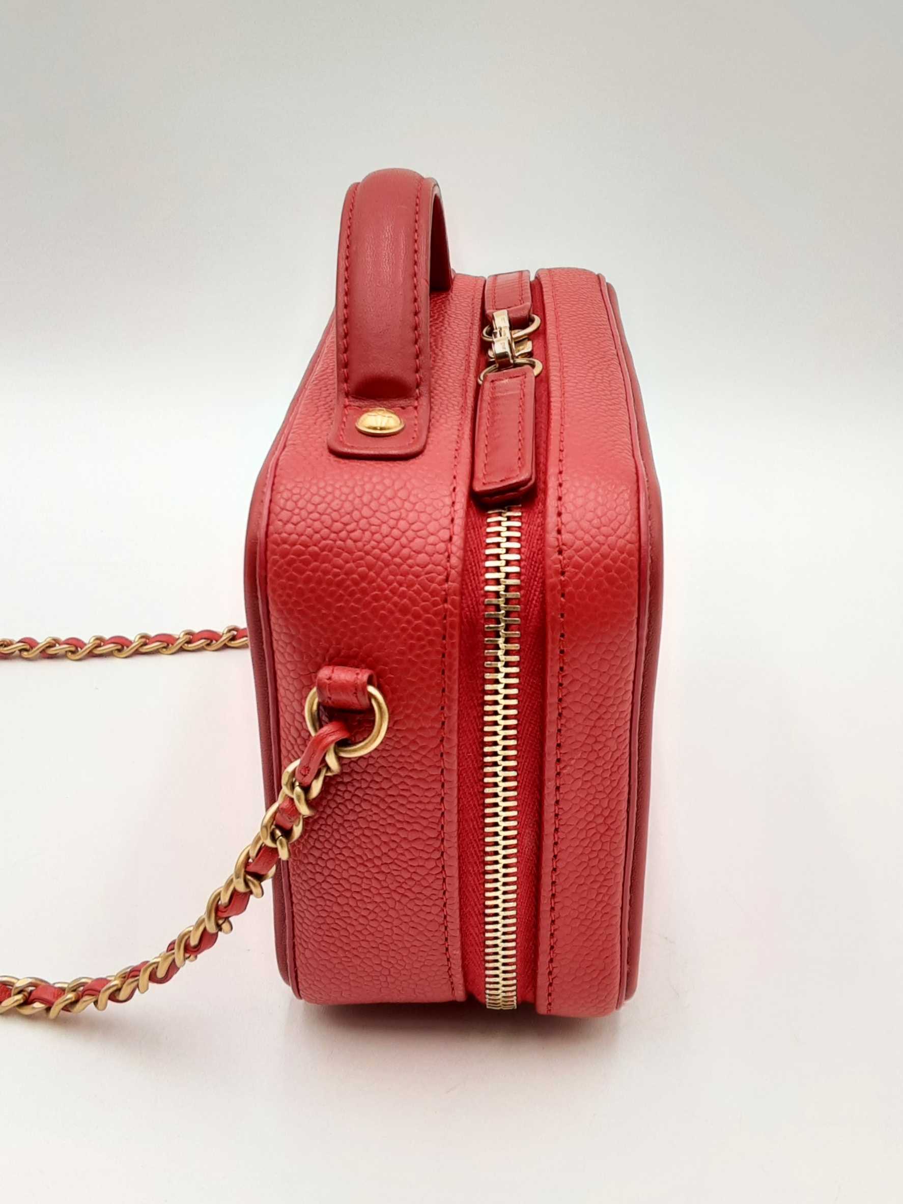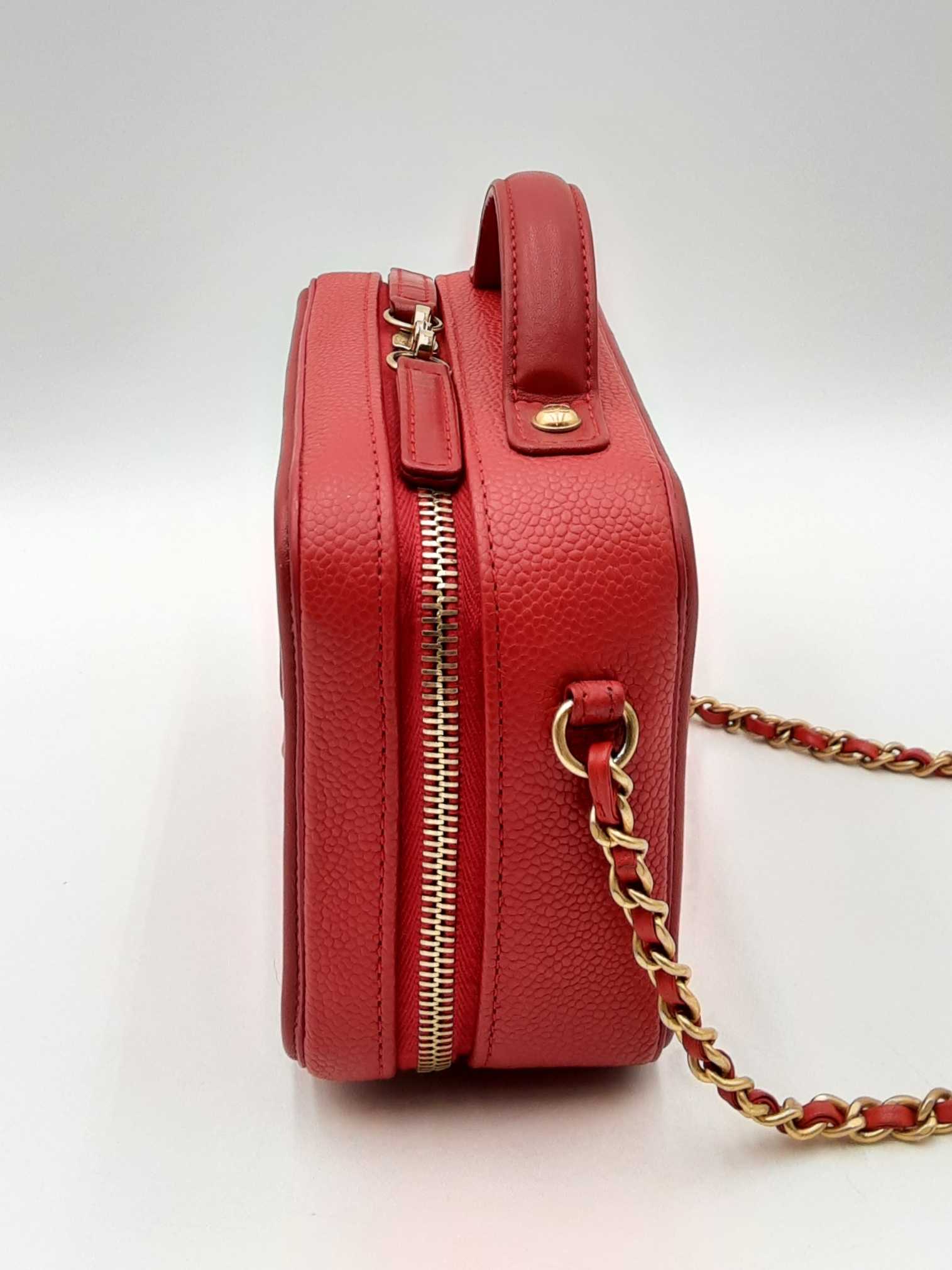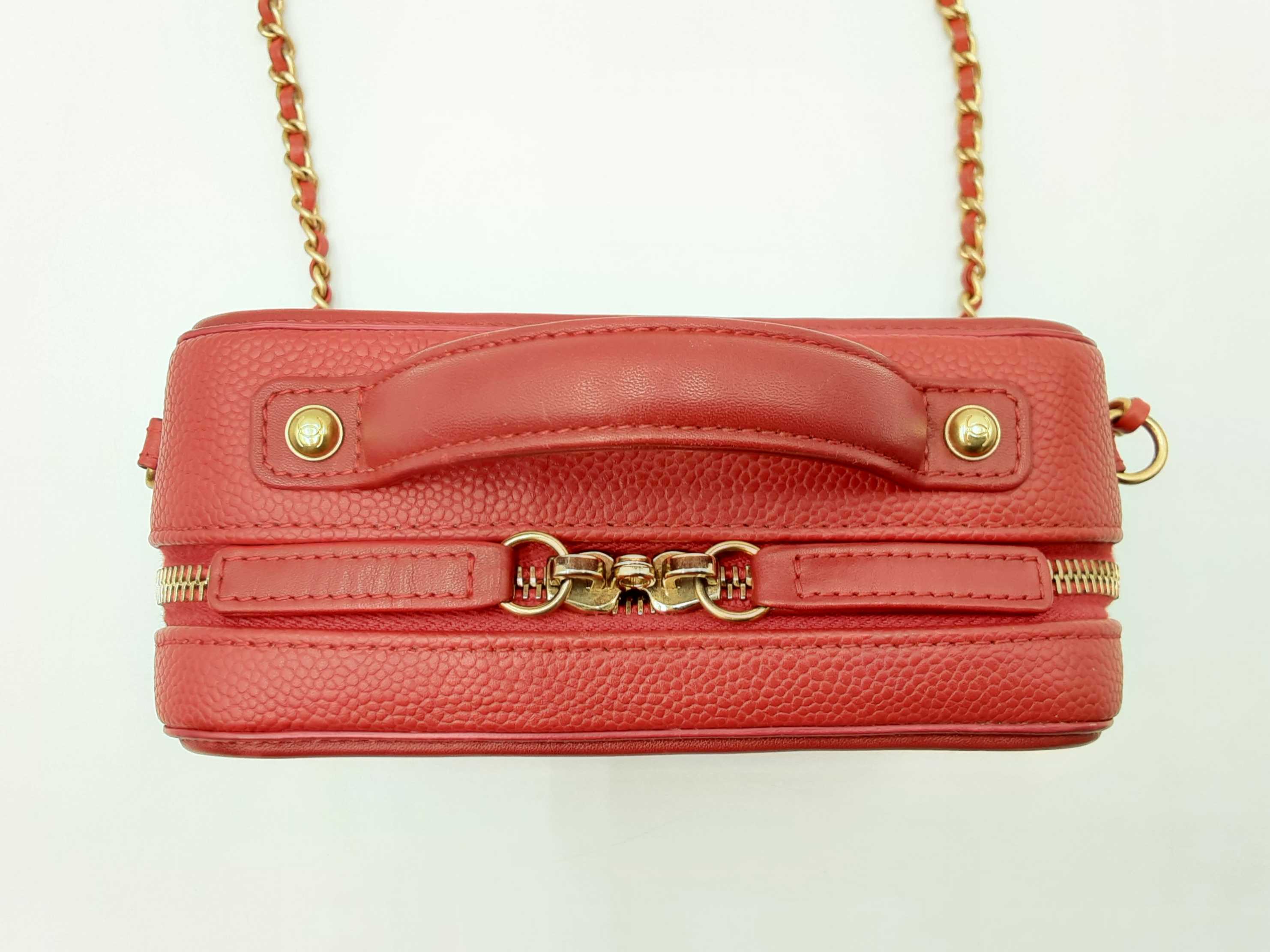 144030019902Chanel Filigree Vanity Case In Red Quilted Caviar Leather. Gold-Tone Hardware. Height 5 X Length 6.5 X Width 3 X Handle Drop 1.5 X Shoulder Drop 24 inches, approximately. Great Pre-Owned Condition. Scratches on, and gold-tone coating wearing off of hardware. Wear on one bottom corner. Scratched leather on handle. Creases and scuffs on leather clochettes.