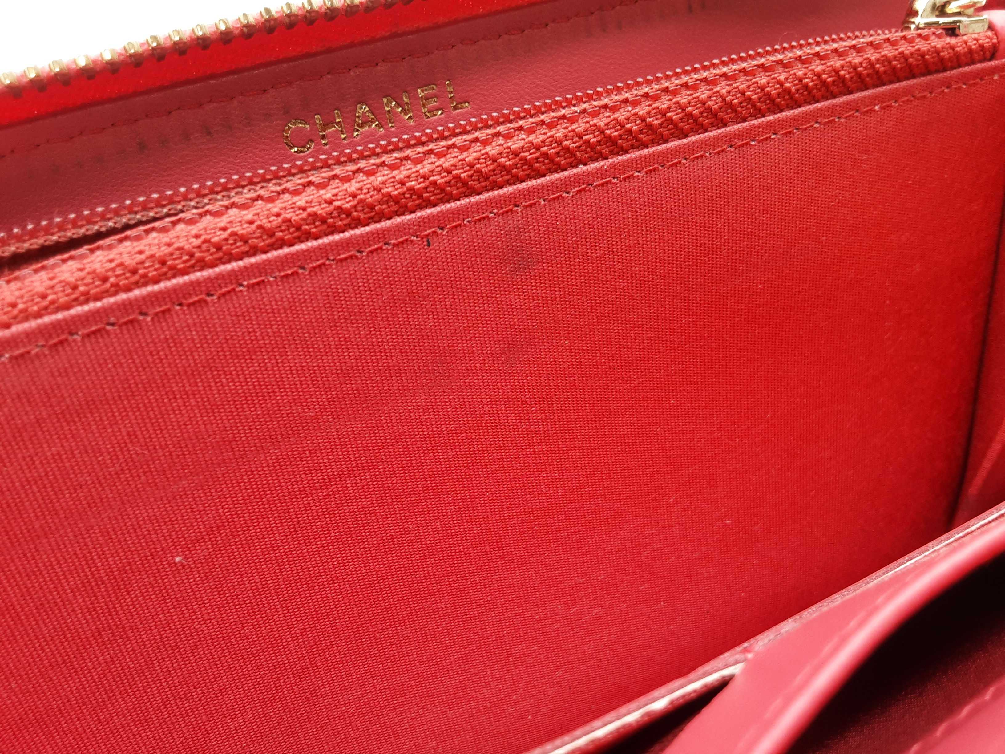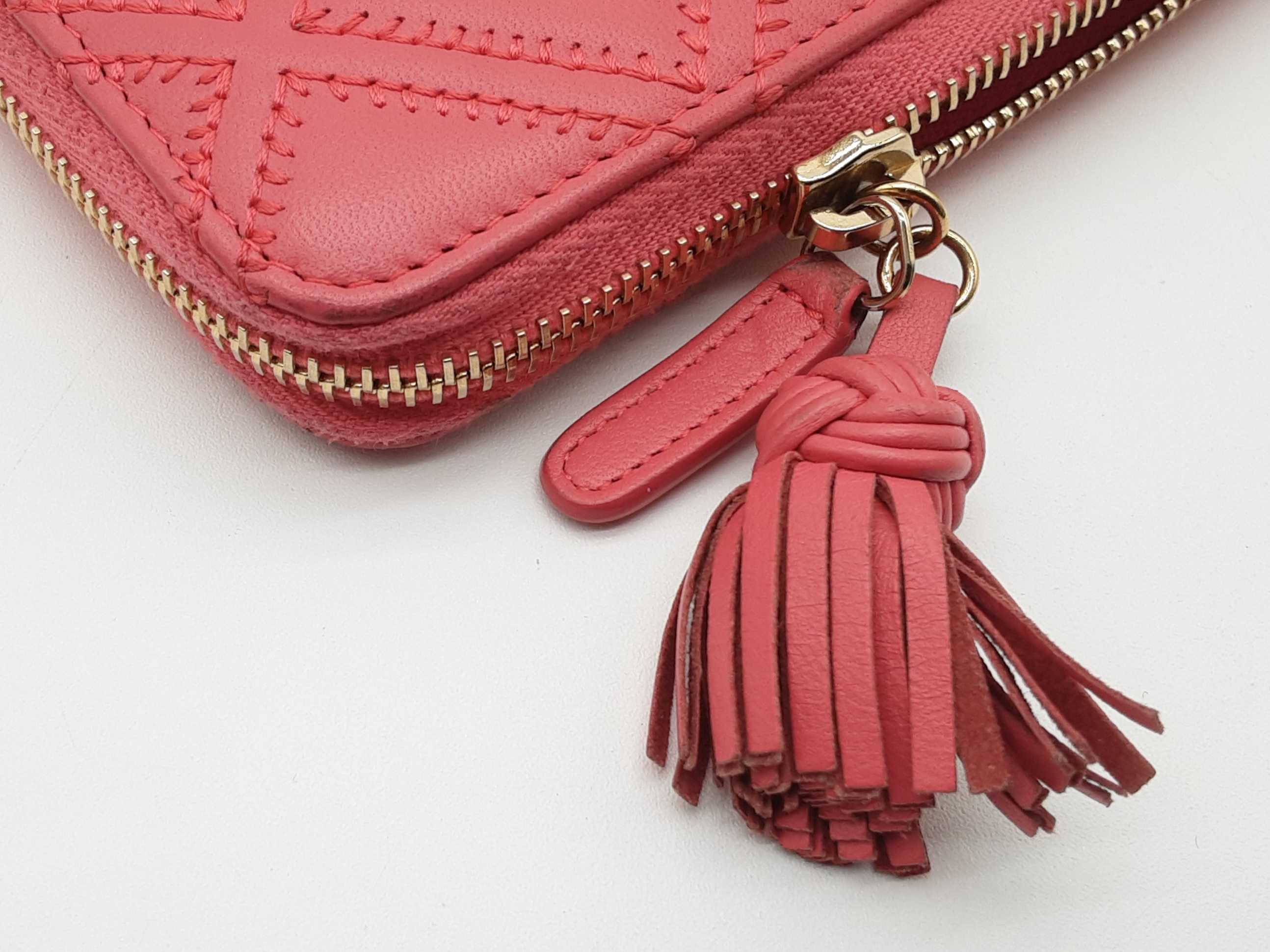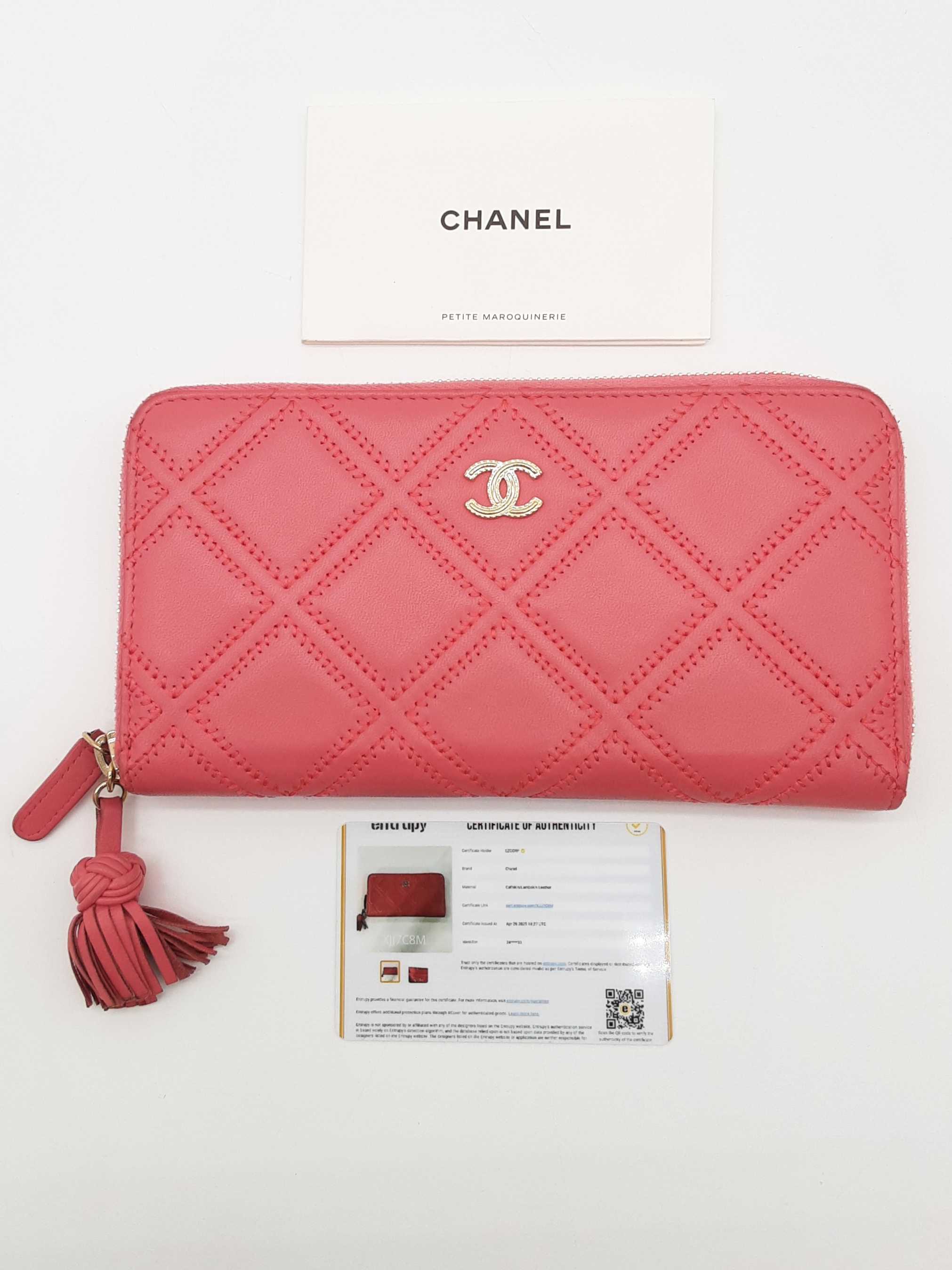144020031121Chanel Pink Diamond Quilted Leather Zipper Wallet. Length 7.5 IN X Height 4 IN X Width 1 IN. Entrupy Certificate #XJJ7C8M. Good Pre-owned Condition with creases and discoloration throughout, and wear on metal hardware, corners, zipper tab, zipper tassel, and on zipper fabric. Note: Due to color of wallet, some discoloration blends in photos.