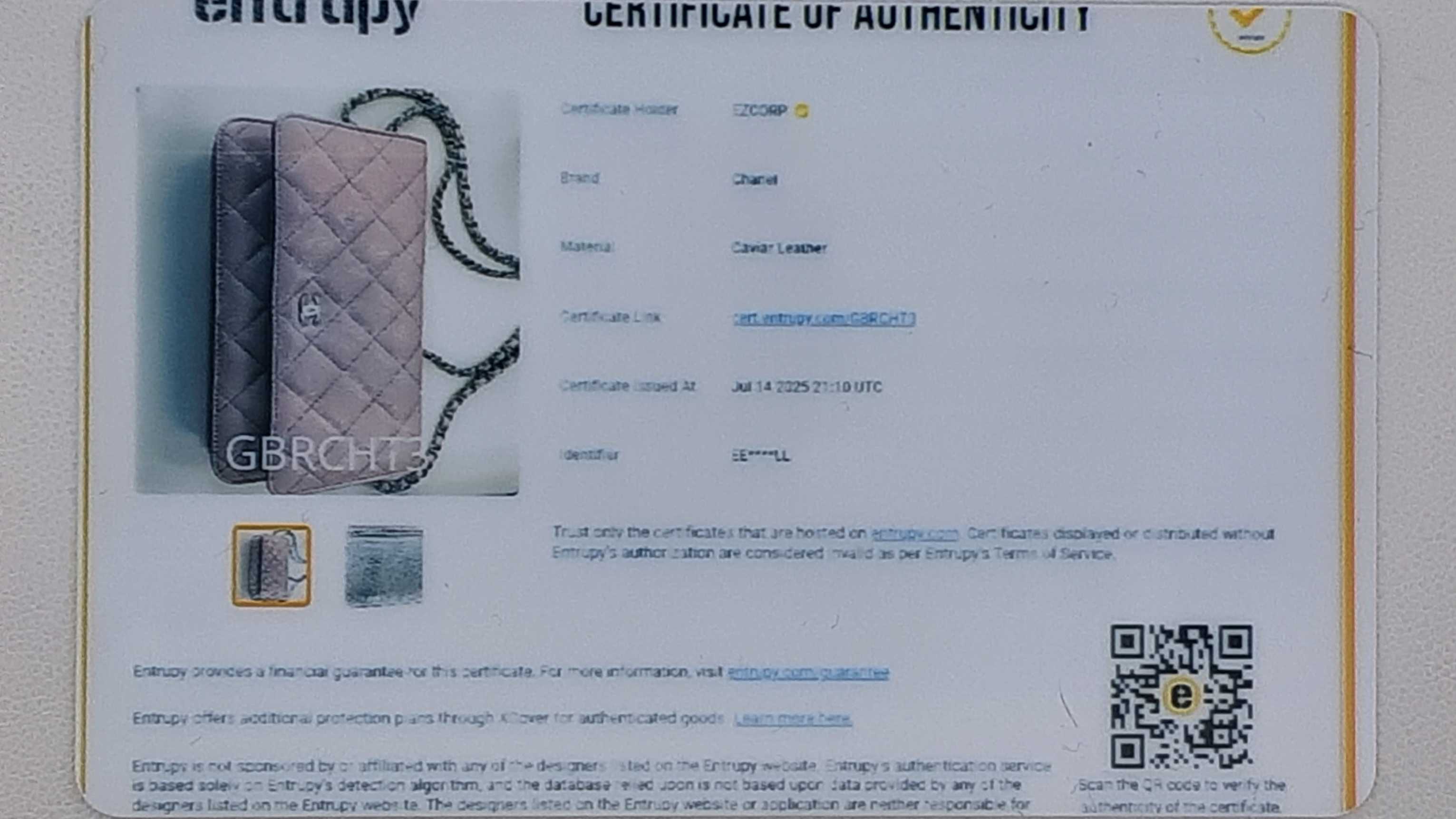 Entrupy Certificate Card, Box