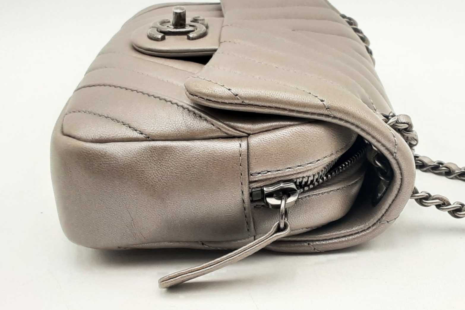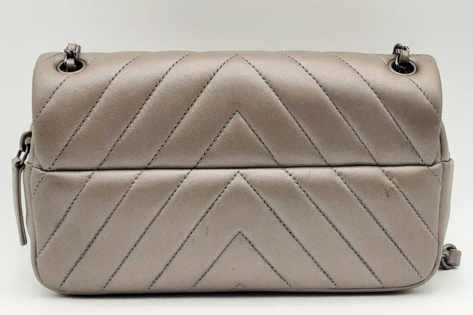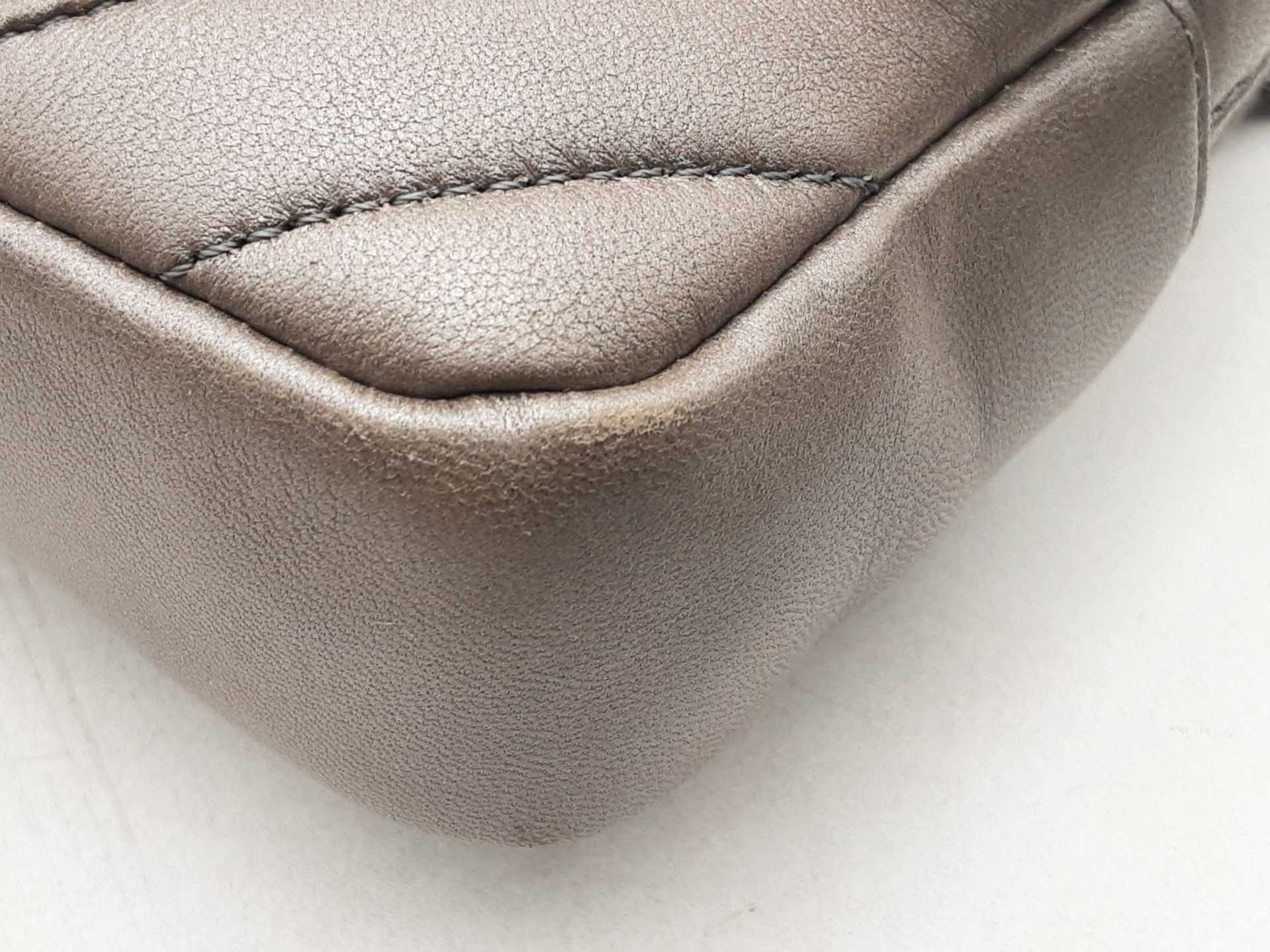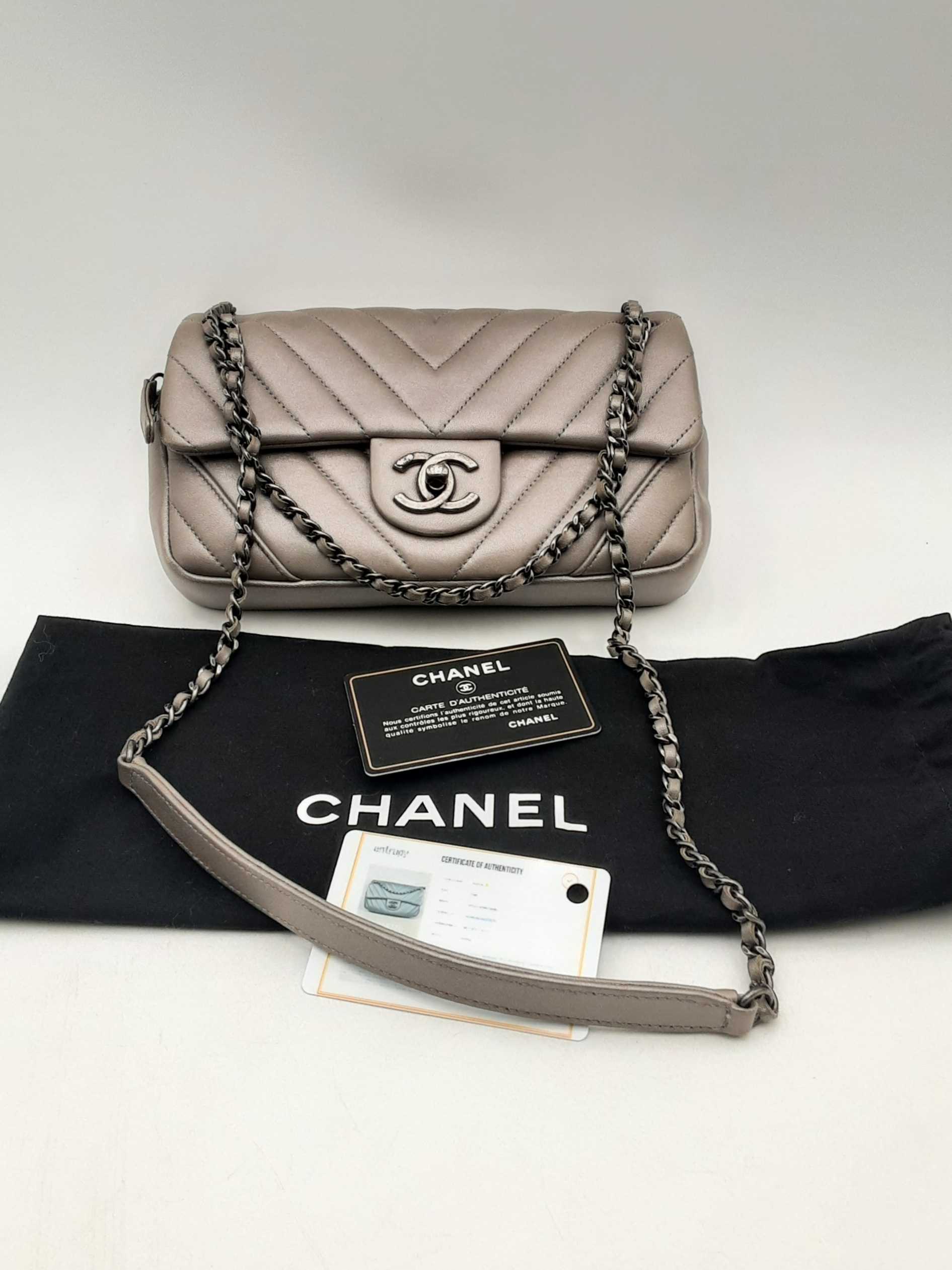 144010056903Chanel Quilted Chevron Gray Leather Rectangular Shoulder Bag. Approximate measurements: Height 5 IN X Length 8.75 IN X Width 1.5 IN X Drop 11.5 IN and 20.5 IN. Good Pre-Owned Condition. Scratches on hardware. Wear on the bottom and flap corners. Damage spot on the back of the bag as shown in photos. Orange residue stains on the front. Dust and debris inside the bag. Entrupy Certificate #D2TR7T6