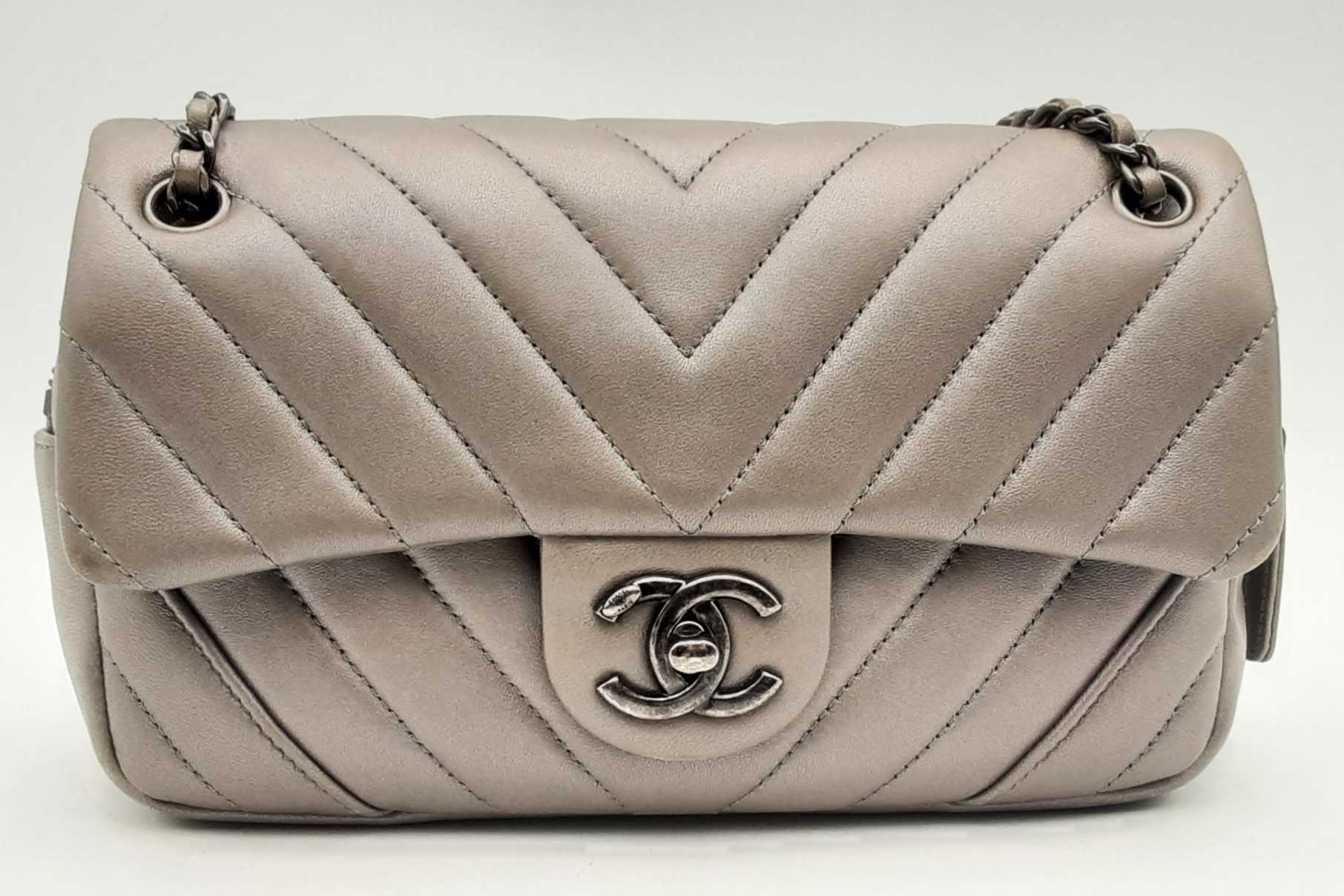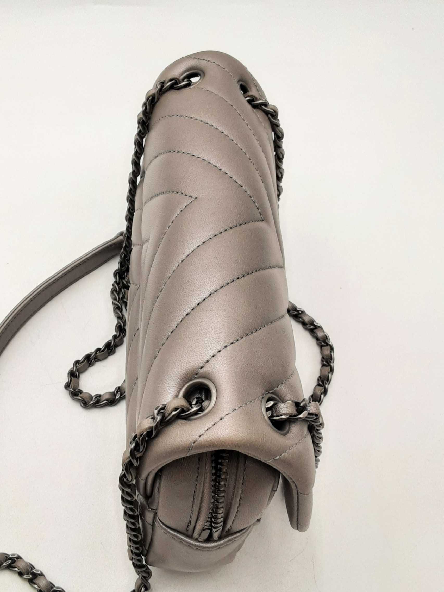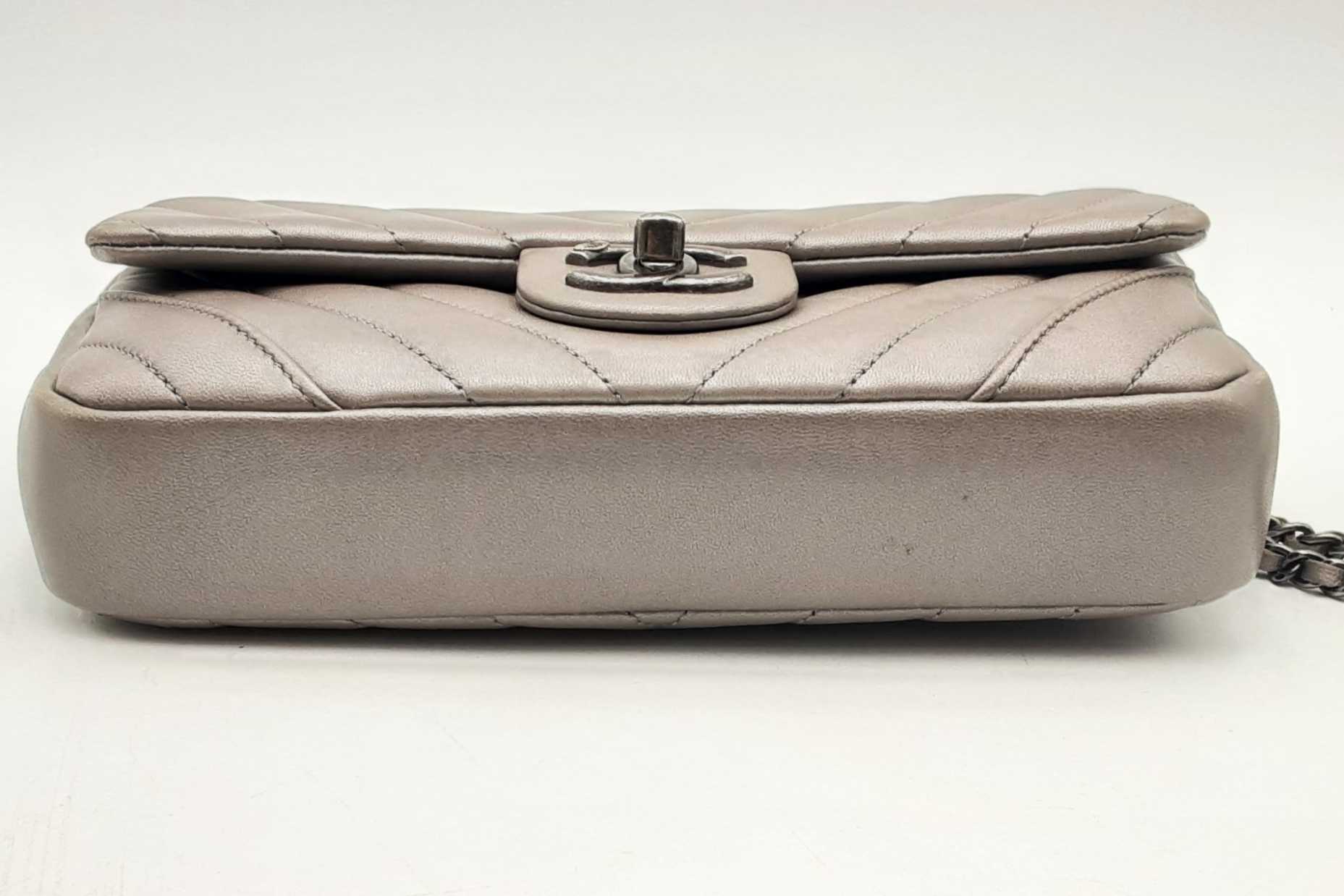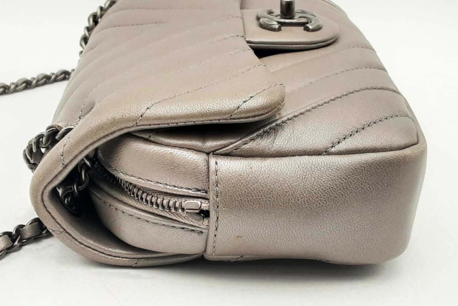 144010056903Chanel Quilted Chevron Gray Leather Rectangular Shoulder Bag. Approximate measurements: Height 5 IN X Length 8.75 IN X Width 1.5 IN X Drop 11.5 IN and 20.5 IN. Good Pre-Owned Condition. Scratches on hardware. Wear on the bottom and flap corners. Damage spot on the back of the bag as shown in photos. Orange residue stains on the front. Dust and debris inside the bag. Entrupy Certificate #D2TR7T6