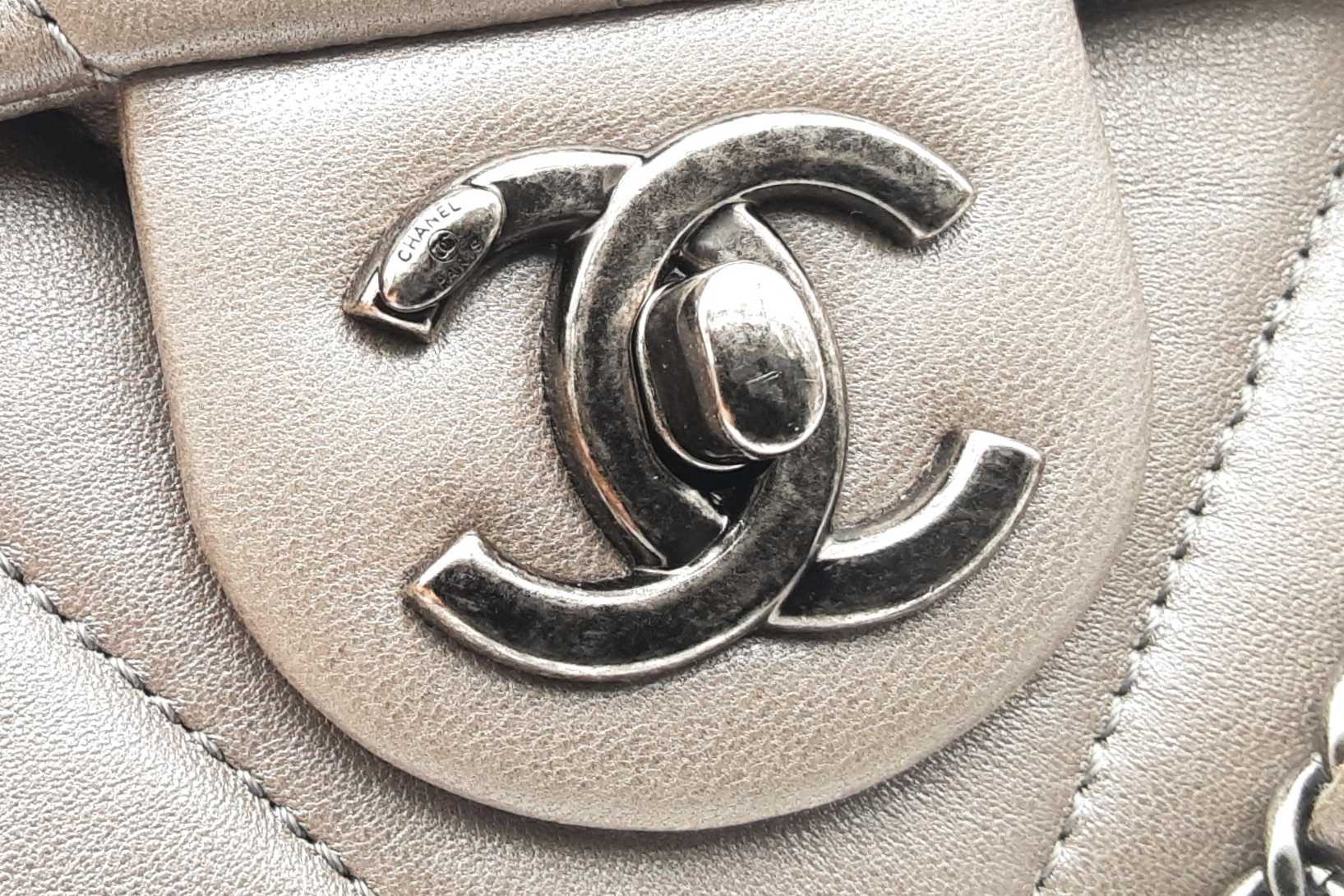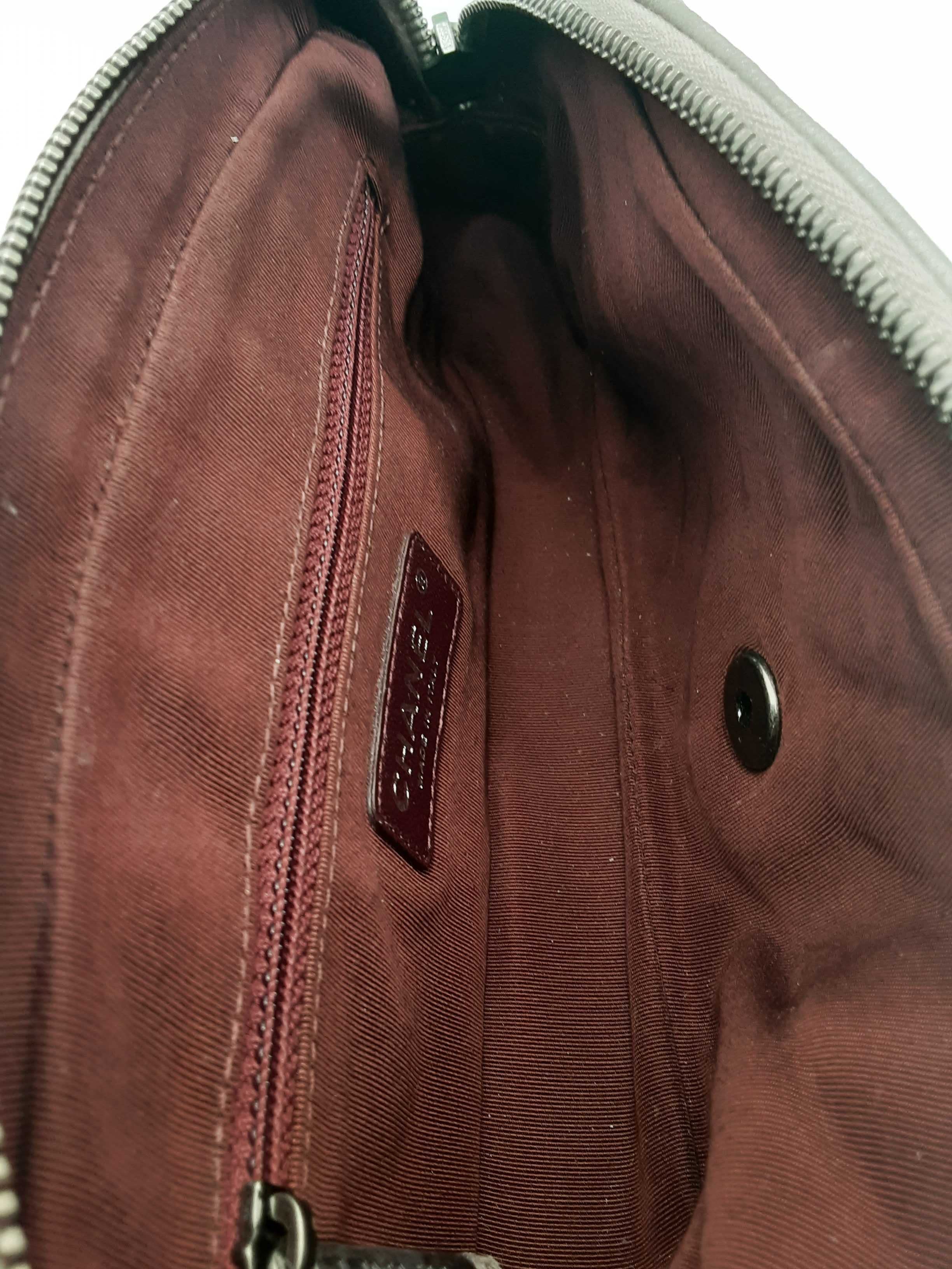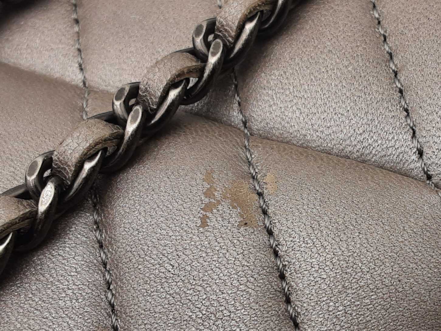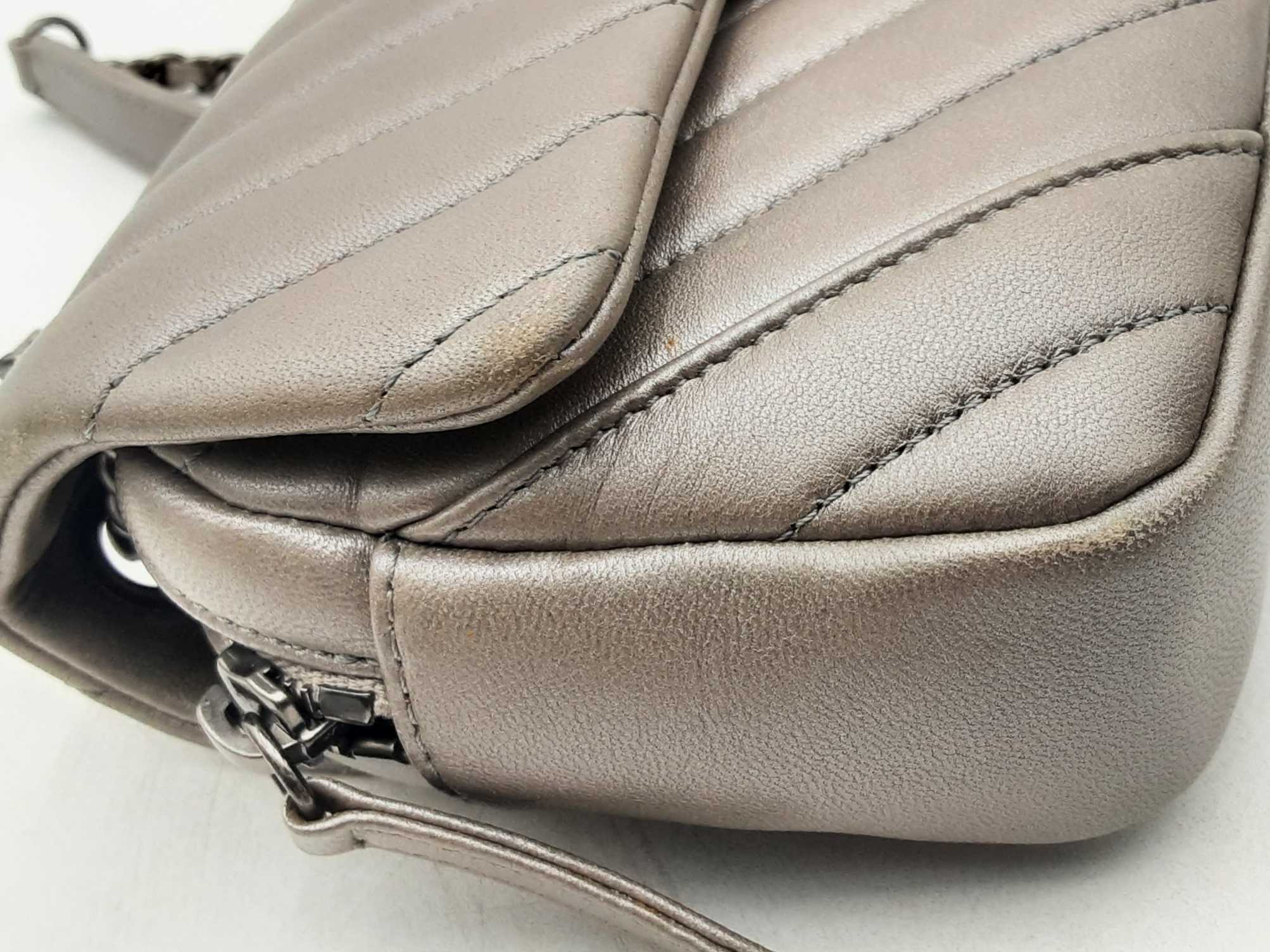 144010056903Chanel Quilted Chevron Gray Leather Rectangular Shoulder Bag. Approximate measurements: Height 5 IN X Length 8.75 IN X Width 1.5 IN X Drop 11.5 IN and 20.5 IN. Good Pre-Owned Condition. Scratches on hardware. Wear on the bottom and flap corners. Damage spot on the back of the bag as shown in photos. Orange residue stains on the front. Dust and debris inside the bag. Entrupy Certificate #D2TR7T6
