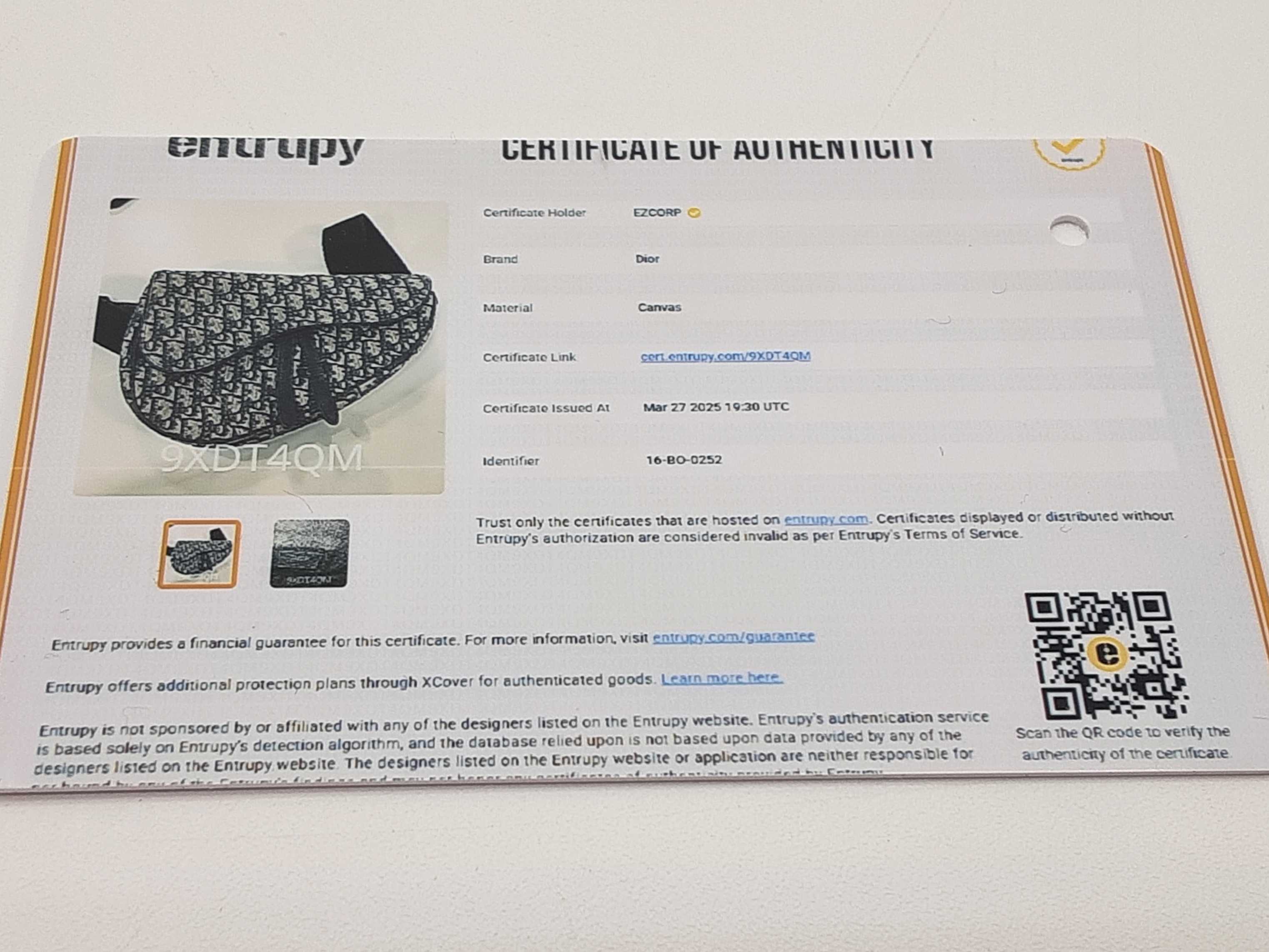 144020031084Christian Dior Saddle Tan Navy Oblique Logo Canvas Crossbody Bag. Length 11 IN X Height 8 IN X Width 2 IN. Length of Strap 41 to 51.5 IN. Date Code 16-BO-0252. Entrupy Certificate #9XDT4QM. Pre-Owned - Good Condition with creases, leather tabs sticking out, wear on nylon strap, scratches and wear on metal clasp, some wear on canvas and edges, and marks and discoloration on interior.