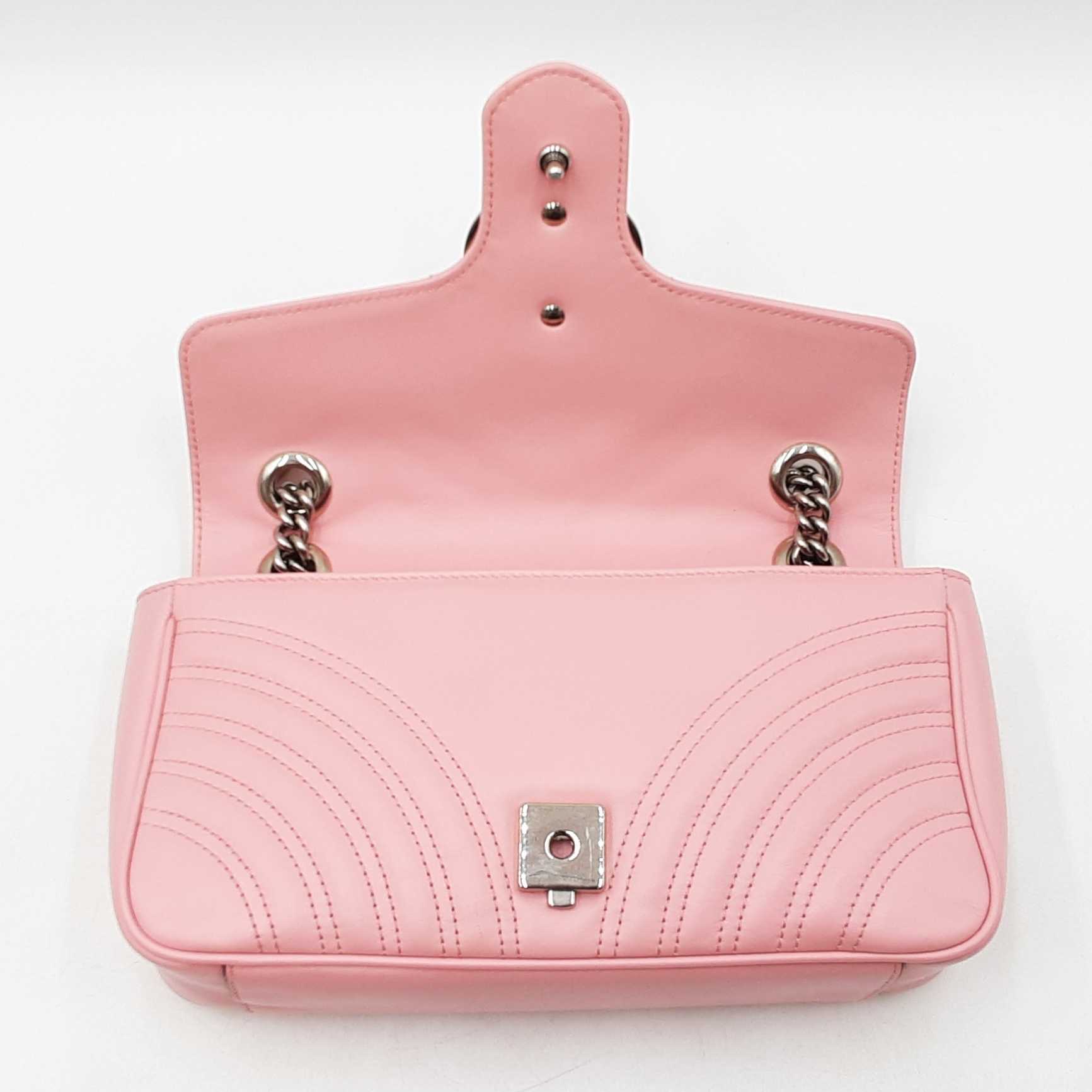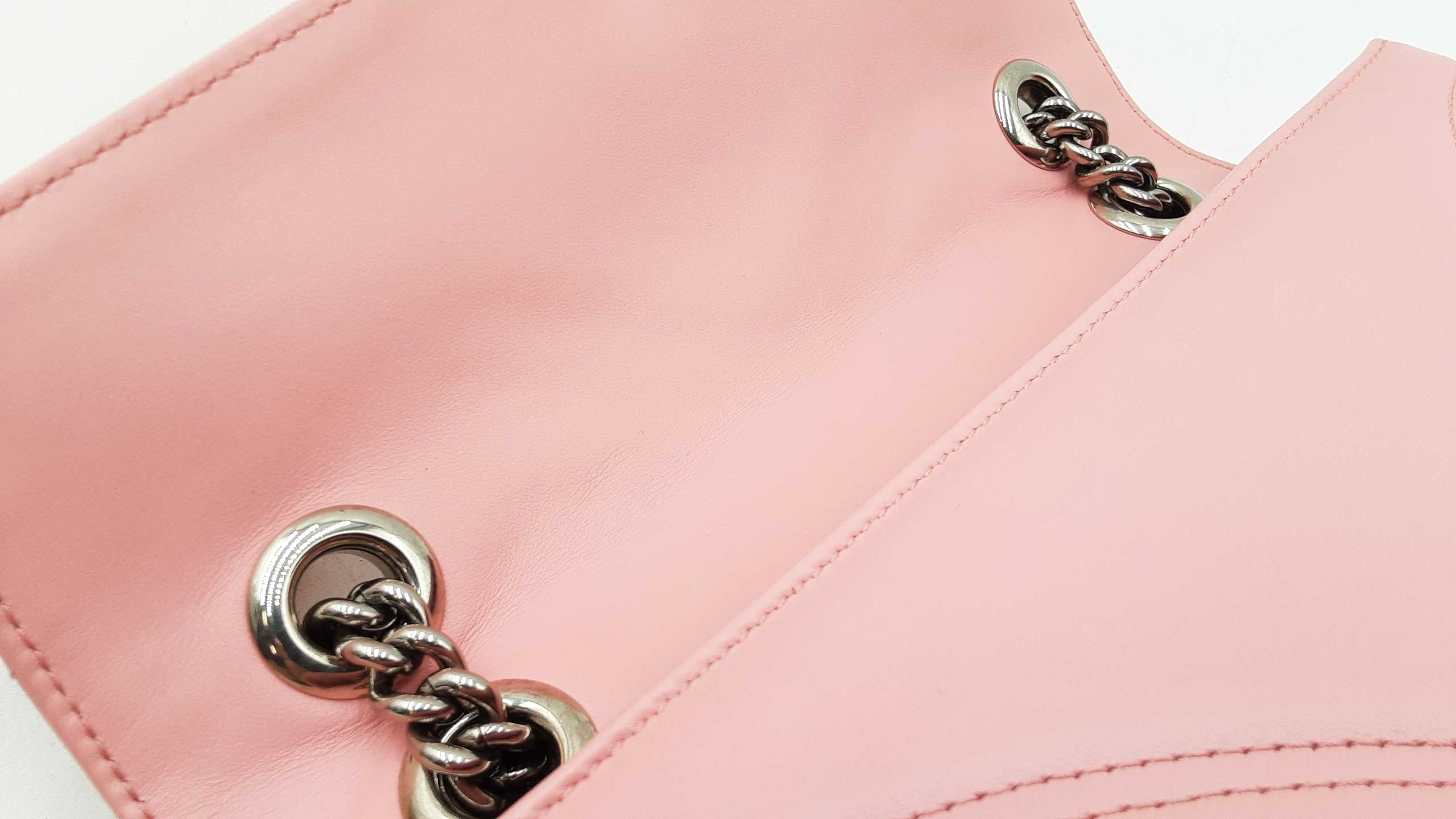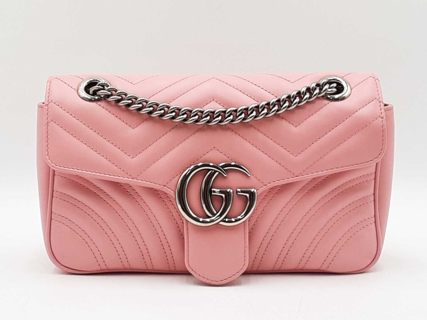 144030024709Gucci Marmont Medium Shoulder Bag In Pink Matelass茅 Chevron Leather. Silver-Tone Hardware. Length 10.25 IN X Height 6 IN X Width 75 IN X Sliding Chain Strap Drop 11.5 - 21.25 IN, approximately. Good Pre-Owned Condition. Light creasing throughout leather. Scuffed leather as shown in photos. Area of tonal color variance on back of bag. Dust/debris in interior compartments. Entrupy Certificate # GYXK6D8