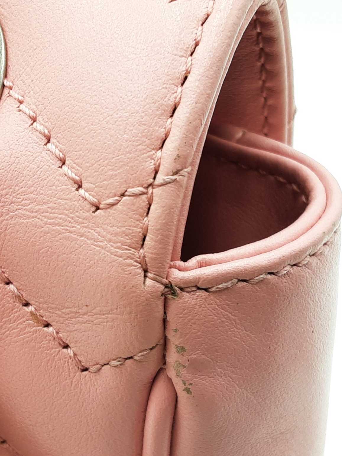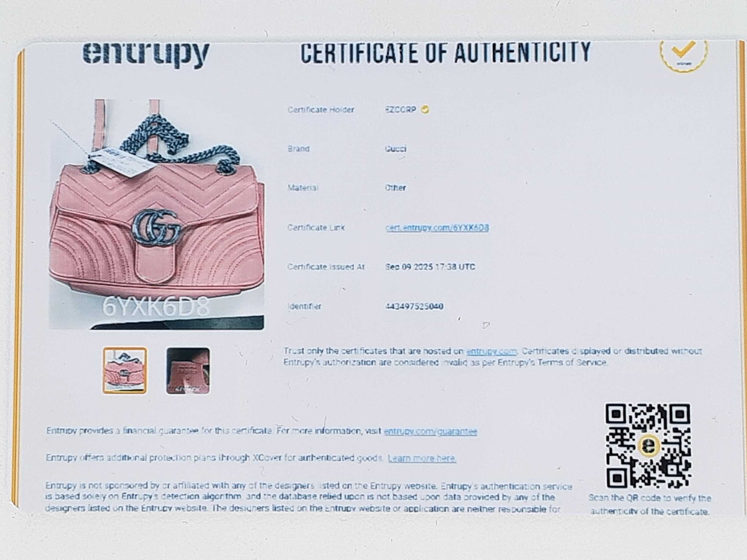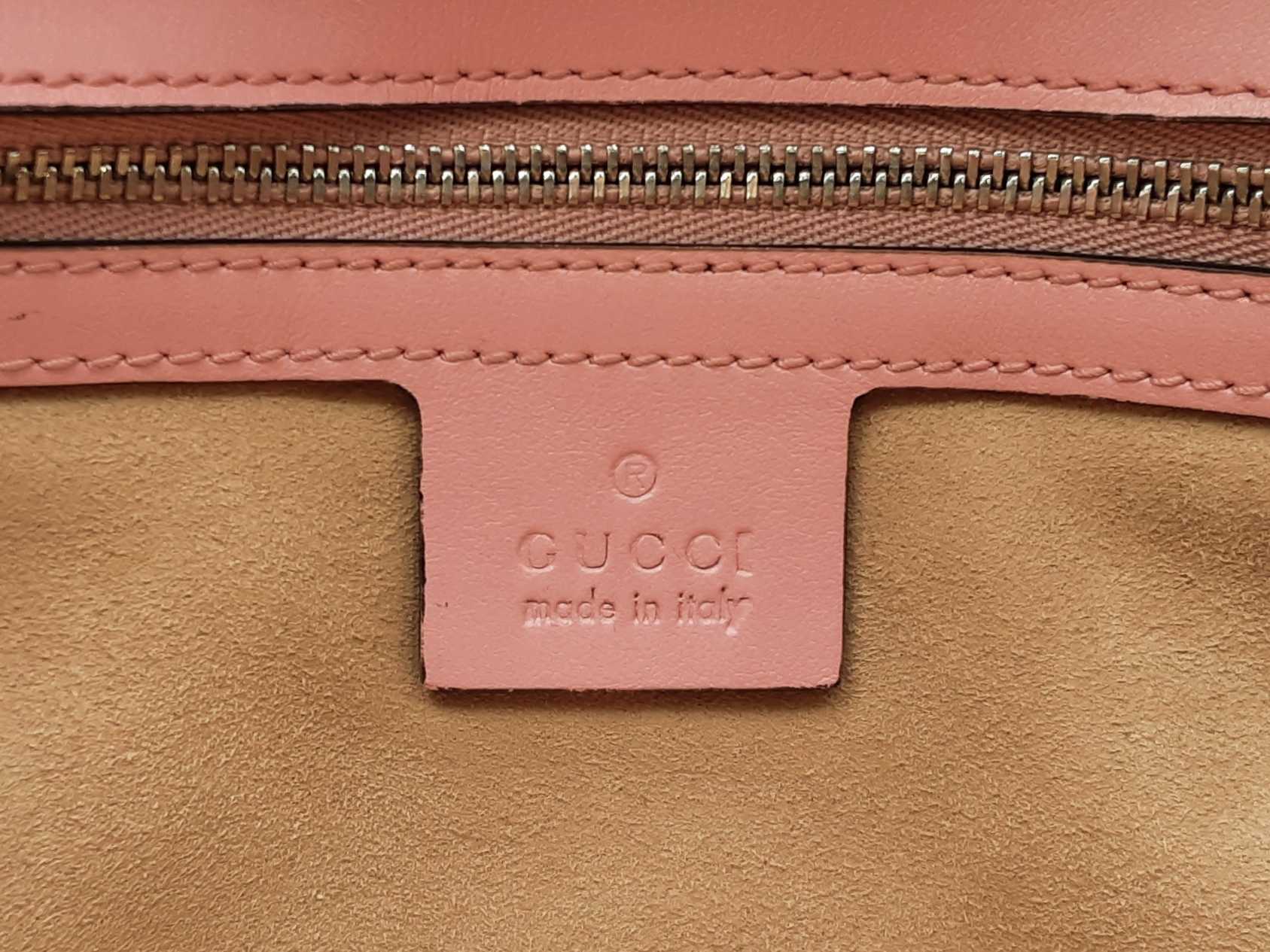 144030024709Gucci Marmont Medium Shoulder Bag In Pink Matelass茅 Chevron Leather. Silver-Tone Hardware. Length 10.25 IN X Height 6 IN X Width 75 IN X Sliding Chain Strap Drop 11.5 - 21.25 IN, approximately. Good Pre-Owned Condition. Light creasing throughout leather. Scuffed leather as shown in photos. Area of tonal color variance on back of bag. Dust/debris in interior compartments. Entrupy Certificate # GYXK6D8