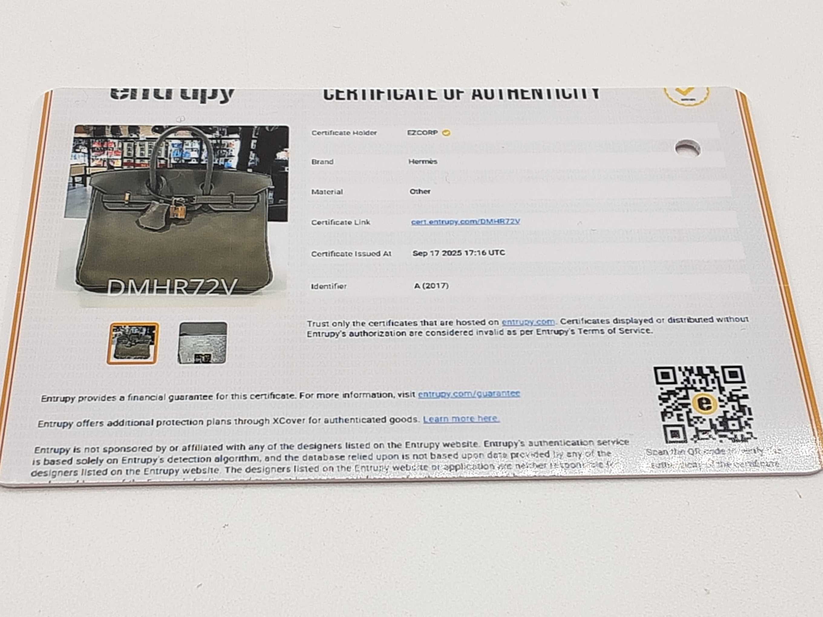 Entrupy Certificate Card, Dust Bag, Clochette, Lock, 2 Keys