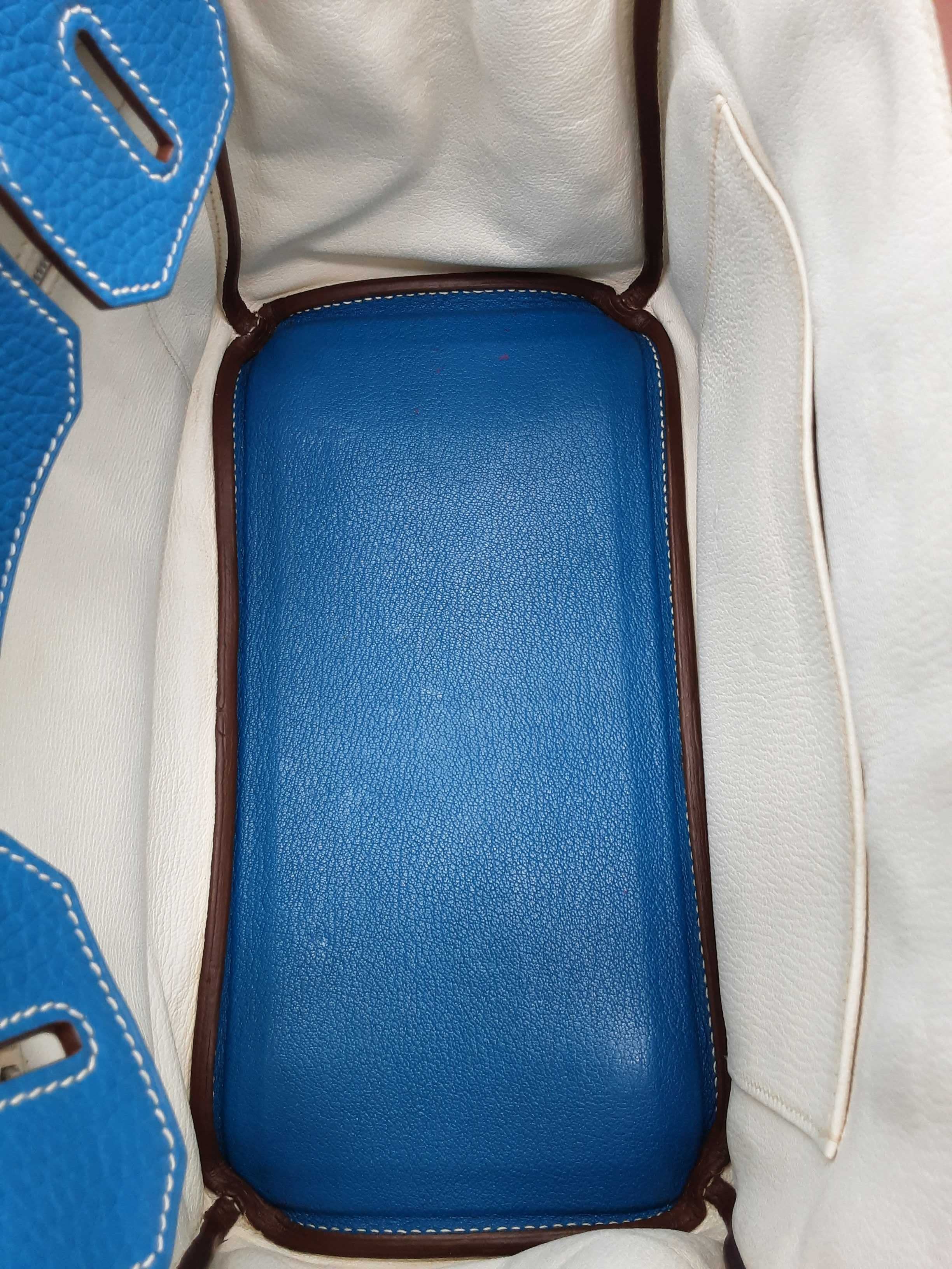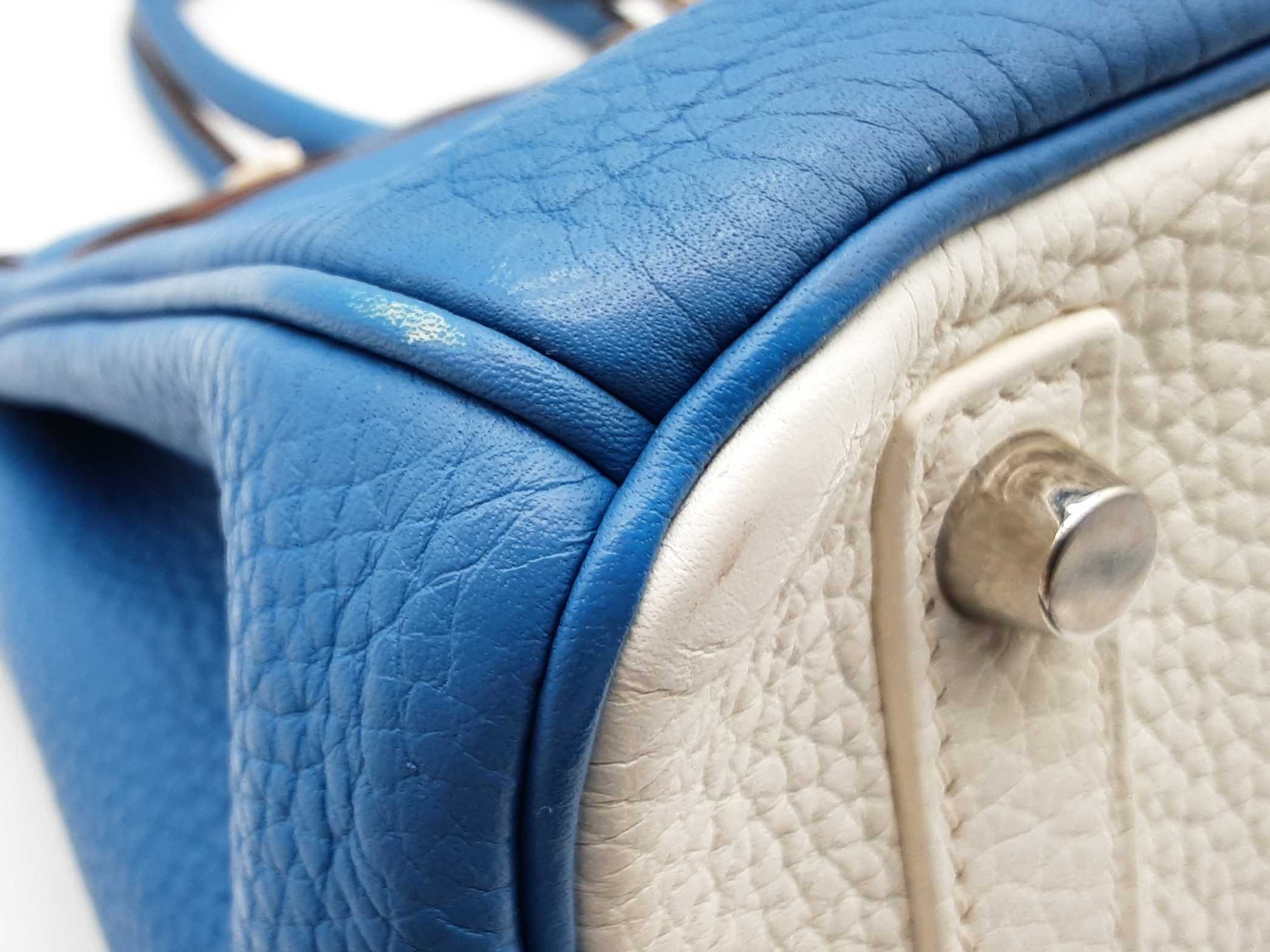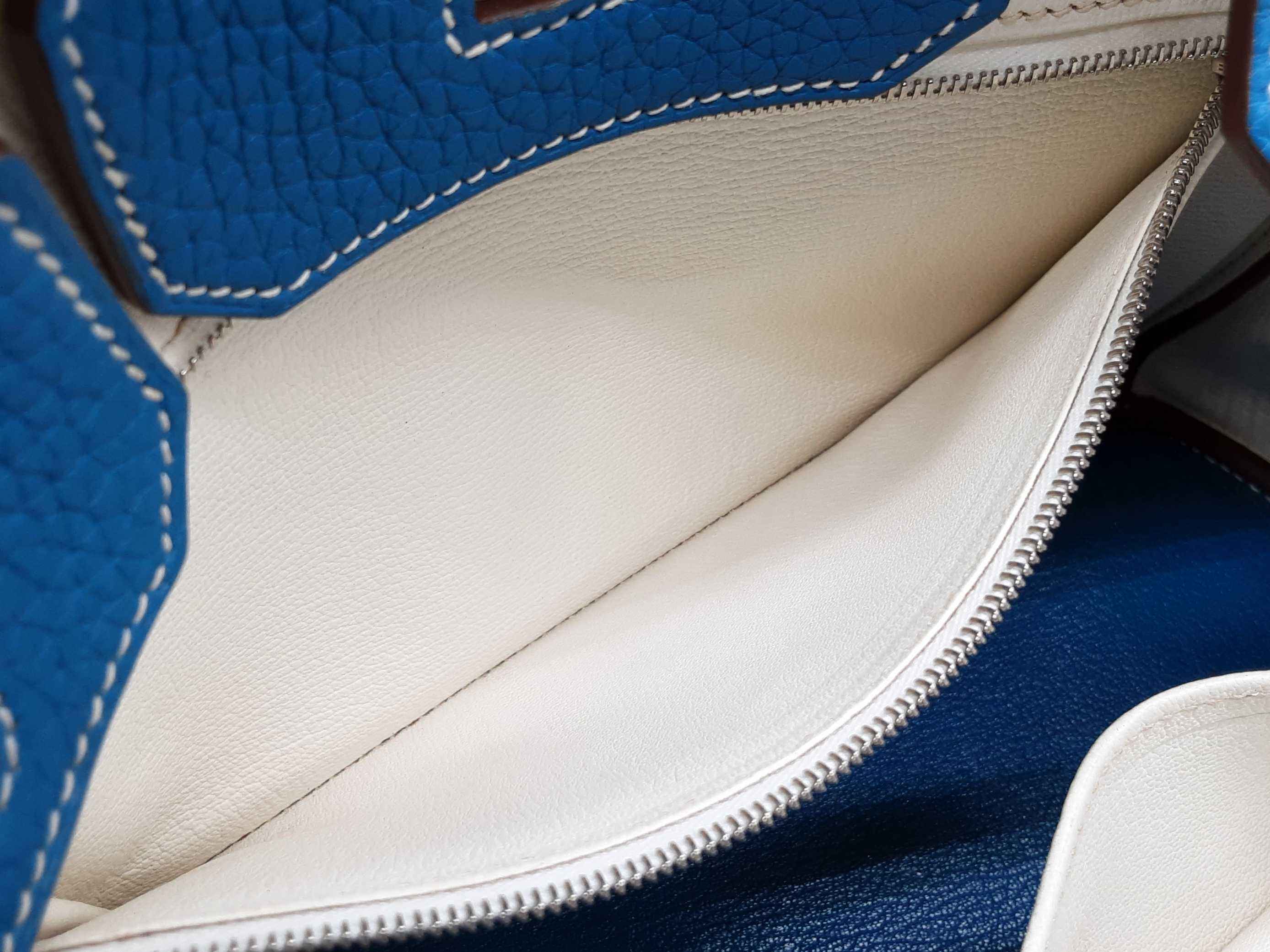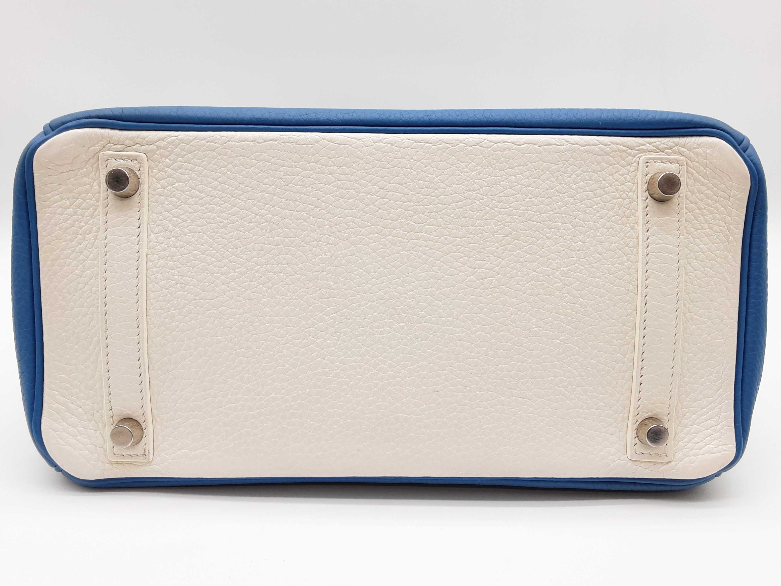 144020030711Hermes Birkin 30CM Mykonos Blue Clemence White Leather Interior Special Order Palladium Hardware Handbag. Length 12 IN X Height 8.5 IN X Width 6 IN X Drop 4 IN. Date Code Square O (2011). Entrupy Certificate #YVKXQ7C. Great Pre-owned Condition with creases, scratches on metal hardware, flap curved, indentations and marks on interior, discoloration on white exterior bottom, and wear on corners and handles.