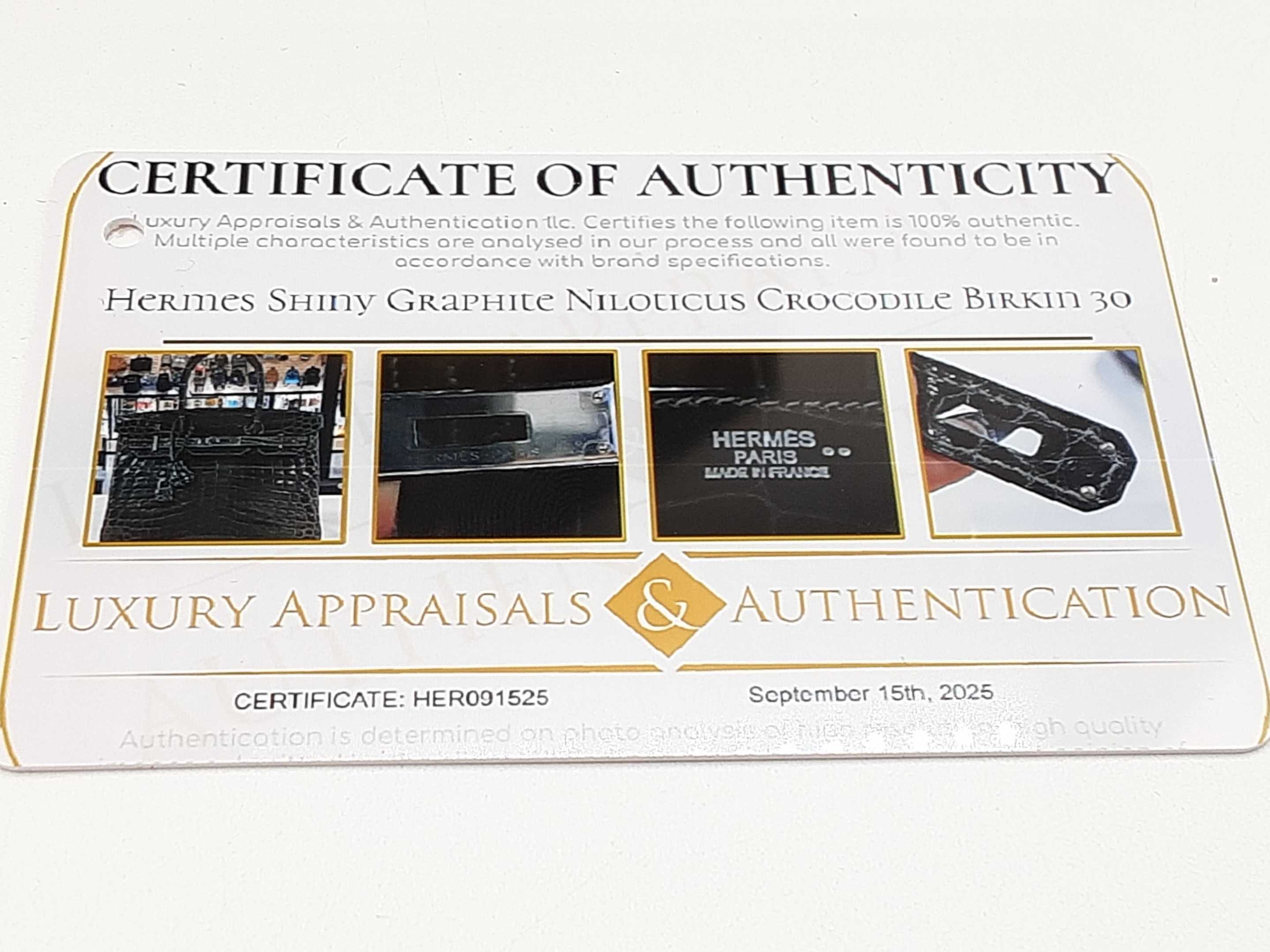 144020039288Hermes Birkin 30CM Graphite Gray Niloticus Crocodile Palladium Hardware Handbag. Length 11.5 IN X Height 8 IN X Width 6 IN X Drop 4 IN. Date Code Square N (2010). Certificate #HER091525. Pre-Owned - Good Condition with creases, flap curved, scratches on metal hardware, scratches and indentations on interior, scratches inside pockets, cracks on handle edges, and wear on clochette, corners and edges.