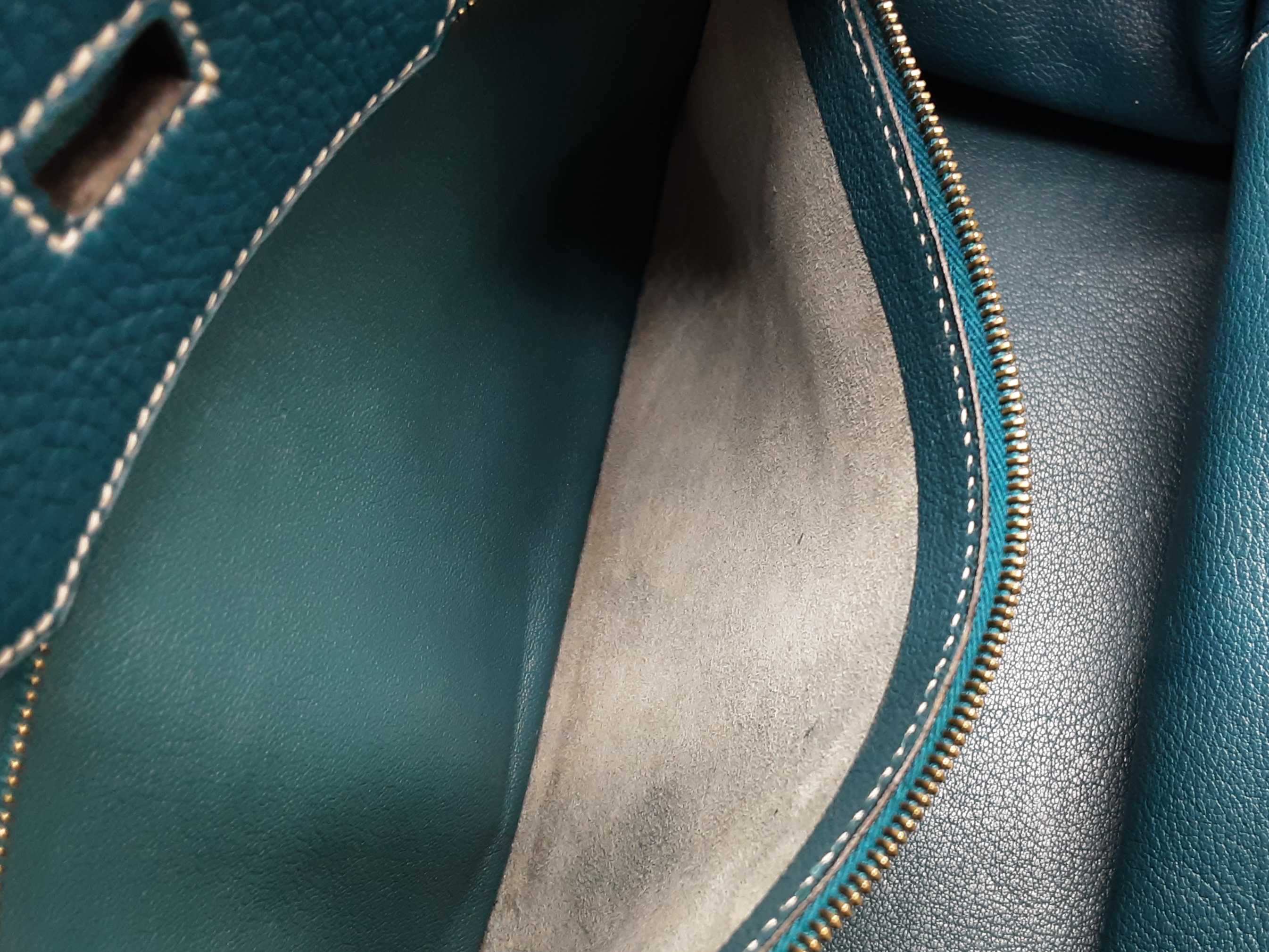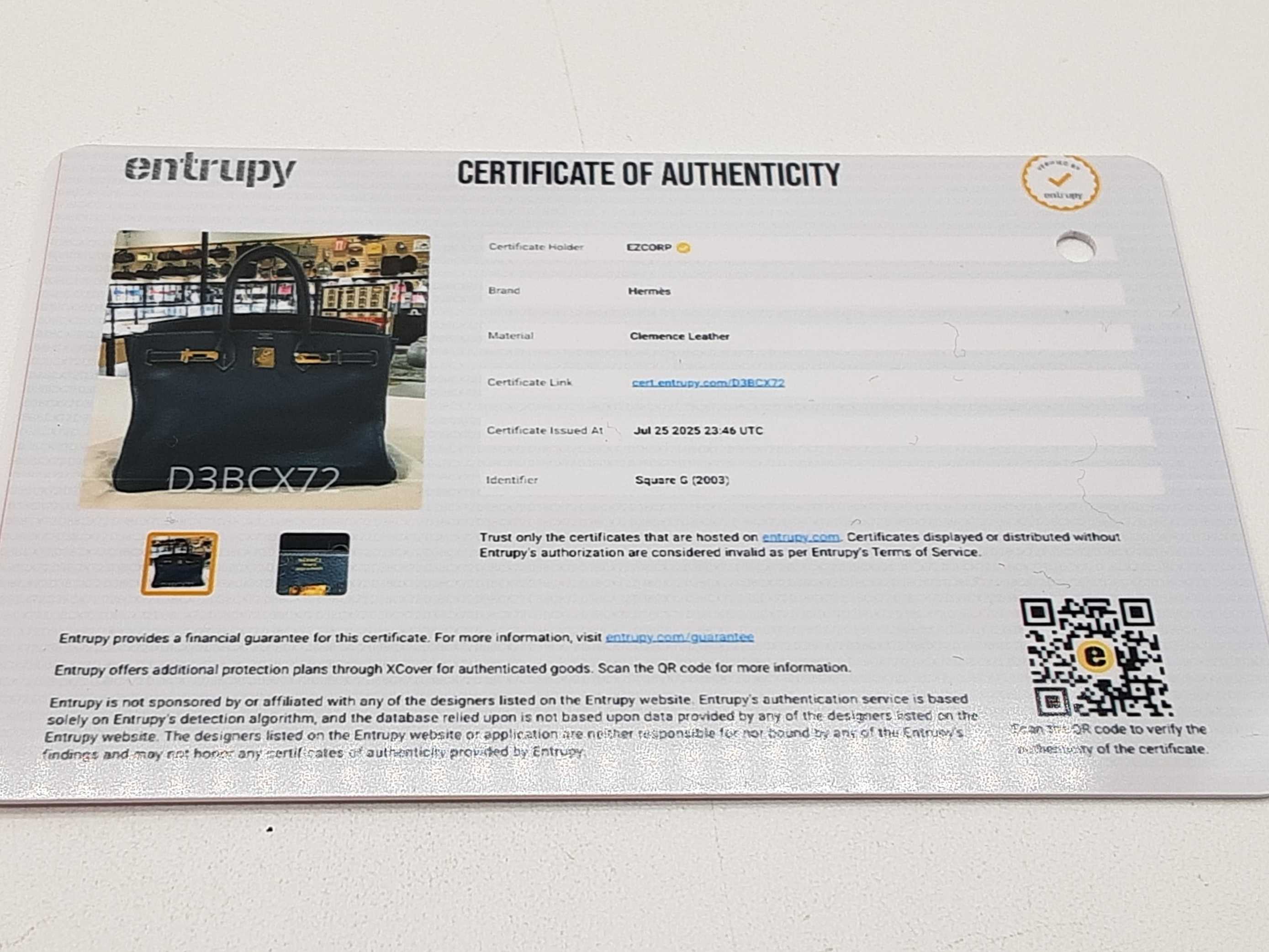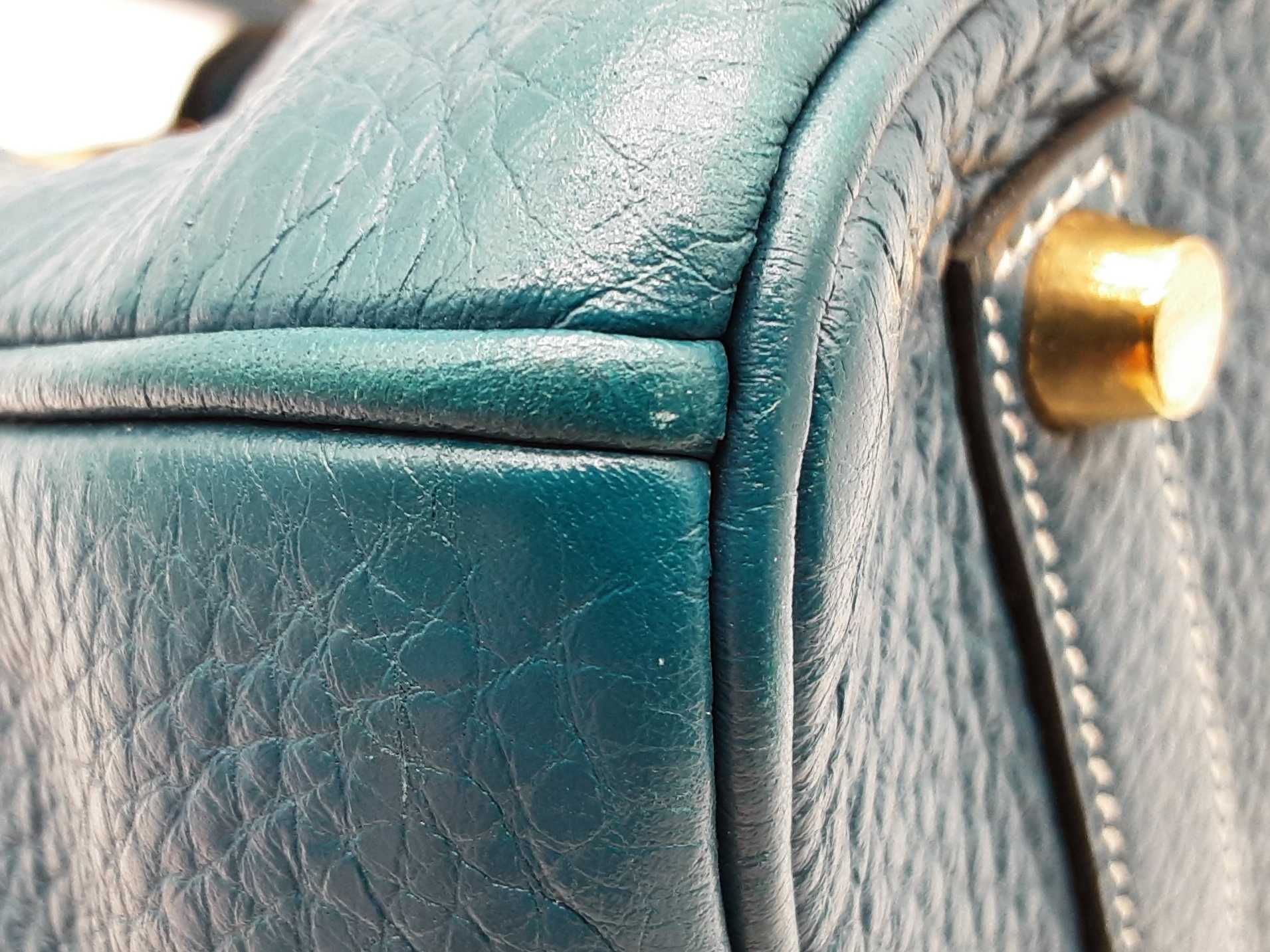 144020036796Hermes Birkin 35CM Thalassa Blue Clemence Gold Hardware Handbag. Length 14 IN X Height 9.5 IN X Width 7.5 IN X Drop 4 IN. Date Code Square G (2003). Entrupy Certificate #D3BCX72. Pre-owned - Good Condition with creases, flap curved, bag misshapen, scratches and wear on metal hardware, wear and discoloration on handles, wear on edges and corners, scratches and indentations on interior bottom, and discoloration, wear and marks inside pockets.