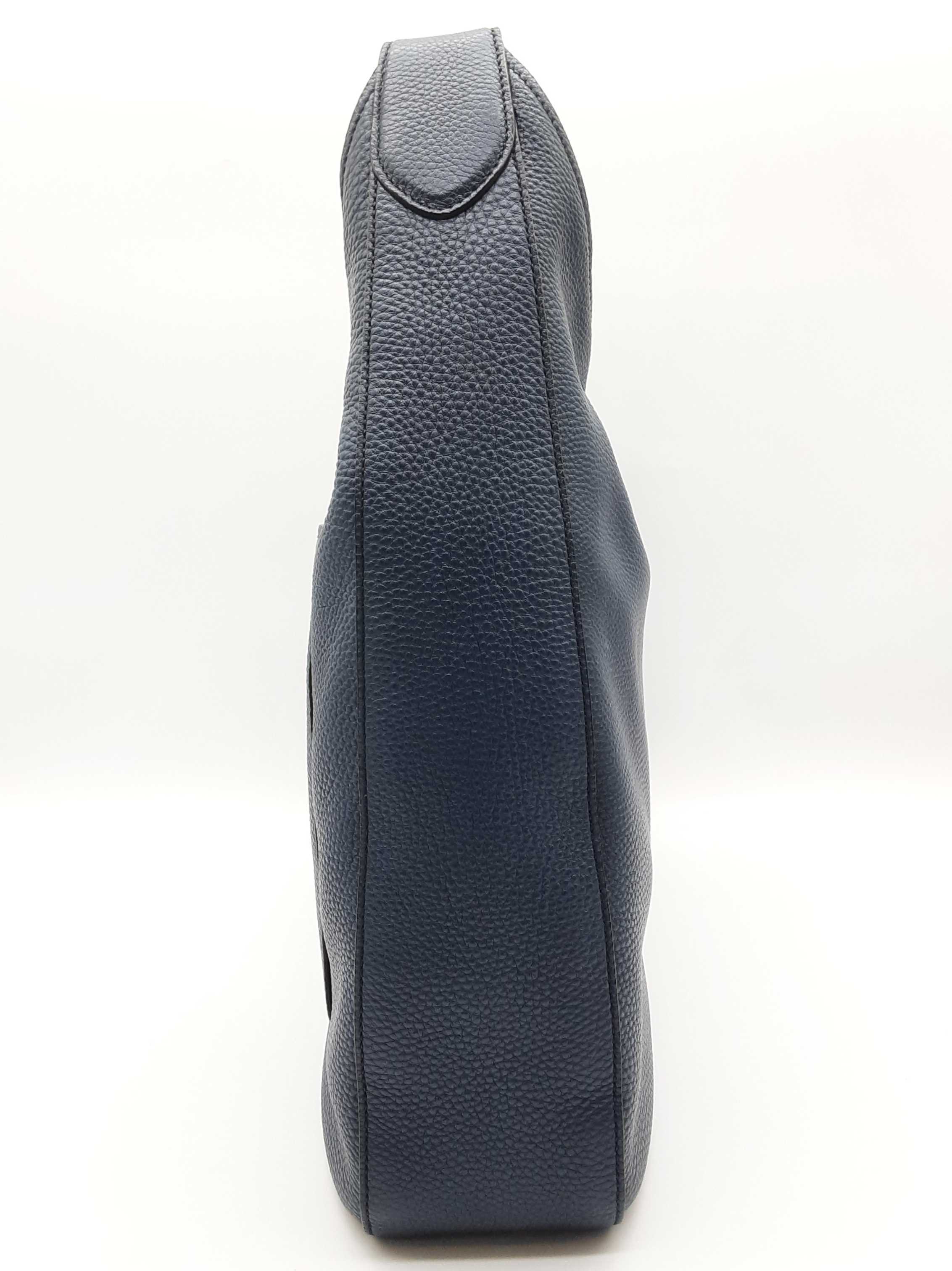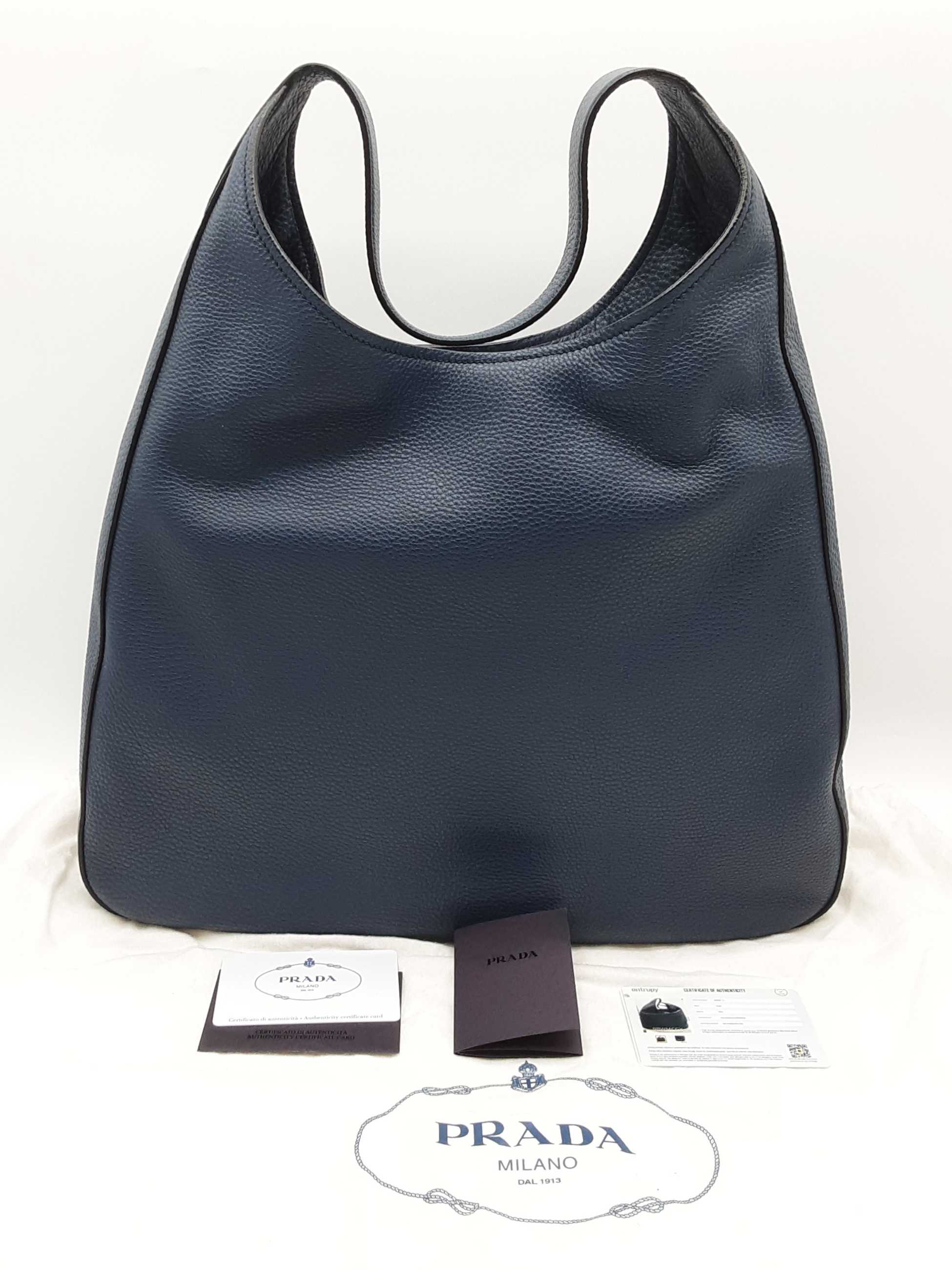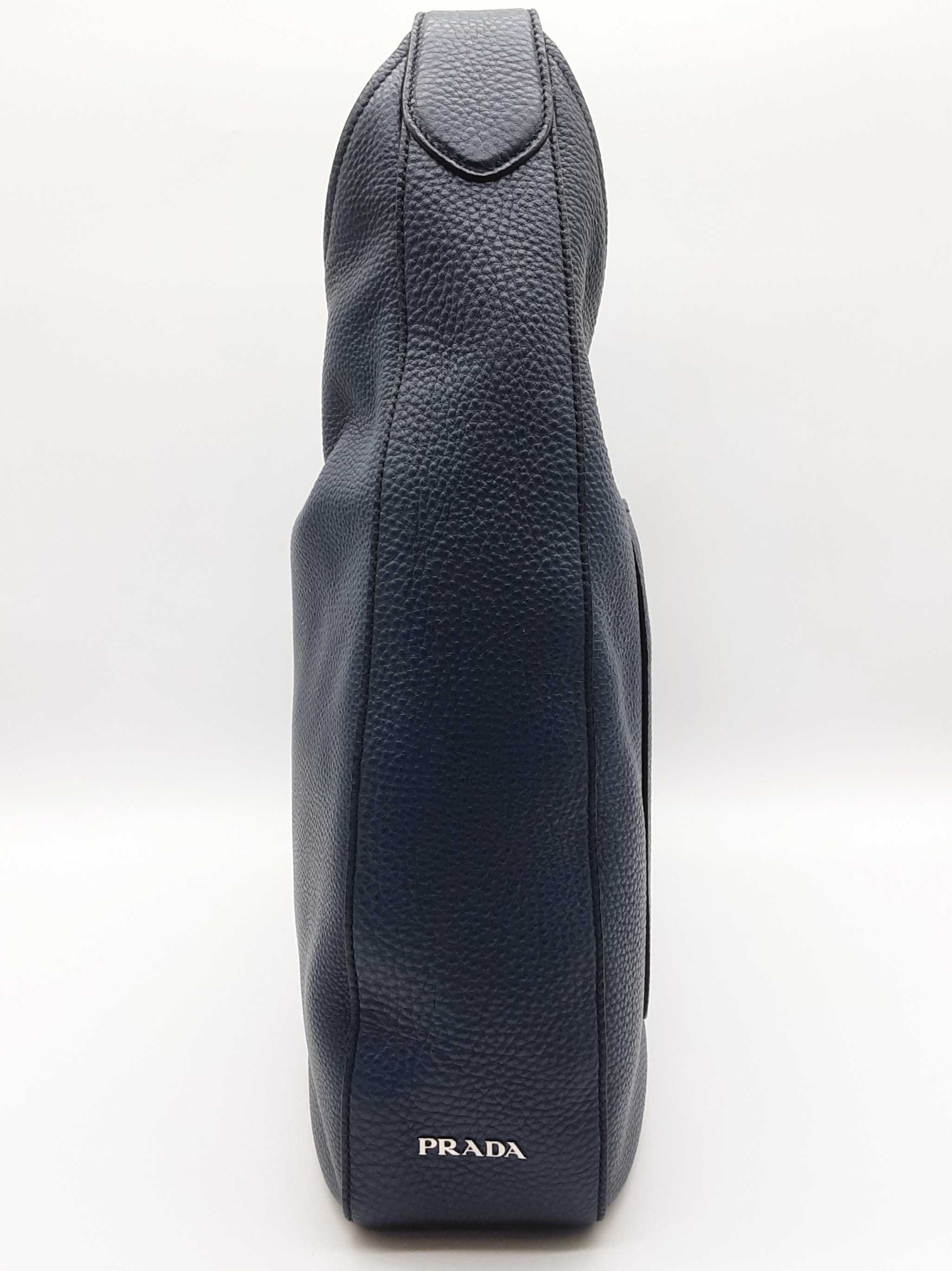 144020028971Prada Navy Blue Pebbled Leather Hobo Tote Bag. Length 15.5 IN X Height 12 IN X Width 3.5 IN X Drop 11 IN. Style #1BC009. Entrupy Certificate #9BWMCGX. Pre-owned - Good Condition with creases, cracking on edges, and marks on corners.