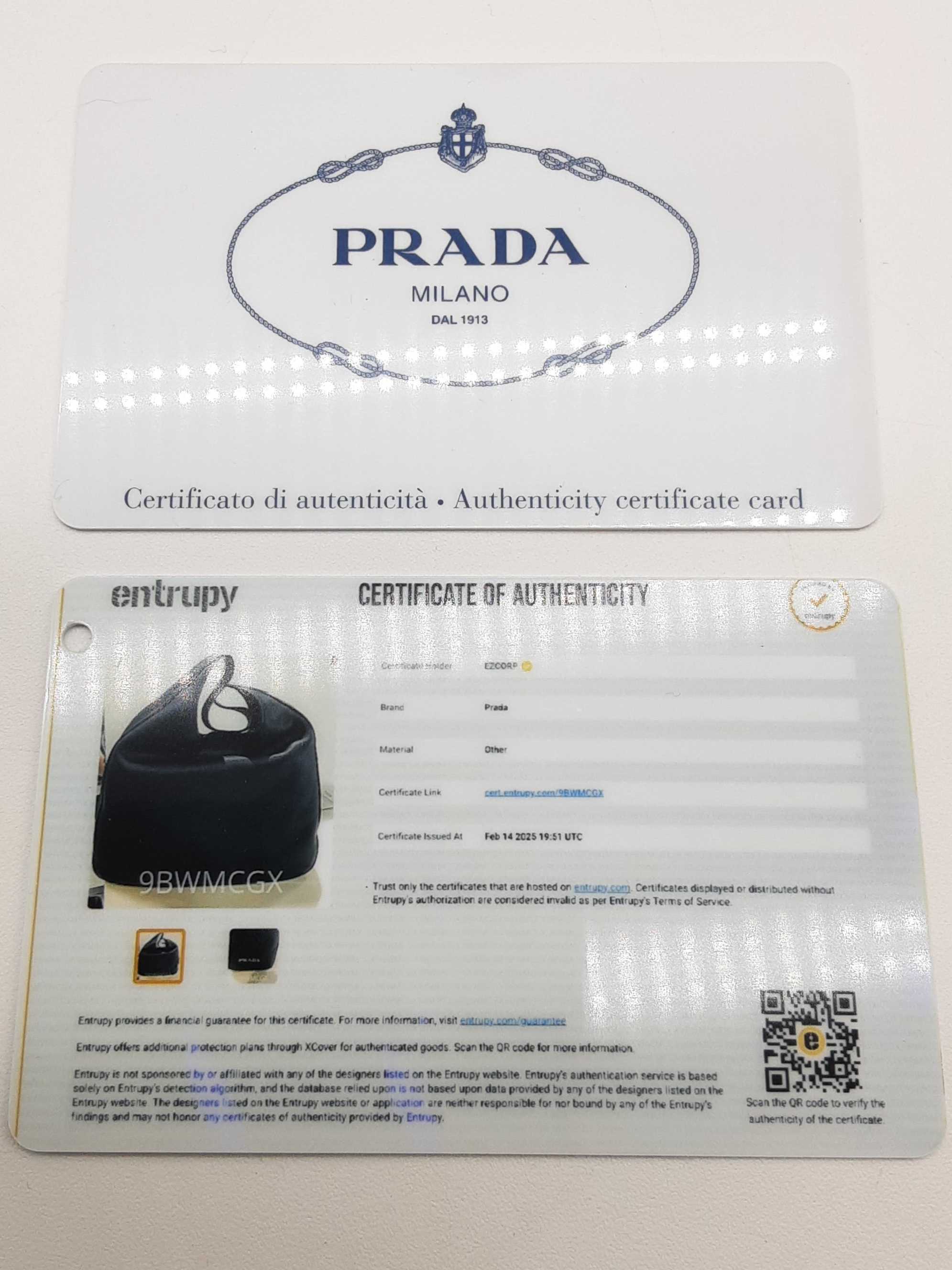 Entrupy Certificate Card, Prada Authenticity Certificate Card, Dust Bag, Information Booklet