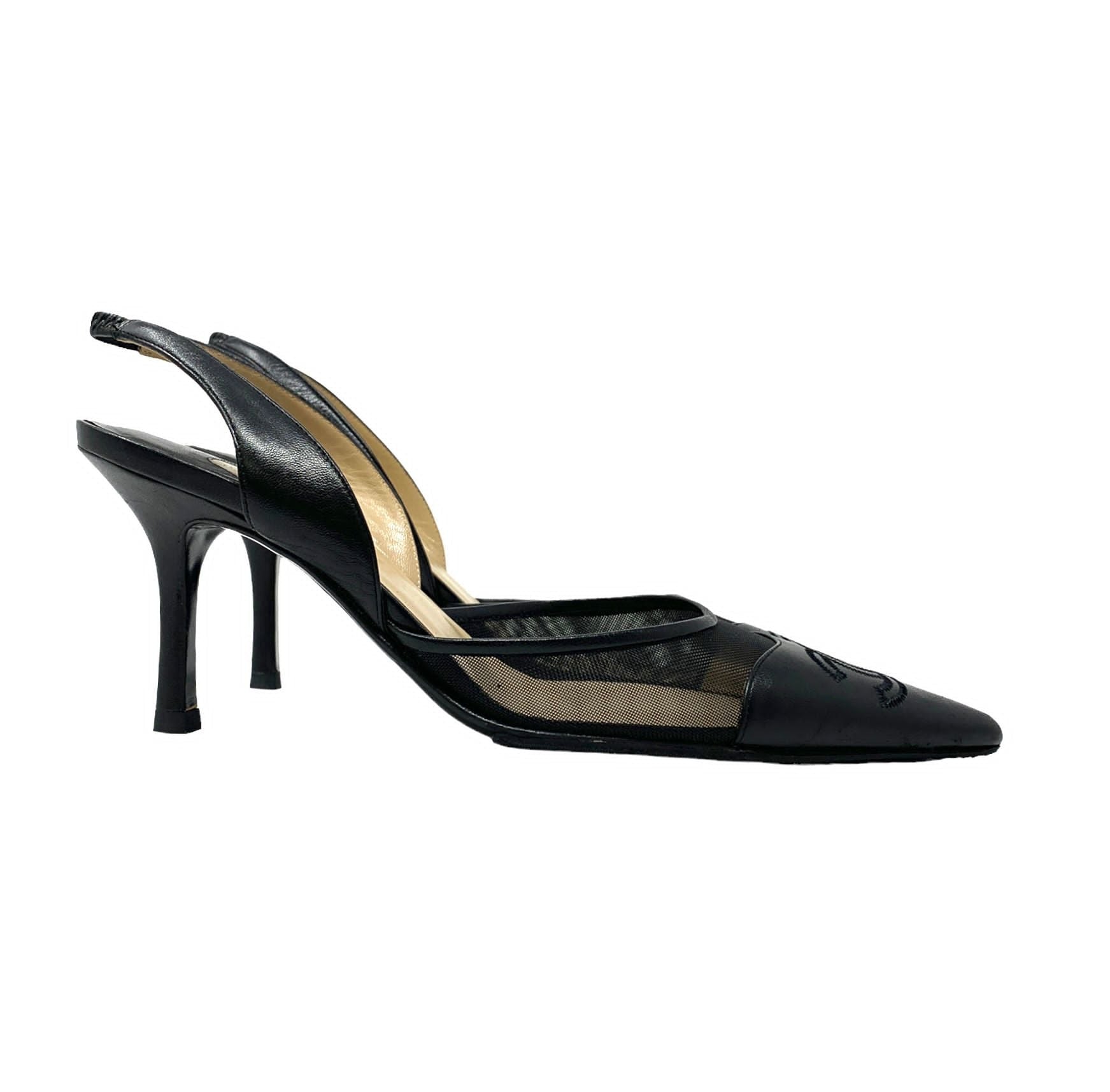 Chanel Black Mesh Logo Slingback Heels 37.5