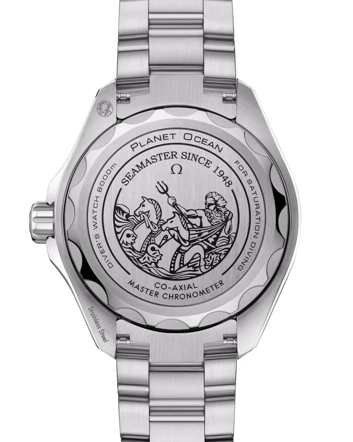 The caseback has a laser-engraved commemorative Seamaster logo depicting a trident-bearing Poseidon and two seahorses: OMEGA’s 1956 original and the brand’s current design. Behind which sits the OMEGA Co-Axial Master Chronometer calibre 8912.