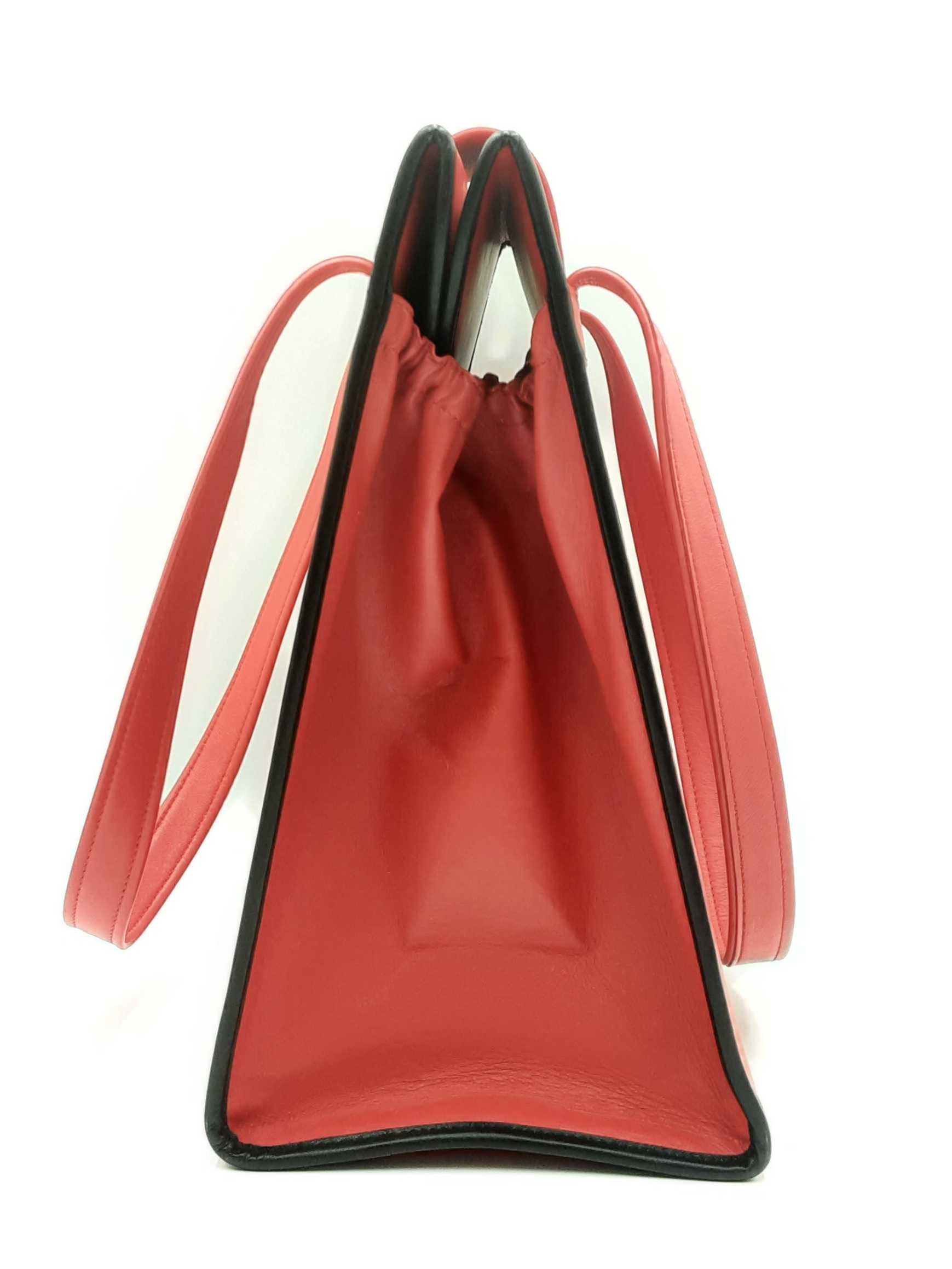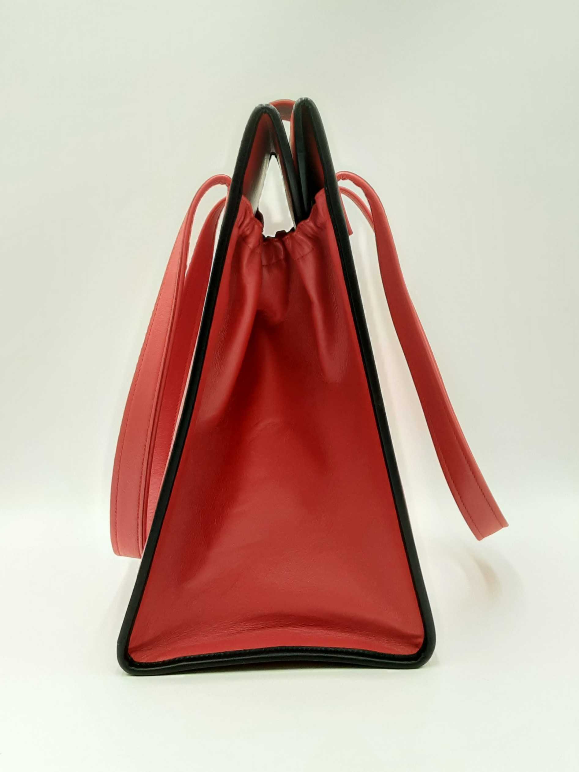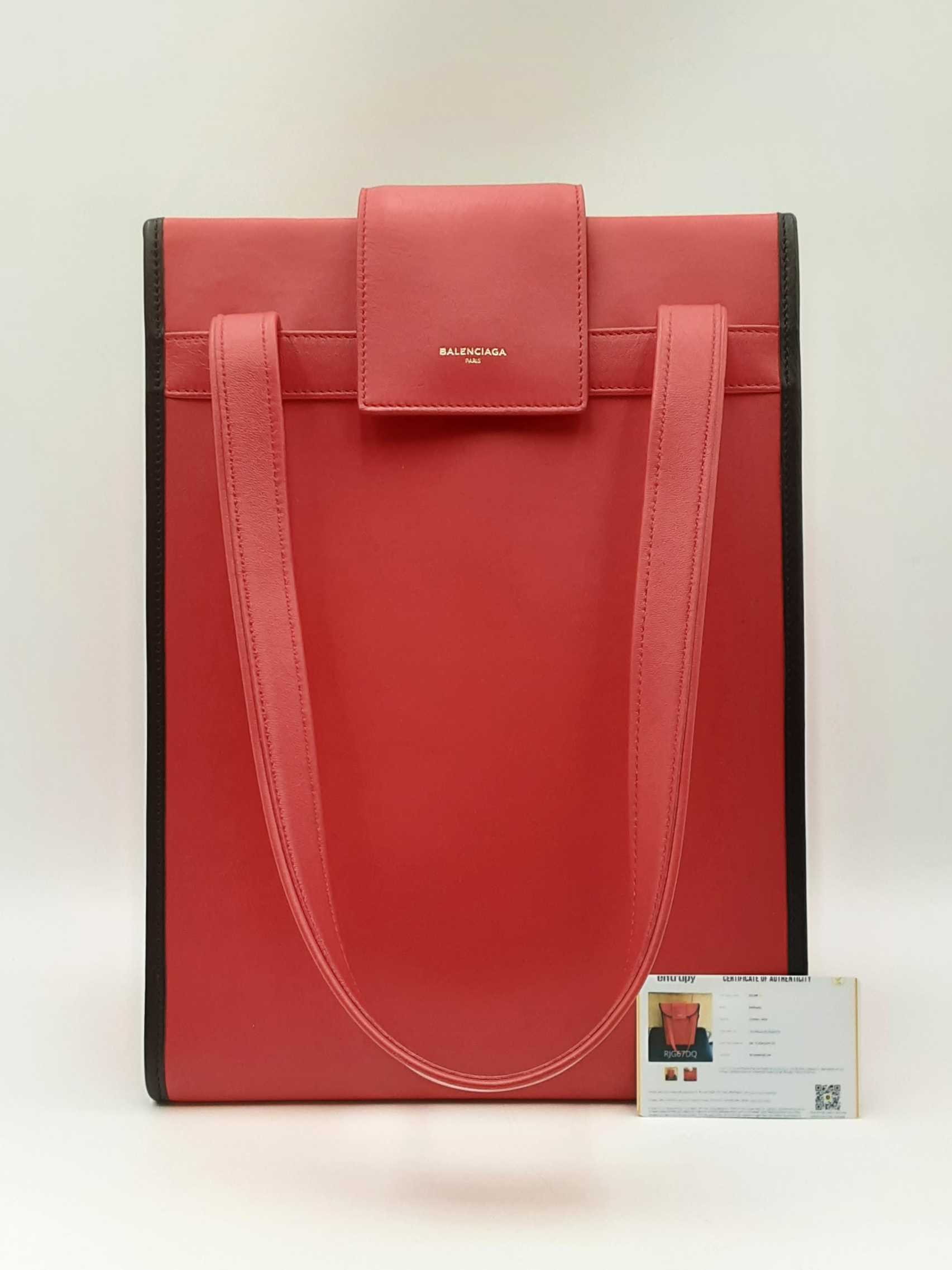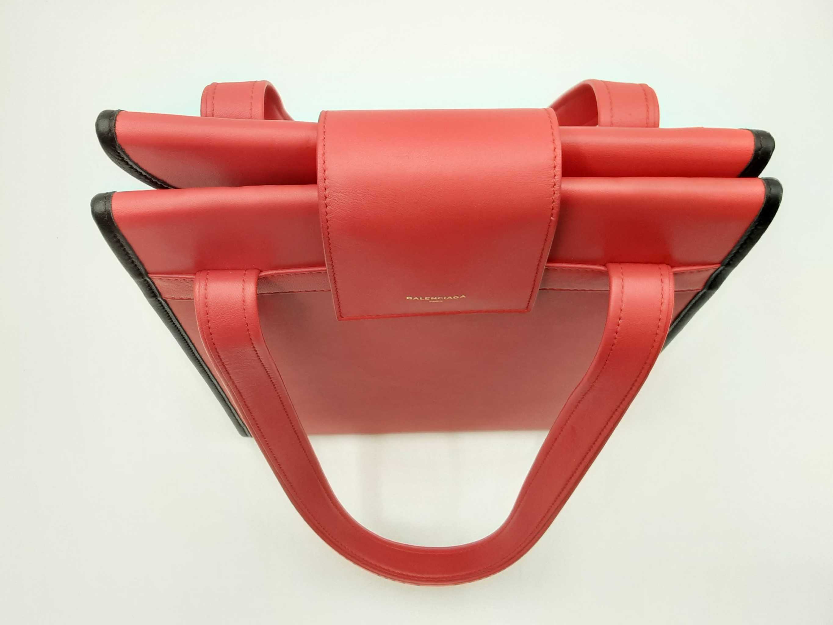 144030018757Balenciaga Agneau Classique Brillante Tote In Rouge Tango Leather. Height 14 X Length 14 X Base Width 7.5 X Strap Drop 10.5 inches, approximately. Great Pre-Owned Condition. Scratches on all bottom feet. Wear on all bottom corners. Creasing, scuffs, and small discolorations throughout leather. Entrupy Certificate # RJG67DQ