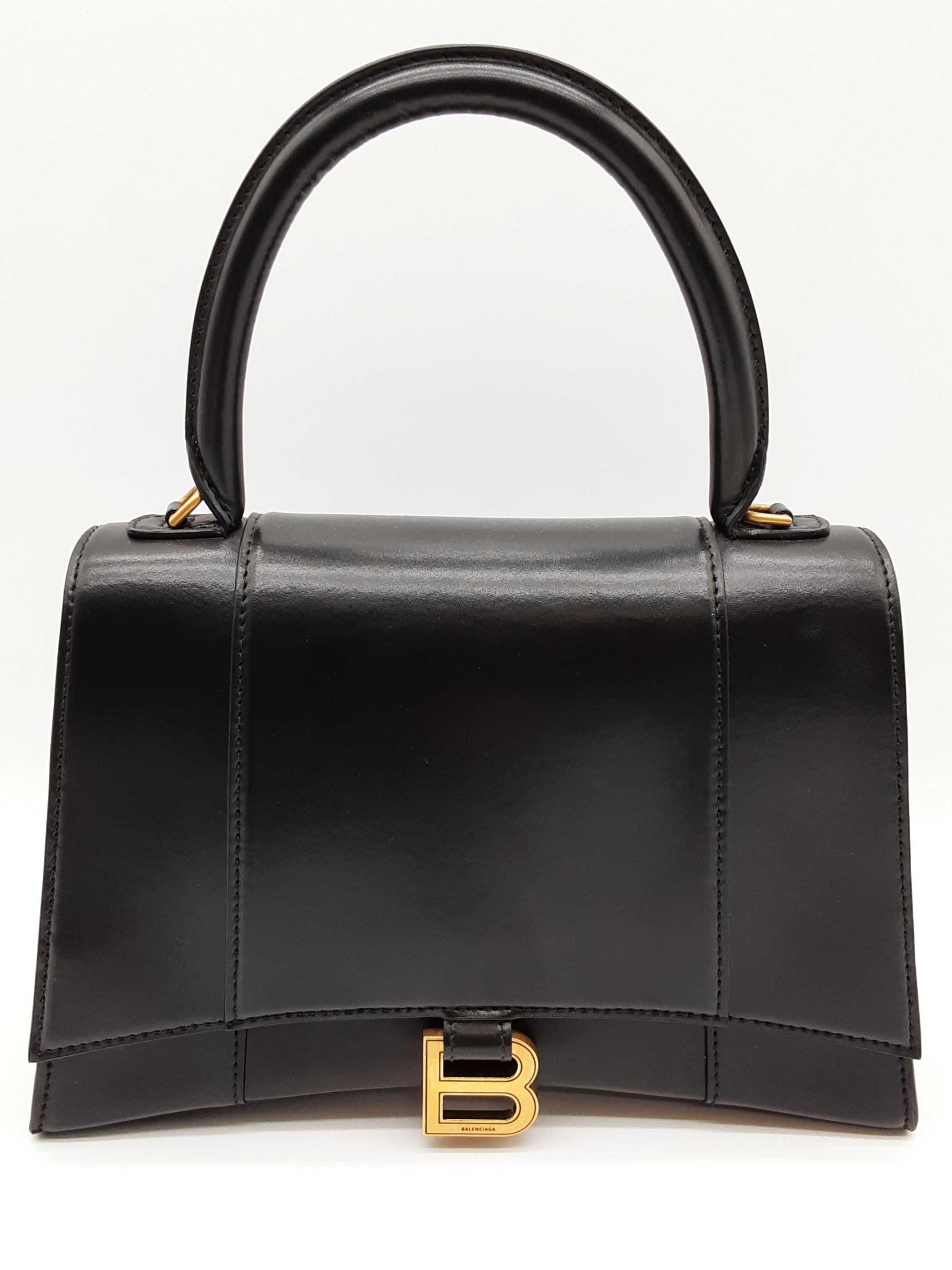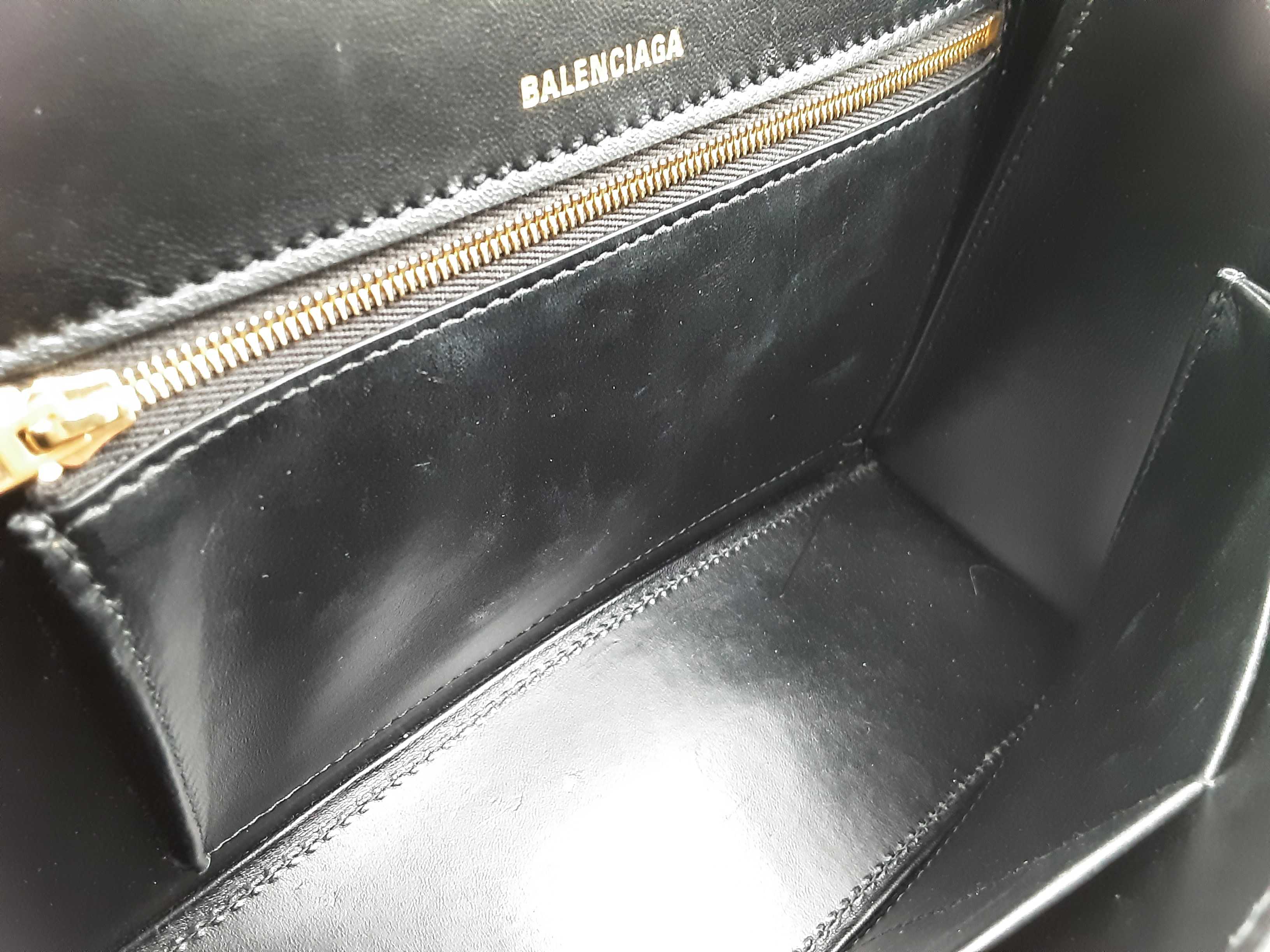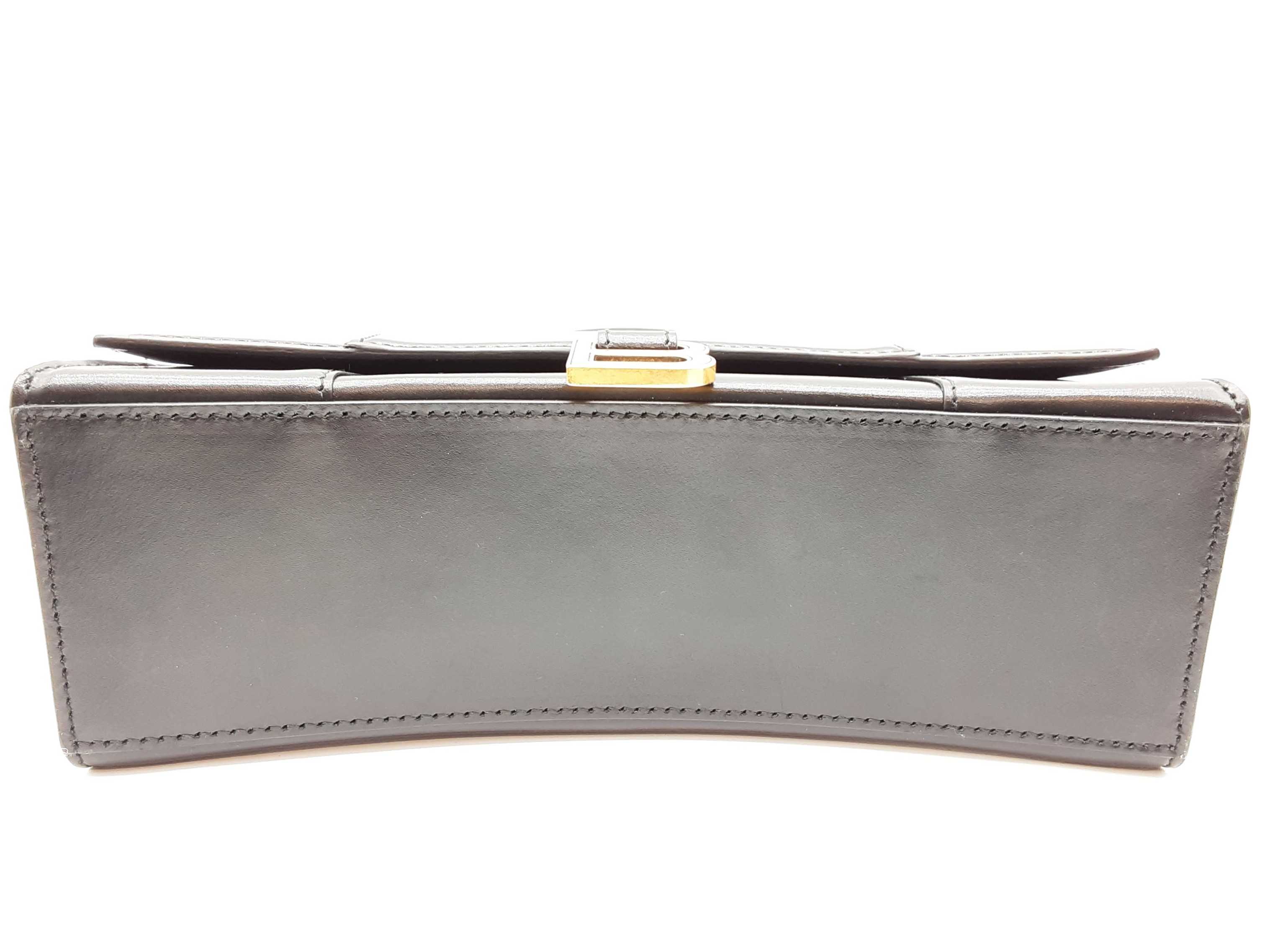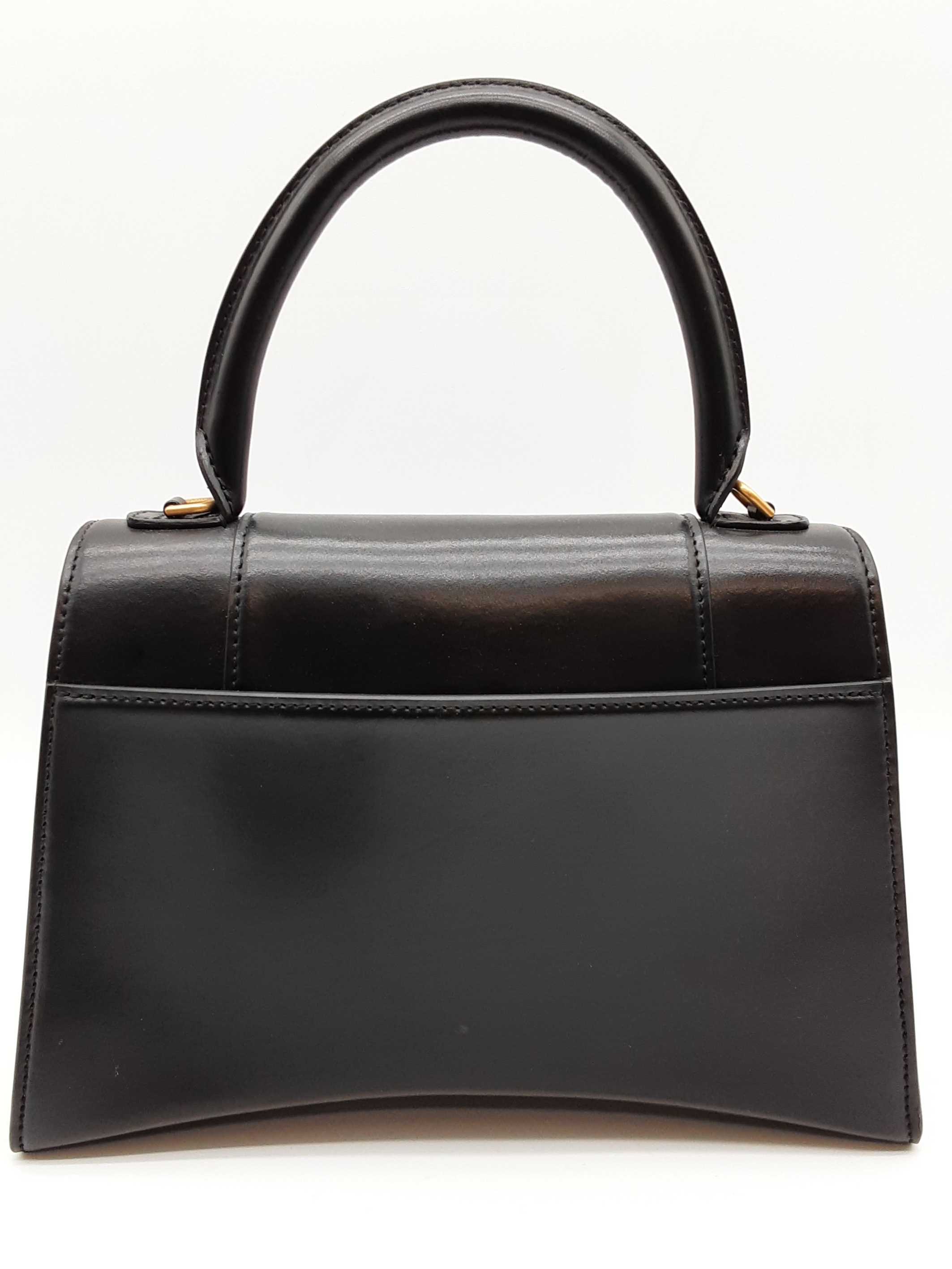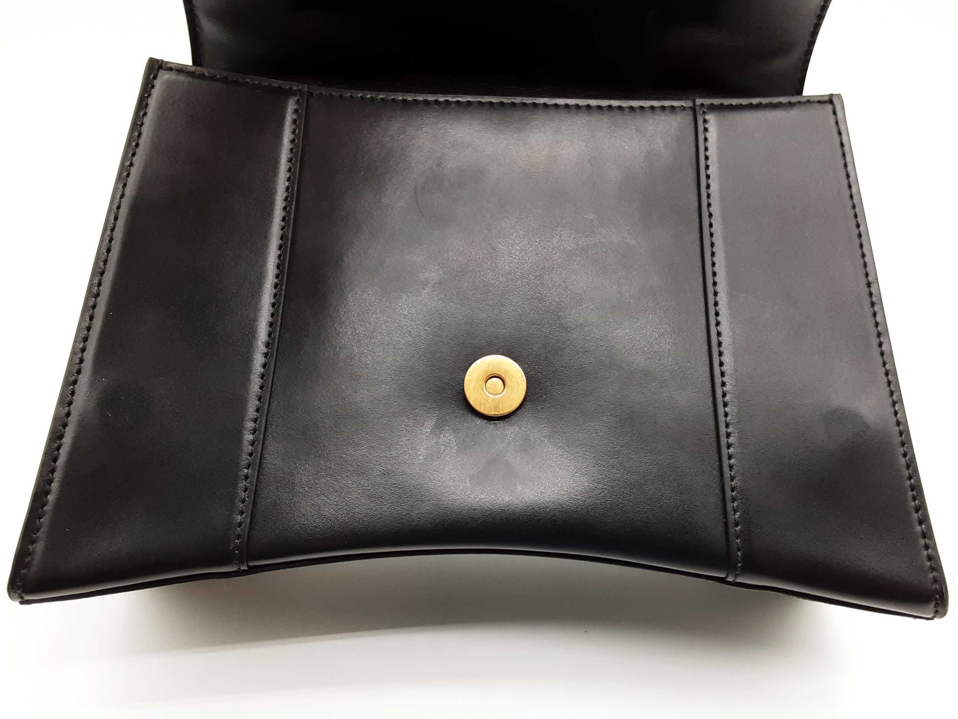 144020027372Balenciaga Hourglass Black Leather Handbag. Length 10.75 IN X Height 7.25 IN X Width 4 IN X Handle Drop 4 IN. Entrupy Certificate #X3897HH. Good Pre-owned Condition with white marks under flap and interior, scratches, back flat pocket curved out, and wear on metal hardware and scratches on exterior, under flap, interior and in interior pocket.