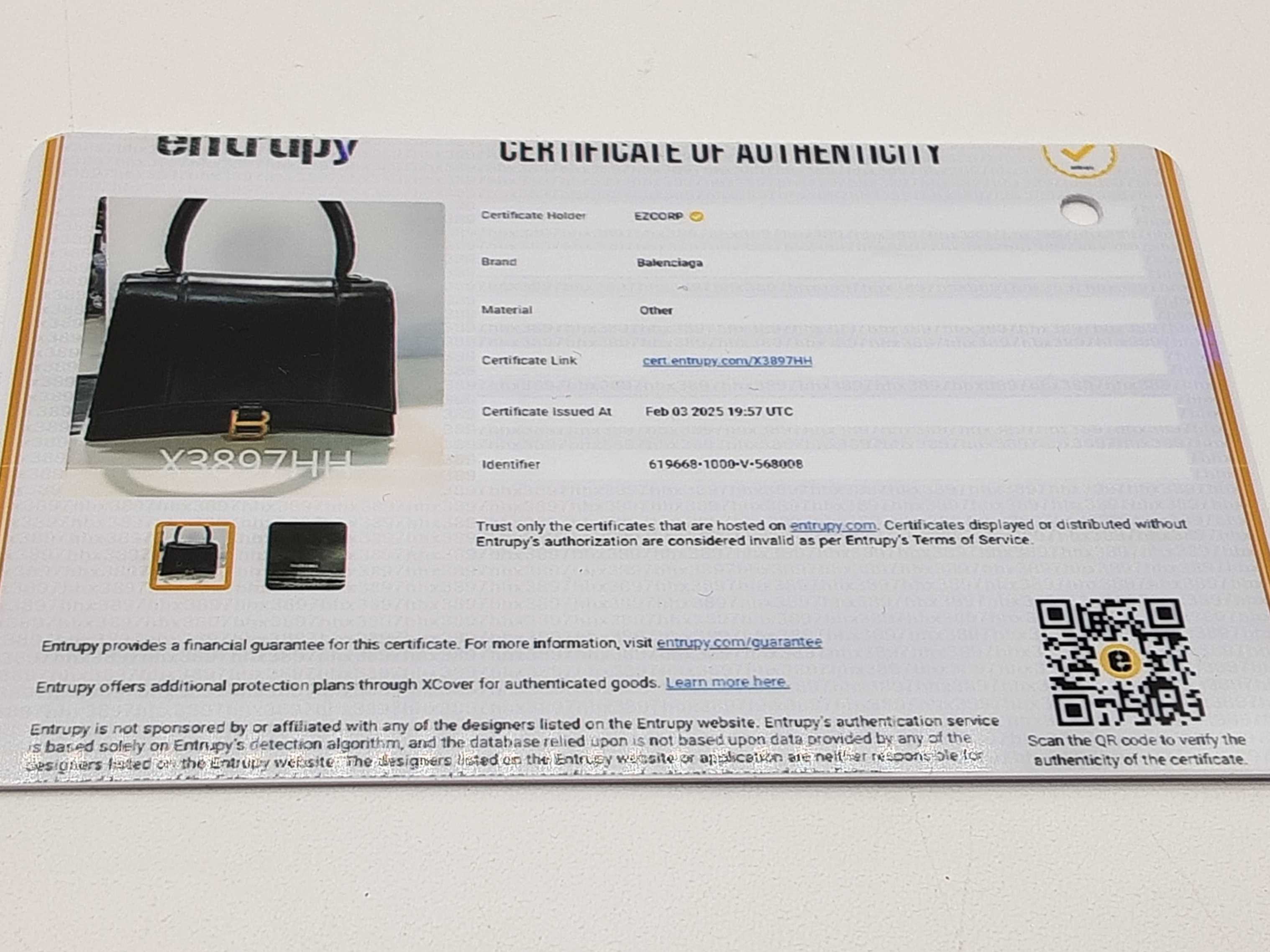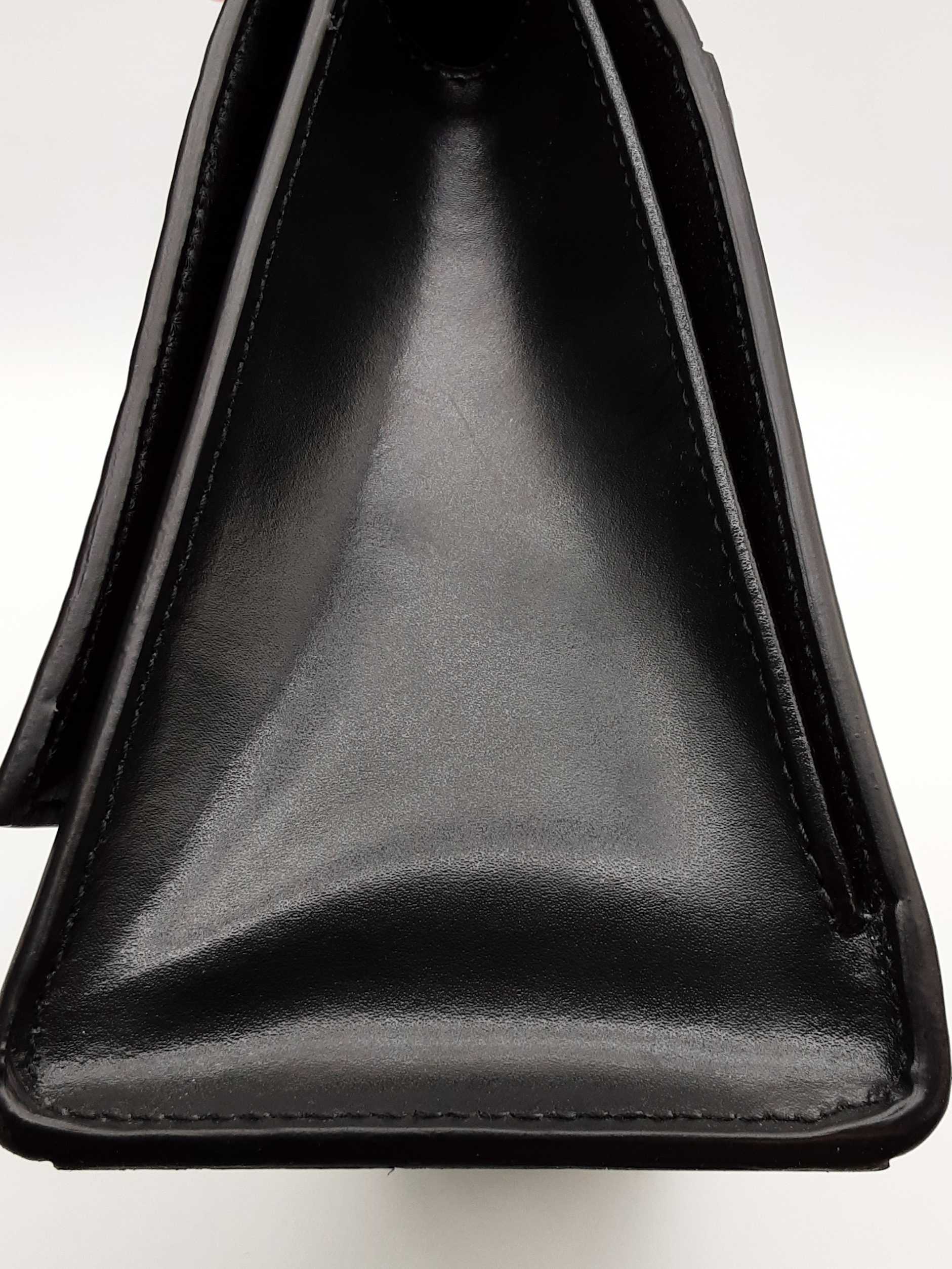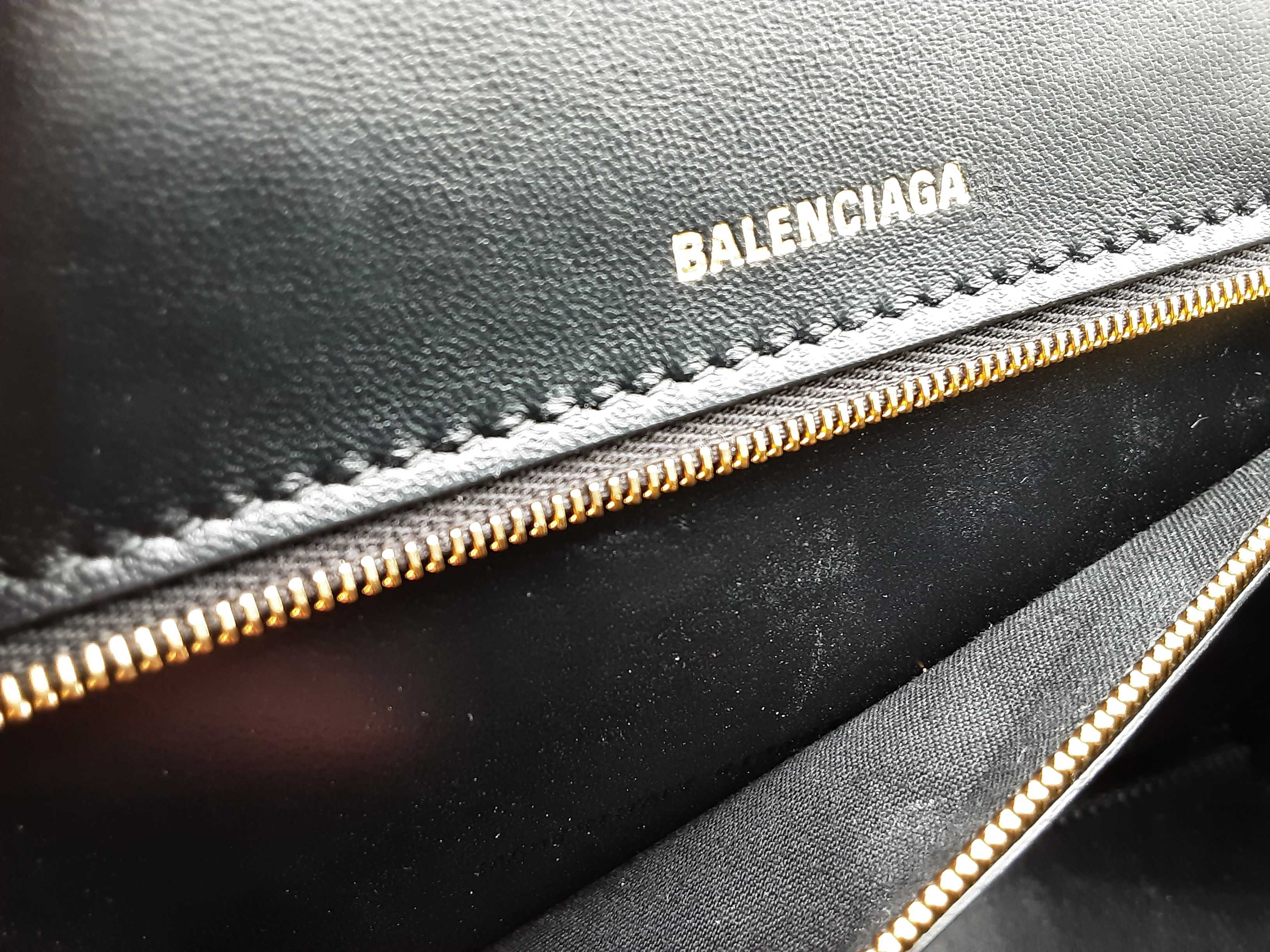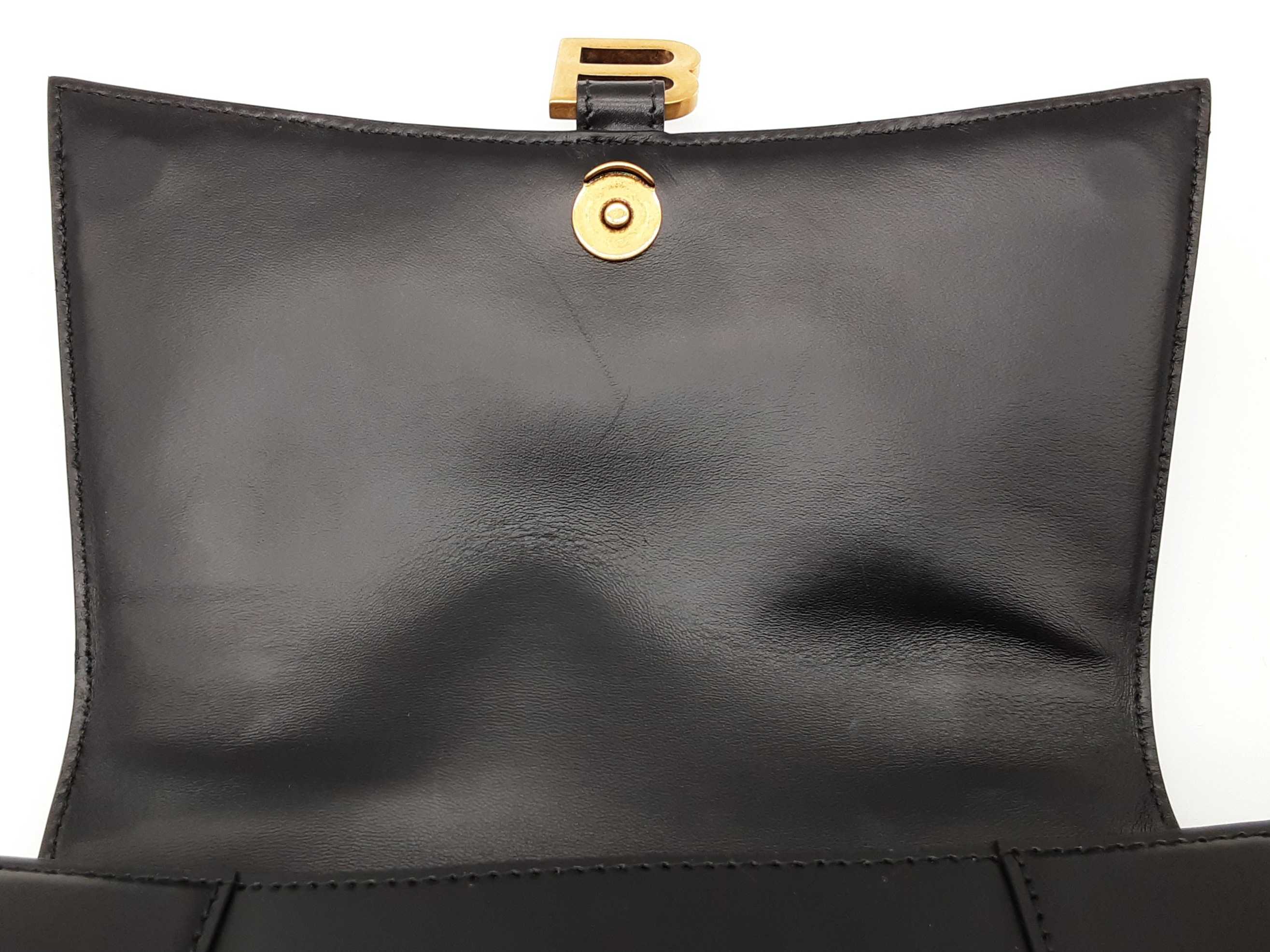 144020027372Balenciaga Hourglass Black Leather Handbag. Length 10.75 IN X Height 7.25 IN X Width 4 IN X Handle Drop 4 IN. Entrupy Certificate #X3897HH. Good Pre-owned Condition with white marks under flap and interior, scratches, back flat pocket curved out, and wear on metal hardware and scratches on exterior, under flap, interior and in interior pocket.