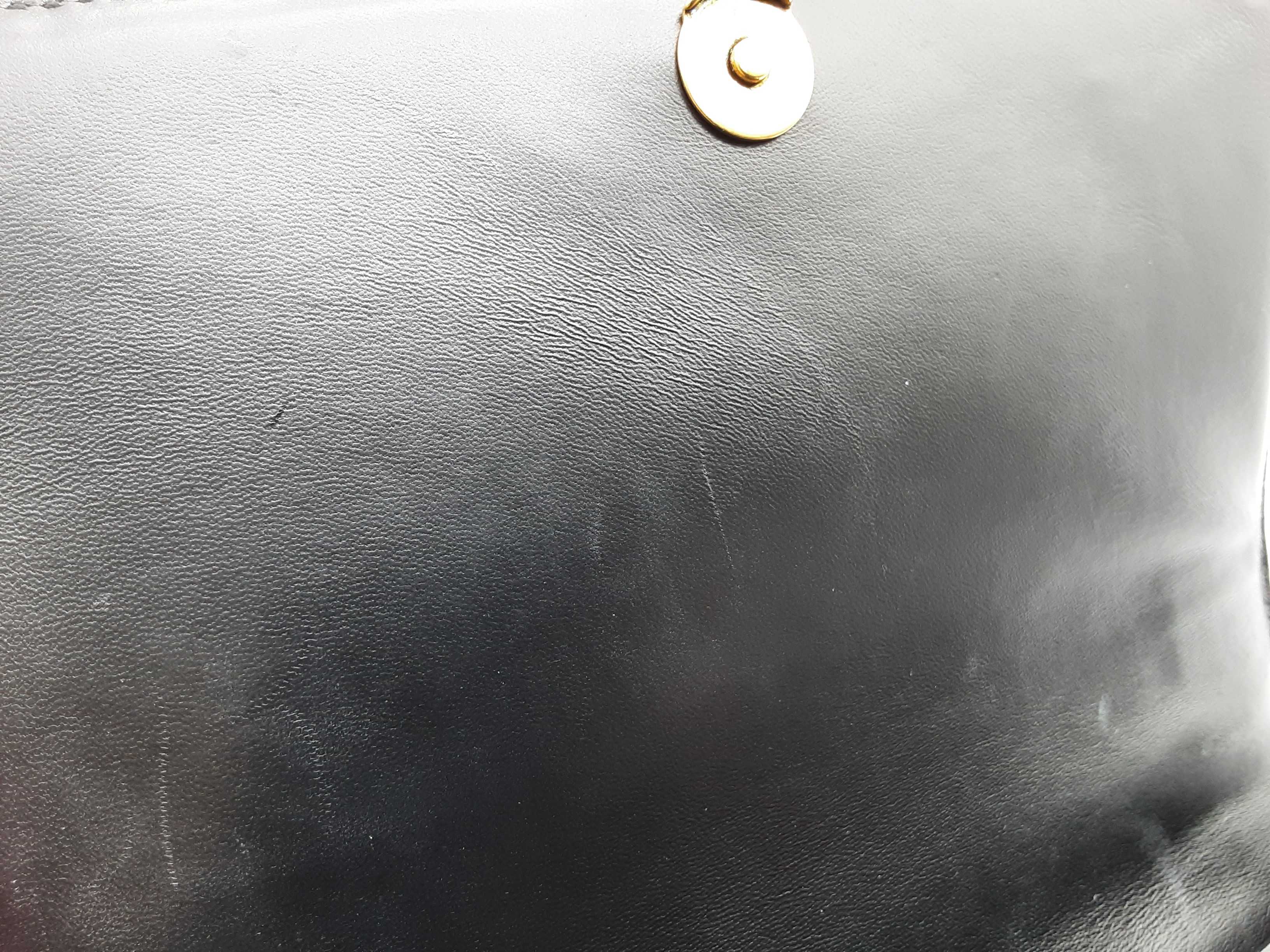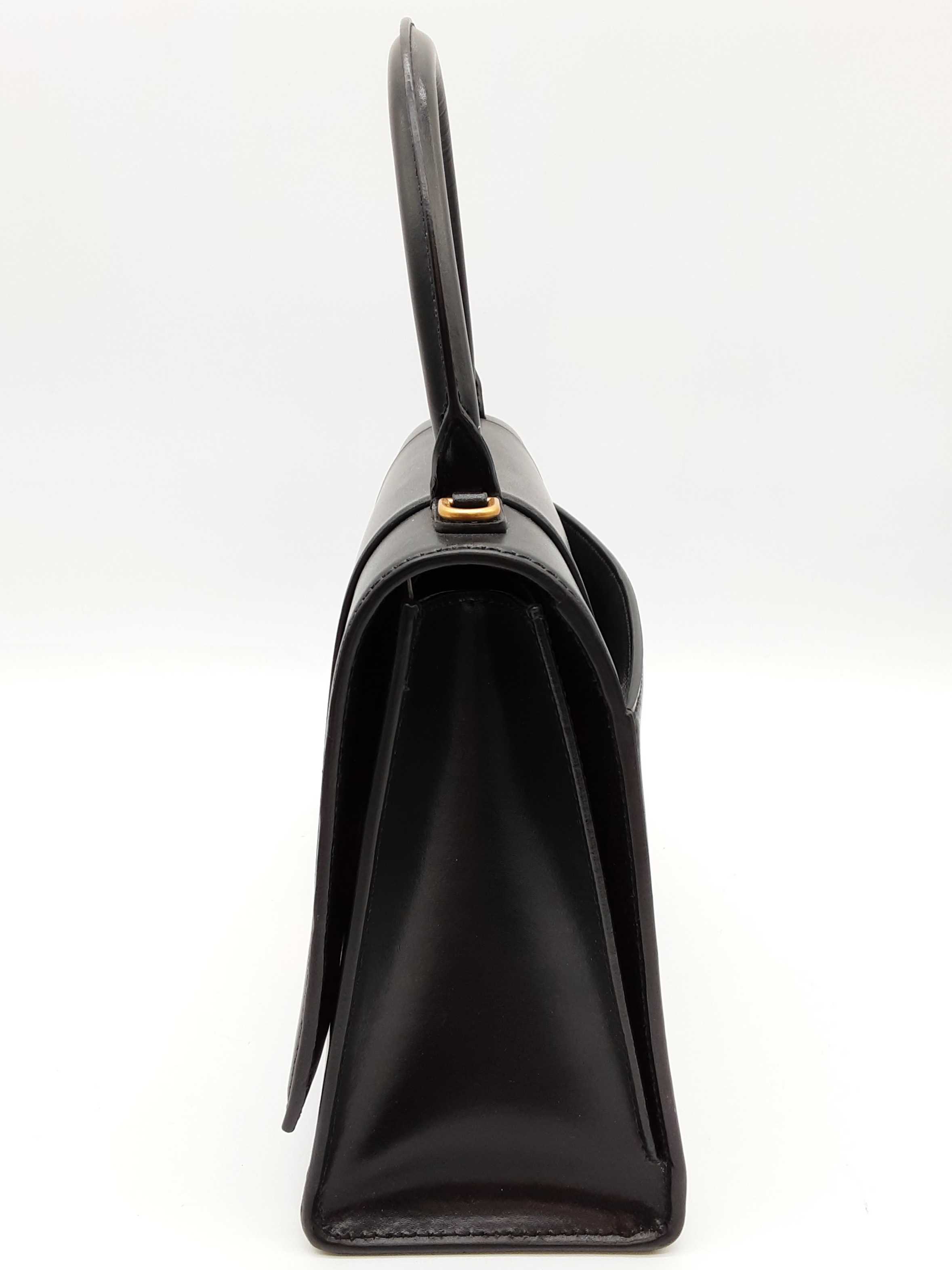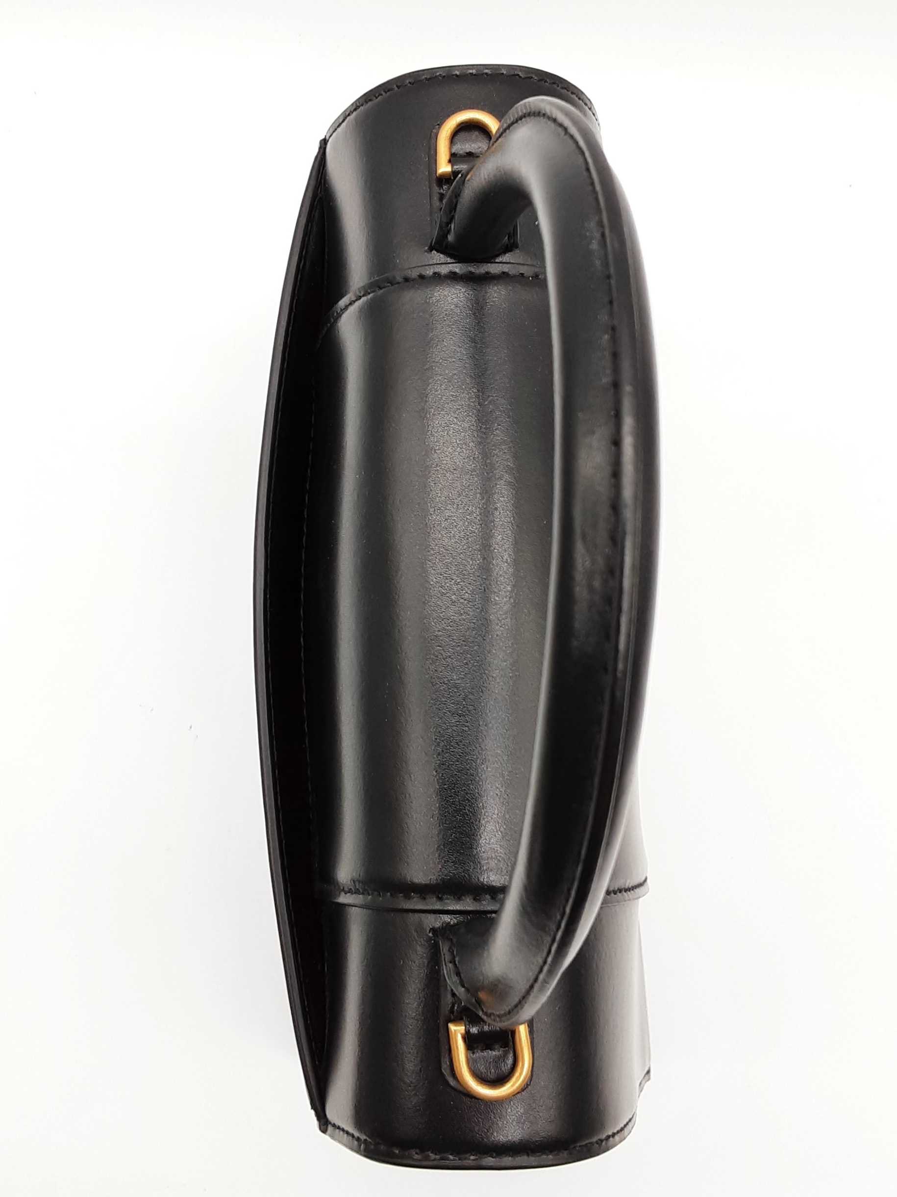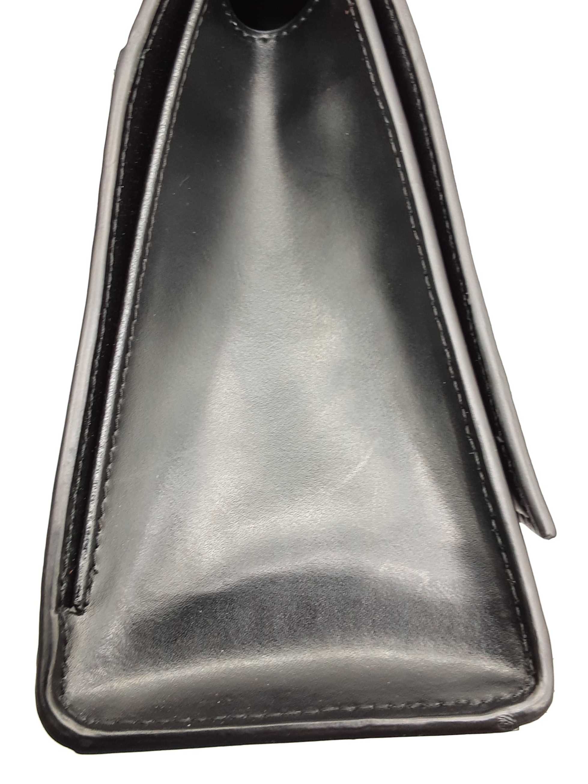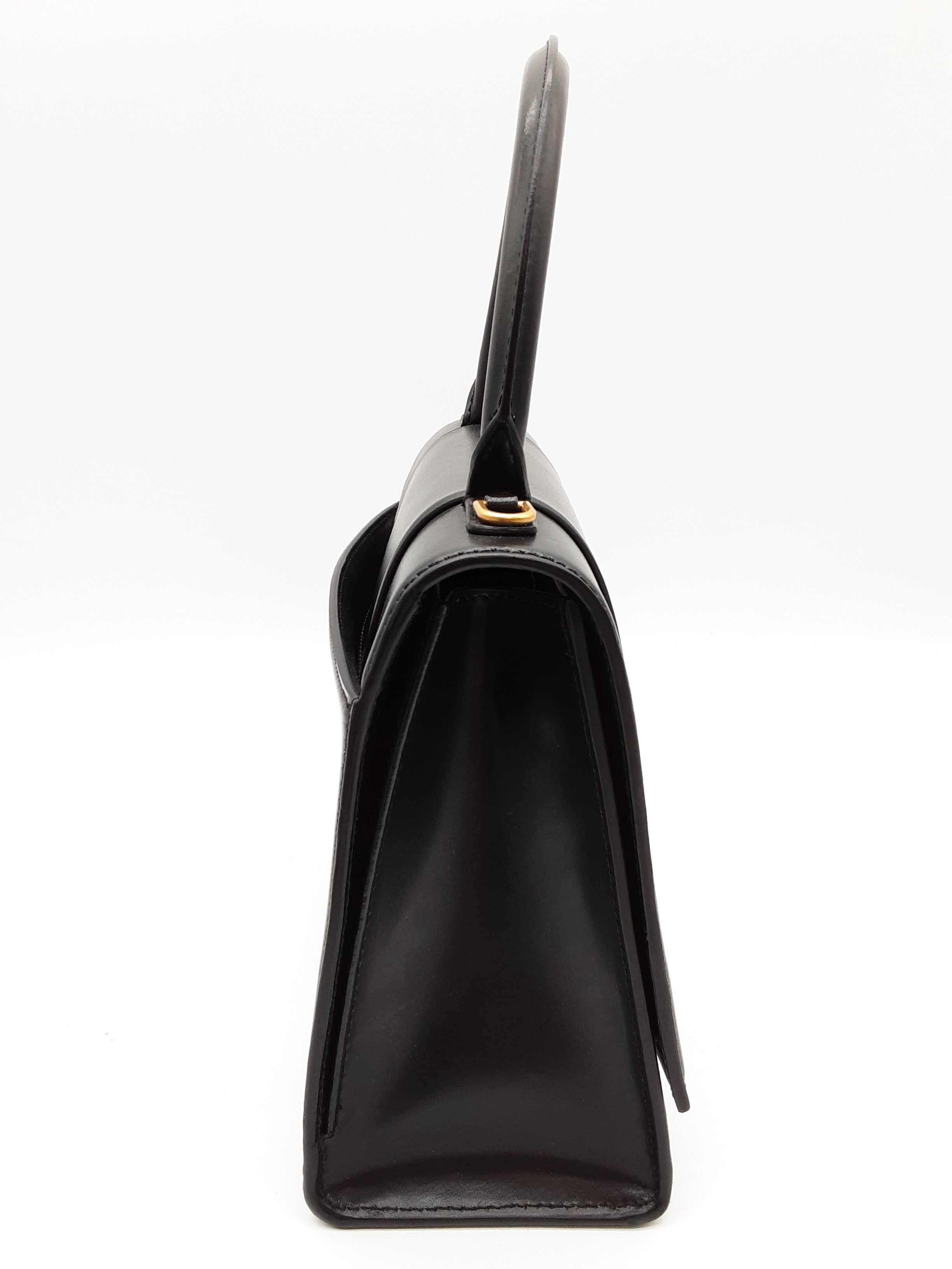 144020027372Balenciaga Hourglass Black Leather Handbag. Length 10.75 IN X Height 7.25 IN X Width 4 IN X Handle Drop 4 IN. Entrupy Certificate #X3897HH. Good Pre-owned Condition with white marks under flap and interior, scratches, back flat pocket curved out, and wear on metal hardware and scratches on exterior, under flap, interior and in interior pocket.