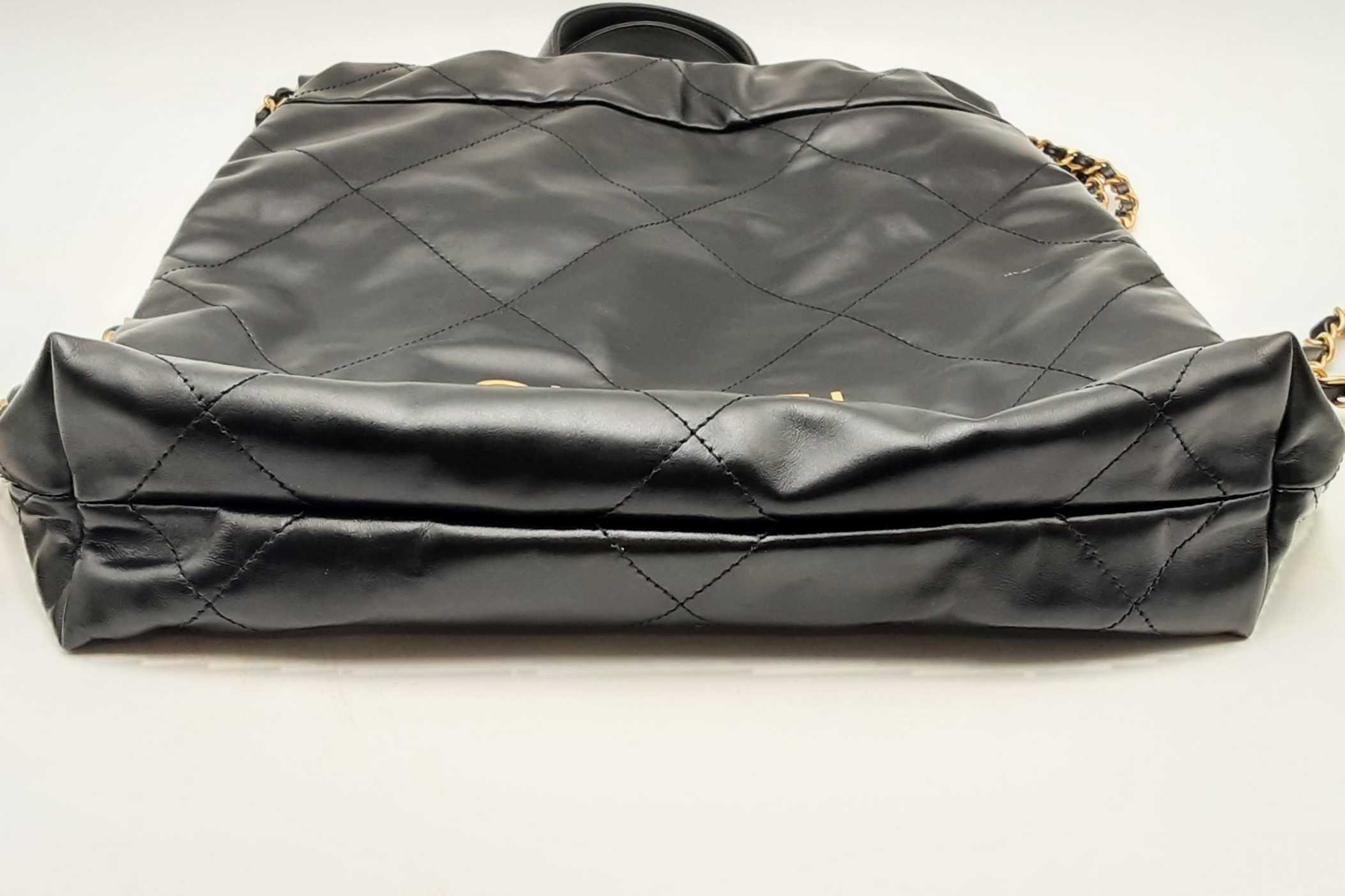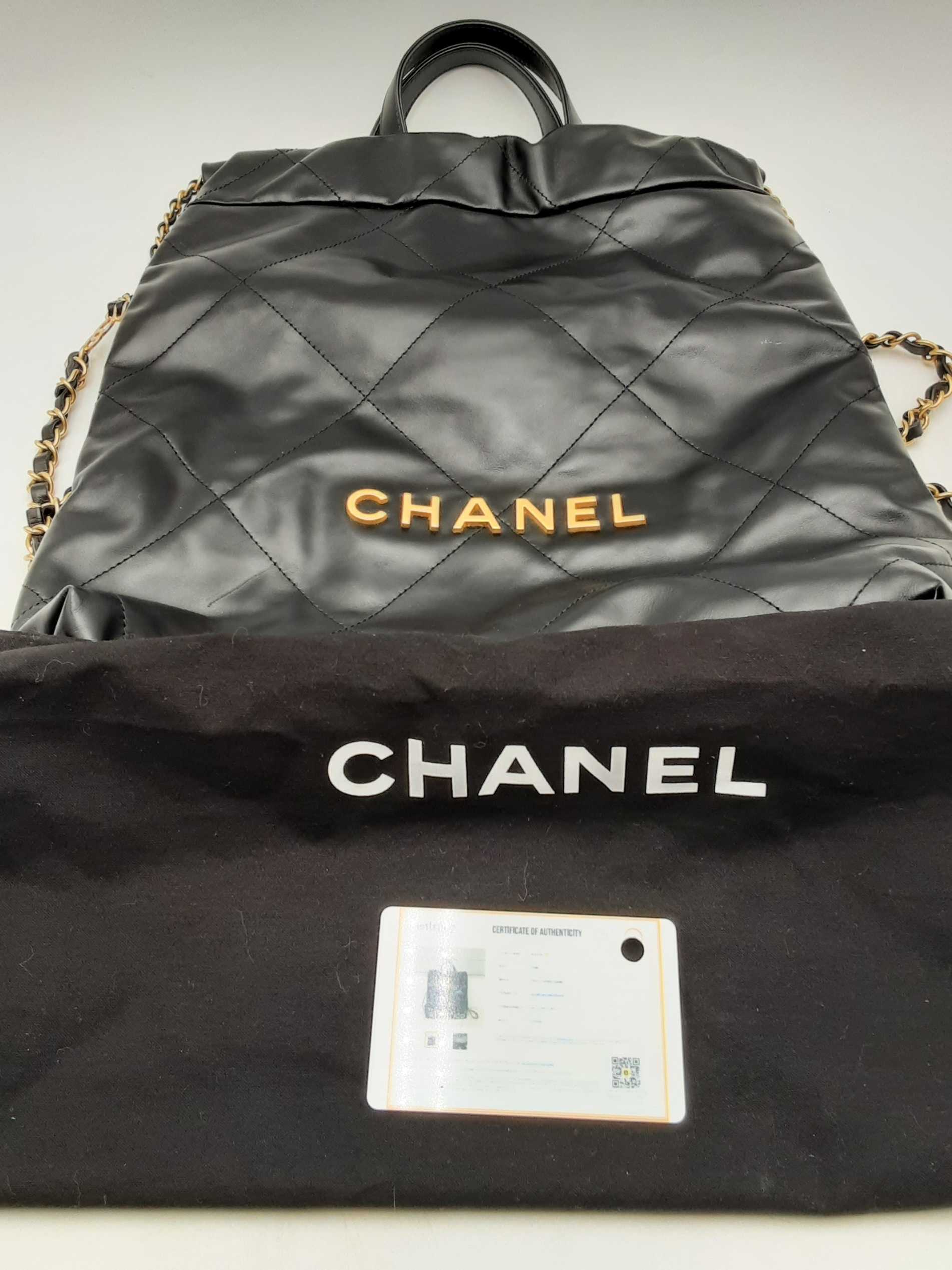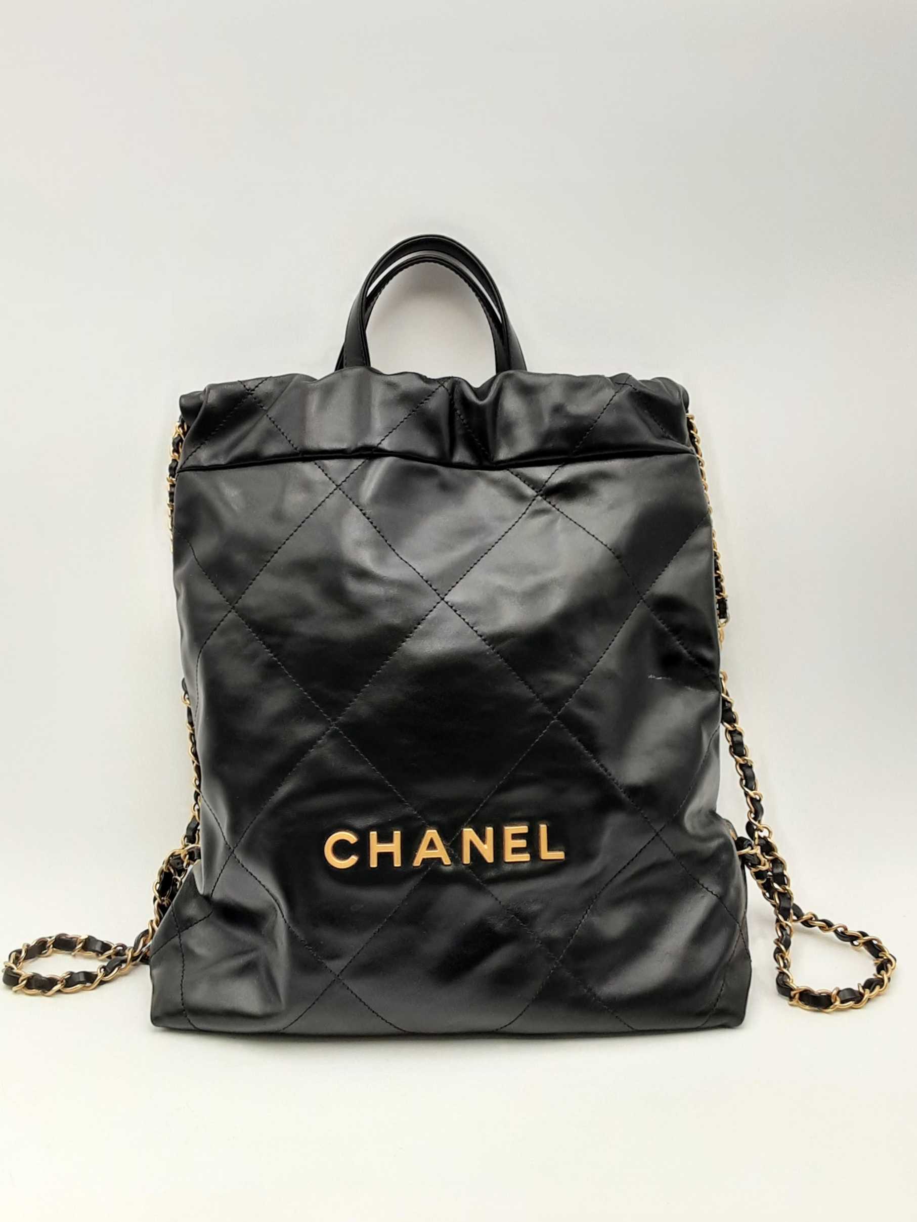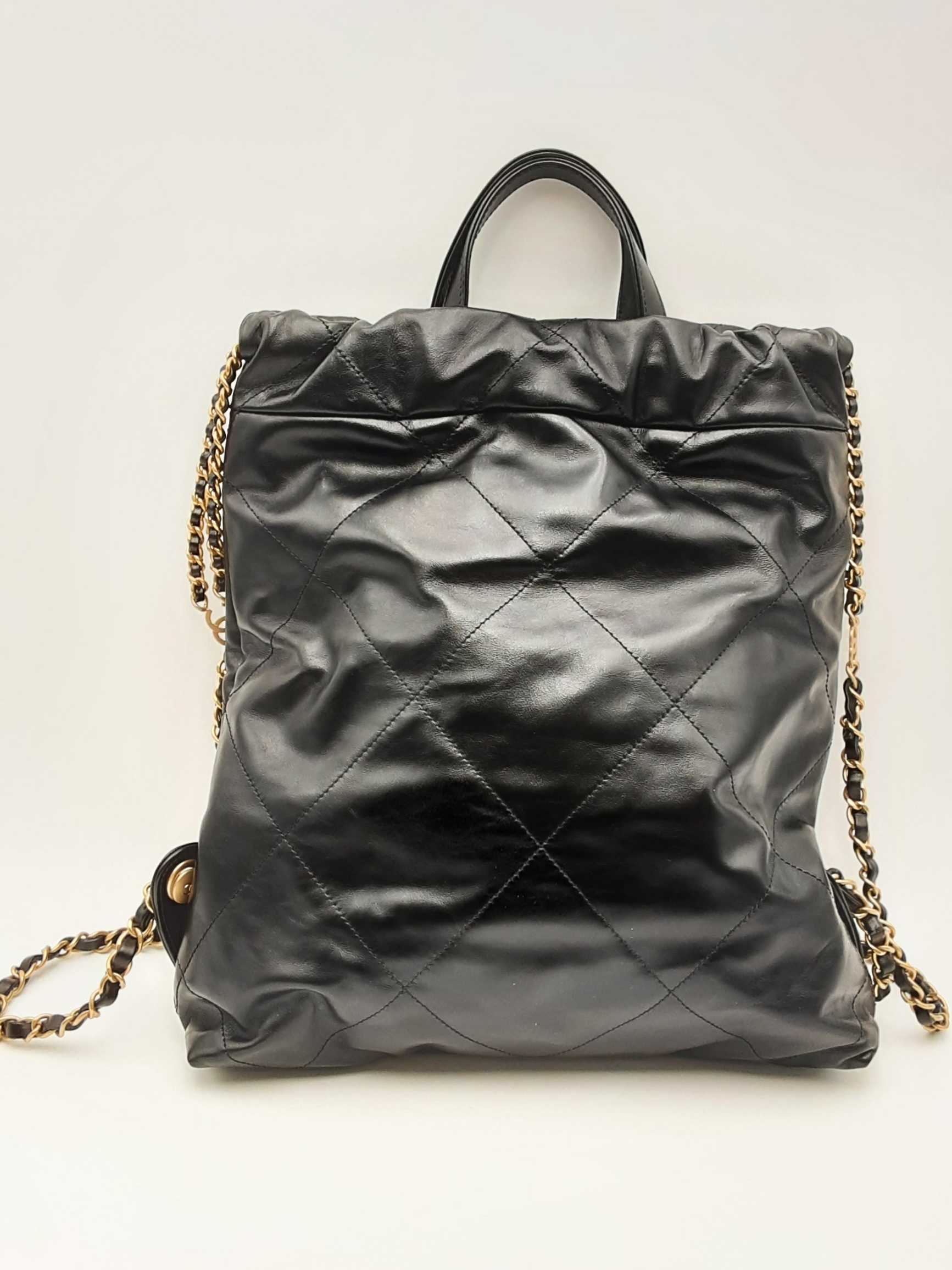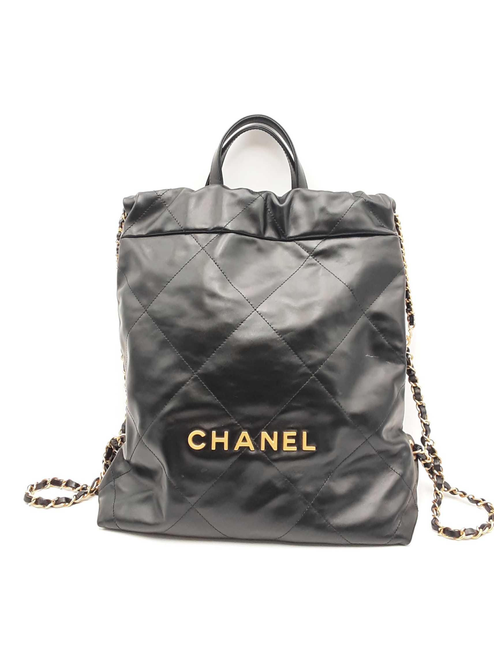 144010053474Chanel 22 Black Quilted Leather Backpack. Gold-Tone Hardware. Approximate measurements: Height 13 IN X Length 11 IN X Width 3 IN. Great Pre-Owned Condition. Scratches on hardware. Wear on bottom corners. Scratches and some spots on the exterior. White marks on the exterior. Dust and debris inside. Entrupy Certificate #8DVJQ9R