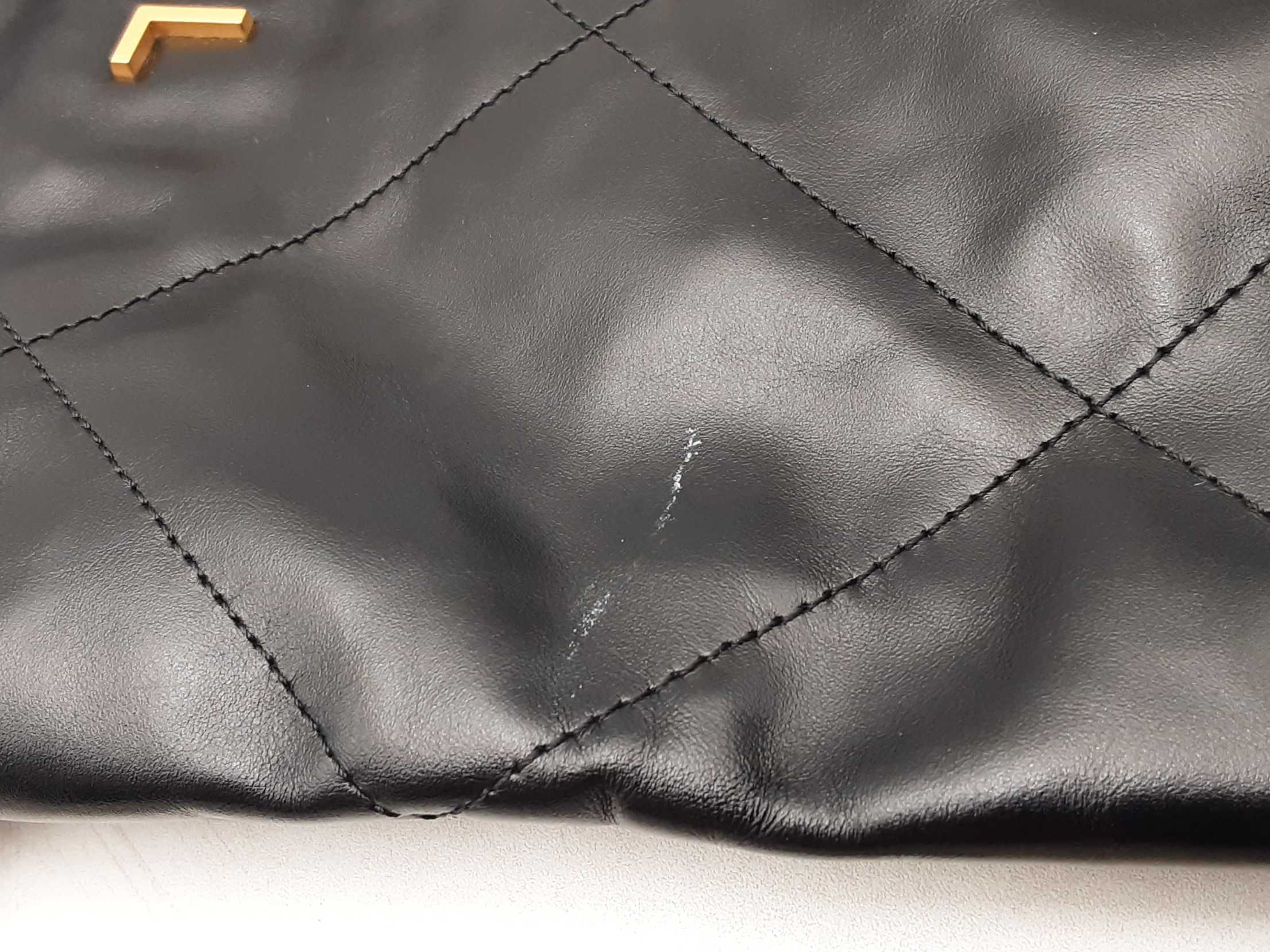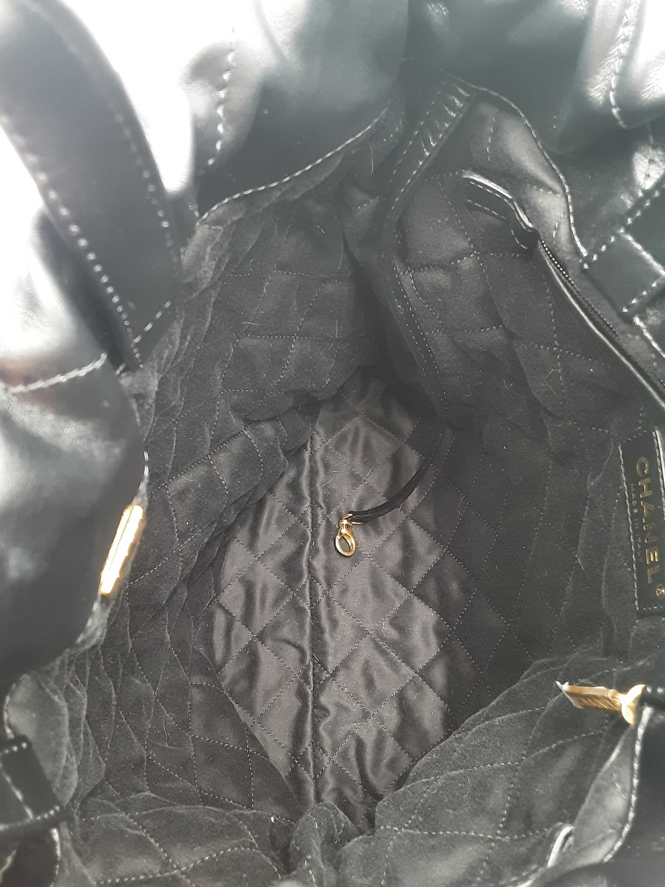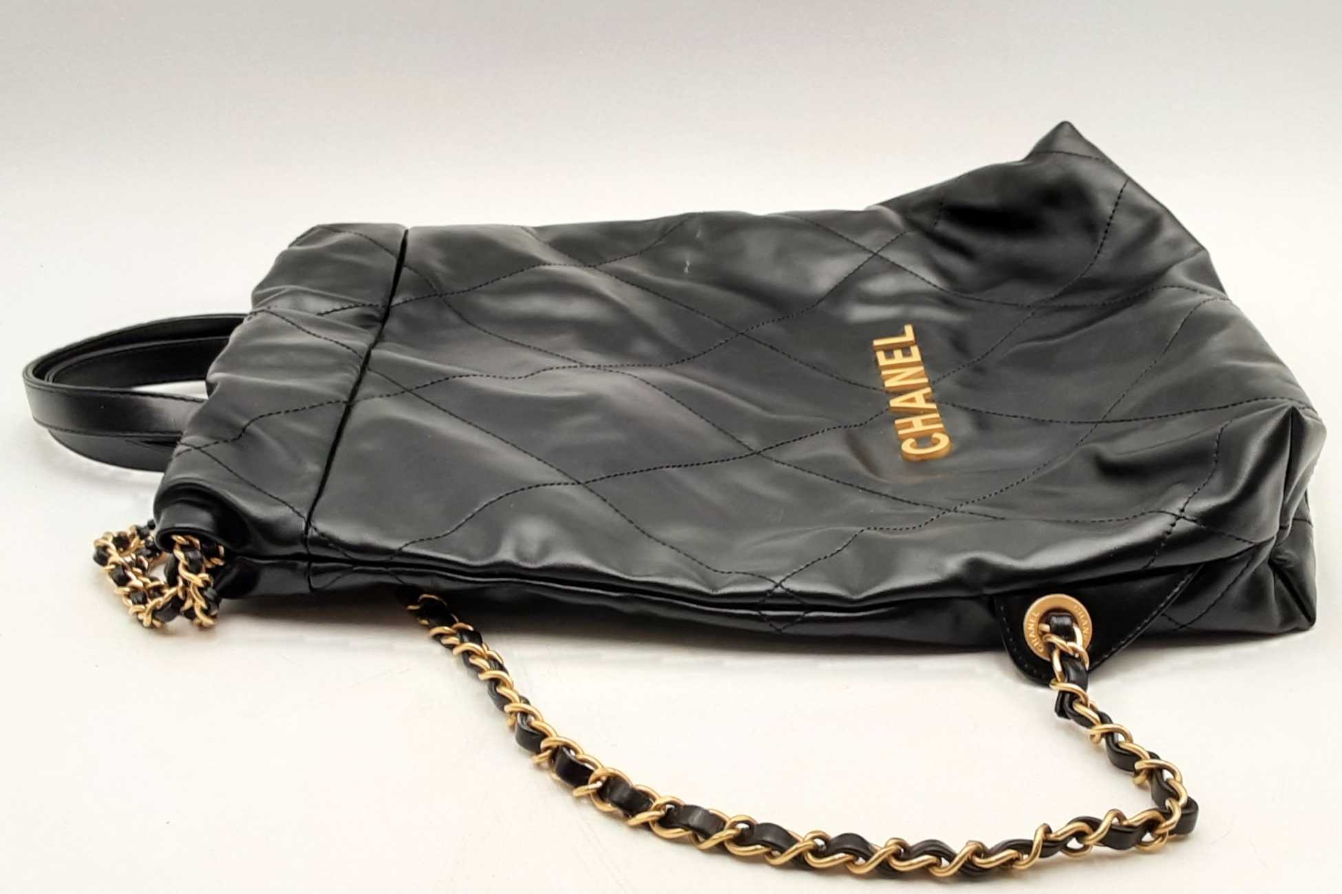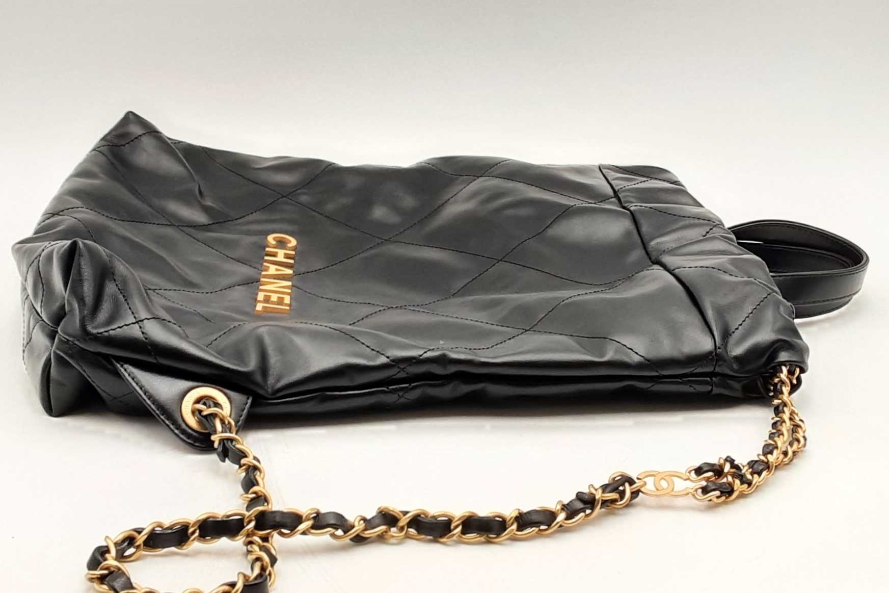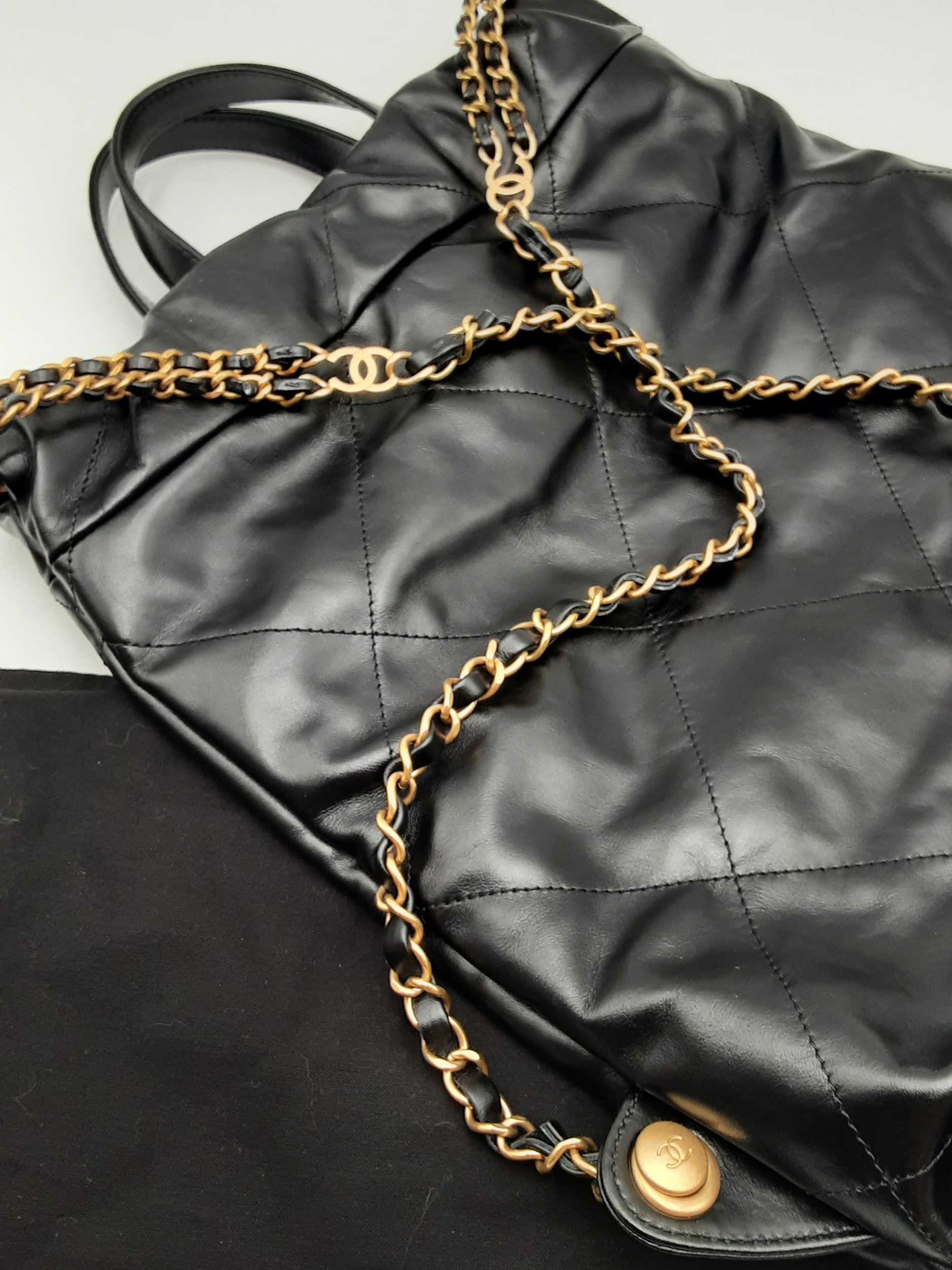 144010053474Chanel 22 Black Quilted Leather Backpack. Gold-Tone Hardware. Approximate measurements: Height 13 IN X Length 11 IN X Width 3 IN. Great Pre-Owned Condition. Scratches on hardware. Wear on bottom corners. Scratches and some spots on the exterior. White marks on the exterior. Dust and debris inside. Entrupy Certificate #8DVJQ9R