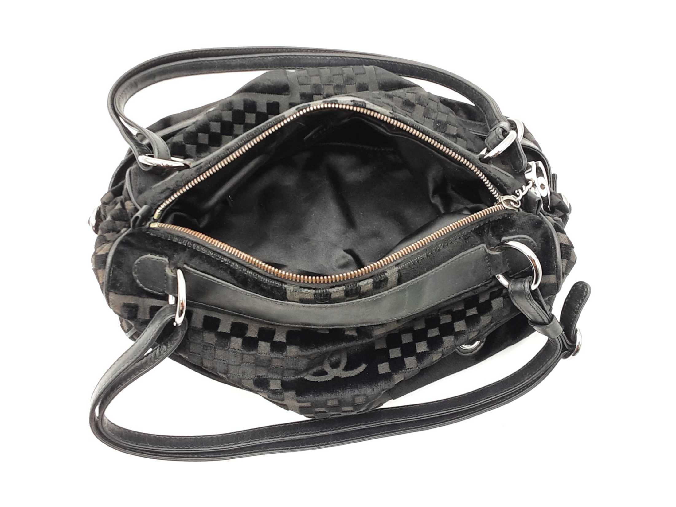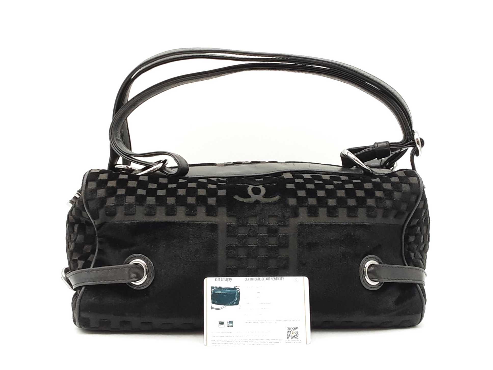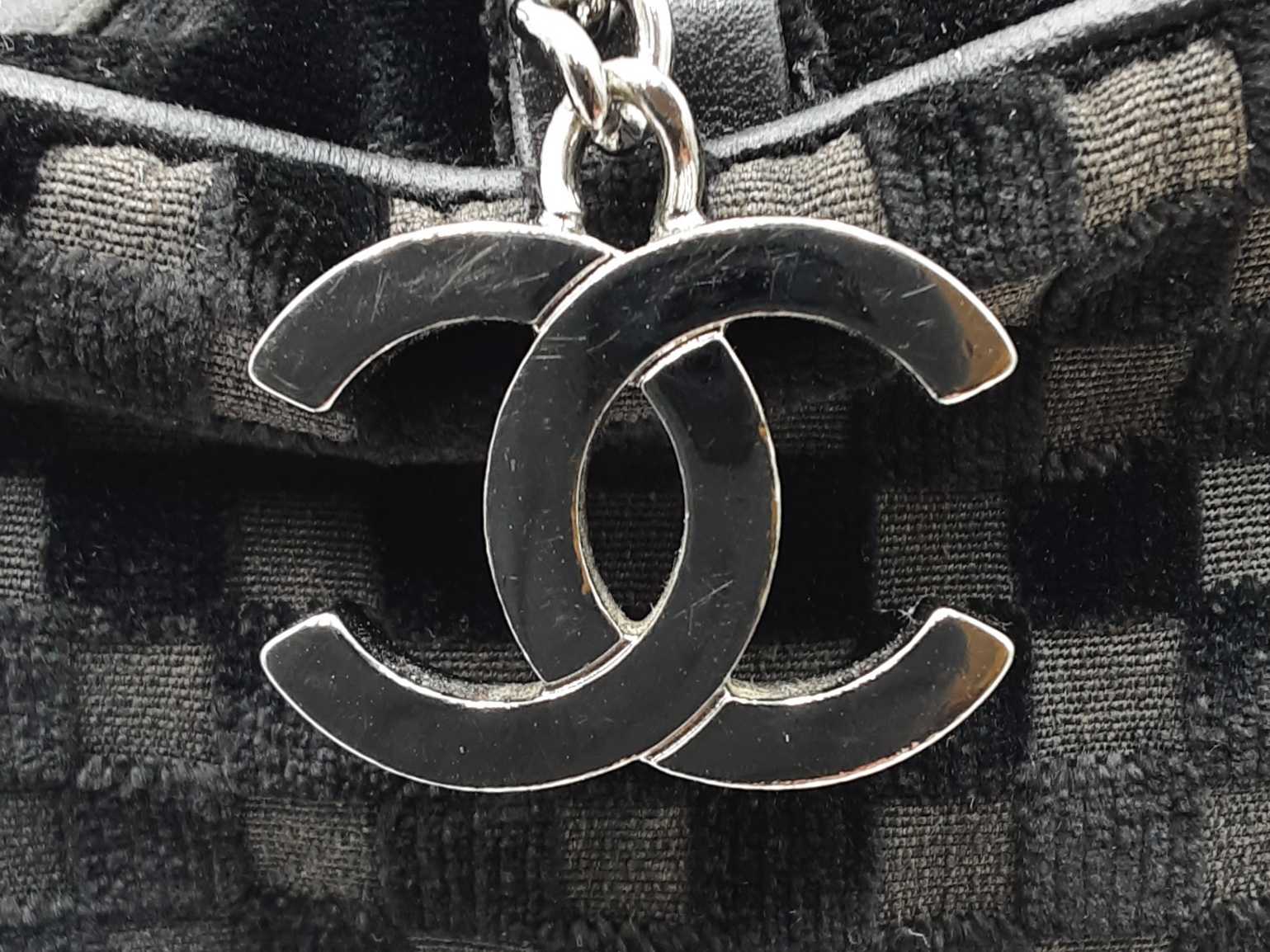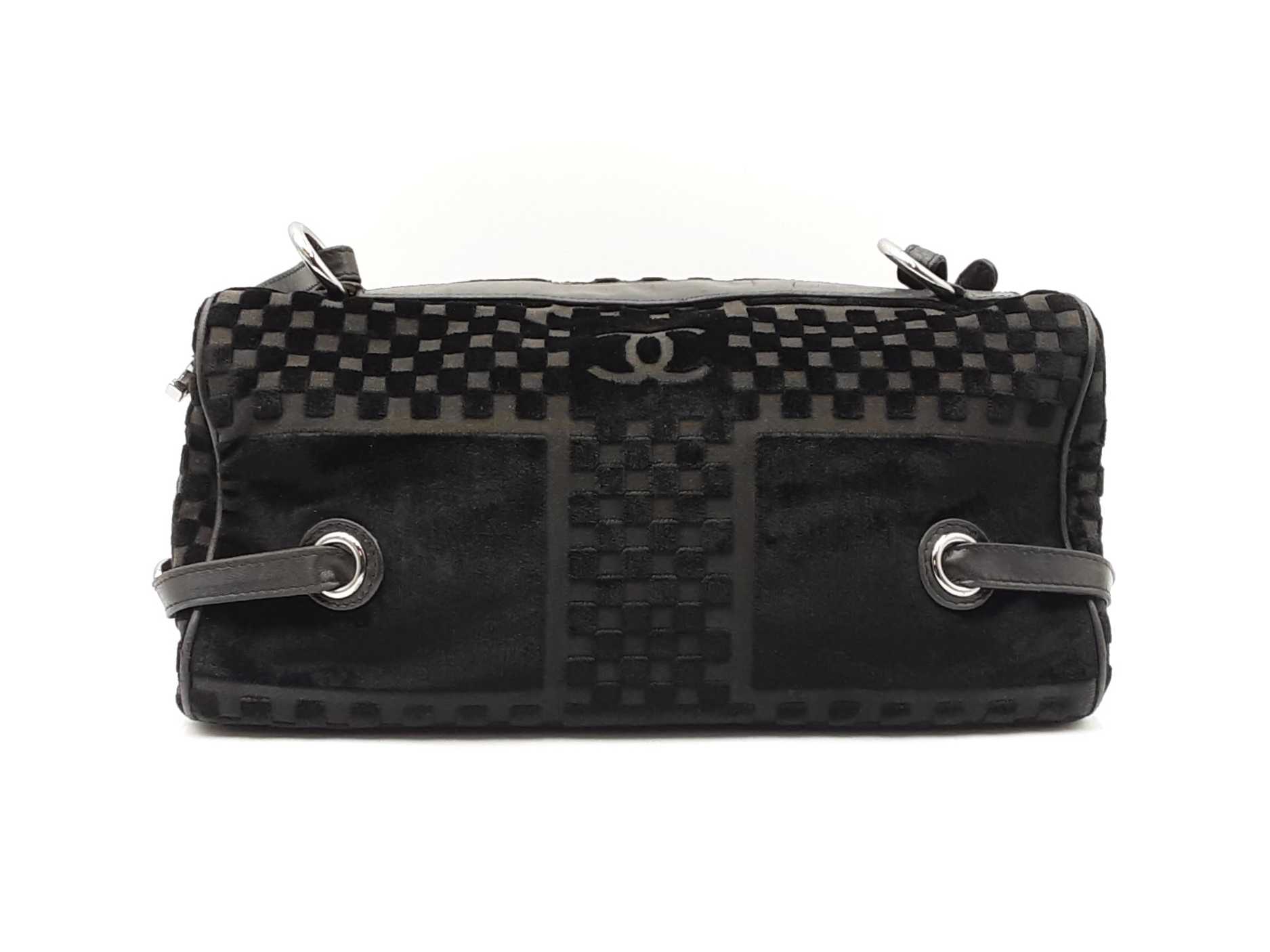 144030021864Chanel Check-Embossed Black Velvet Shoulder Bag. Silver-Tone Hardware. Length 11.5 IN X Height 6 IN X Width 6 IN X Strap Drop 9 IN, approximately. Good Pre-Owned Condition. Scratches on hardware. Worn fabric and piping on bottom corners. Scuffs and creases on leather details. Entrupy Certificate # 6Y4CR3G
