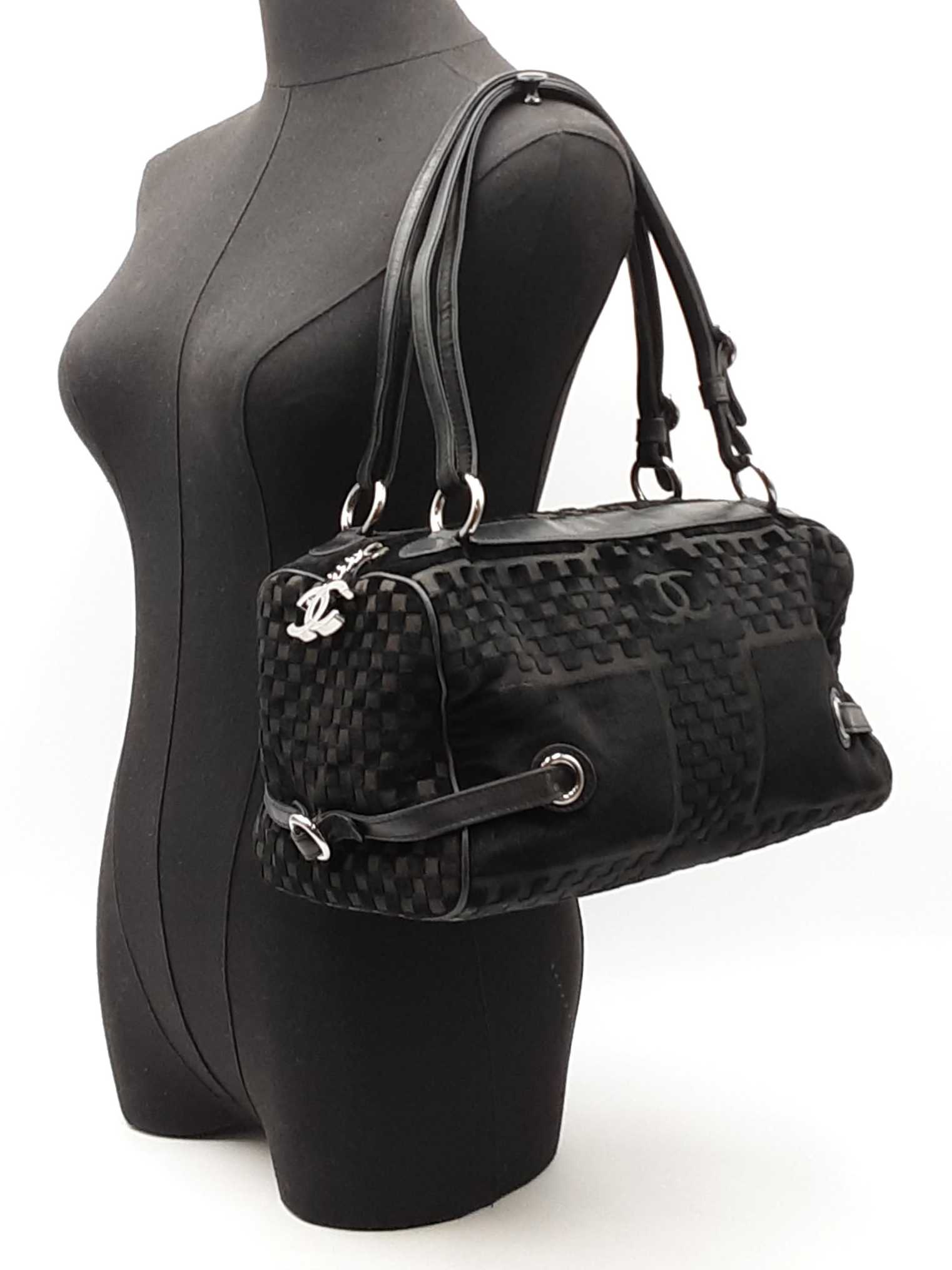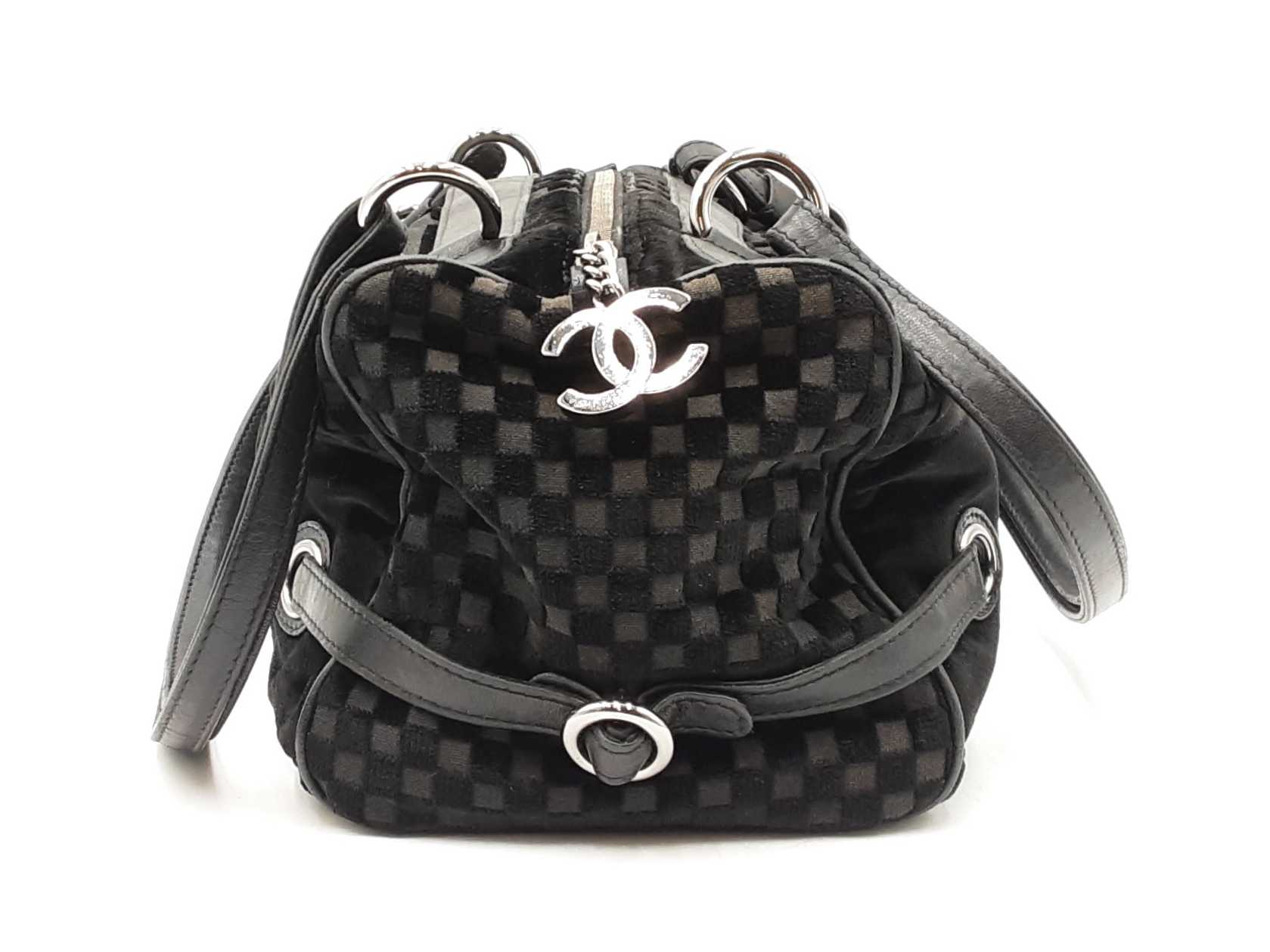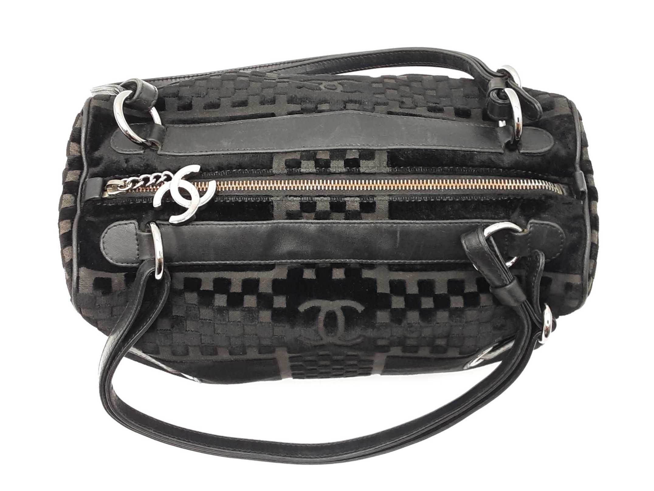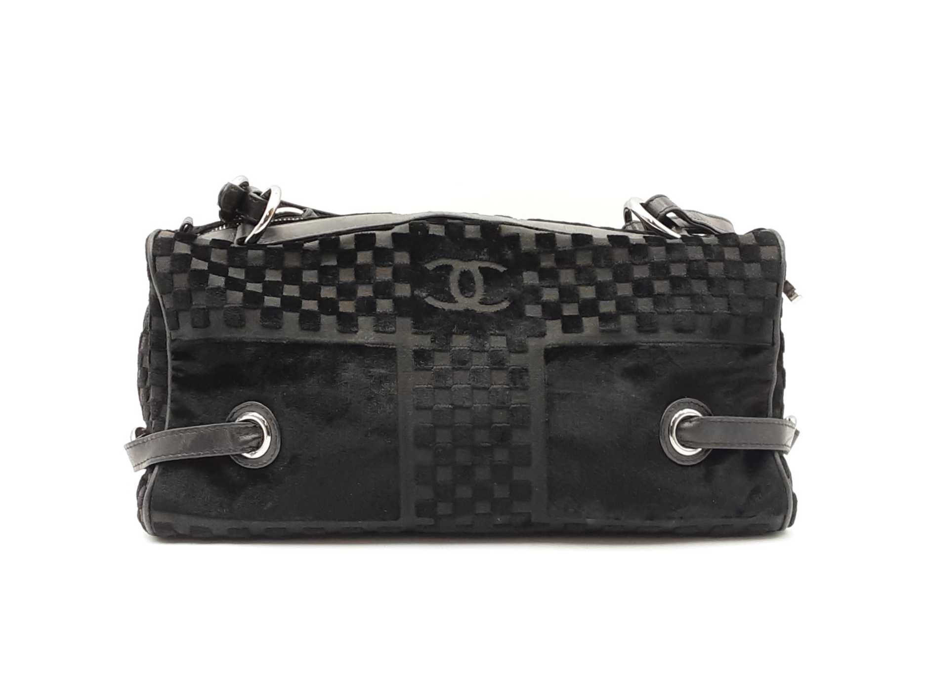 144030021864Chanel Check-Embossed Black Velvet Shoulder Bag. Silver-Tone Hardware. Length 11.5 IN X Height 6 IN X Width 6 IN X Strap Drop 9 IN, approximately. Good Pre-Owned Condition. Scratches on hardware. Worn fabric and piping on bottom corners. Scuffs and creases on leather details. Entrupy Certificate # 6Y4CR3G