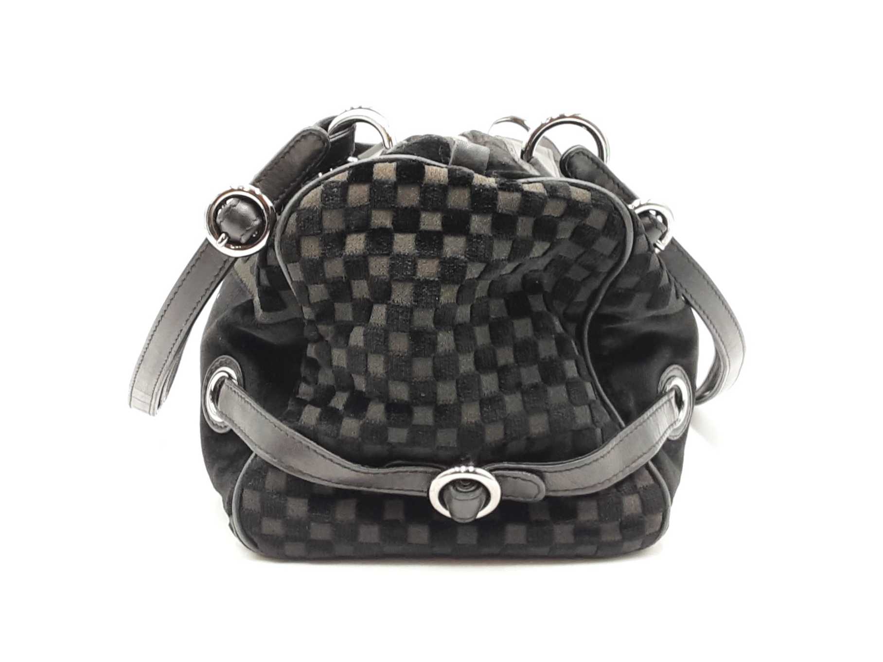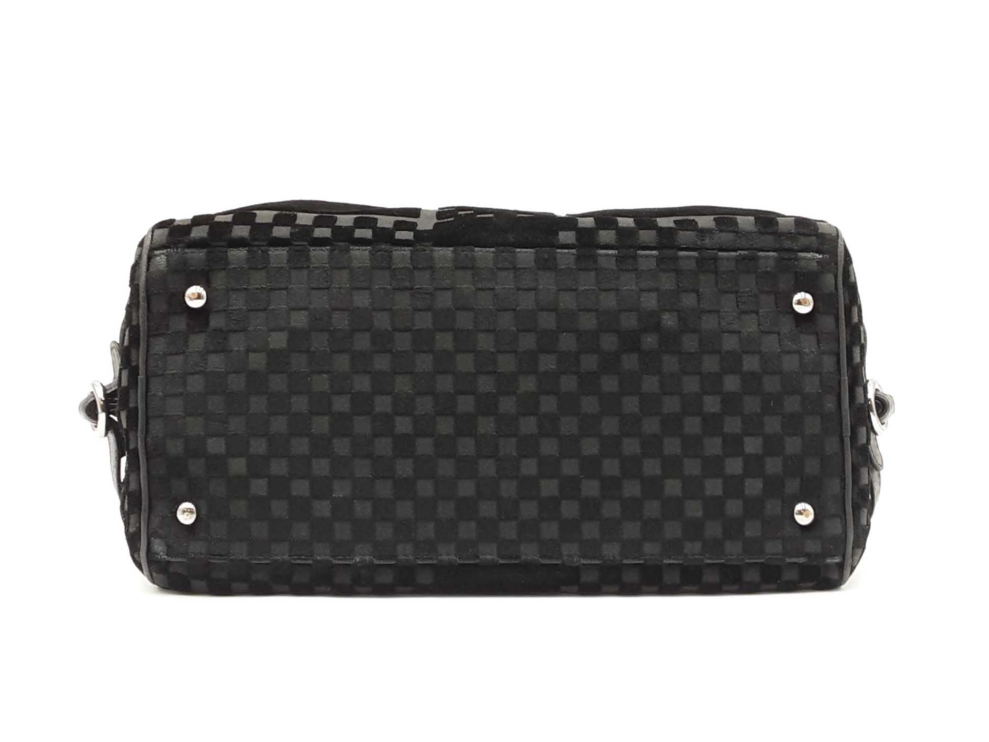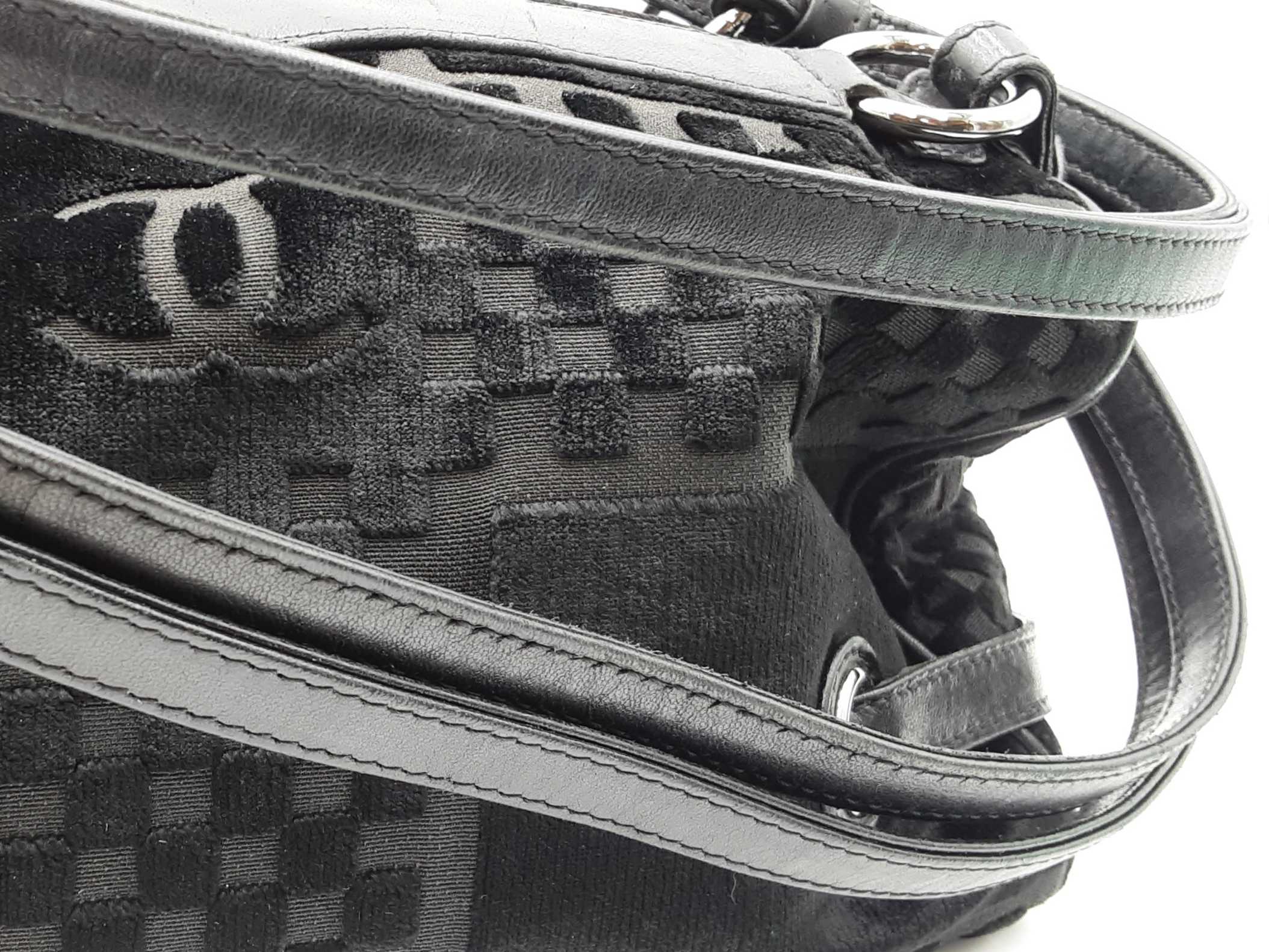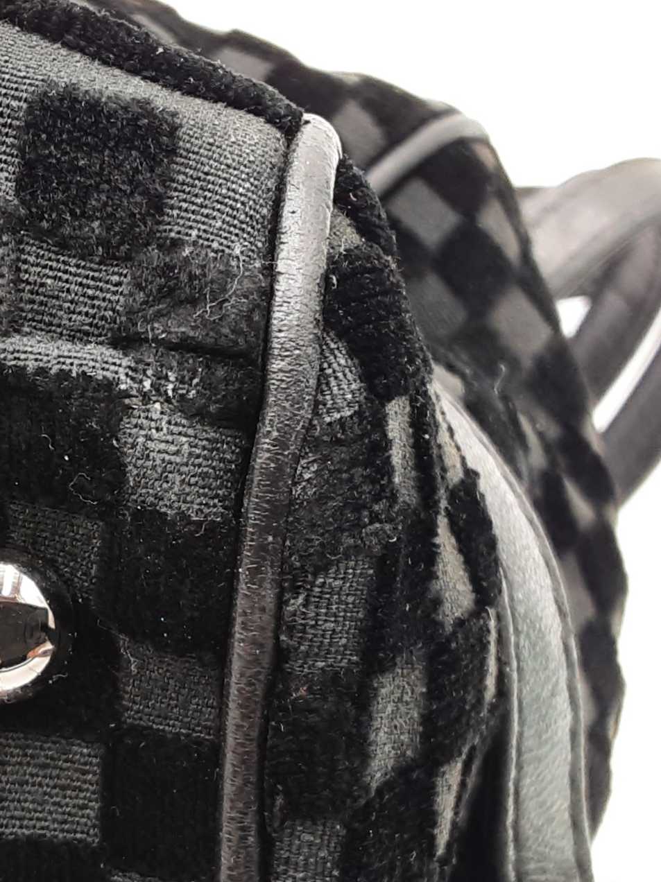 144030021864Chanel Check-Embossed Black Velvet Shoulder Bag. Silver-Tone Hardware. Length 11.5 IN X Height 6 IN X Width 6 IN X Strap Drop 9 IN, approximately. Good Pre-Owned Condition. Scratches on hardware. Worn fabric and piping on bottom corners. Scuffs and creases on leather details. Entrupy Certificate # 6Y4CR3G