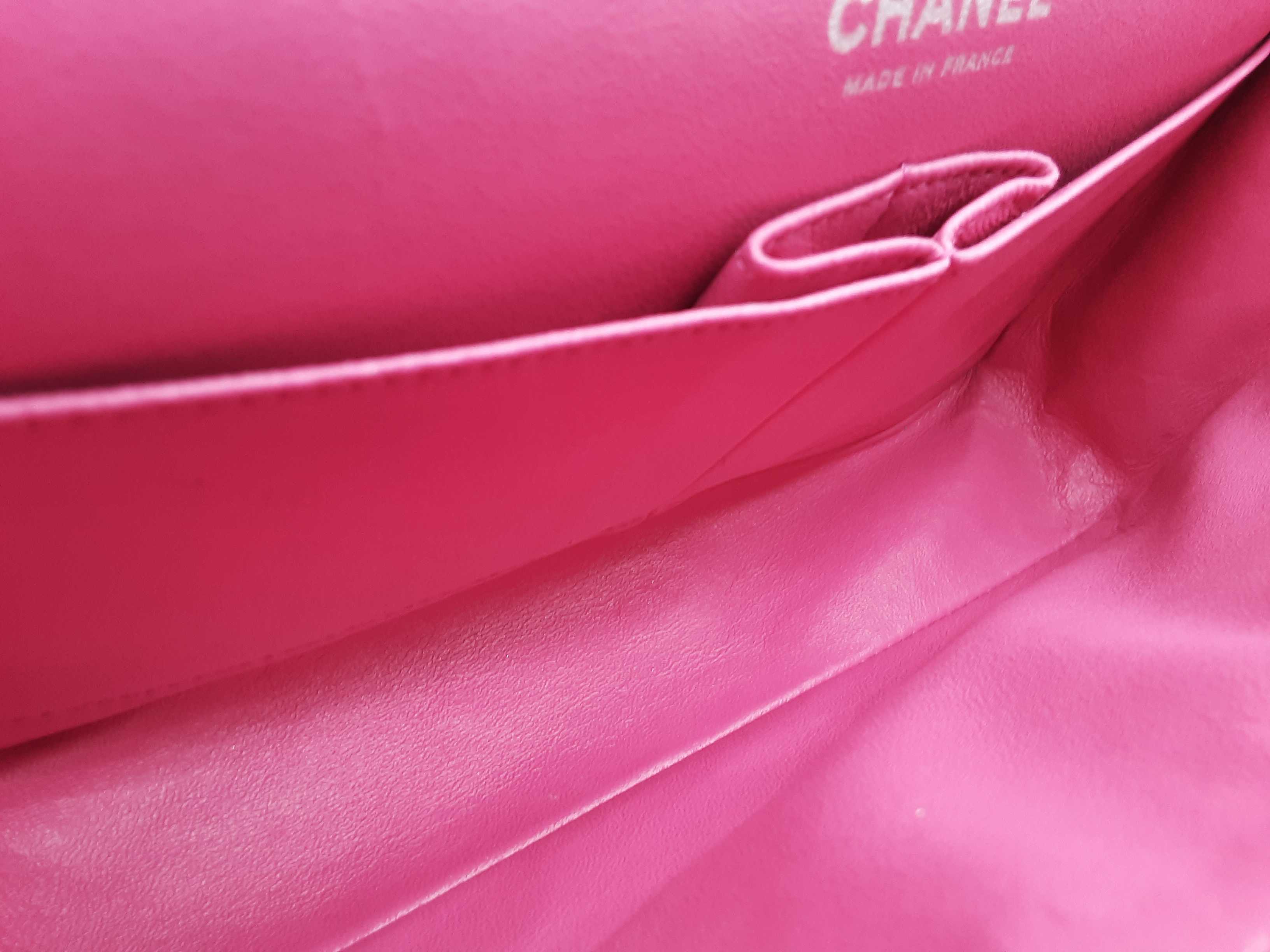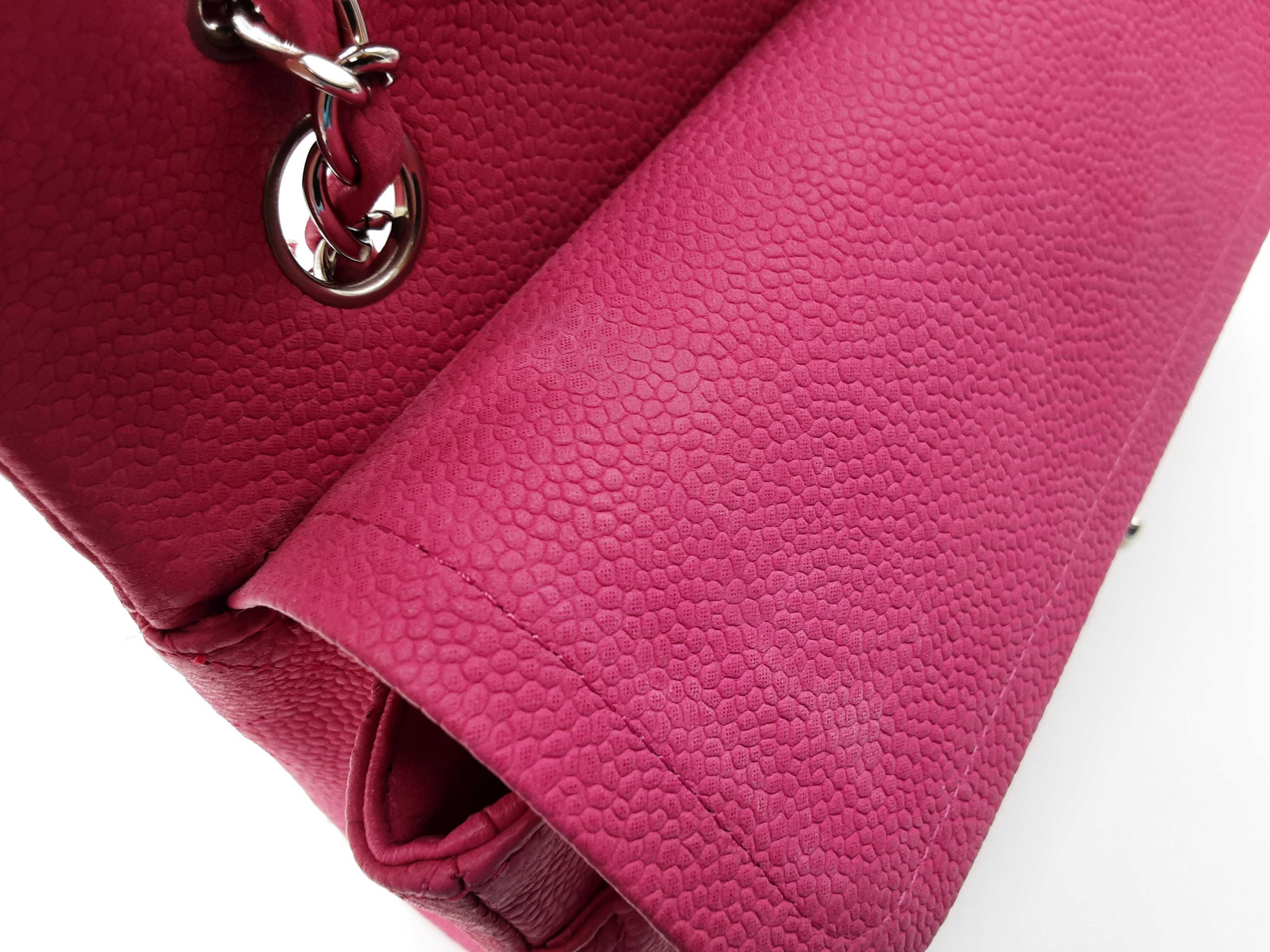 144020037594Chanel Classic Double Flap Pink Quilted Suede Cavier Leather Shoulder Bag. Length 10 IN X Height 6.25 IN X Width 2.5 IN X Drop 9.5 IN. Entrupy Certificate #K3KCM76. Pre-owned - Good Condition with creases, marks and scratches on exterior, wear and discoloration on straps, scratches and wear on metal hardware, indentations and marks on and under flaps, and marks and discoloration on flaps, under flaps, and on exterior.